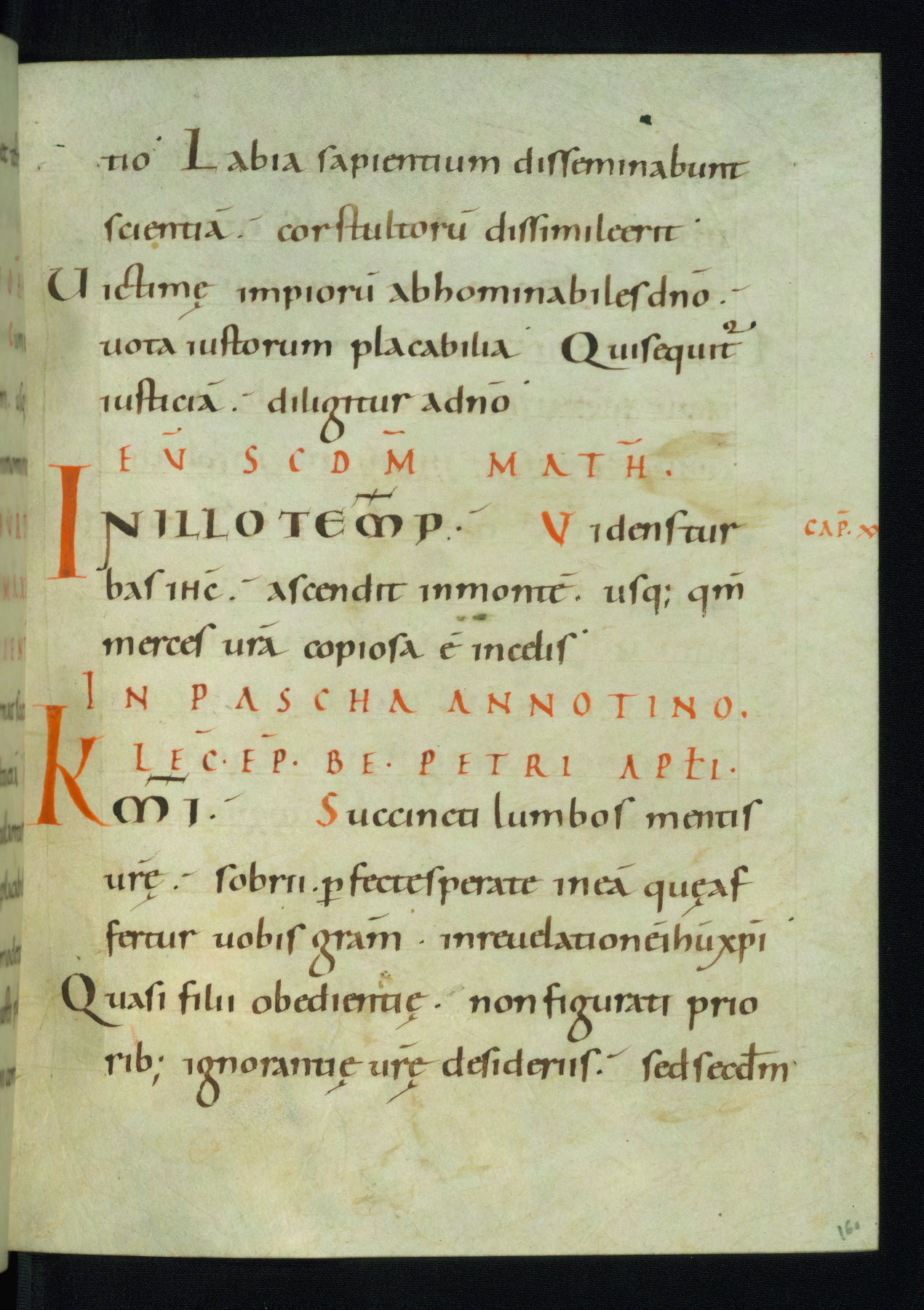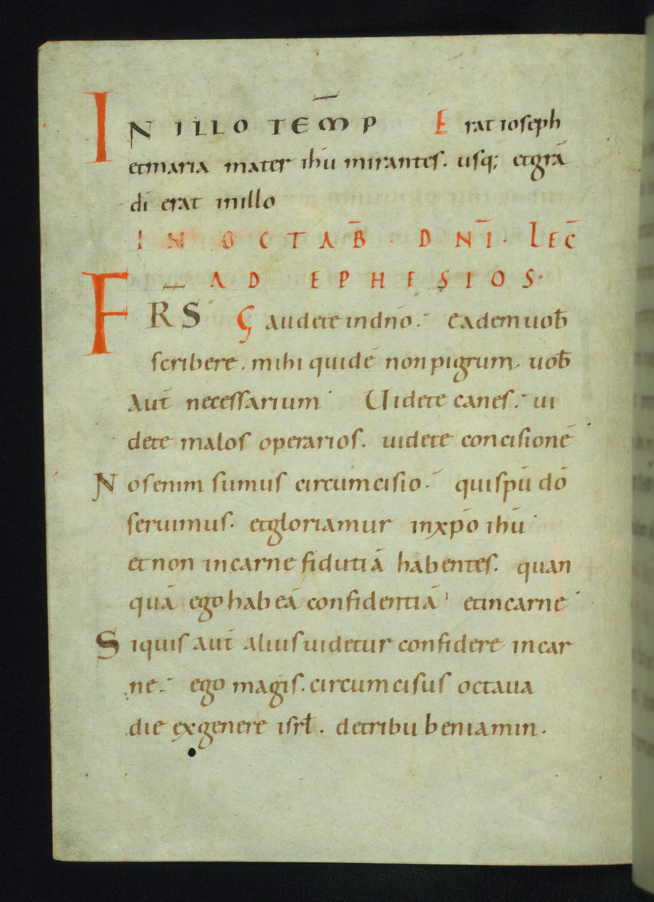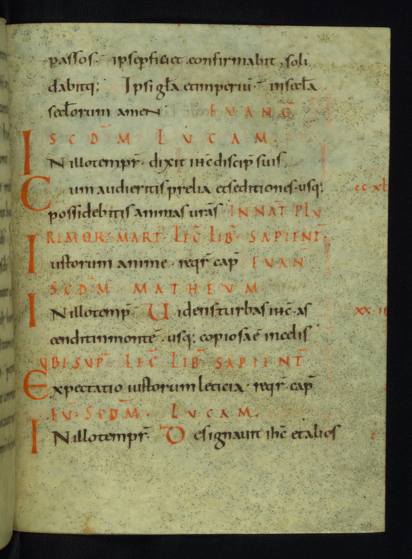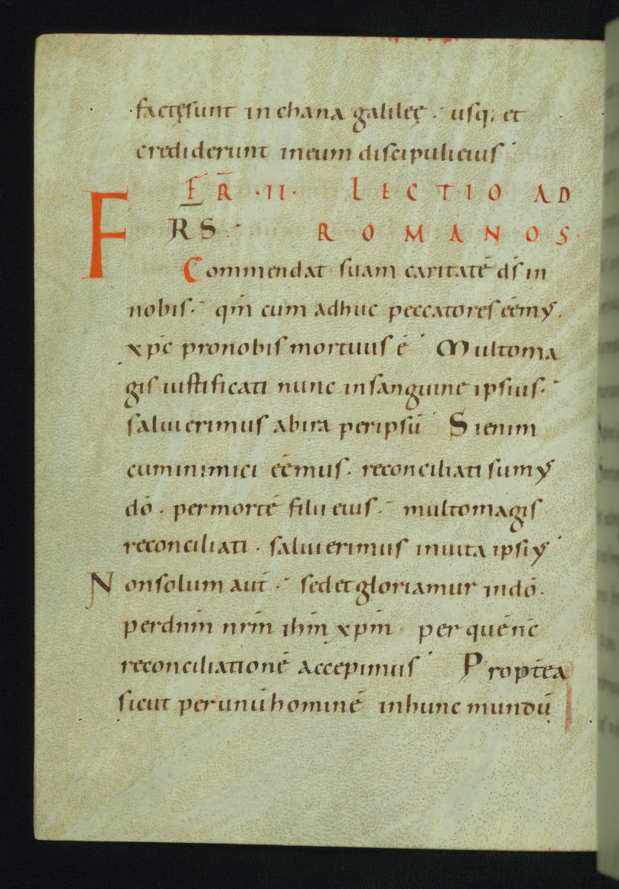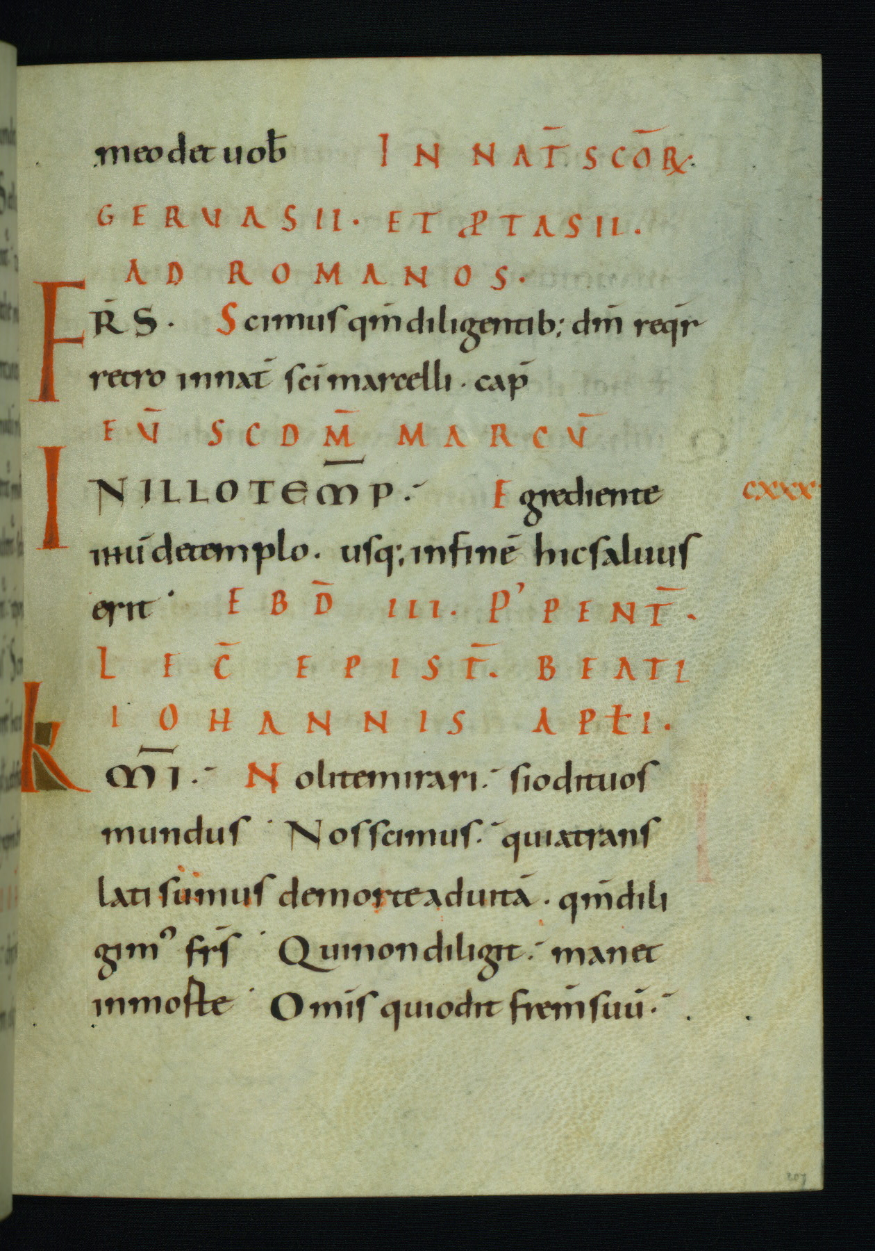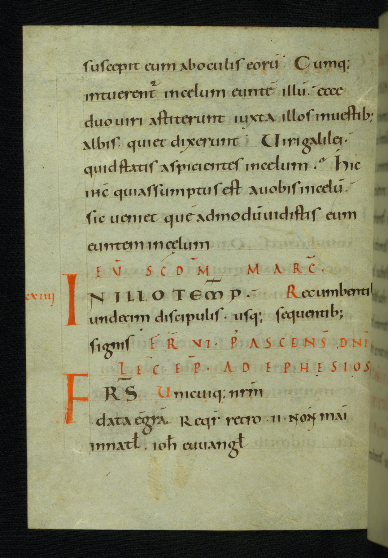 This Lectionary was created ca. 1000 in Trier. Written in a clear Caroline minuscule, it contains decorated initials at the openings of important readings. A set of illuminated letters marks the beginning of the Epistle and Gospel lessons for Easter; they display the hierarchy of scripts with capital letters decorated with gold leaf or drawn in red ink, followed by uncial and Caroline minuscule. Initials in orange, sometimes filled with gold, mark the divisions of the text. The book has been stylistically compared with Ottonian manuscripts, especially with a Psalter preserved in Trier (Stadtbibliothek, Ms. 7) illuminated by the so-called Master of the Registrum Gregorii.