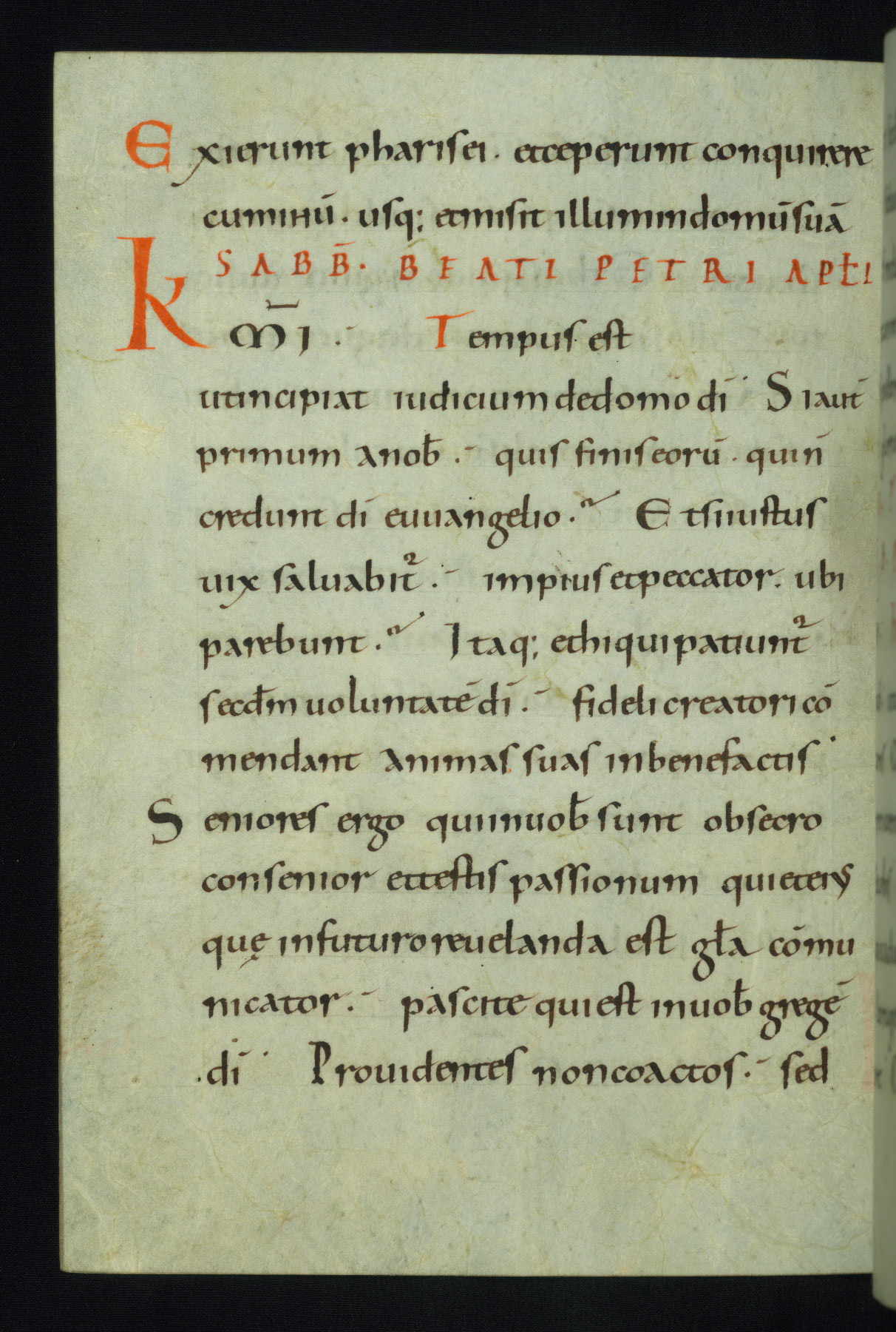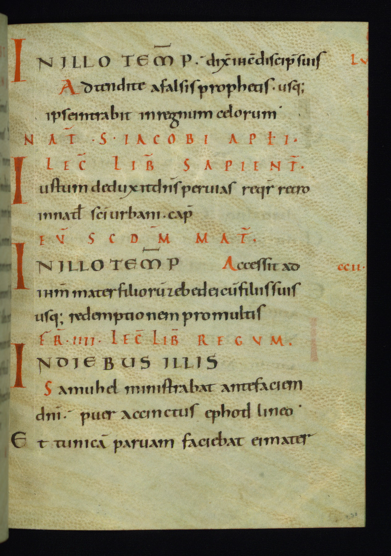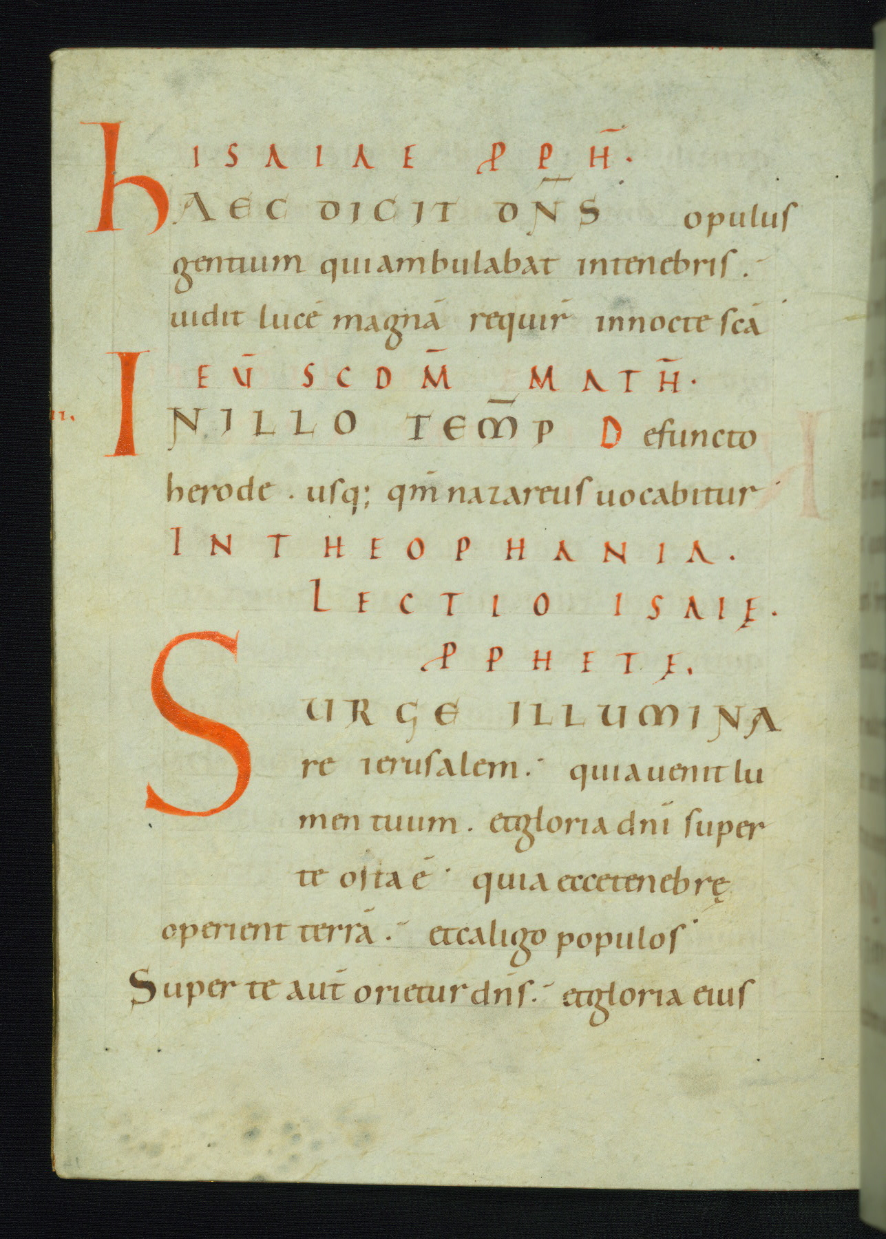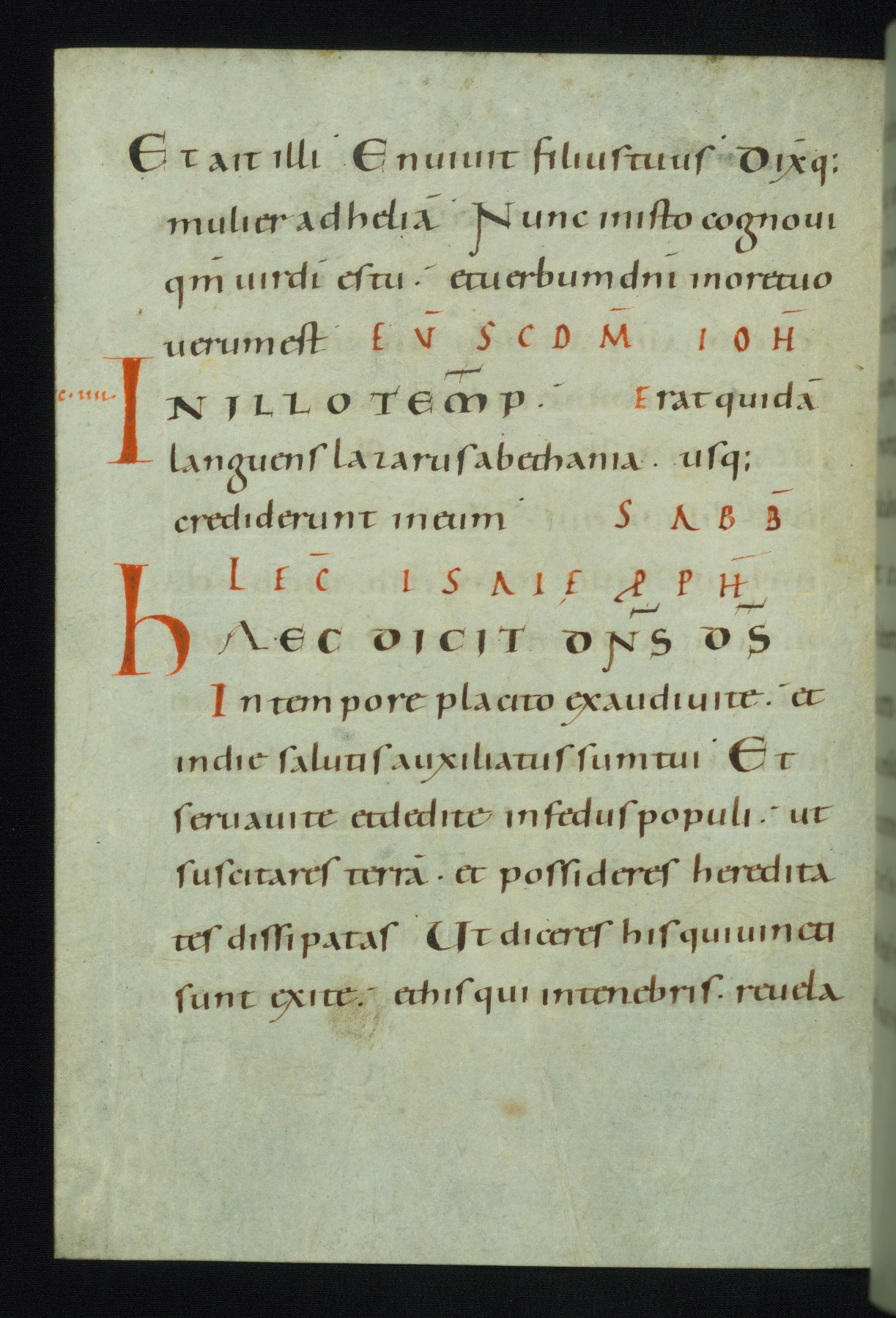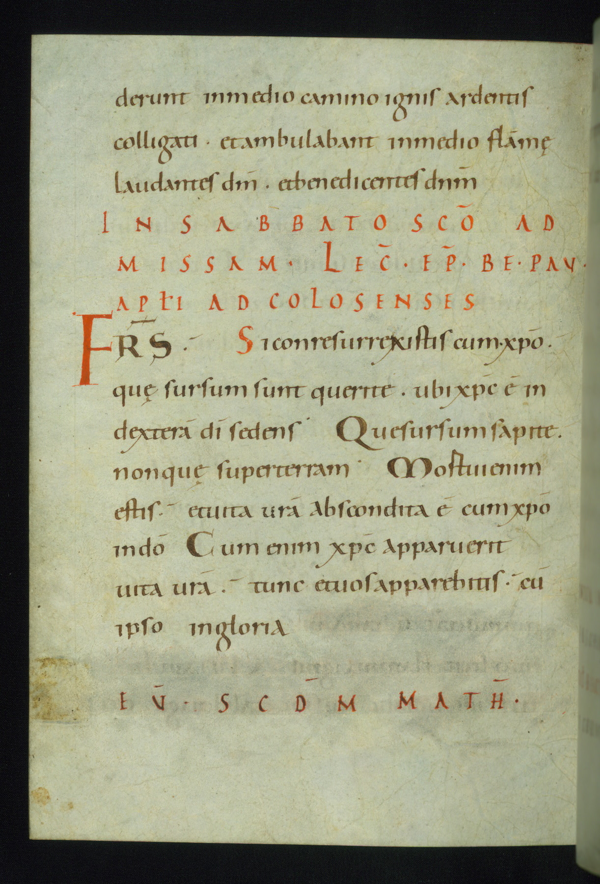 This Lectionary was created ca. 1000 in Trier. Written in a clear Caroline minuscule, it contains decorated initials at the openings of important readings. A set of illuminated letters marks the beginning of the Epistle and Gospel lessons for Easter; they display the hierarchy of scripts with capital letters decorated with gold leaf or drawn in red ink, followed by uncial and Caroline minuscule. Initials in orange, sometimes filled with gold, mark the divisions of the text. The book has been stylistically compared with Ottonian manuscripts, especially with a Psalter preserved in Trier (Stadtbibliothek, Ms. 7) illuminated by the so-called Master of the Registrum Gregorii.