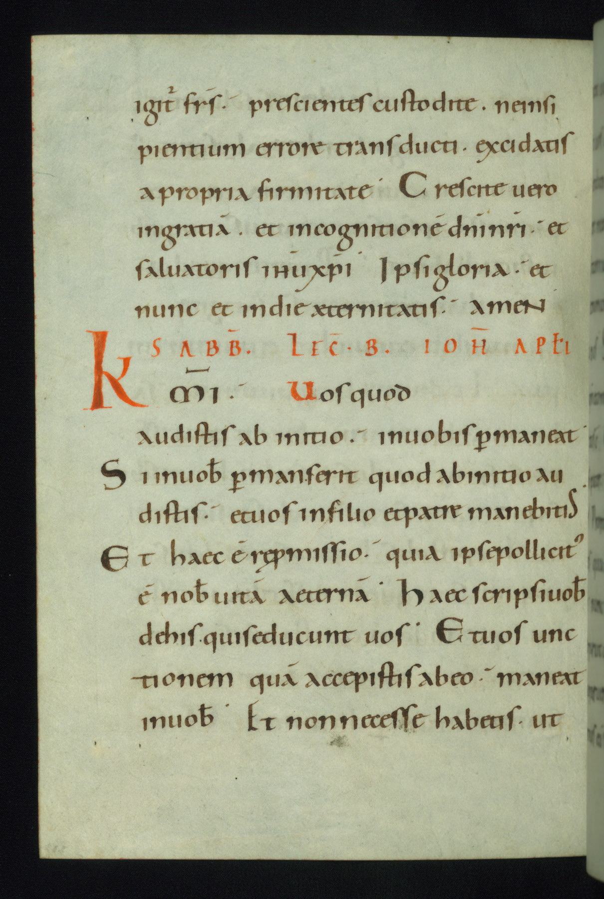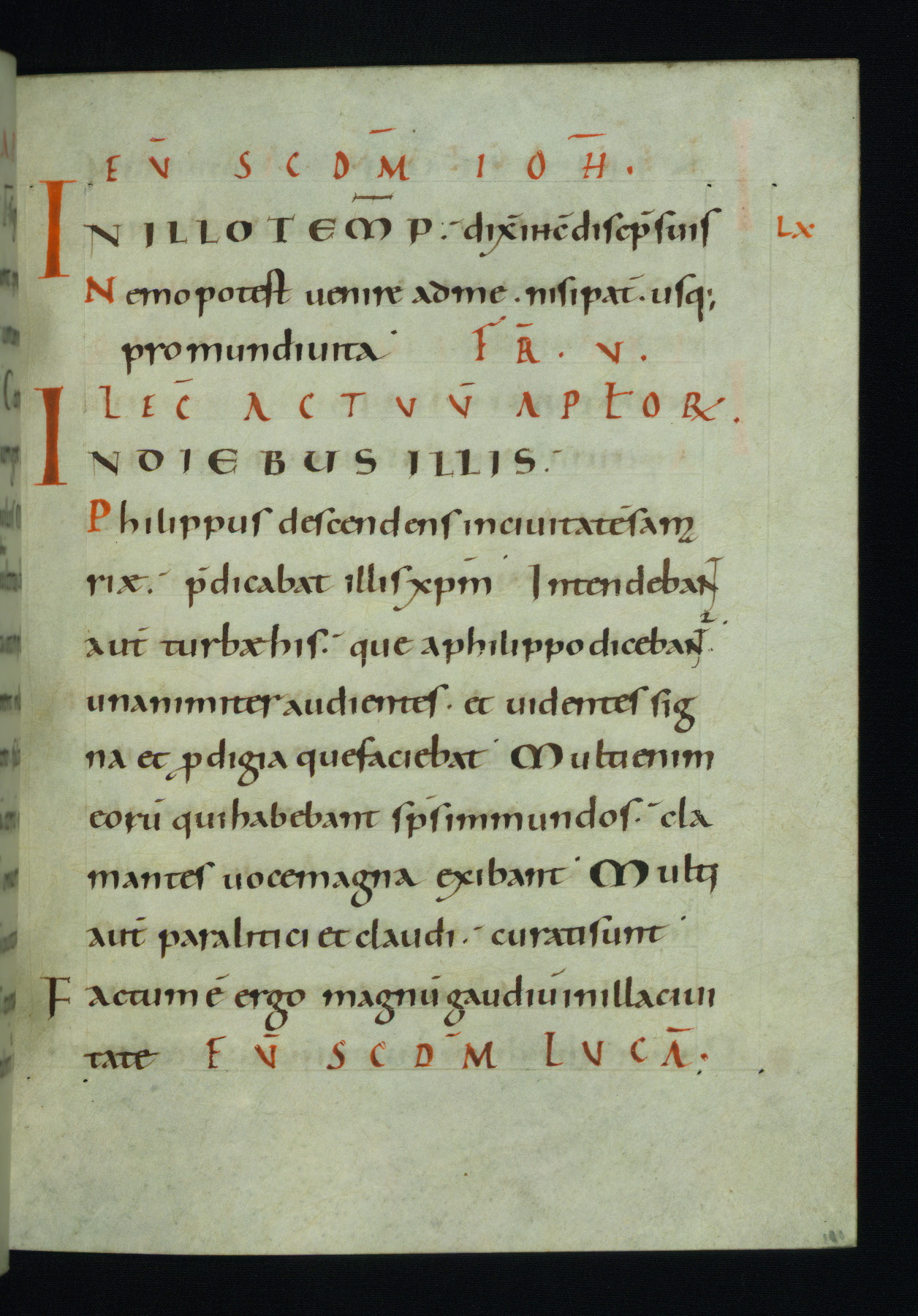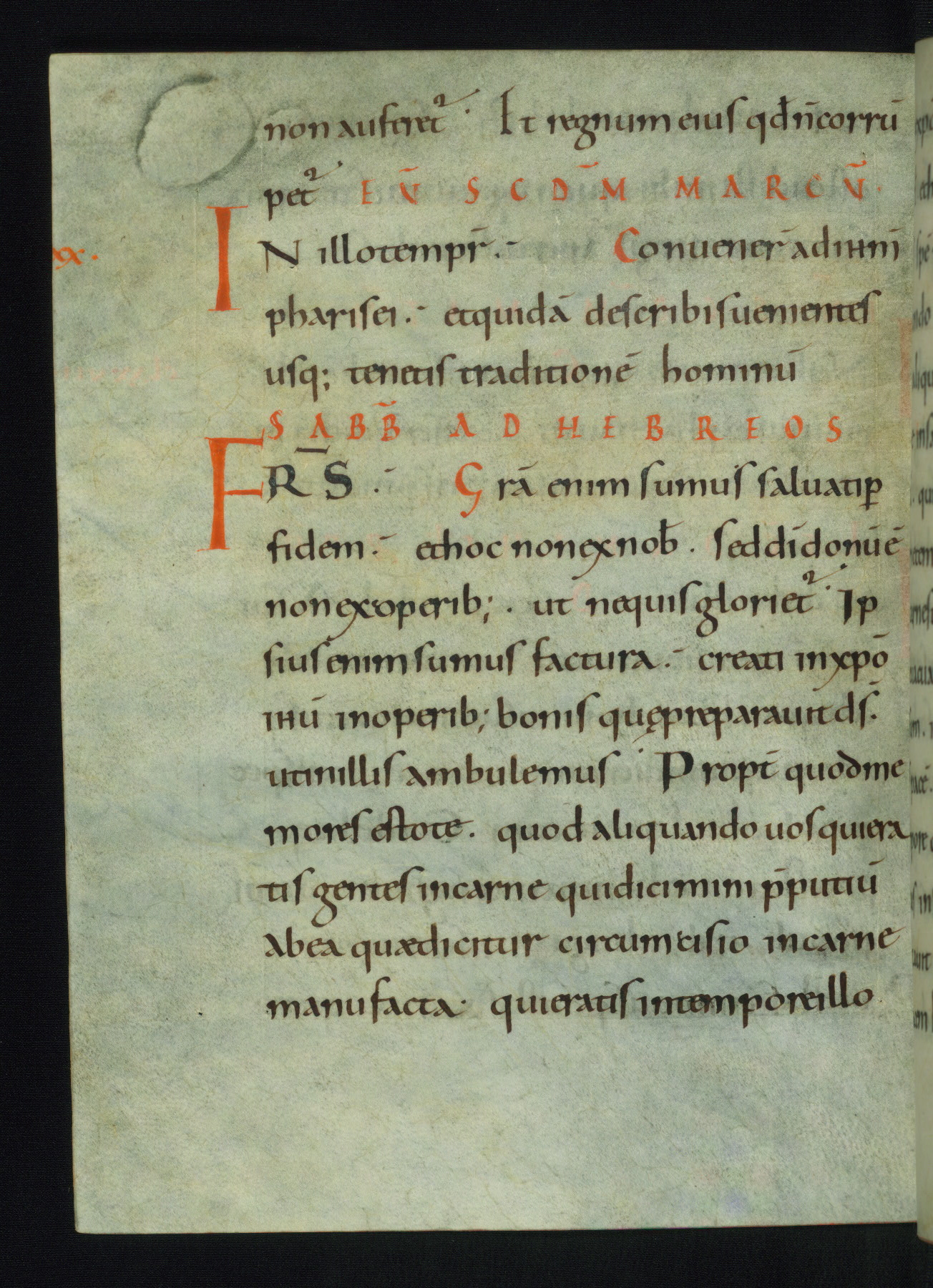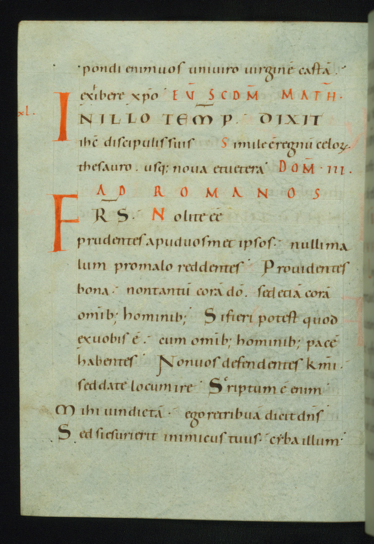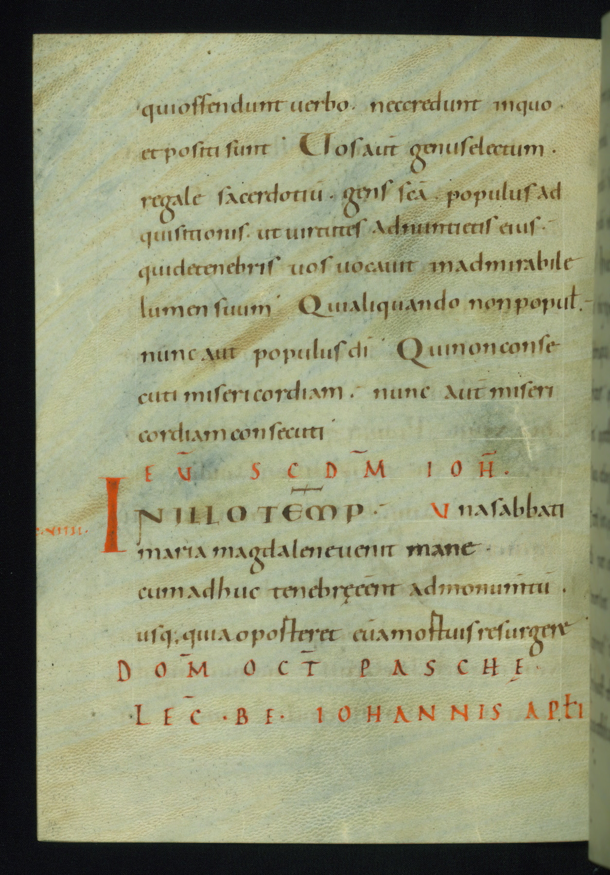 This Lectionary was created ca. 1000 in Trier. Written in a clear Caroline minuscule, it contains decorated initials at the openings of important readings. A set of illuminated letters marks the beginning of the Epistle and Gospel lessons for Easter; they display the hierarchy of scripts with capital letters decorated with gold leaf or drawn in red ink, followed by uncial and Caroline minuscule. Initials in orange, sometimes filled with gold, mark the divisions of the text. The book has been stylistically compared with Ottonian manuscripts, especially with a Psalter preserved in Trier (Stadtbibliothek, Ms. 7) illuminated by the so-called Master of the Registrum Gregorii.