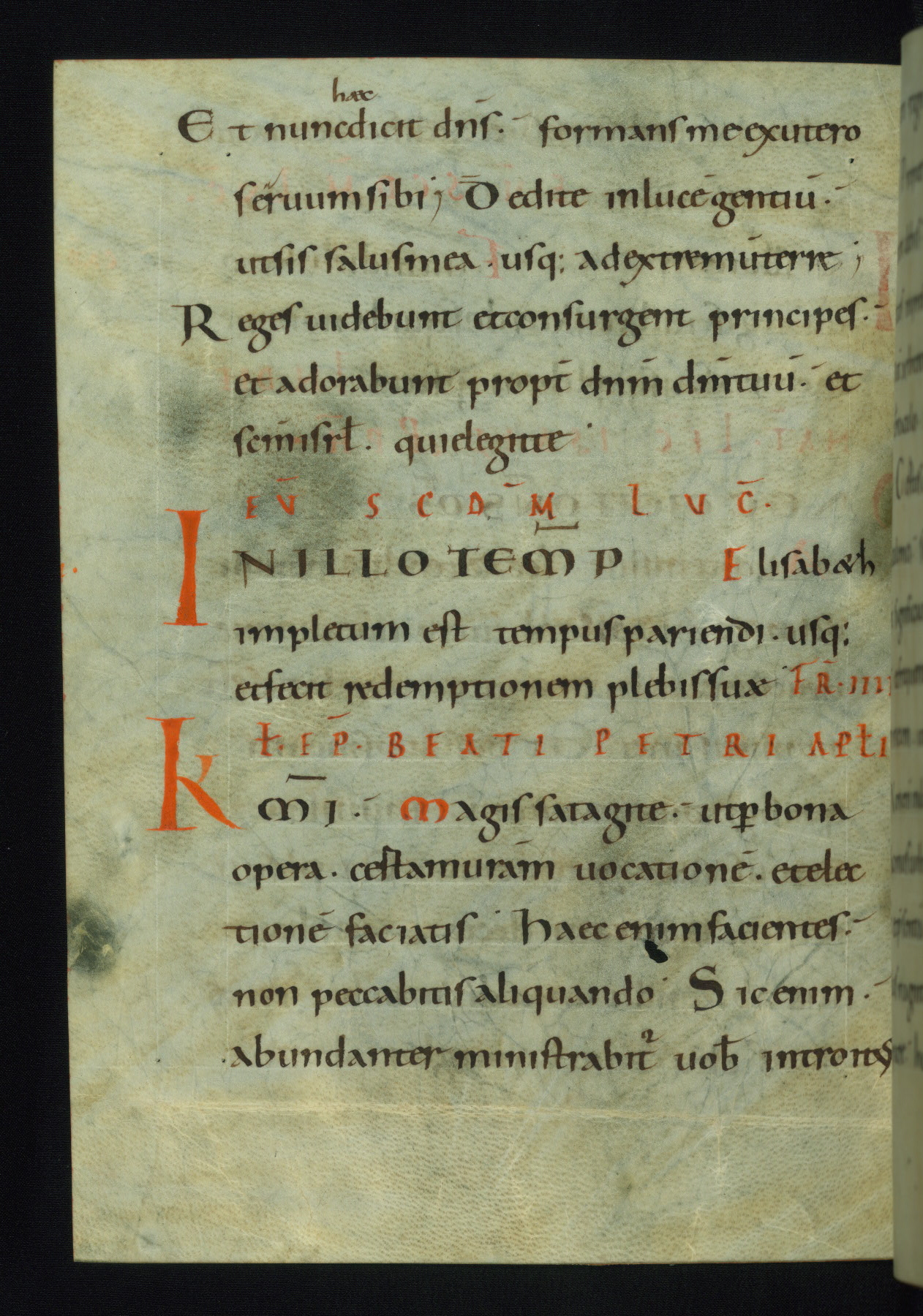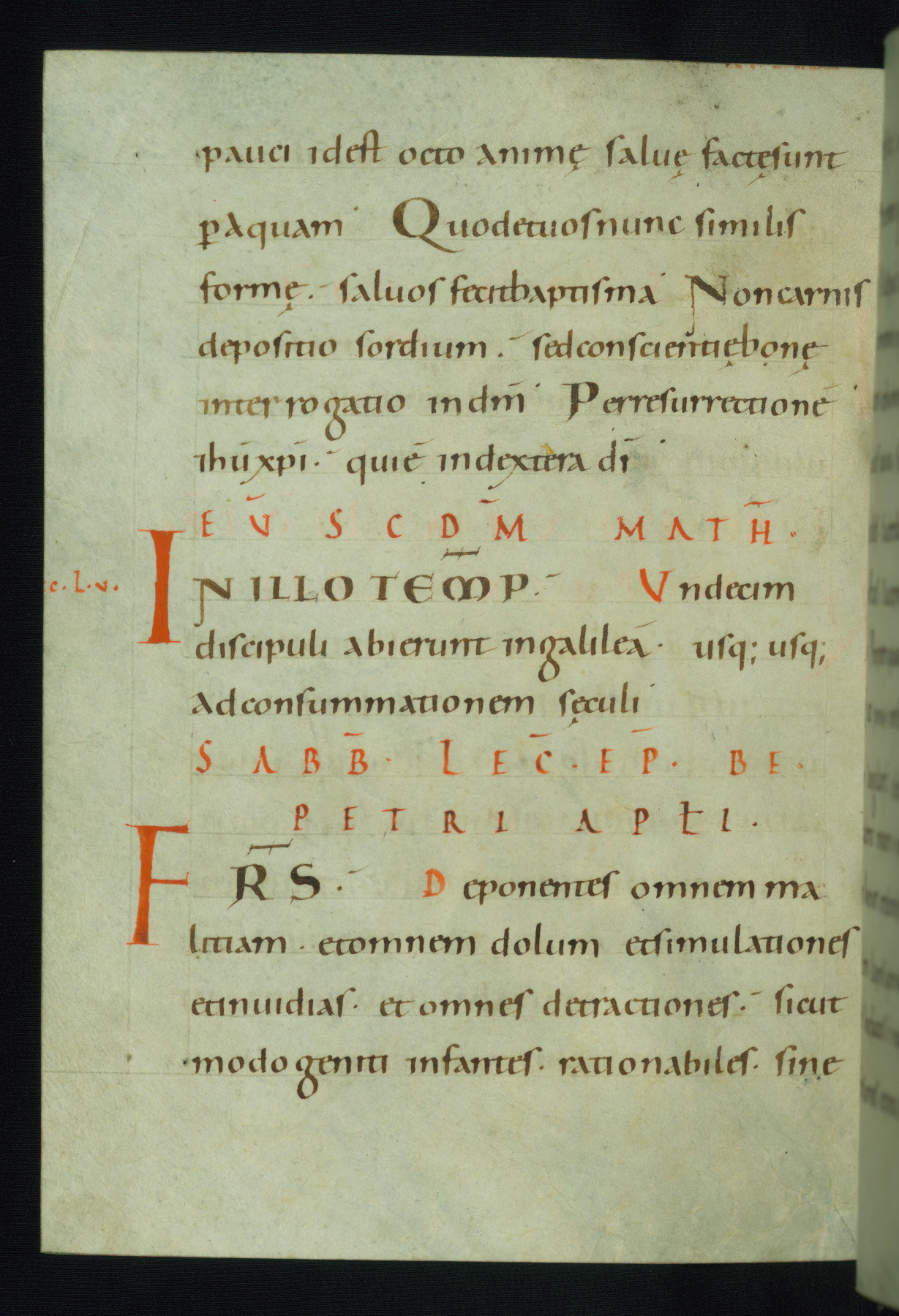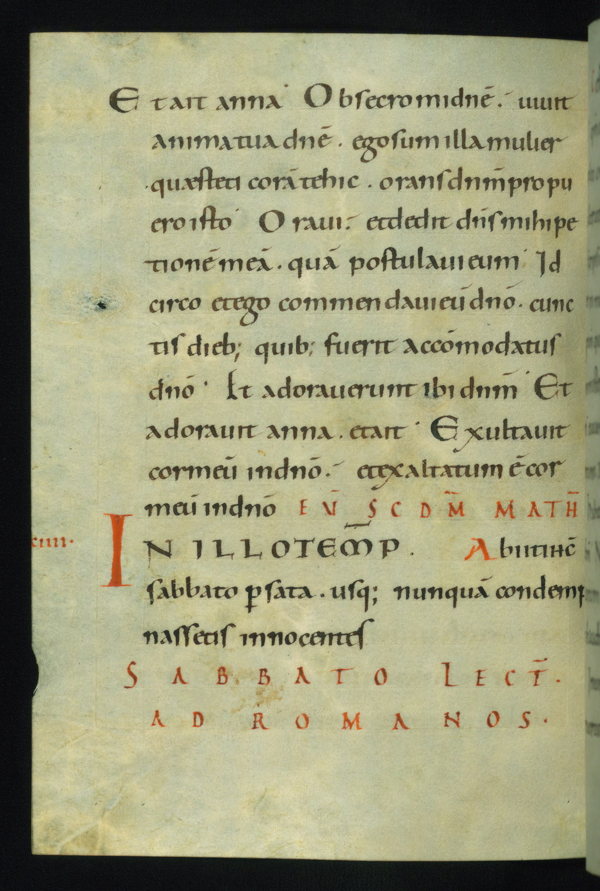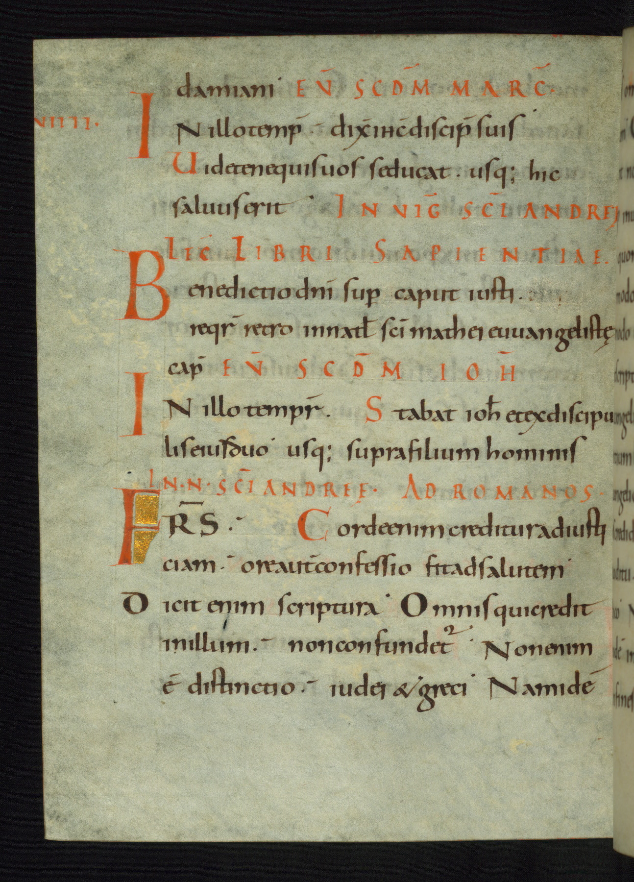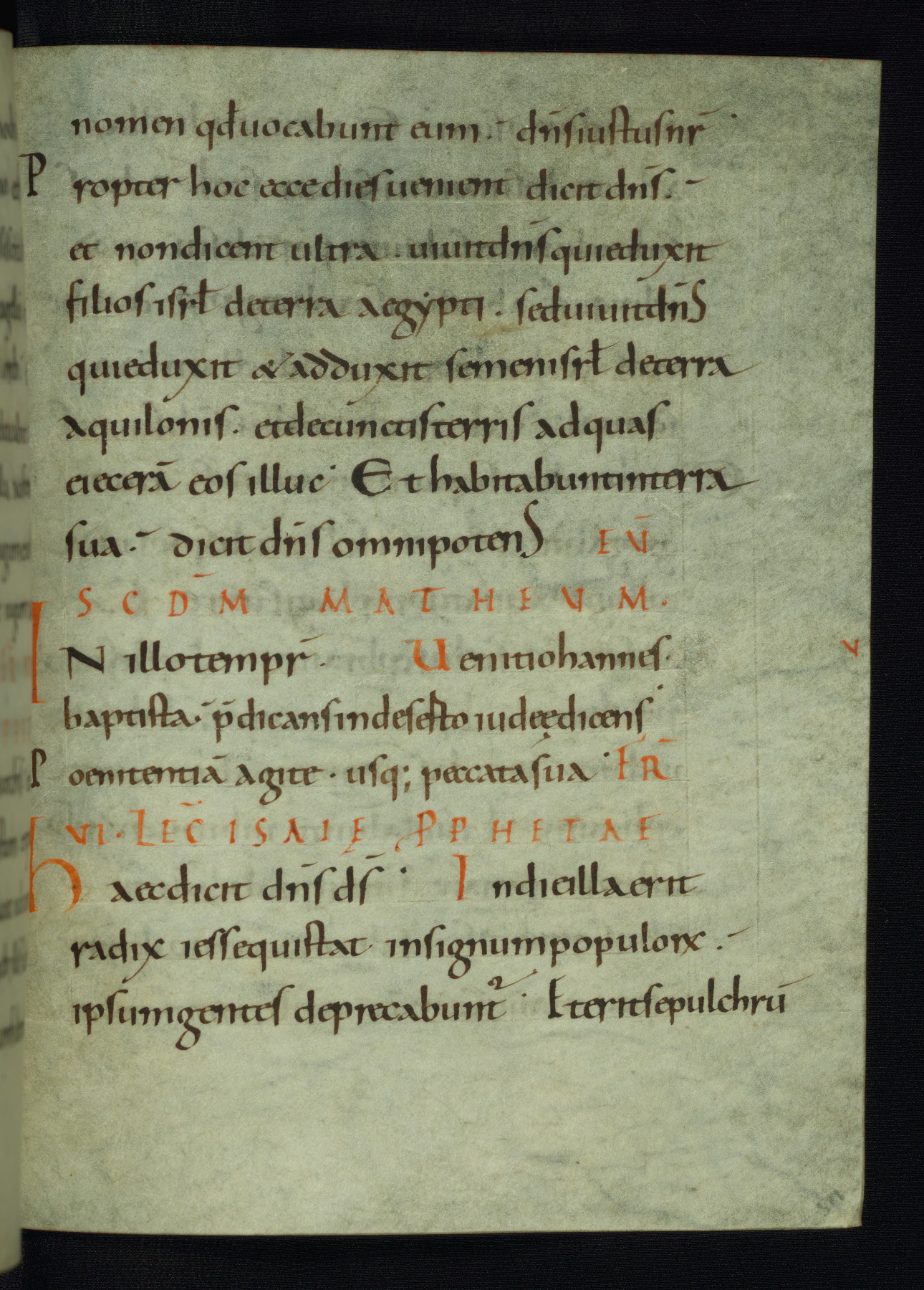 This Lectionary was created ca. 1000 in Trier. Written in a clear Caroline minuscule, it contains decorated initials at the openings of important readings. A set of illuminated letters marks the beginning of the Epistle and Gospel lessons for Easter; they display the hierarchy of scripts with capital letters decorated with gold leaf or drawn in red ink, followed by uncial and Caroline minuscule. Initials in orange, sometimes filled with gold, mark the divisions of the text. The book has been stylistically compared with Ottonian manuscripts, especially with a Psalter preserved in Trier (Stadtbibliothek, Ms. 7) illuminated by the so-called Master of the Registrum Gregorii.