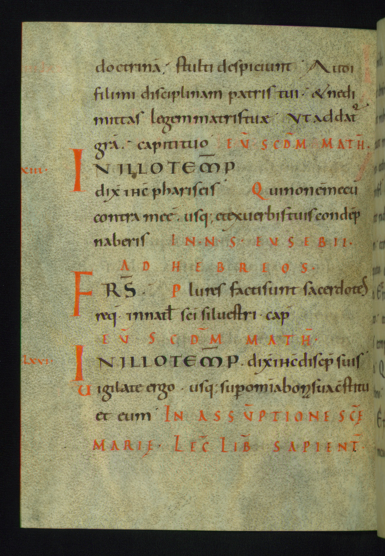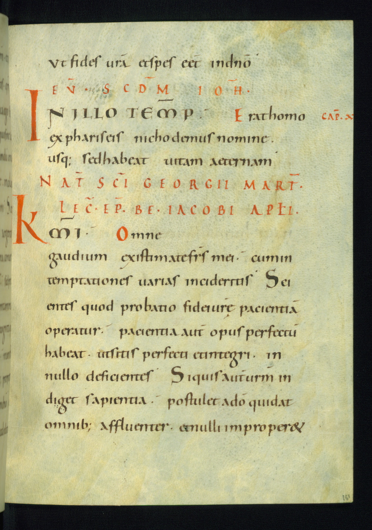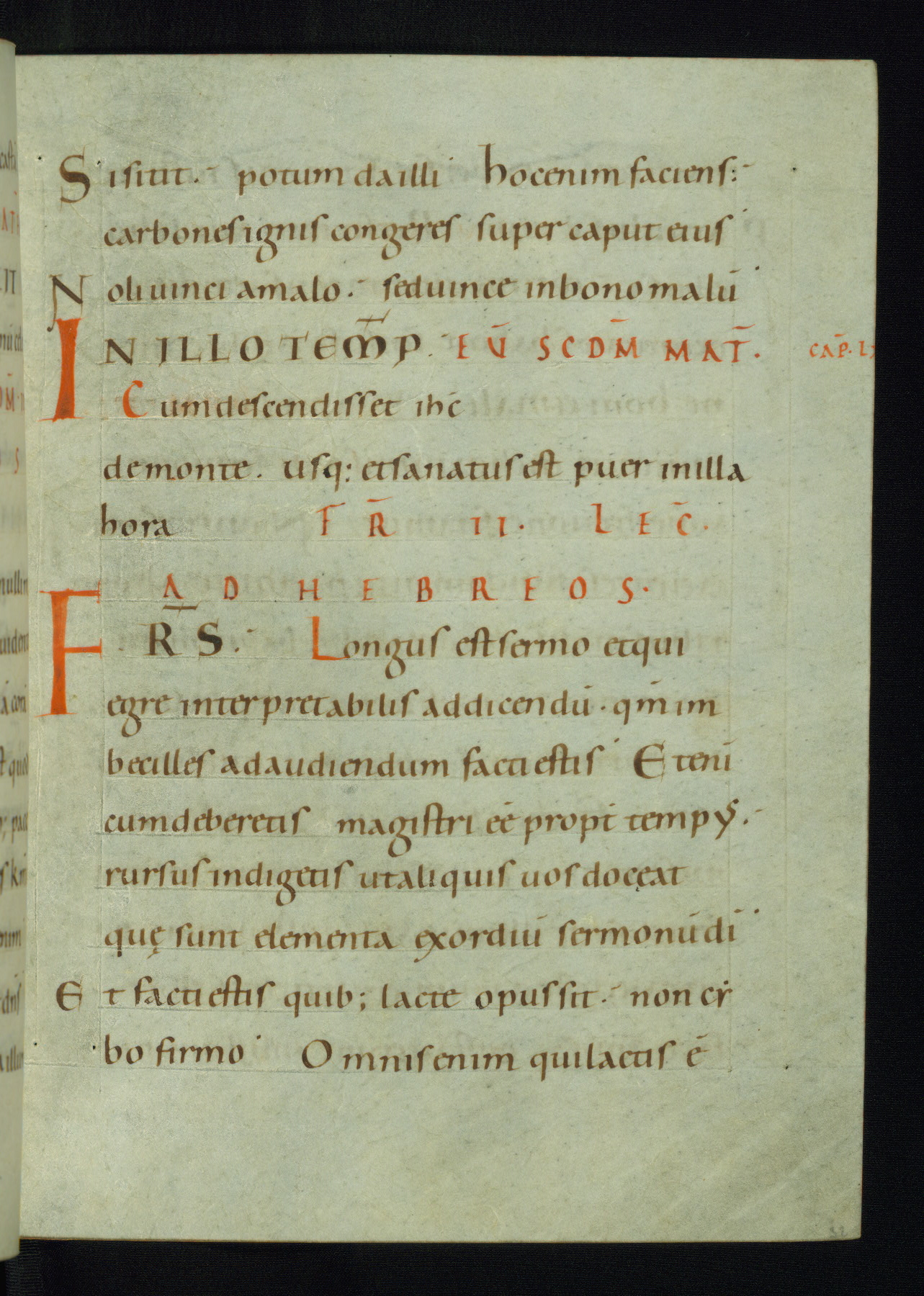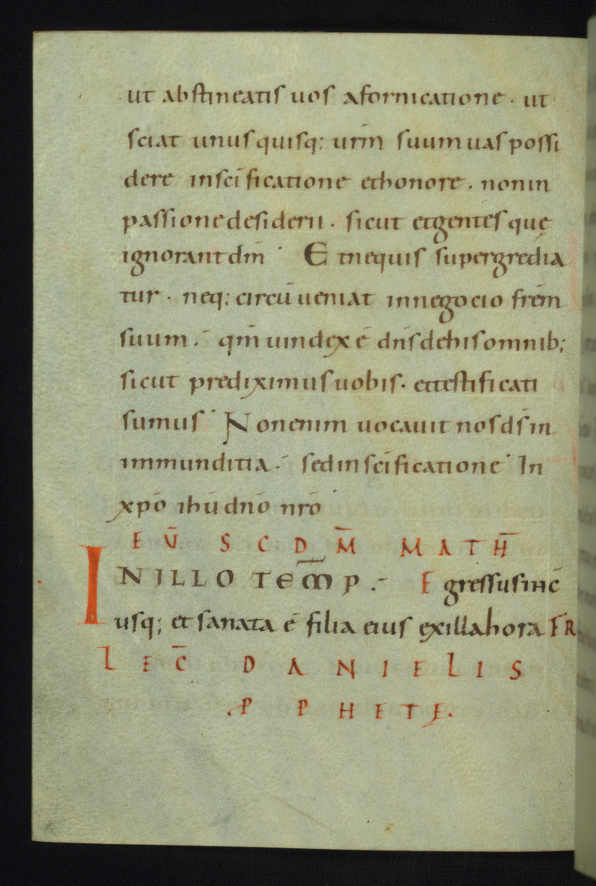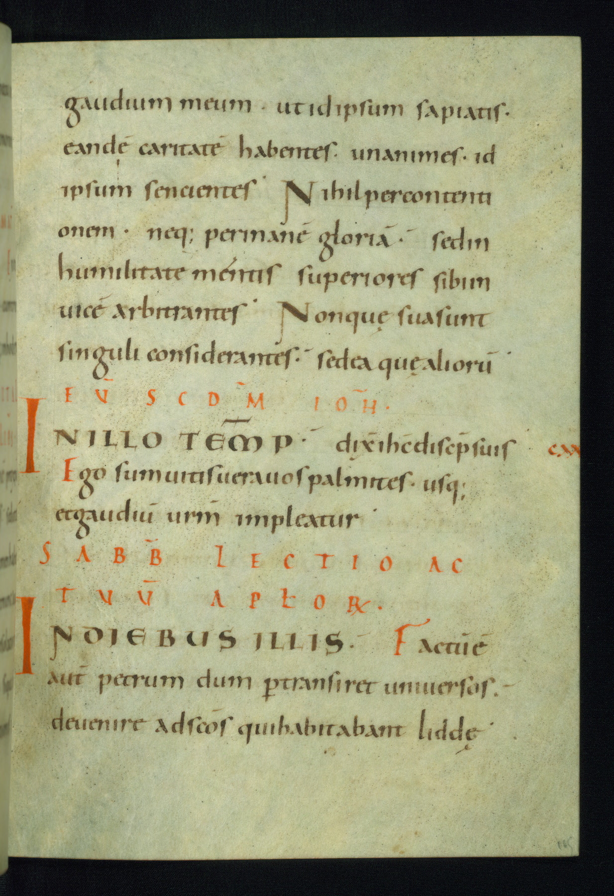 This Lectionary was created ca. 1000 in Trier. Written in a clear Caroline minuscule, it contains decorated initials at the openings of important readings. A set of illuminated letters marks the beginning of the Epistle and Gospel lessons for Easter; they display the hierarchy of scripts with capital letters decorated with gold leaf or drawn in red ink, followed by uncial and Caroline minuscule. Initials in orange, sometimes filled with gold, mark the divisions of the text. The book has been stylistically compared with Ottonian manuscripts, especially with a Psalter preserved in Trier (Stadtbibliothek, Ms. 7) illuminated by the so-called Master of the Registrum Gregorii.