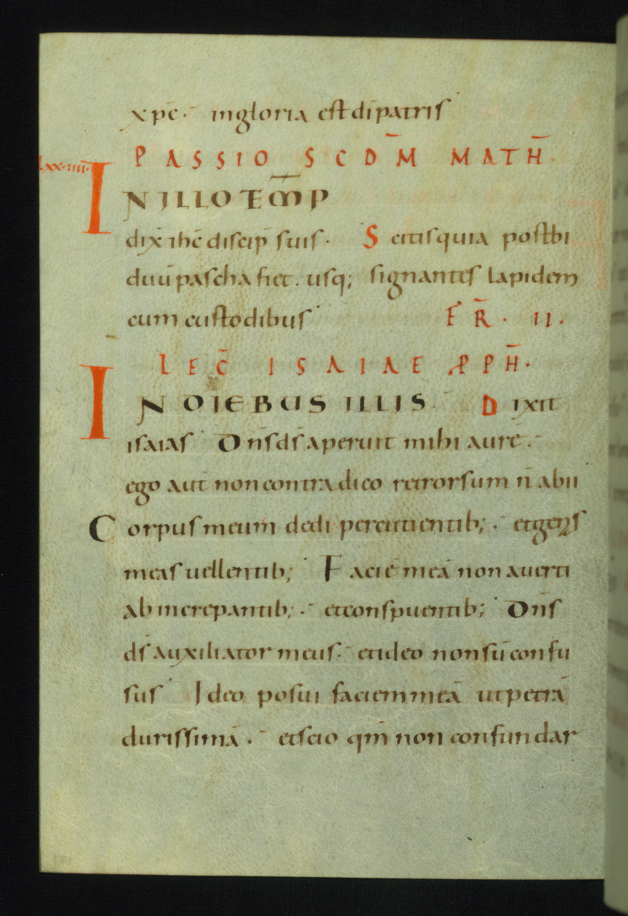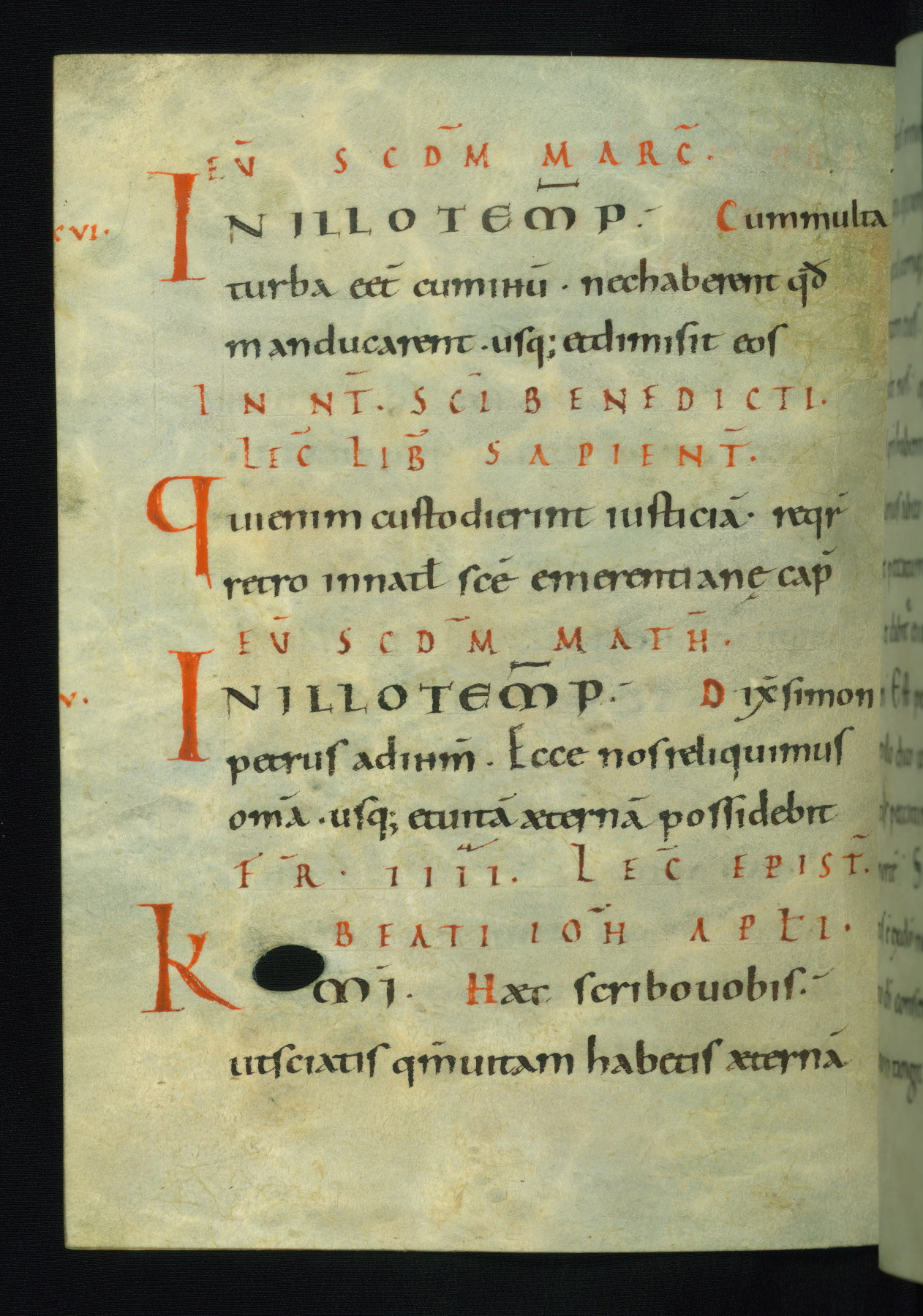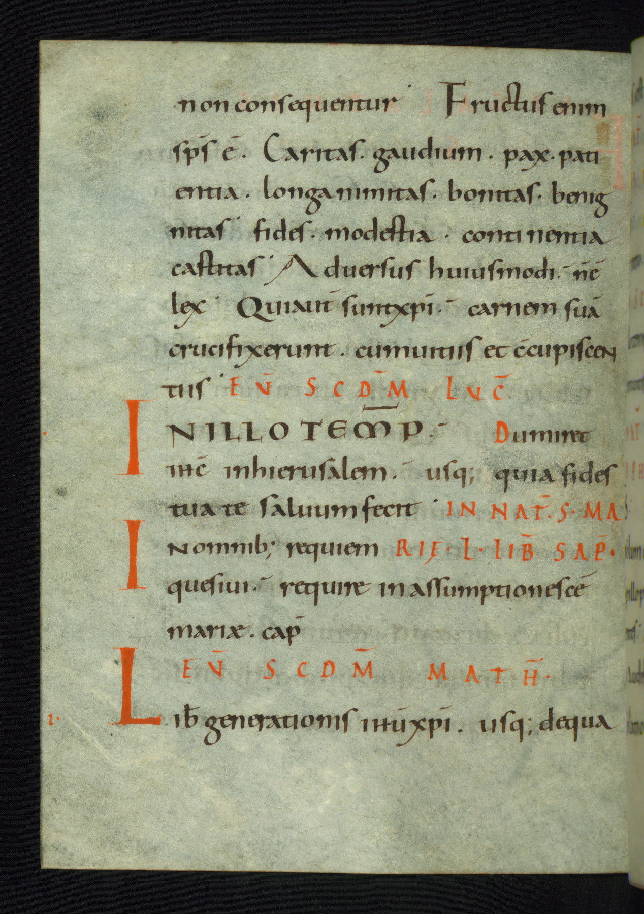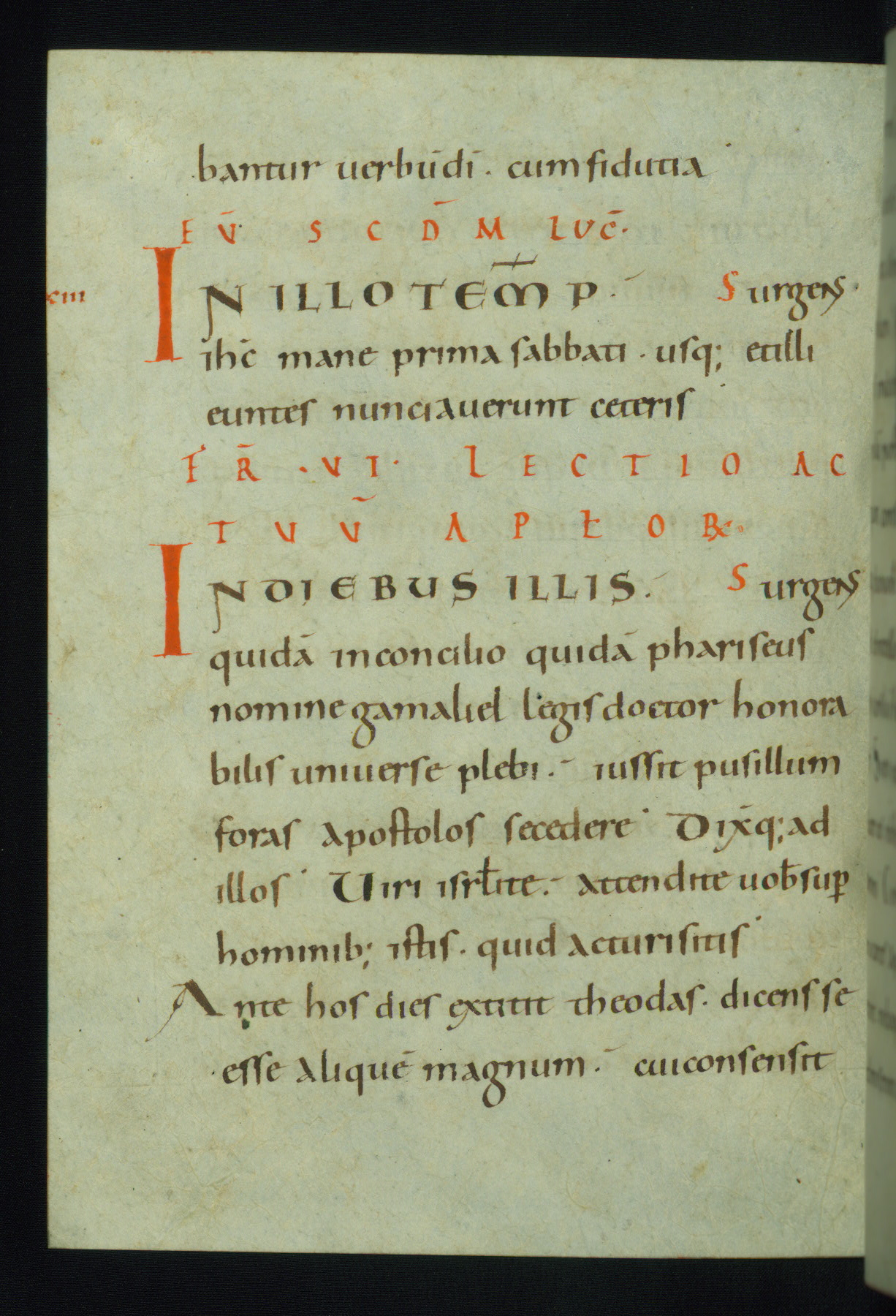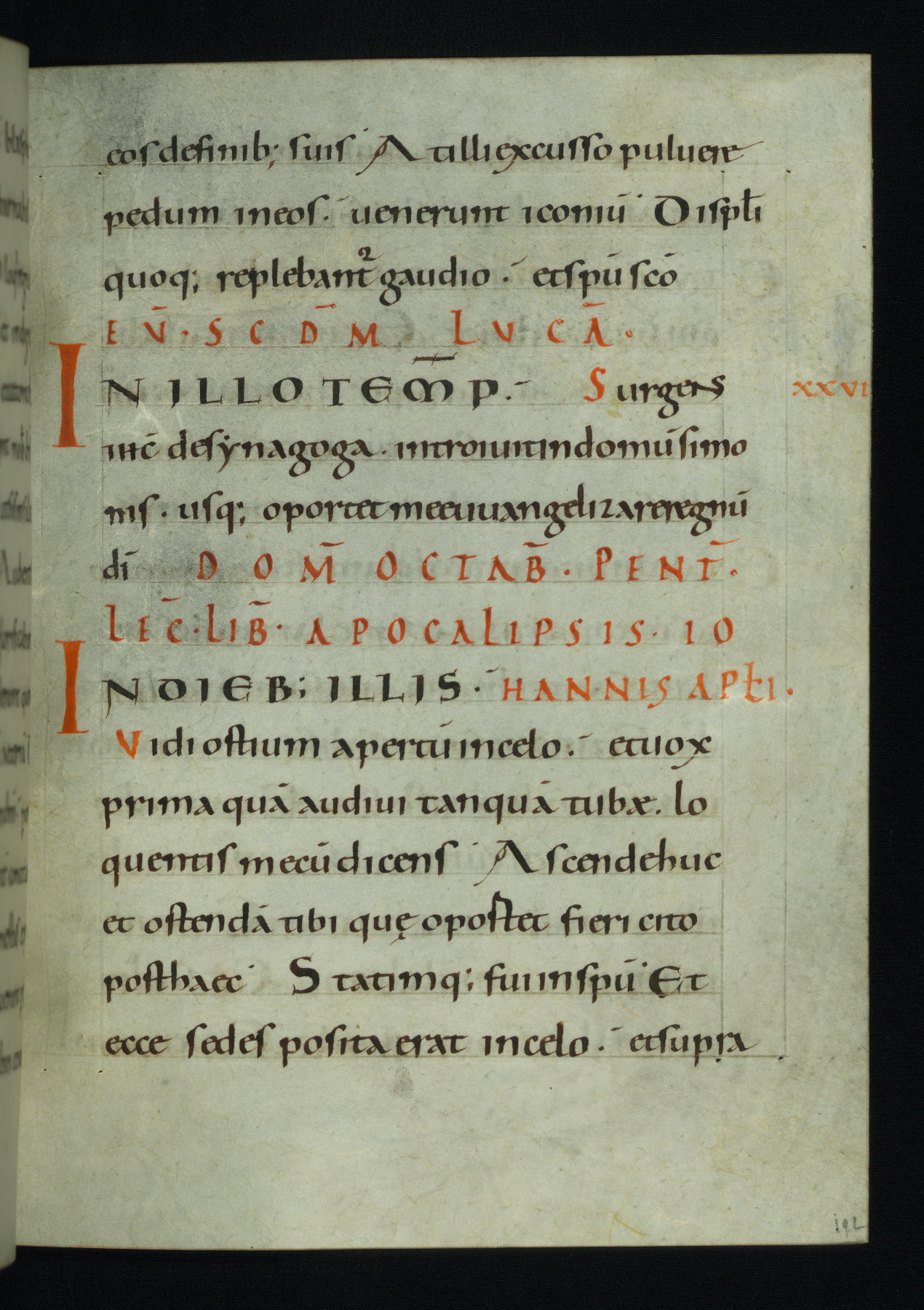 This Lectionary was created ca. 1000 in Trier. Written in a clear Caroline minuscule, it contains decorated initials at the openings of important readings. A set of illuminated letters marks the beginning of the Epistle and Gospel lessons for Easter; they display the hierarchy of scripts with capital letters decorated with gold leaf or drawn in red ink, followed by uncial and Caroline minuscule. Initials in orange, sometimes filled with gold, mark the divisions of the text. The book has been stylistically compared with Ottonian manuscripts, especially with a Psalter preserved in Trier (Stadtbibliothek, Ms. 7) illuminated by the so-called Master of the Registrum Gregorii.