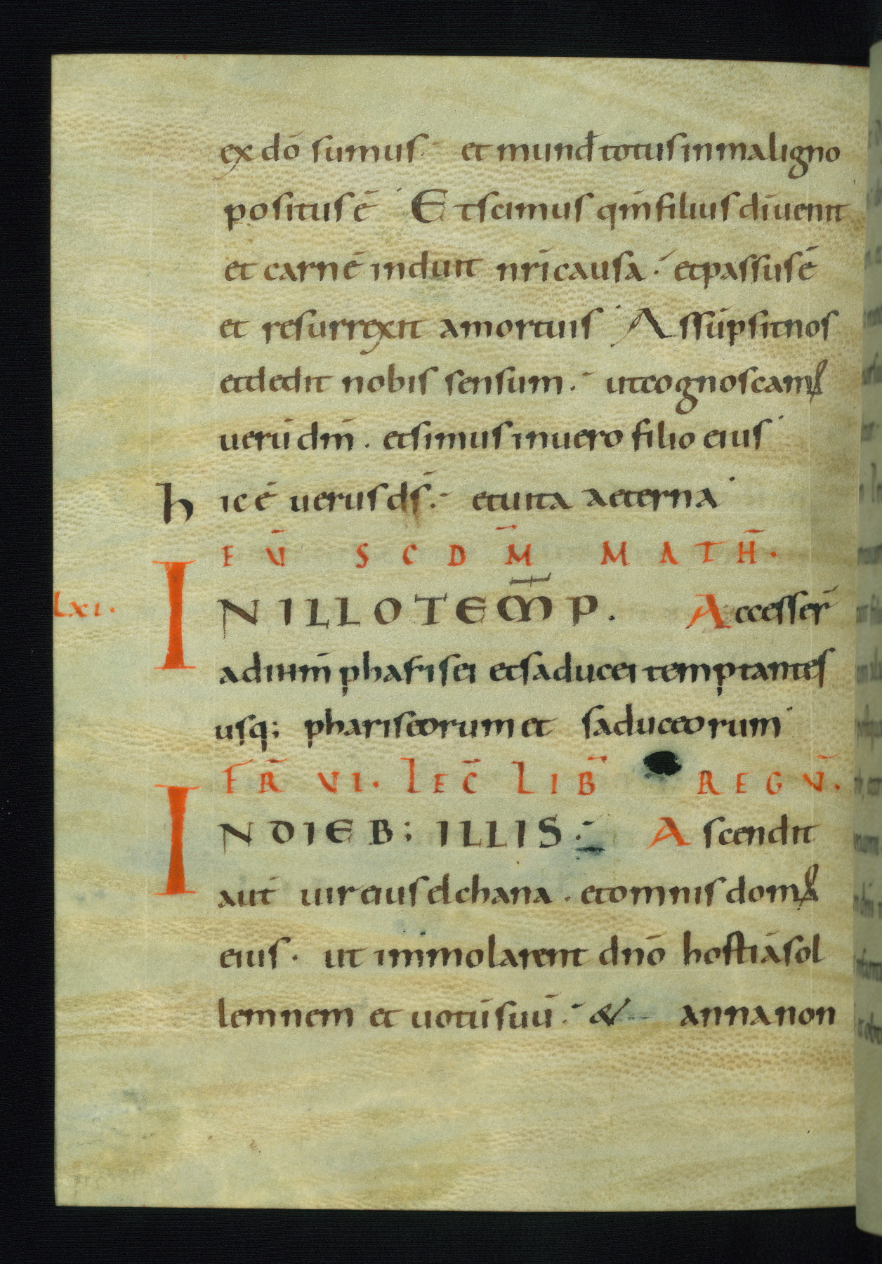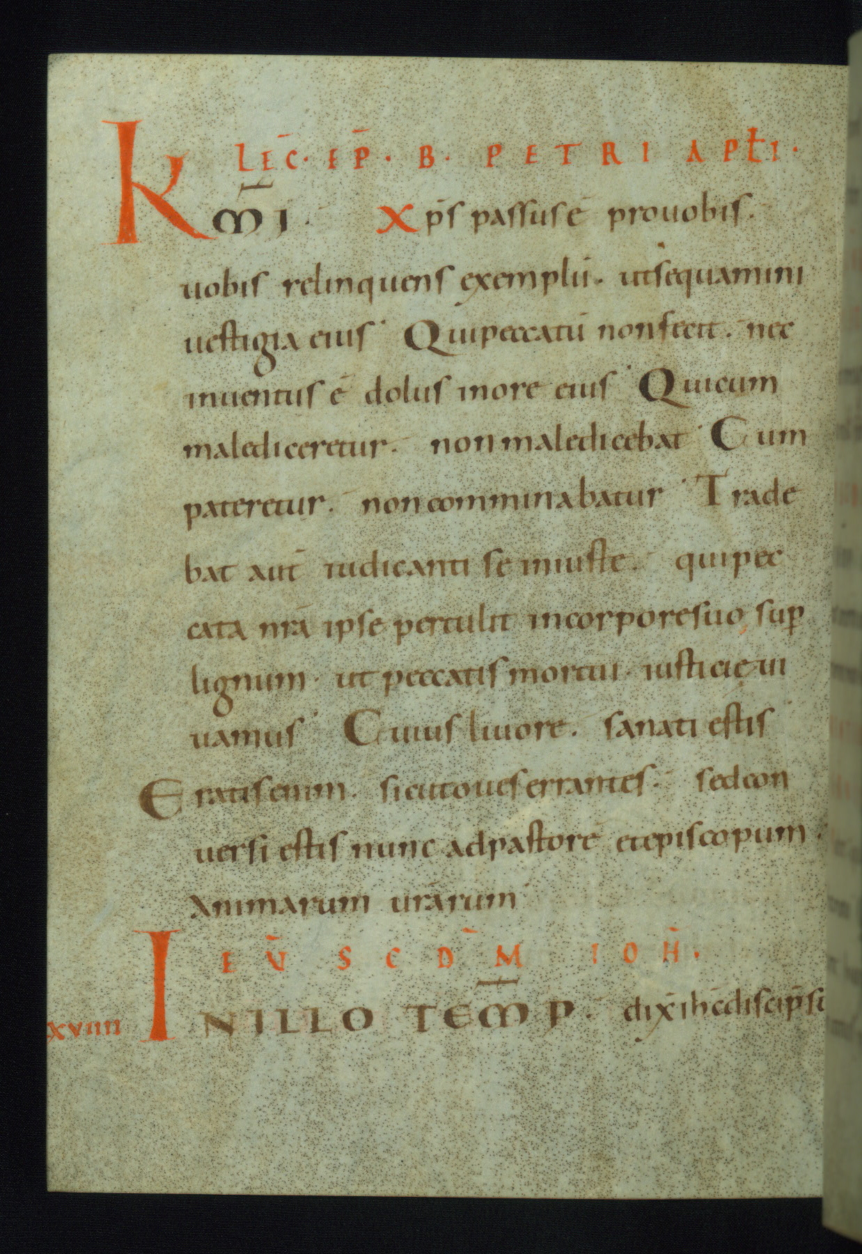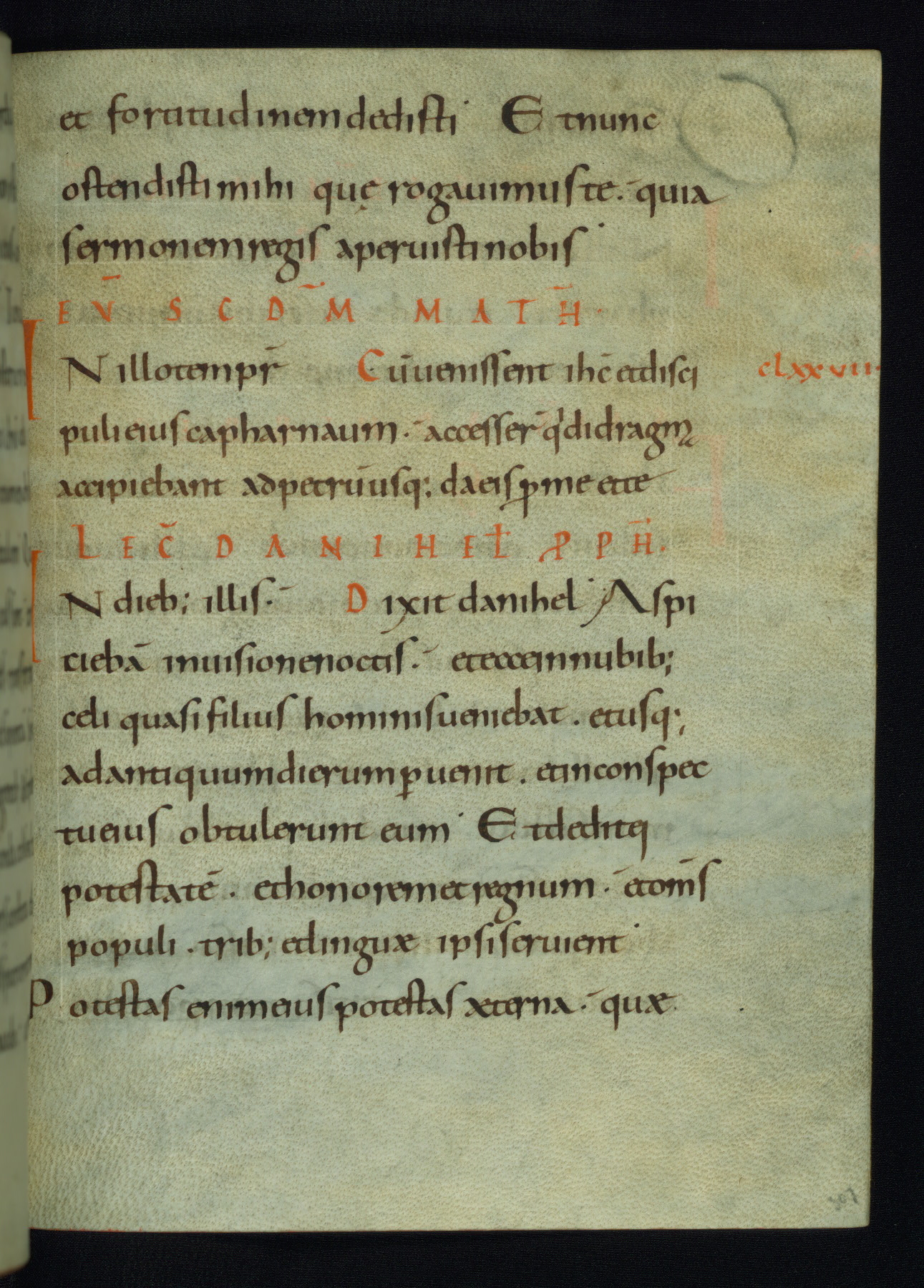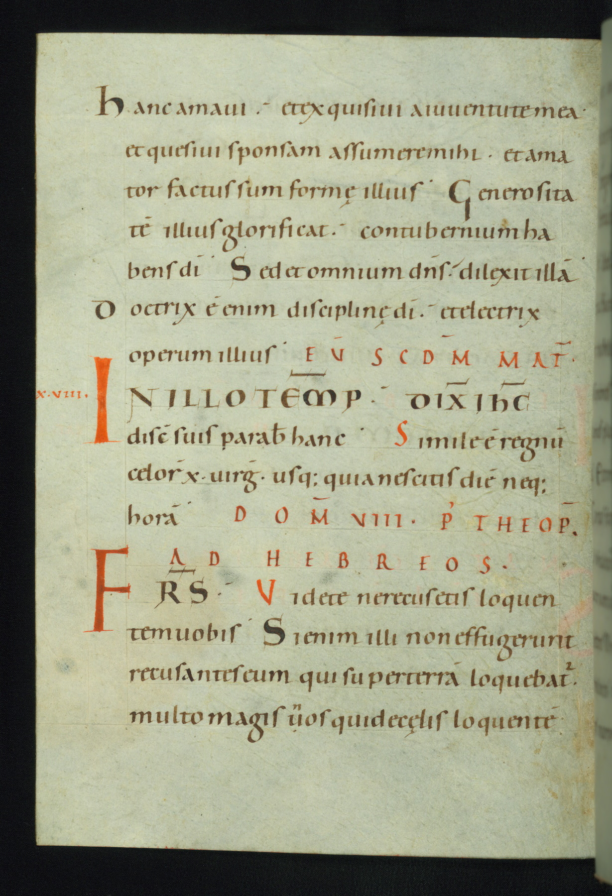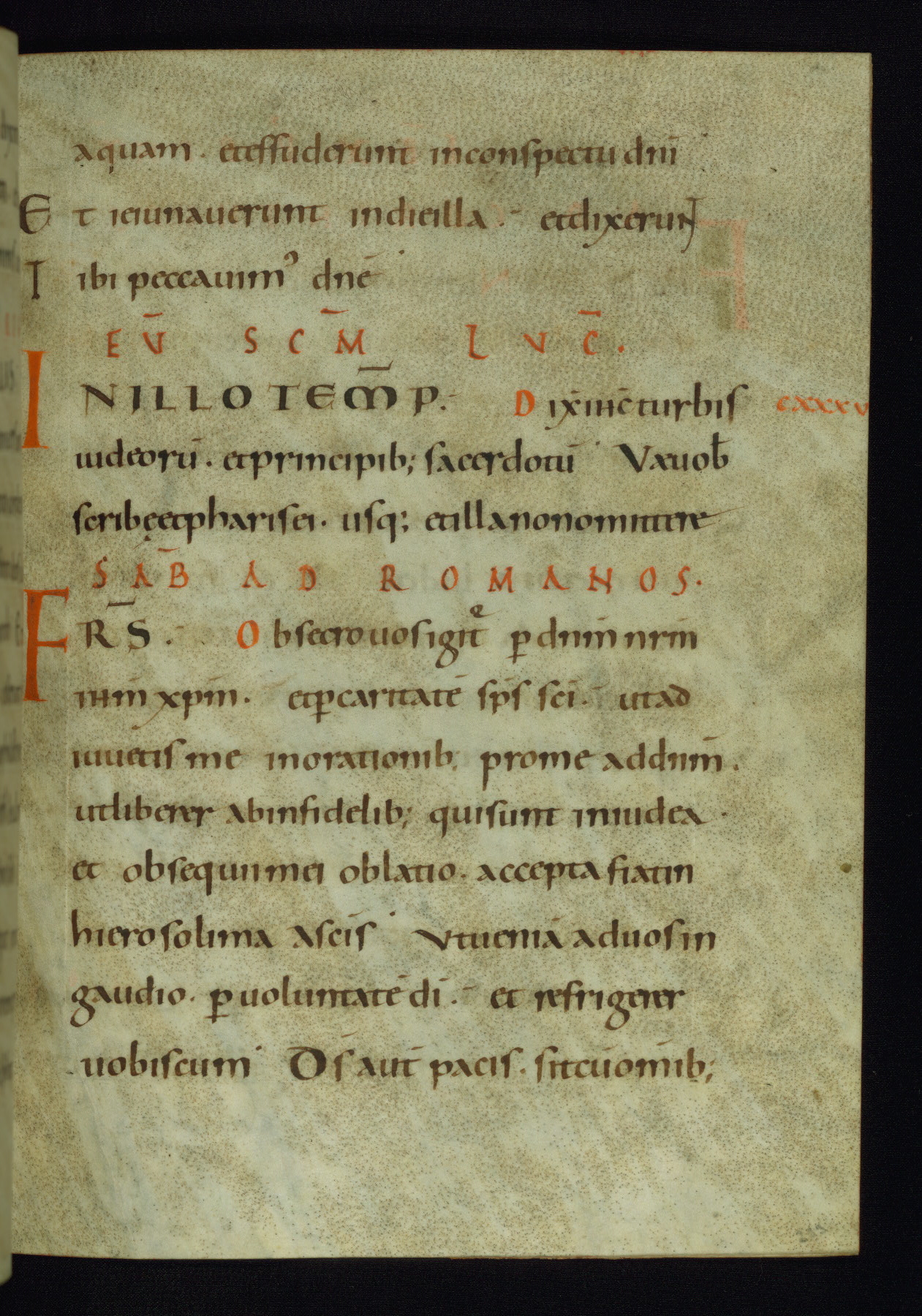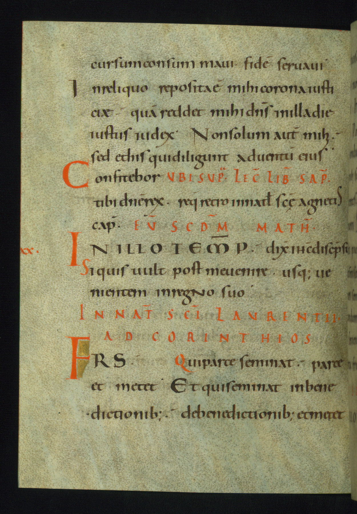 This Lectionary was created ca. 1000 in Trier. Written in a clear Caroline minuscule, it contains decorated initials at the openings of important readings. A set of illuminated letters marks the beginning of the Epistle and Gospel lessons for Easter; they display the hierarchy of scripts with capital letters decorated with gold leaf or drawn in red ink, followed by uncial and Caroline minuscule. Initials in orange, sometimes filled with gold, mark the divisions of the text. The book has been stylistically compared with Ottonian manuscripts, especially with a Psalter preserved in Trier (Stadtbibliothek, Ms. 7) illuminated by the so-called Master of the Registrum Gregorii.