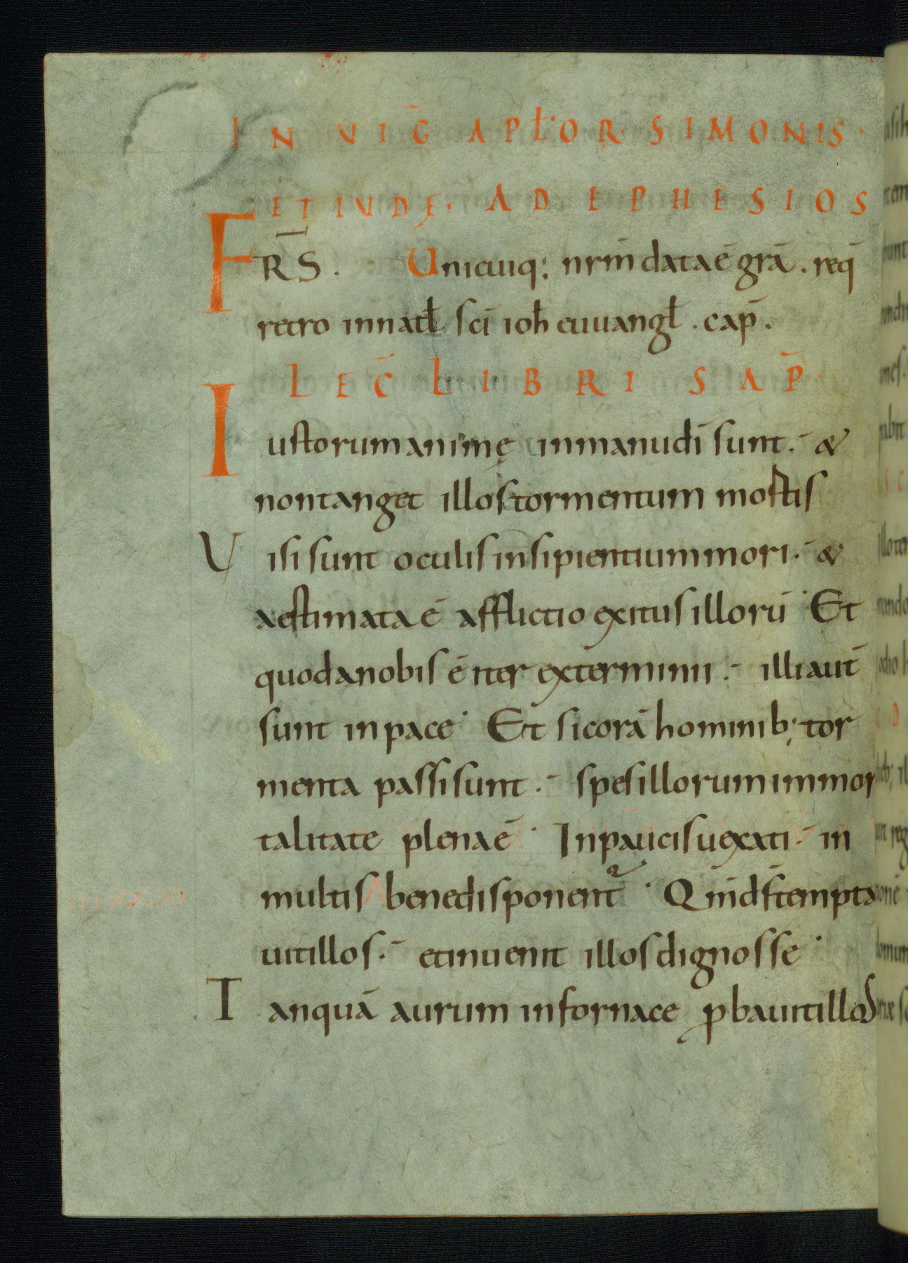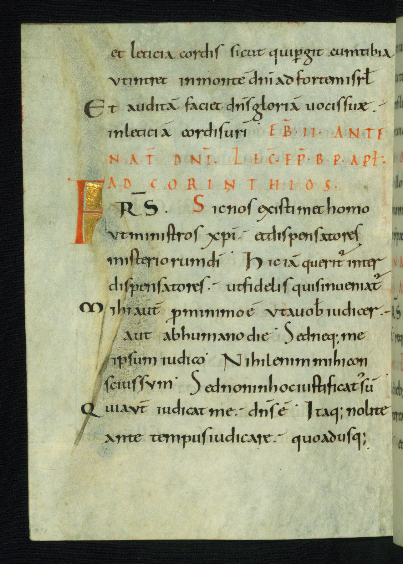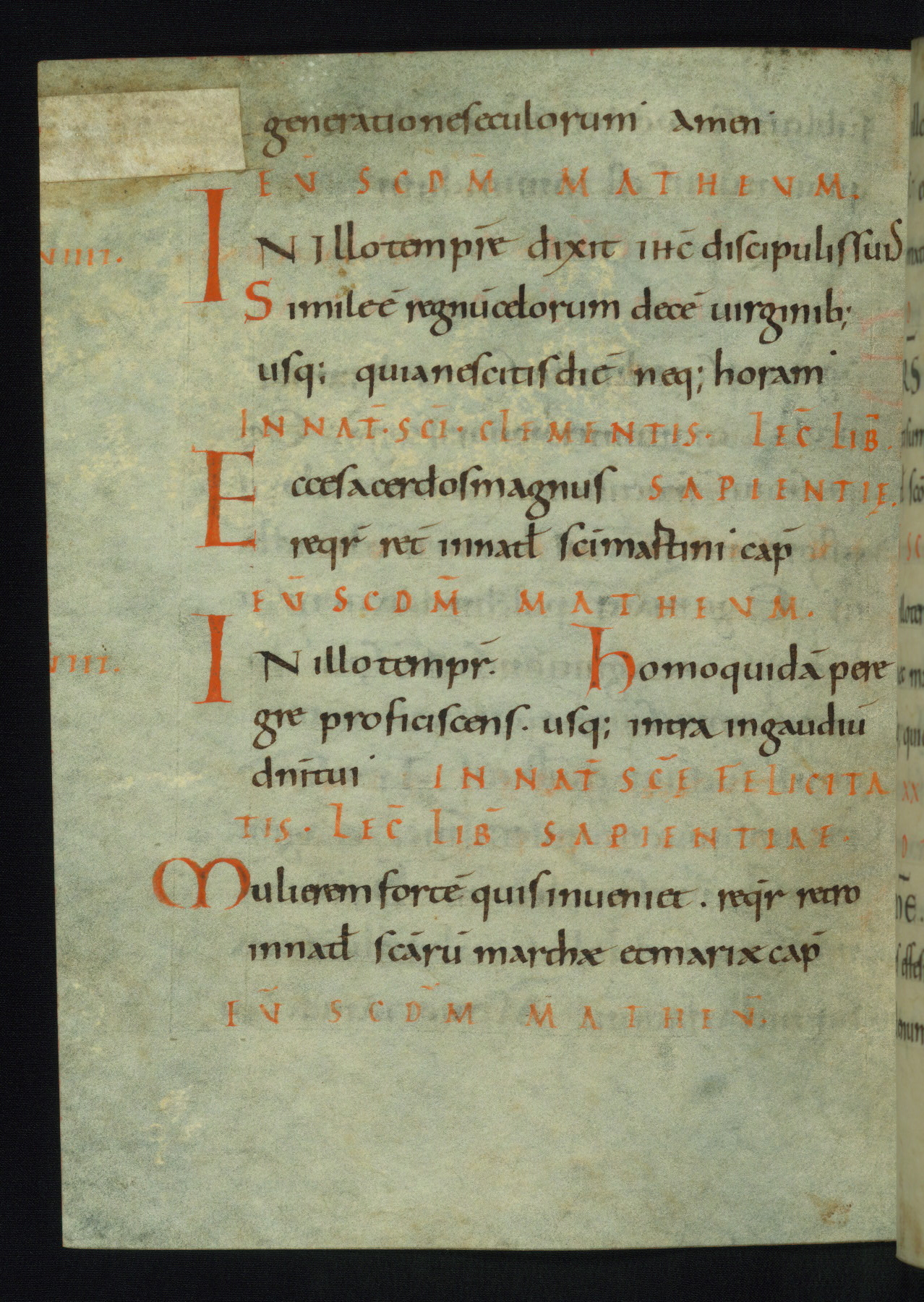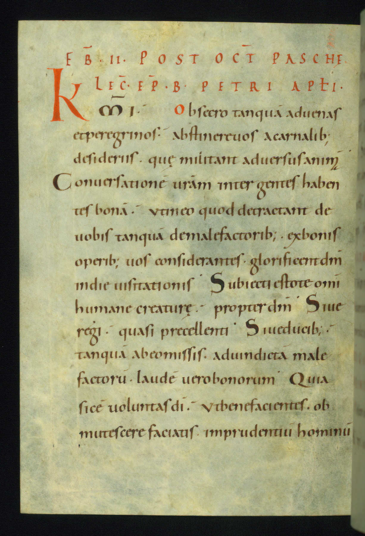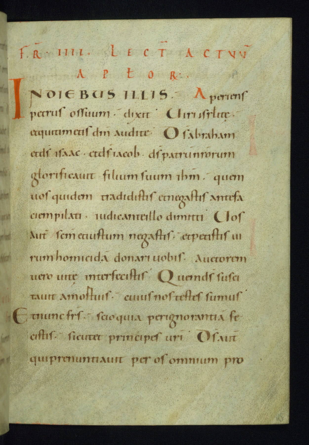 This Lectionary was created ca. 1000 in Trier. Written in a clear Caroline minuscule, it contains decorated initials at the openings of important readings. A set of illuminated letters marks the beginning of the Epistle and Gospel lessons for Easter; they display the hierarchy of scripts with capital letters decorated with gold leaf or drawn in red ink, followed by uncial and Caroline minuscule. Initials in orange, sometimes filled with gold, mark the divisions of the text. The book has been stylistically compared with Ottonian manuscripts, especially with a Psalter preserved in Trier (Stadtbibliothek, Ms. 7) illuminated by the so-called Master of the Registrum Gregorii.