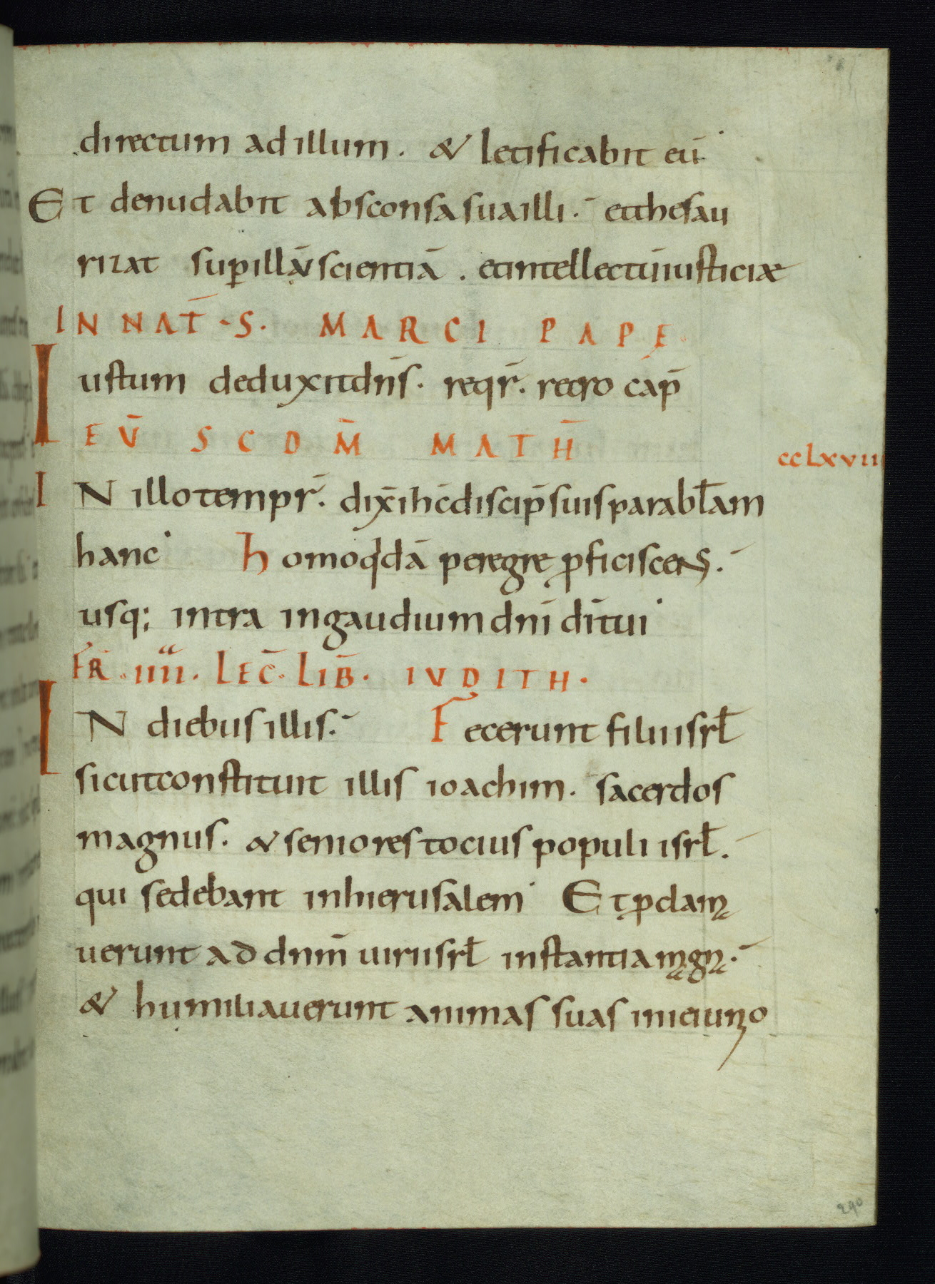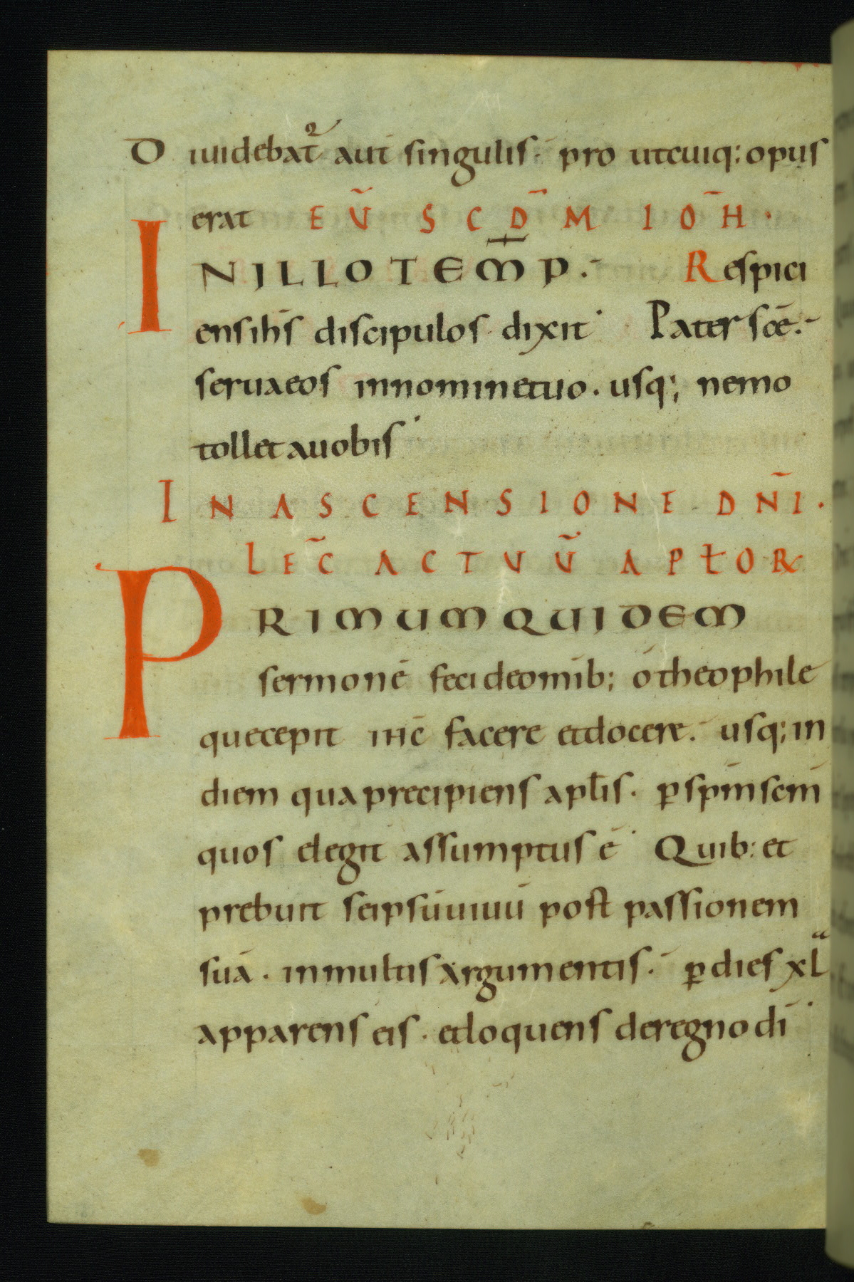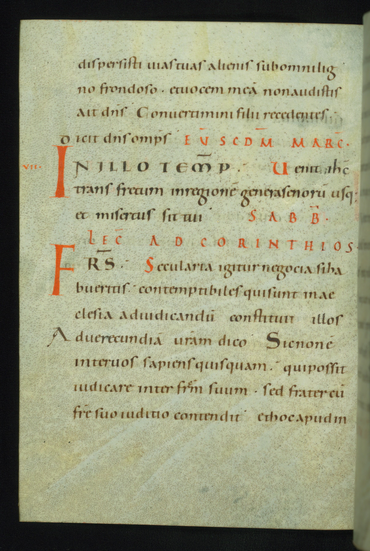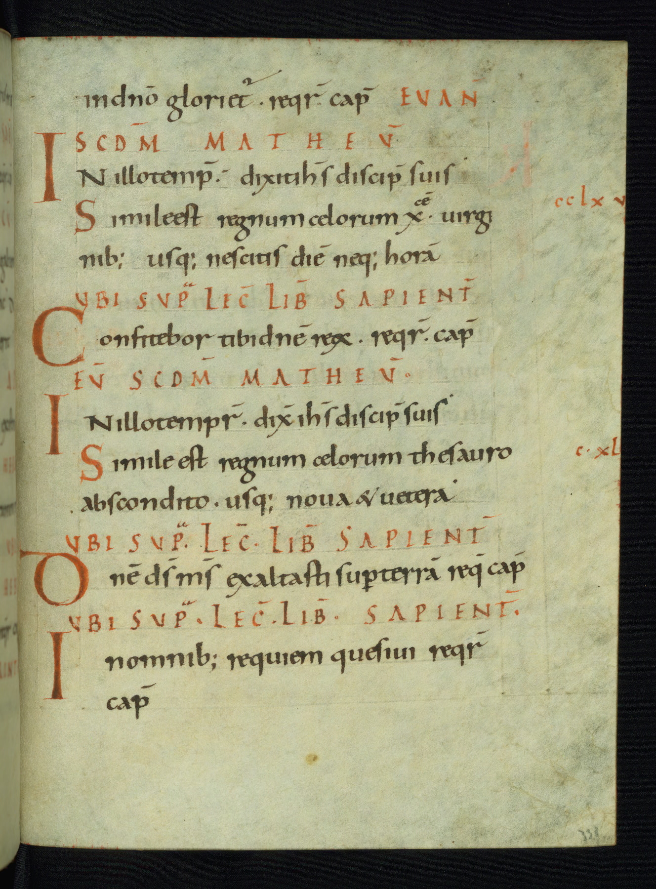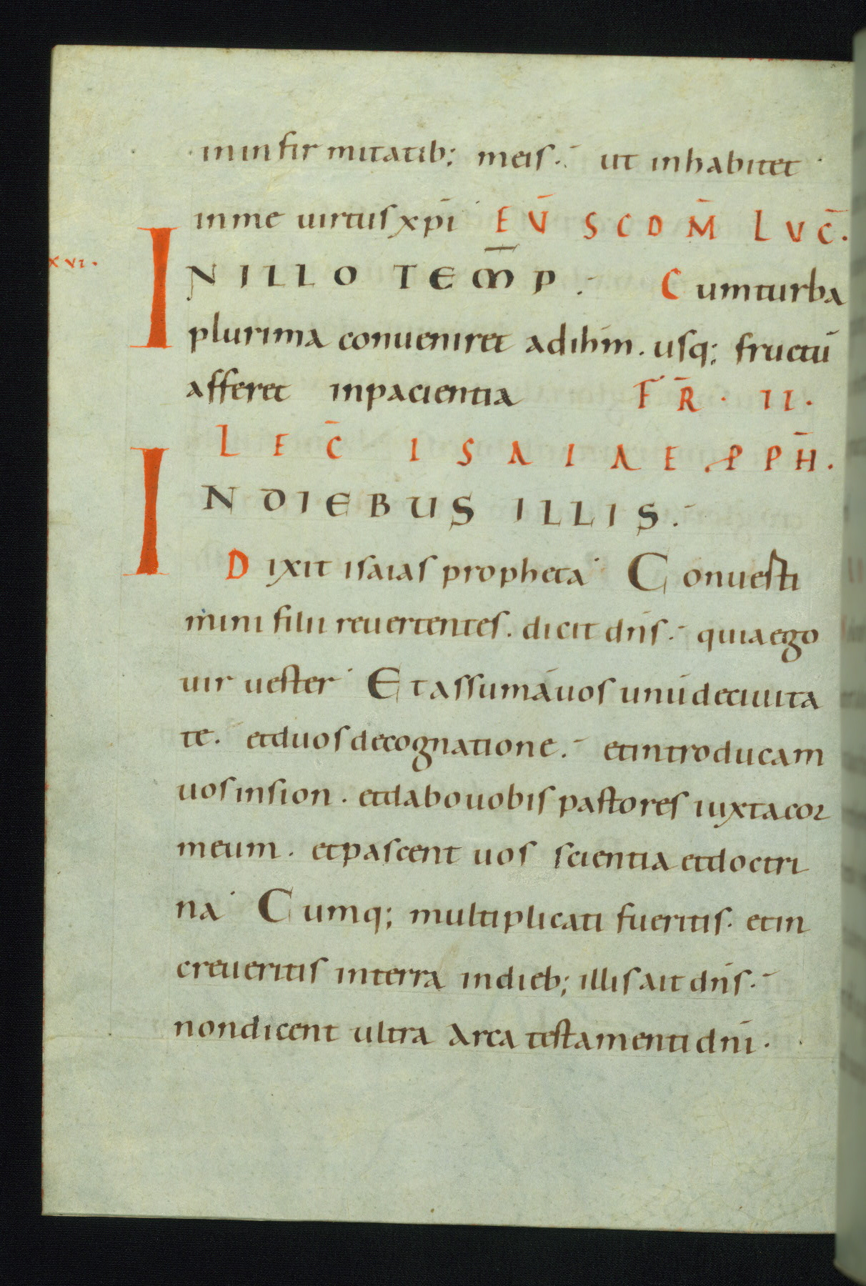 This Lectionary was created ca. 1000 in Trier. Written in a clear Caroline minuscule, it contains decorated initials at the openings of important readings. A set of illuminated letters marks the beginning of the Epistle and Gospel lessons for Easter; they display the hierarchy of scripts with capital letters decorated with gold leaf or drawn in red ink, followed by uncial and Caroline minuscule. Initials in orange, sometimes filled with gold, mark the divisions of the text. The book has been stylistically compared with Ottonian manuscripts, especially with a Psalter preserved in Trier (Stadtbibliothek, Ms. 7) illuminated by the so-called Master of the Registrum Gregorii.