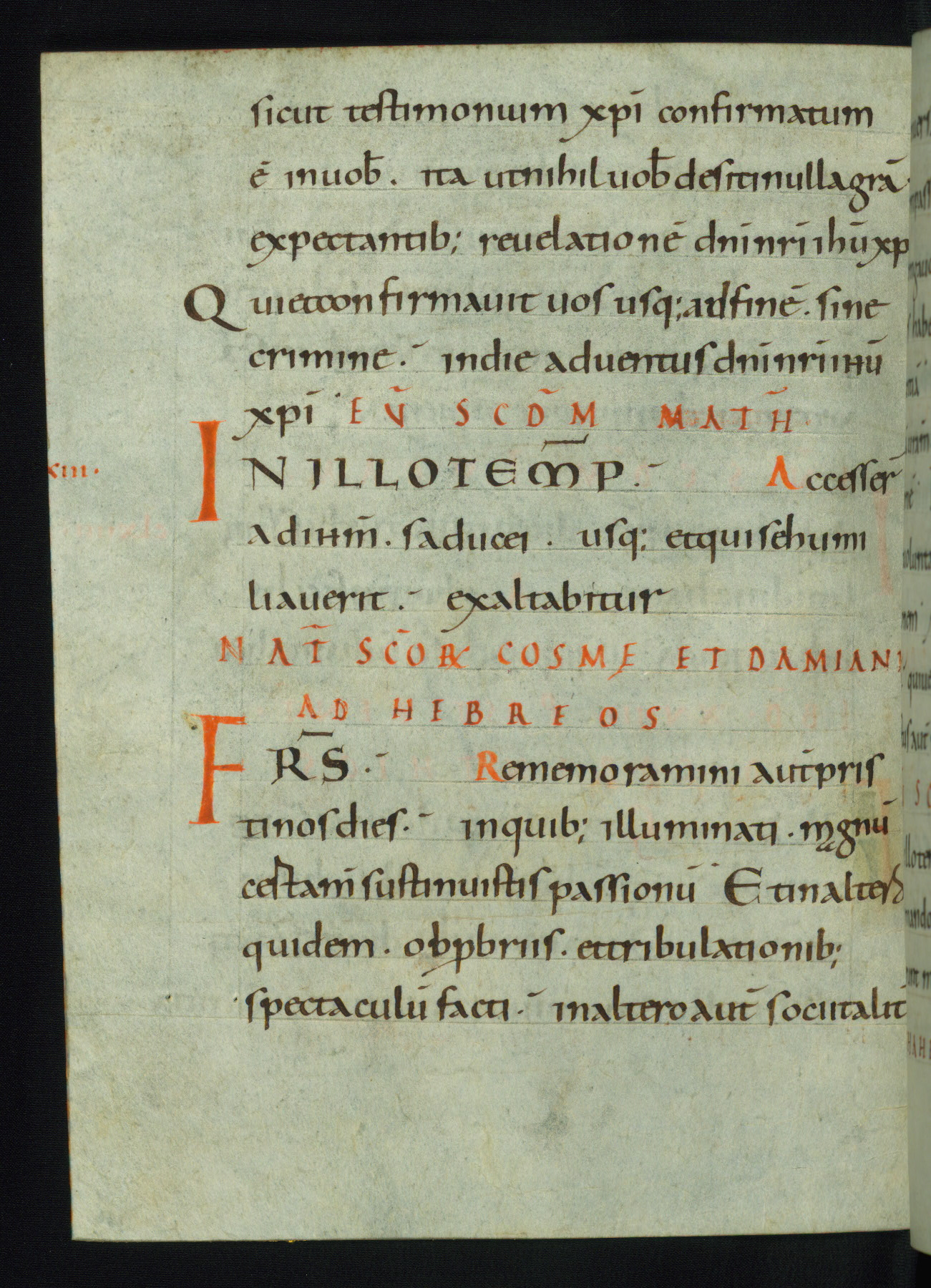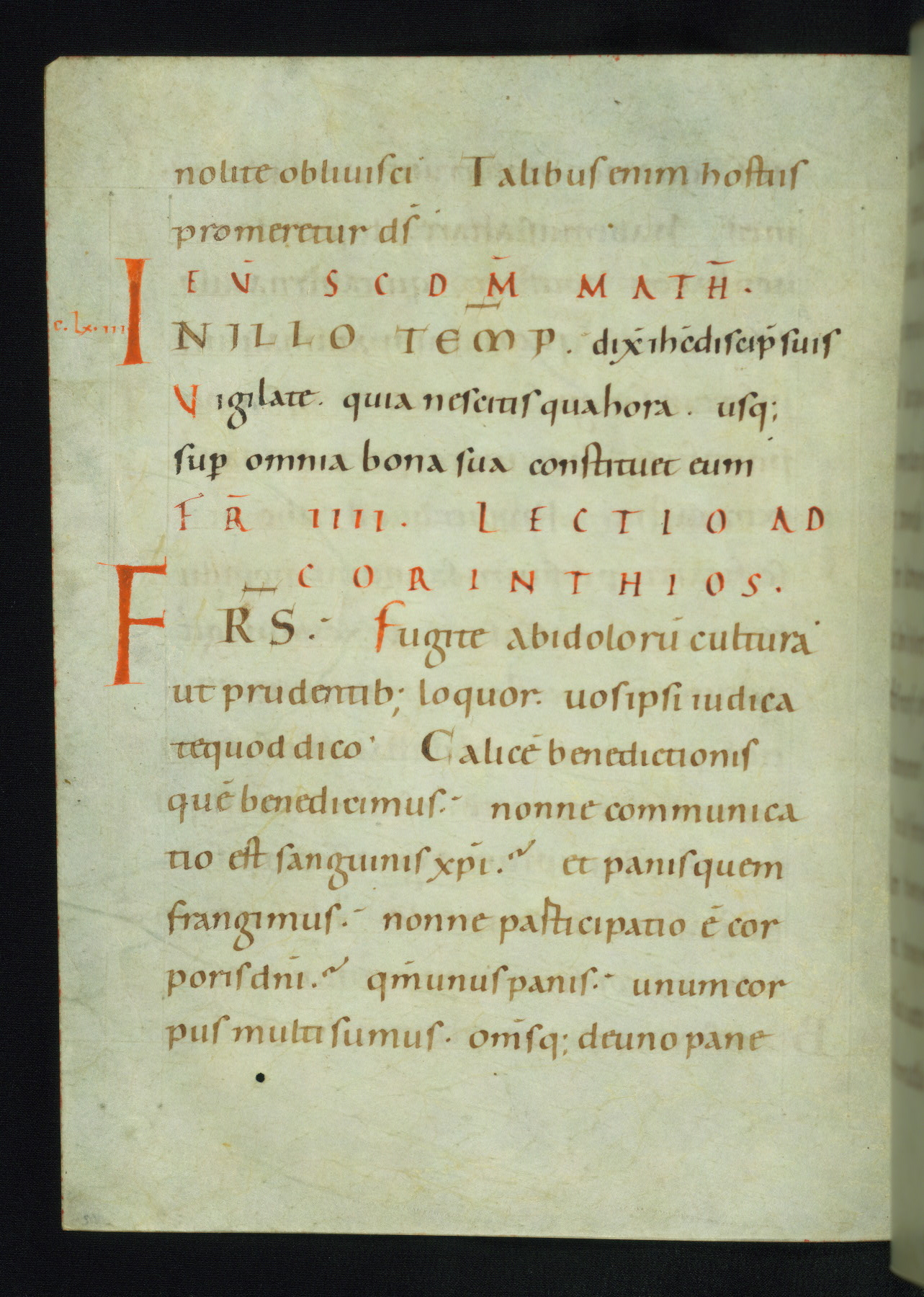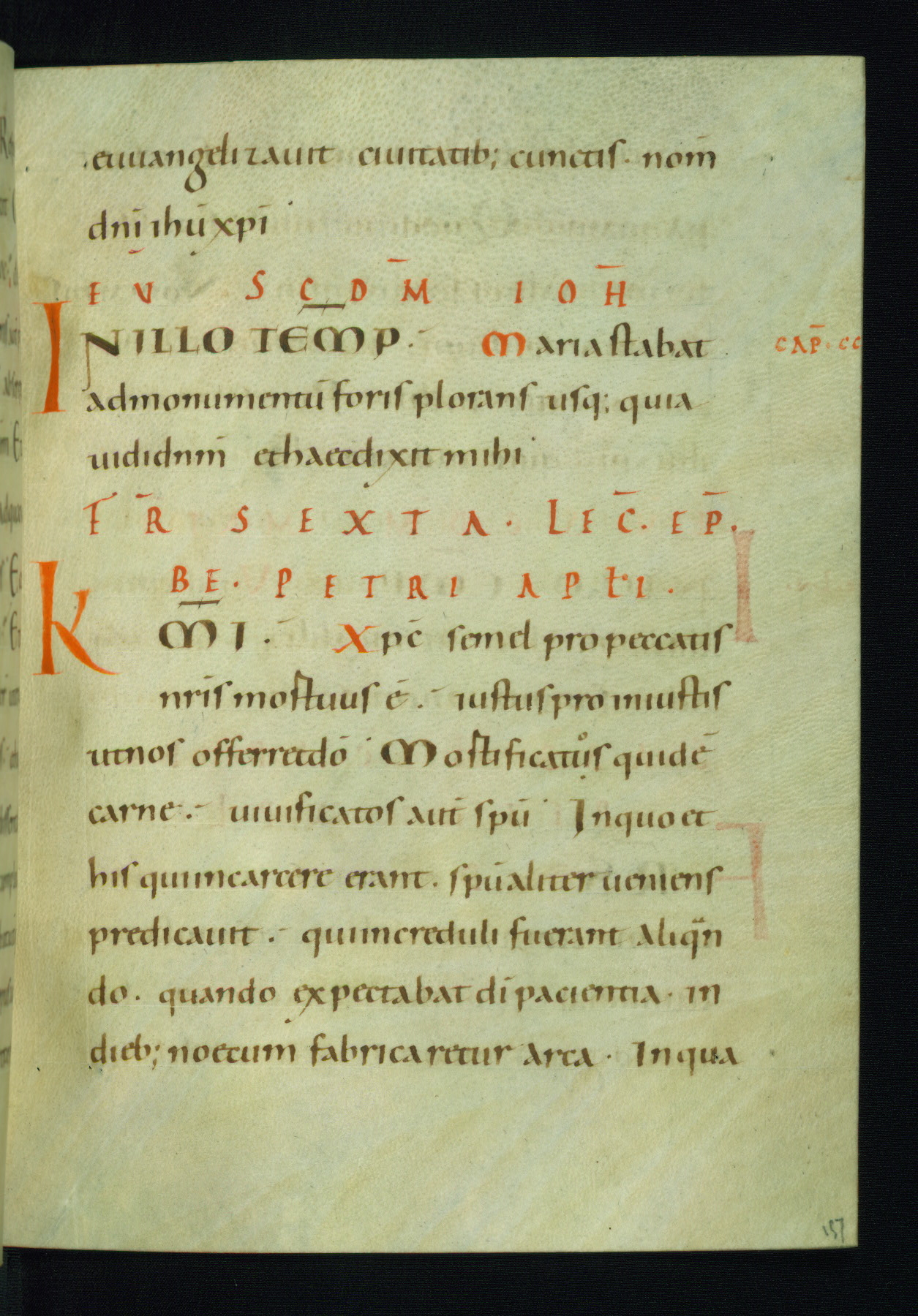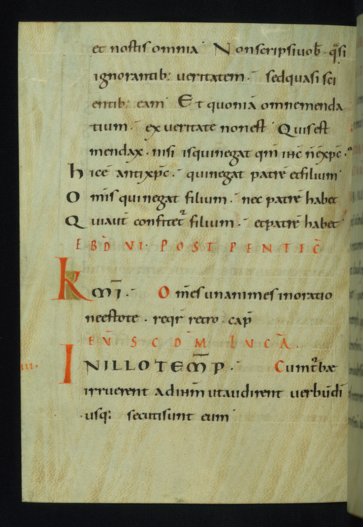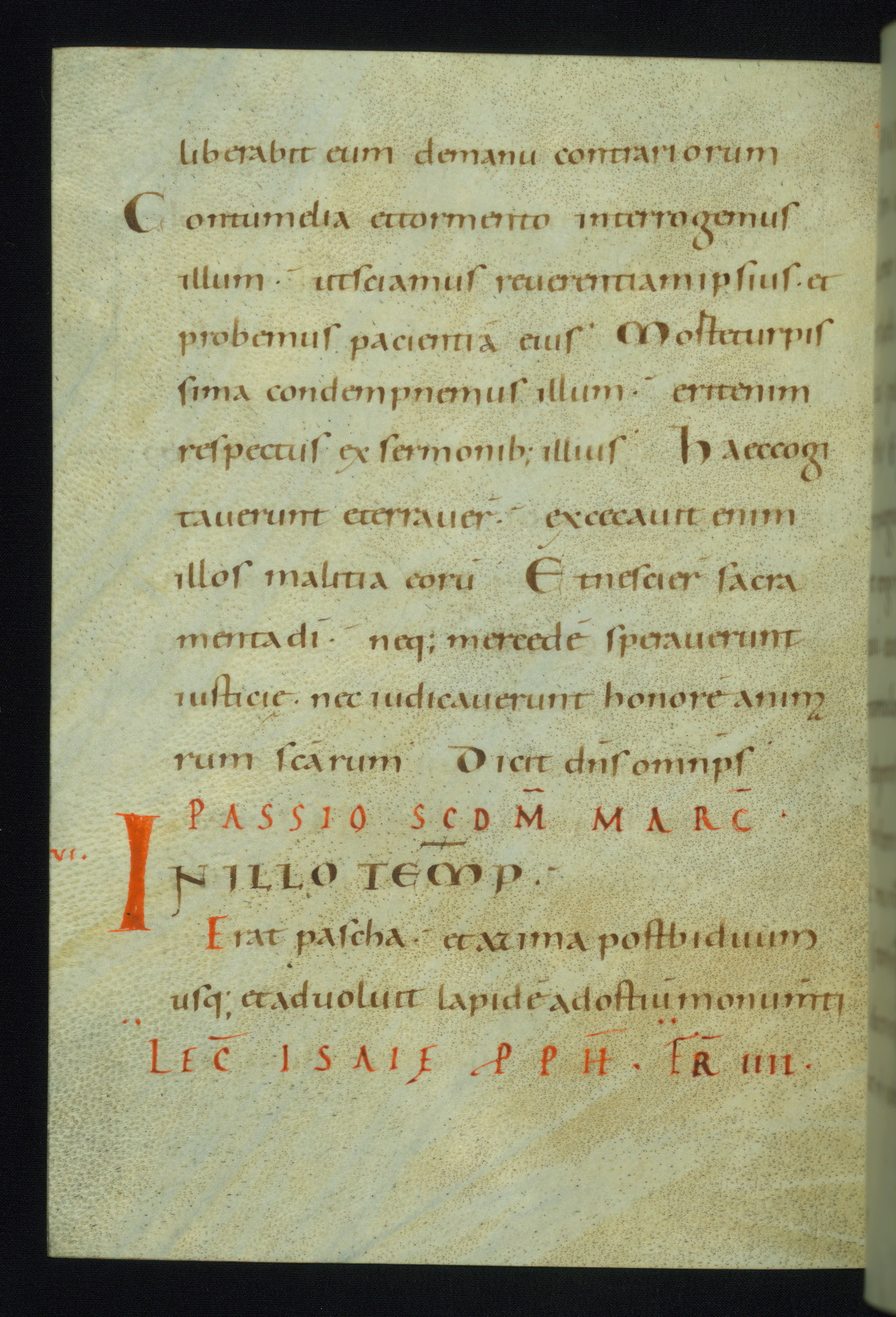 This Lectionary was created ca. 1000 in Trier. Written in a clear Caroline minuscule, it contains decorated initials at the openings of important readings. A set of illuminated letters marks the beginning of the Epistle and Gospel lessons for Easter; they display the hierarchy of scripts with capital letters decorated with gold leaf or drawn in red ink, followed by uncial and Caroline minuscule. Initials in orange, sometimes filled with gold, mark the divisions of the text. The book has been stylistically compared with Ottonian manuscripts, especially with a Psalter preserved in Trier (Stadtbibliothek, Ms. 7) illuminated by the so-called Master of the Registrum Gregorii.