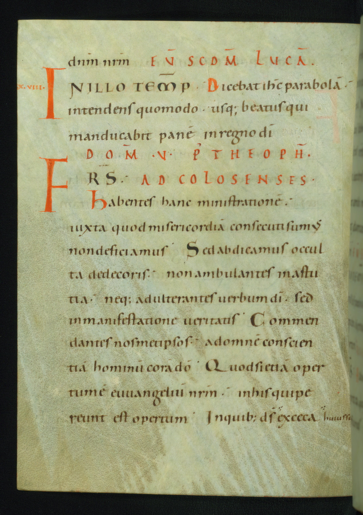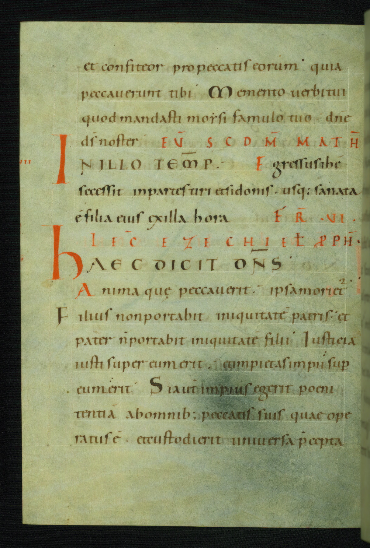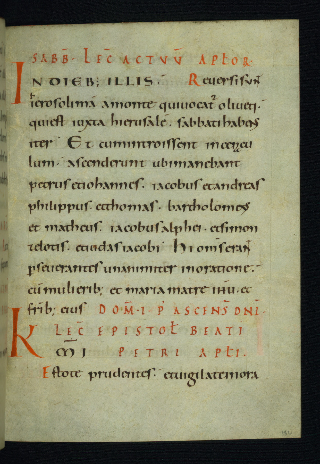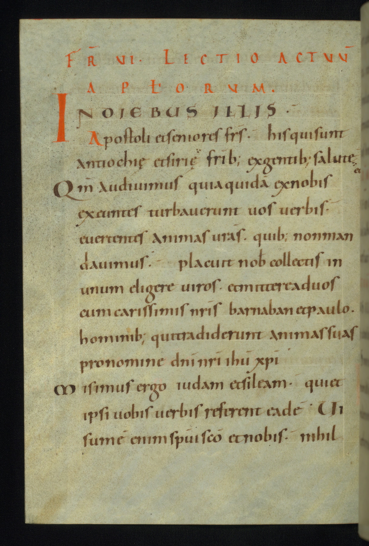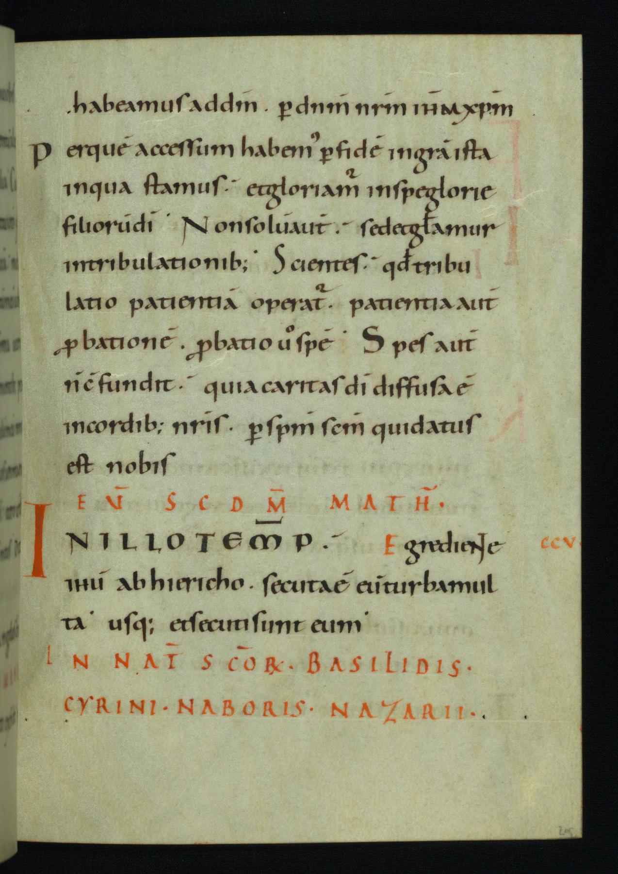 This Lectionary was created ca. 1000 in Trier. Written in a clear Caroline minuscule, it contains decorated initials at the openings of important readings. A set of illuminated letters marks the beginning of the Epistle and Gospel lessons for Easter; they display the hierarchy of scripts with capital letters decorated with gold leaf or drawn in red ink, followed by uncial and Caroline minuscule. Initials in orange, sometimes filled with gold, mark the divisions of the text. The book has been stylistically compared with Ottonian manuscripts, especially with a Psalter preserved in Trier (Stadtbibliothek, Ms. 7) illuminated by the so-called Master of the Registrum Gregorii.