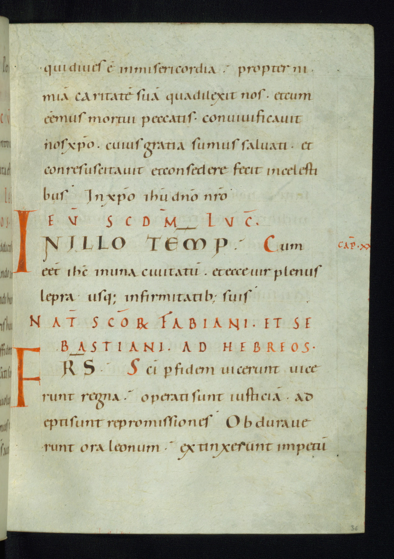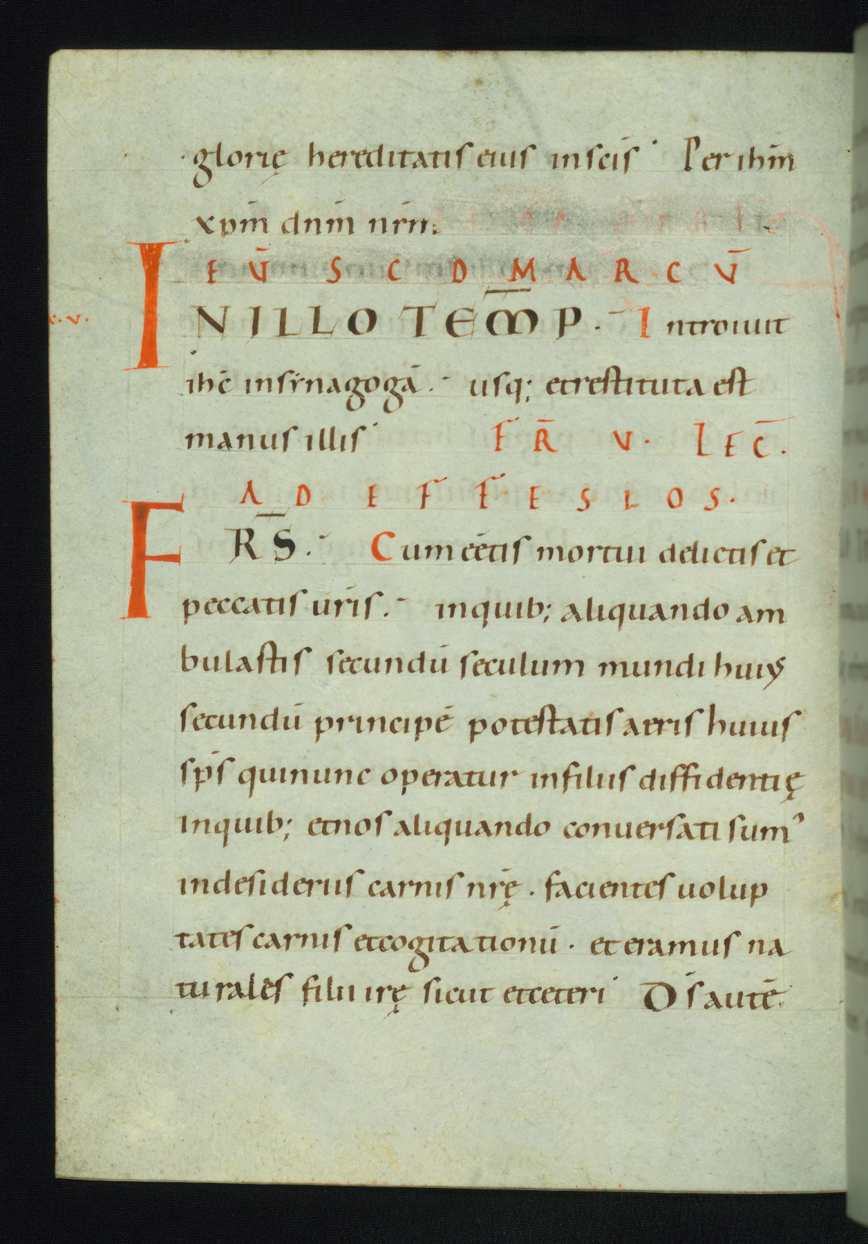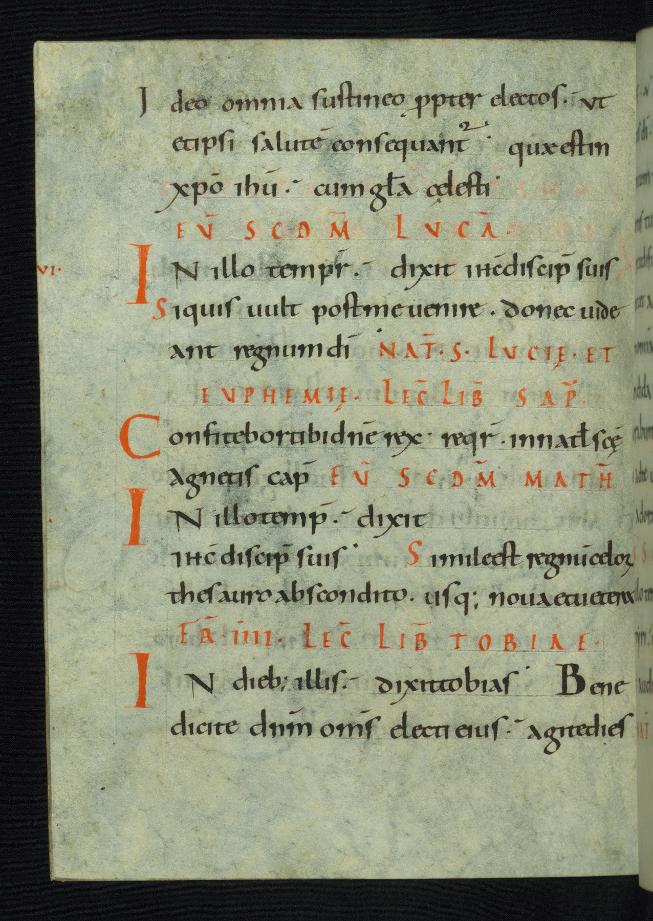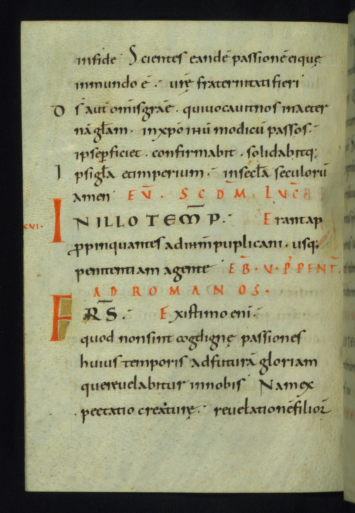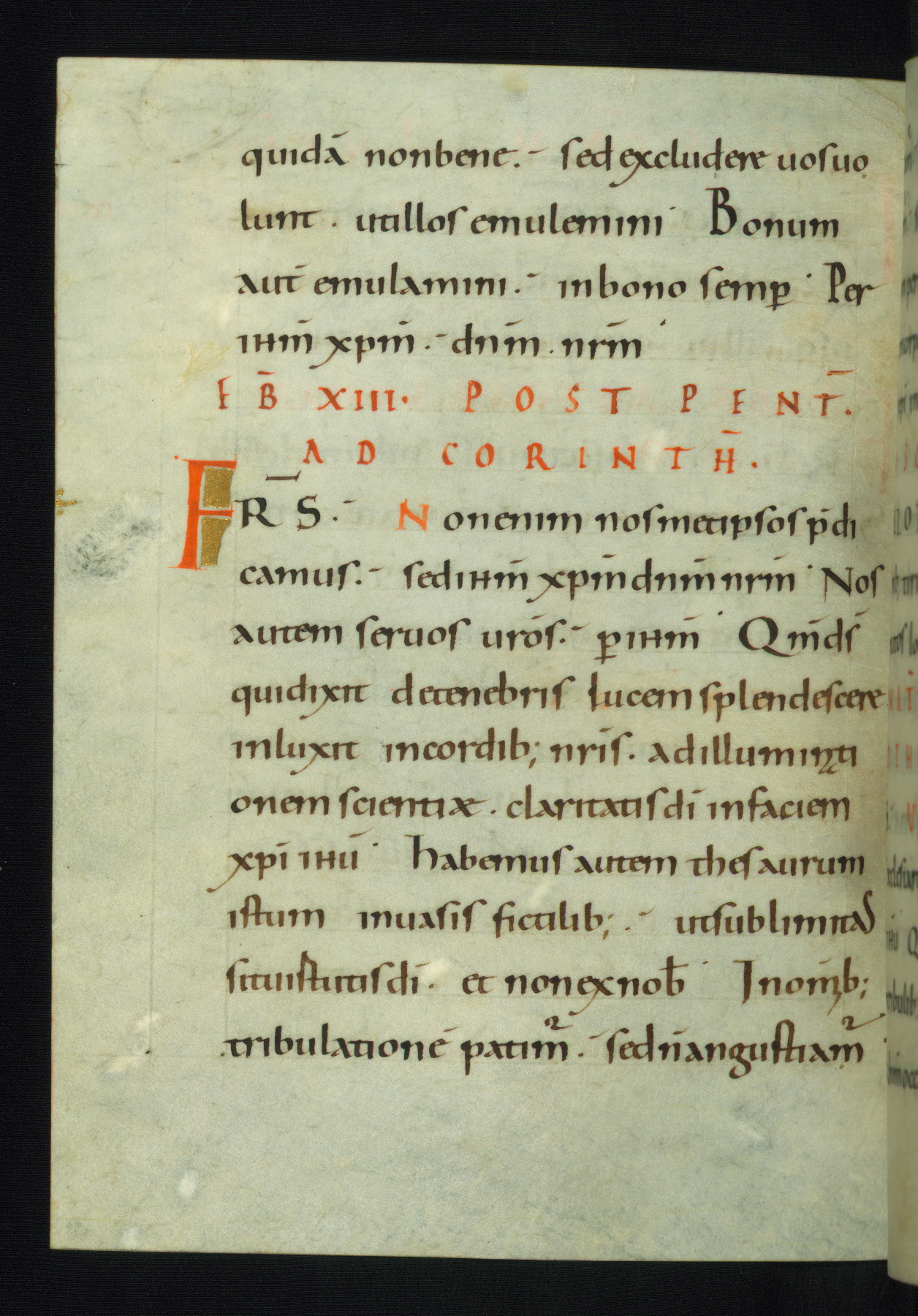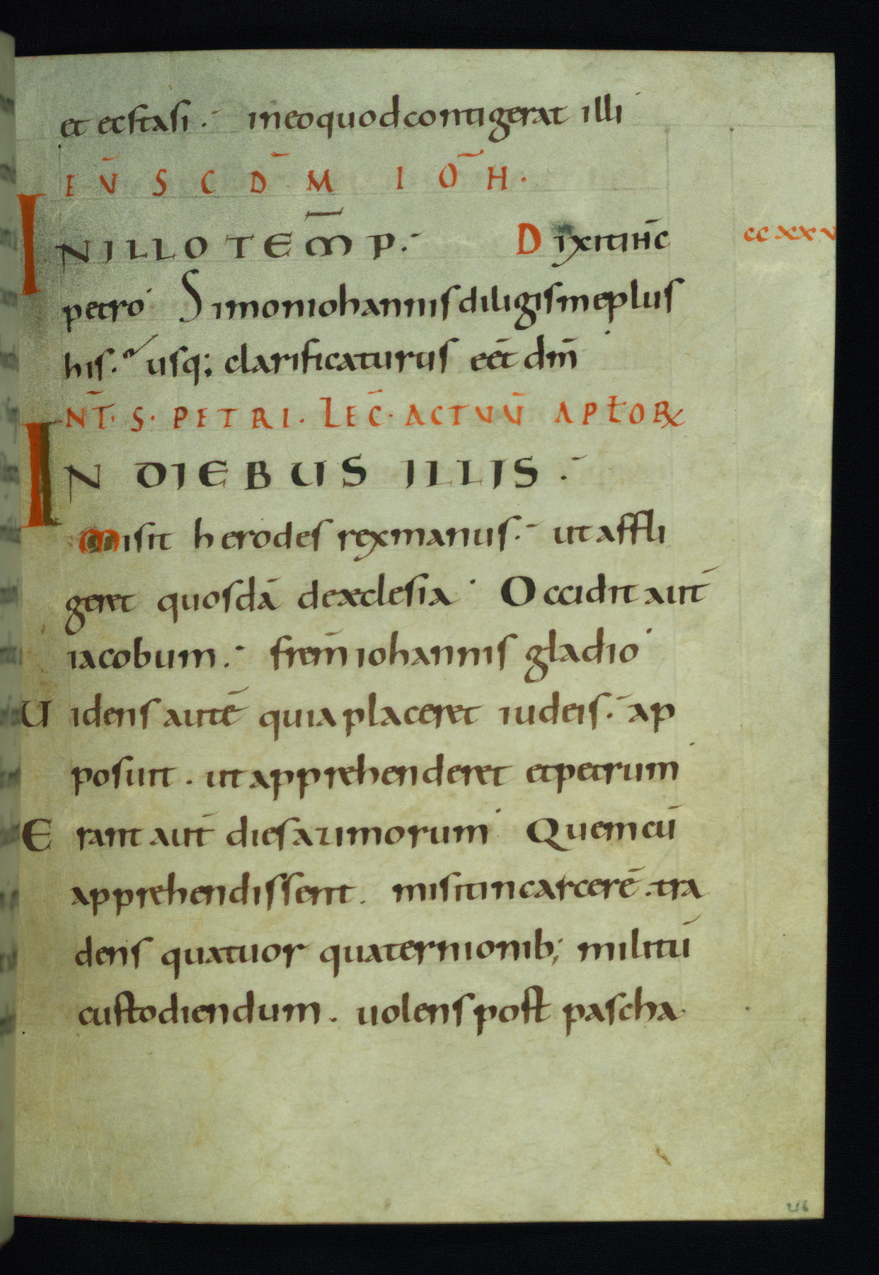 This Lectionary was created ca. 1000 in Trier. Written in a clear Caroline minuscule, it contains decorated initials at the openings of important readings. A set of illuminated letters marks the beginning of the Epistle and Gospel lessons for Easter; they display the hierarchy of scripts with capital letters decorated with gold leaf or drawn in red ink, followed by uncial and Caroline minuscule. Initials in orange, sometimes filled with gold, mark the divisions of the text. The book has been stylistically compared with Ottonian manuscripts, especially with a Psalter preserved in Trier (Stadtbibliothek, Ms. 7) illuminated by the so-called Master of the Registrum Gregorii.