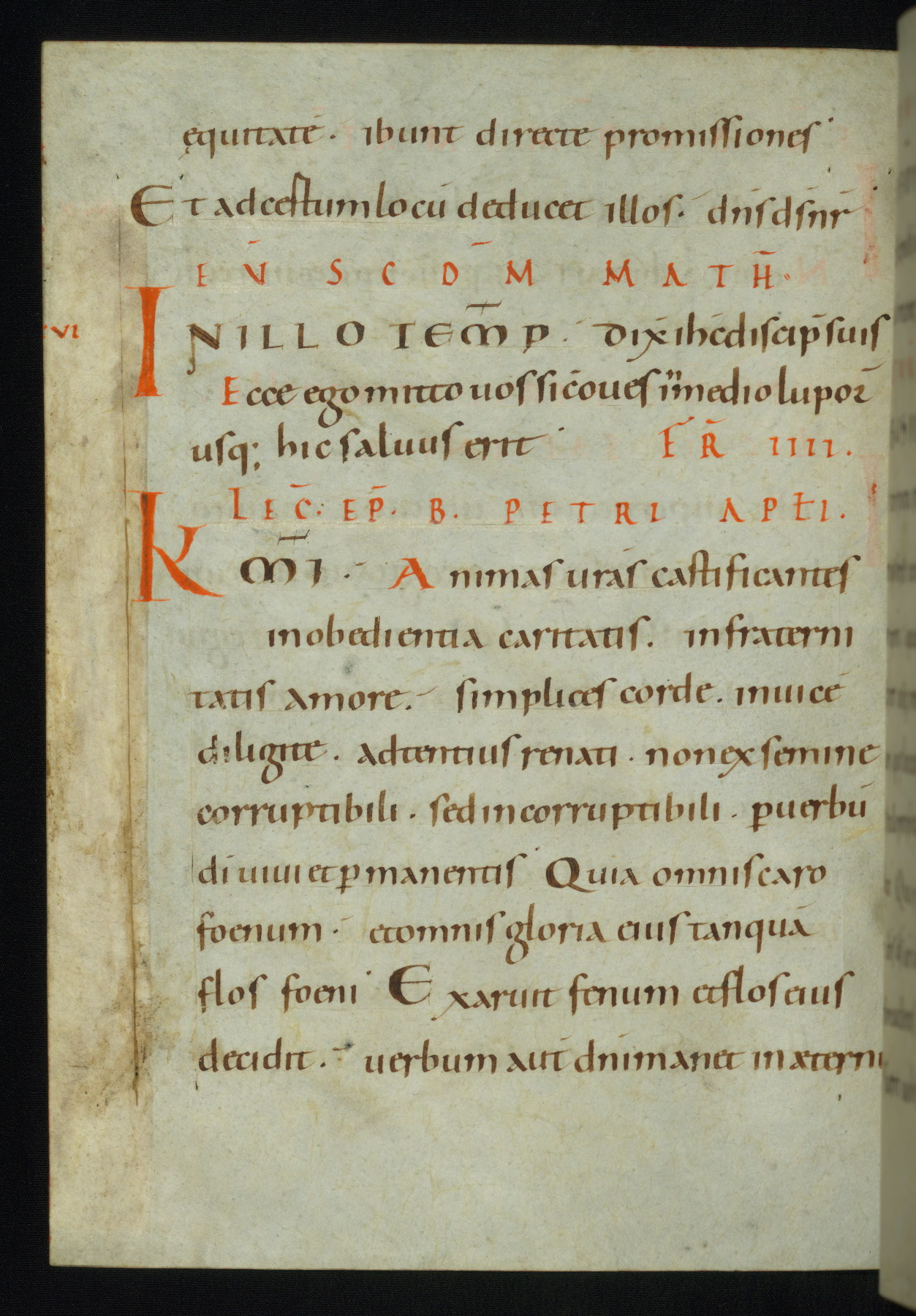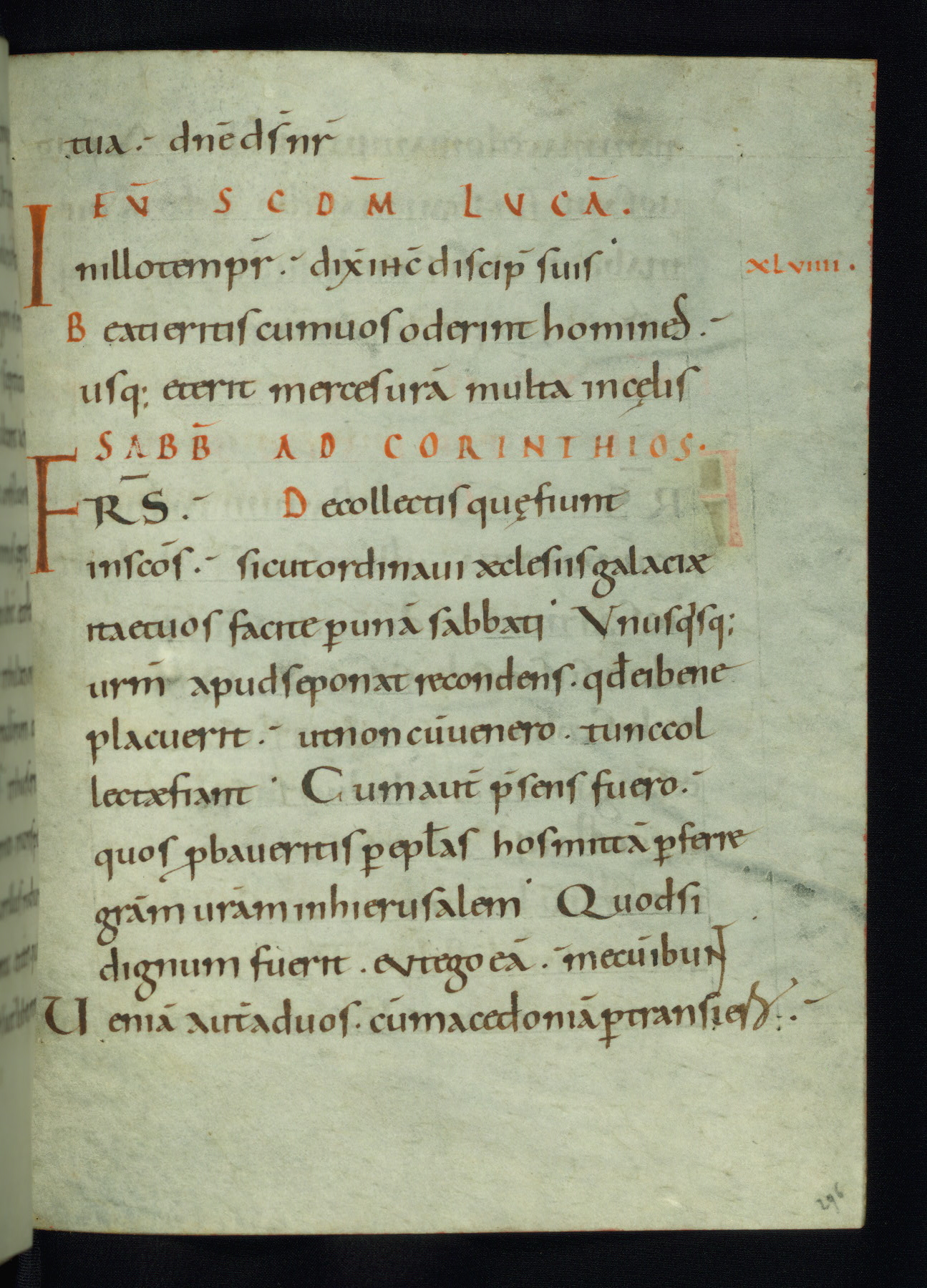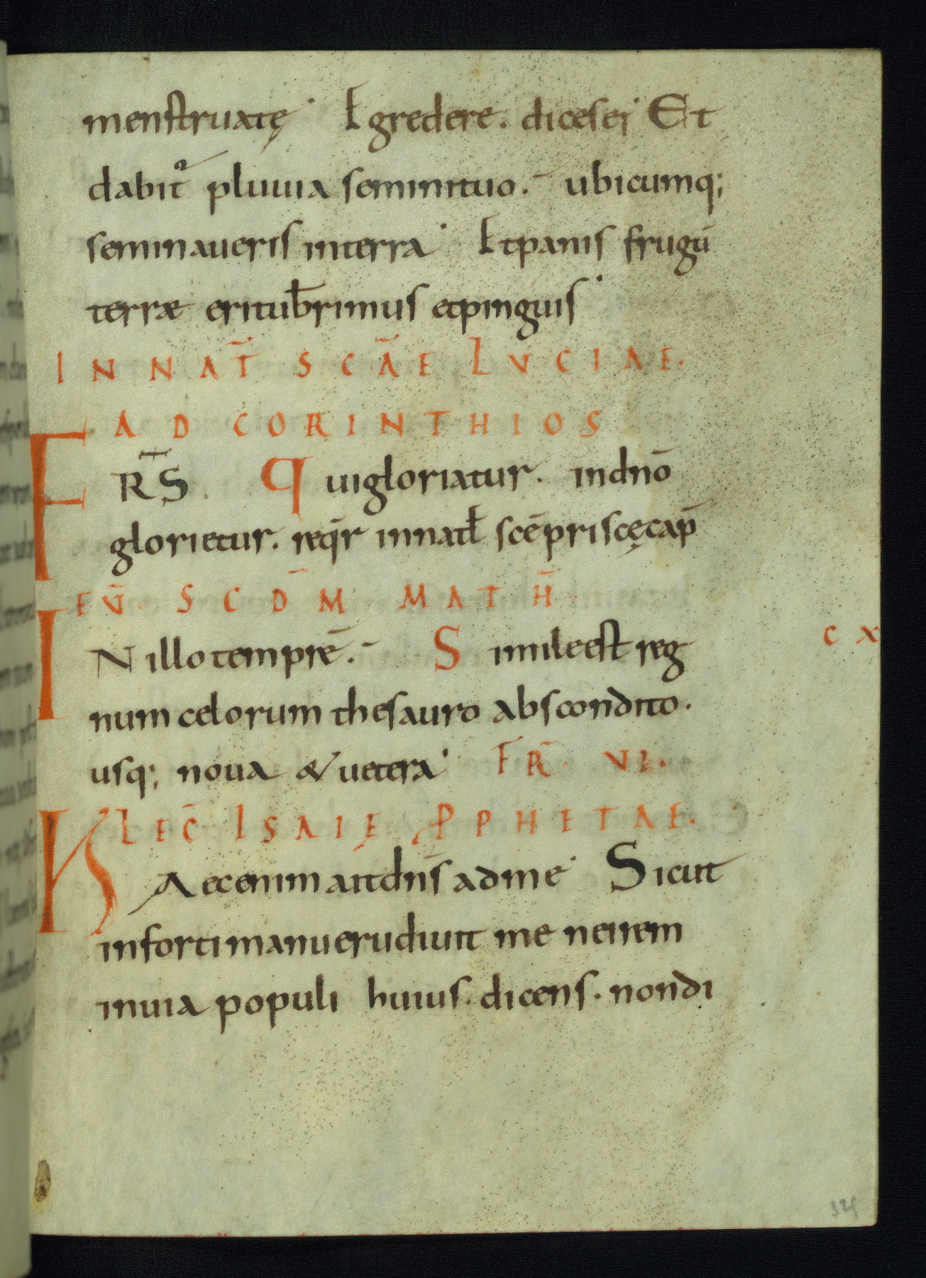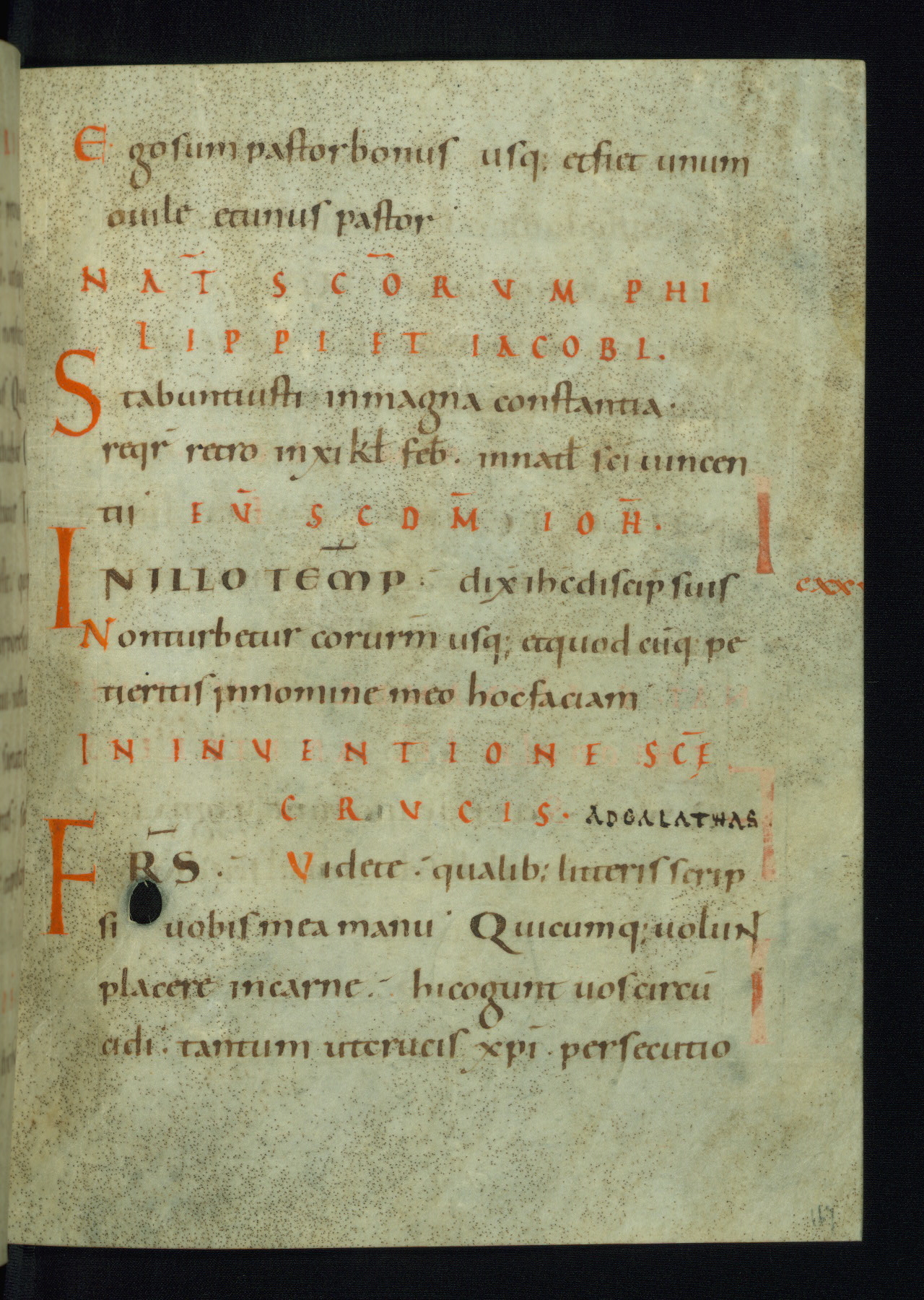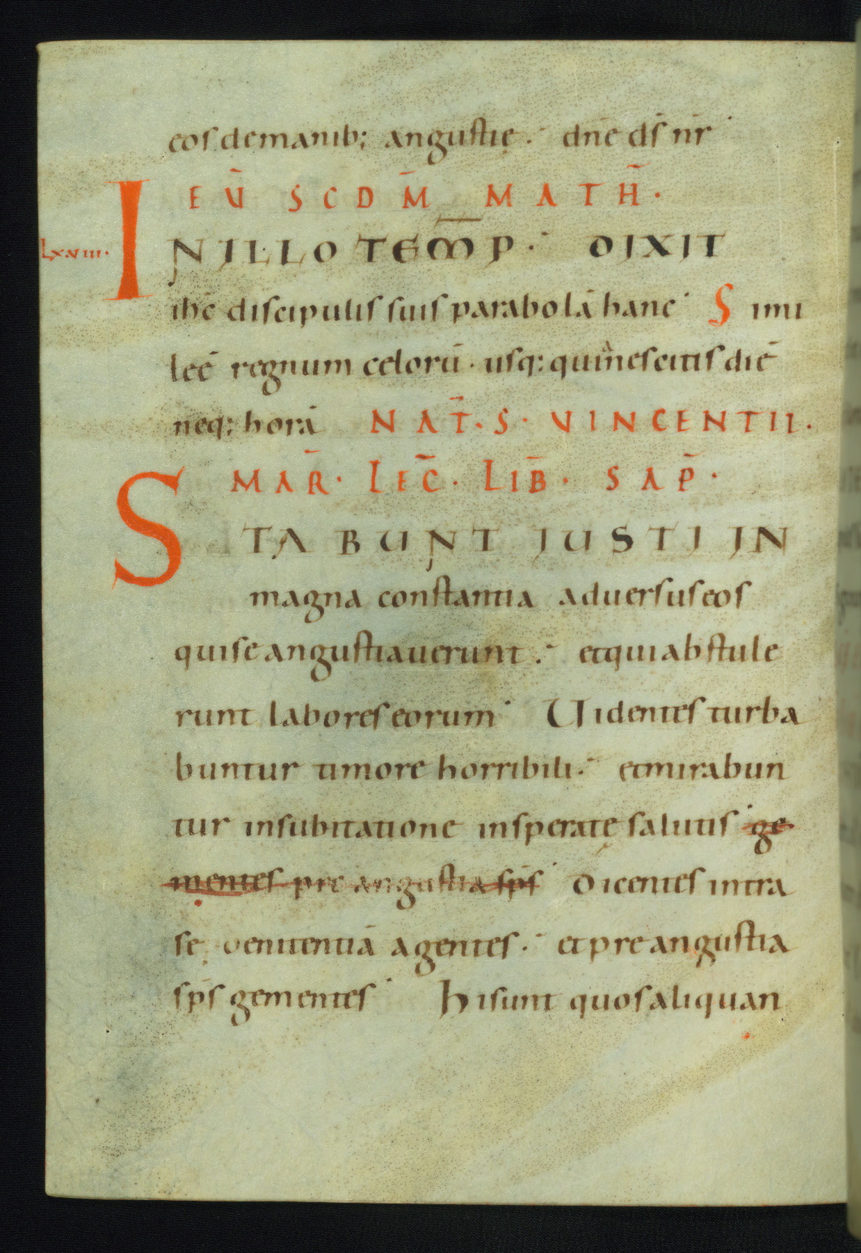This Lectionary was created ca. 1000 in Trier. Written in a clear Caroline minuscule, it contains decorated initials at the openings of important readings. A set of illuminated letters marks the beginning of the Epistle and Gospel lessons for Easter; they display the hierarchy of scripts with capital letters decorated with gold leaf or drawn in red ink, followed by uncial and Caroline minuscule. Initials in orange, sometimes filled with gold, mark the divisions of the text. The book has been stylistically compared with Ottonian manuscripts, especially with a Psalter preserved in Trier (Stadtbibliothek, Ms. 7) illuminated by the so-called Master of the Registrum Gregorii.