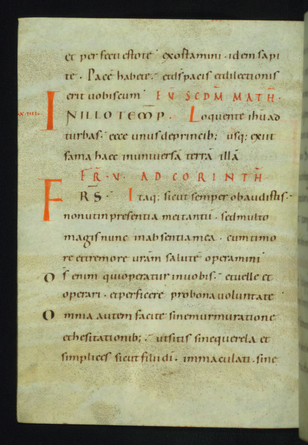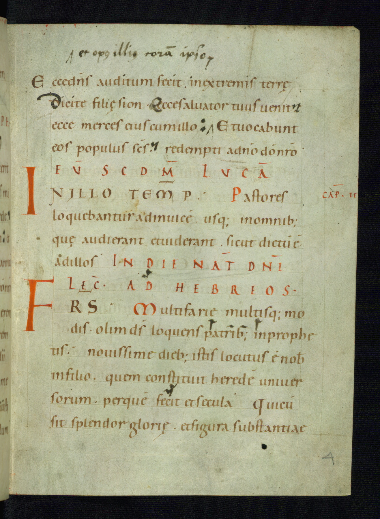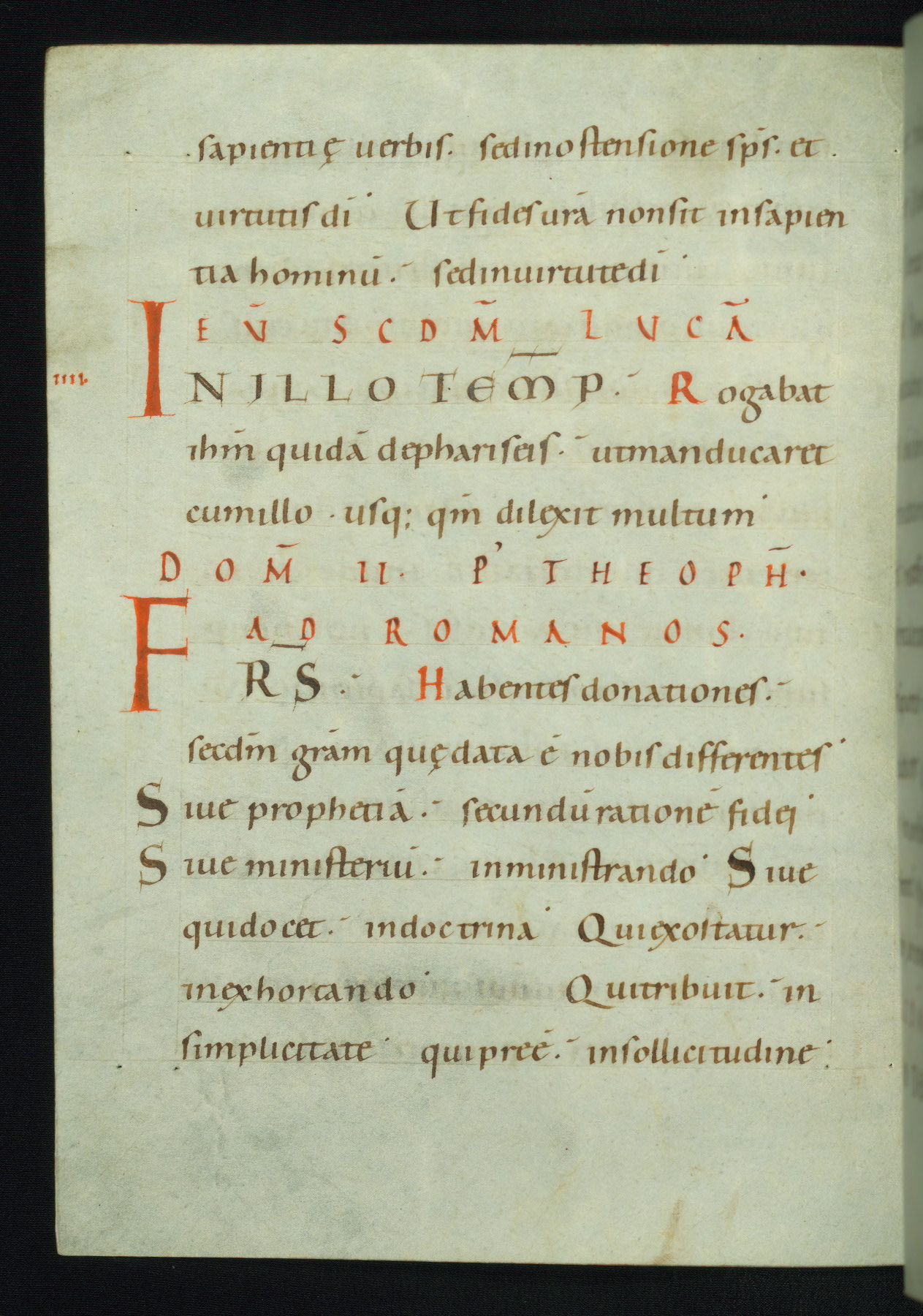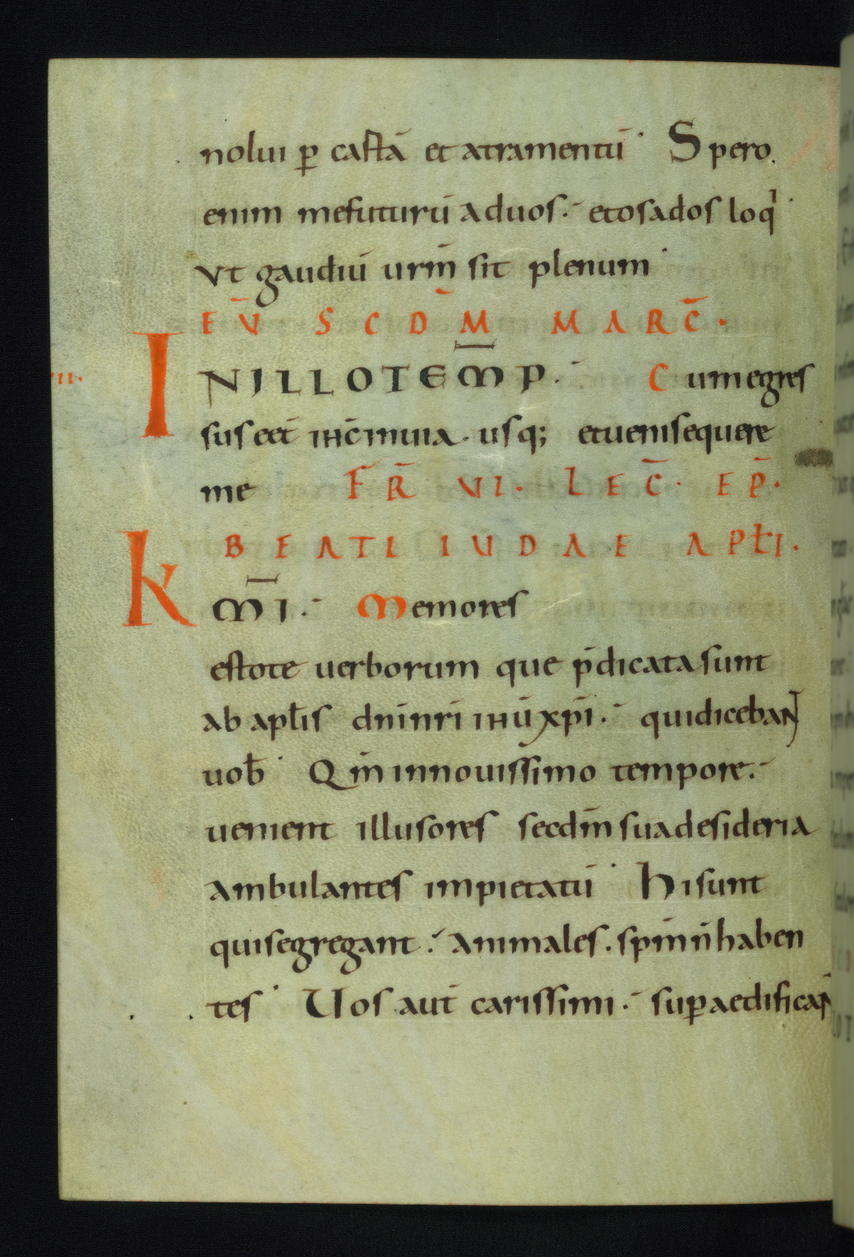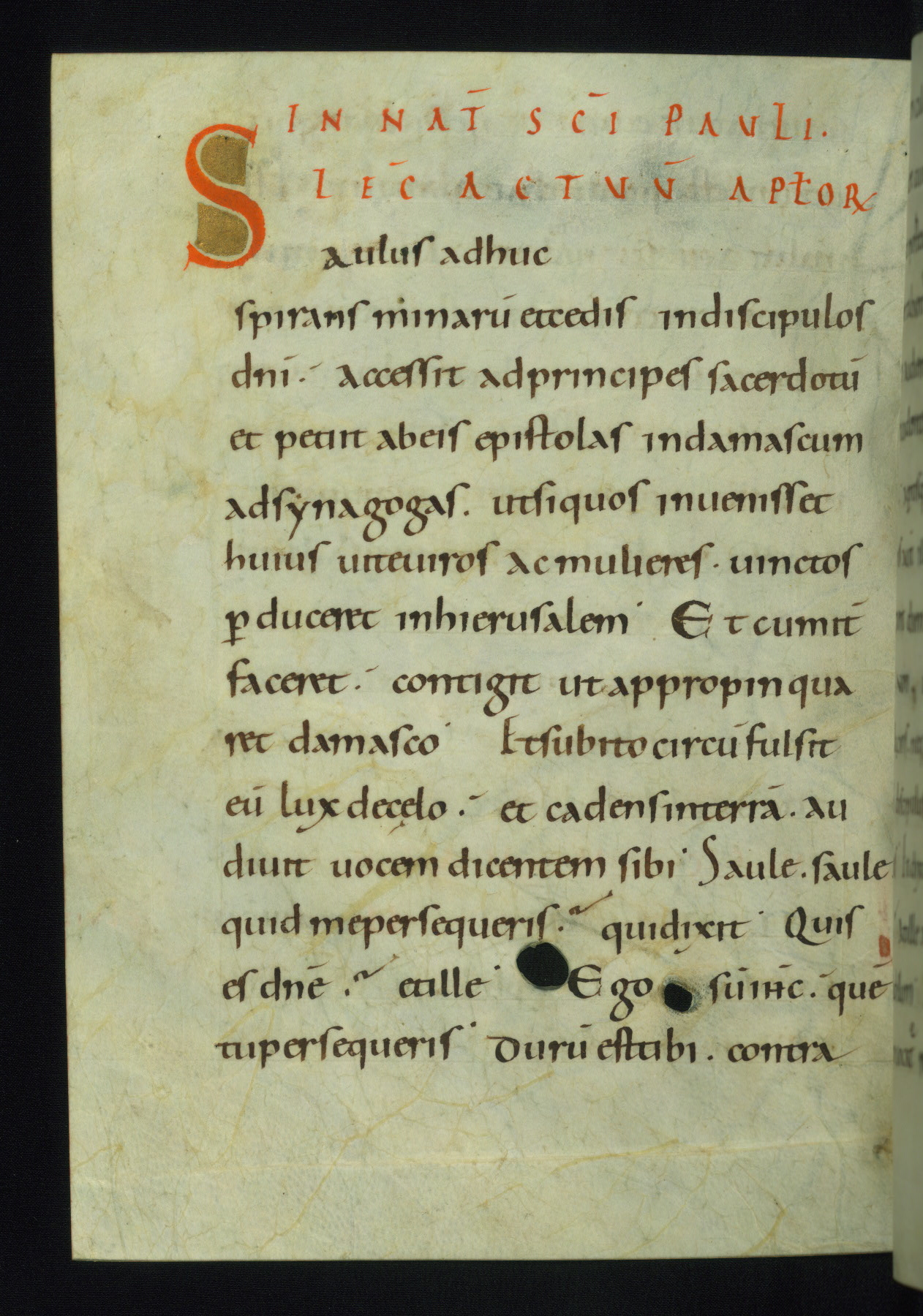 This Lectionary was created ca. 1000 in Trier. Written in a clear Caroline minuscule, it contains decorated initials at the openings of important readings. A set of illuminated letters marks the beginning of the Epistle and Gospel lessons for Easter; they display the hierarchy of scripts with capital letters decorated with gold leaf or drawn in red ink, followed by uncial and Caroline minuscule. Initials in orange, sometimes filled with gold, mark the divisions of the text. The book has been stylistically compared with Ottonian manuscripts, especially with a Psalter preserved in Trier (Stadtbibliothek, Ms. 7) illuminated by the so-called Master of the Registrum Gregorii.