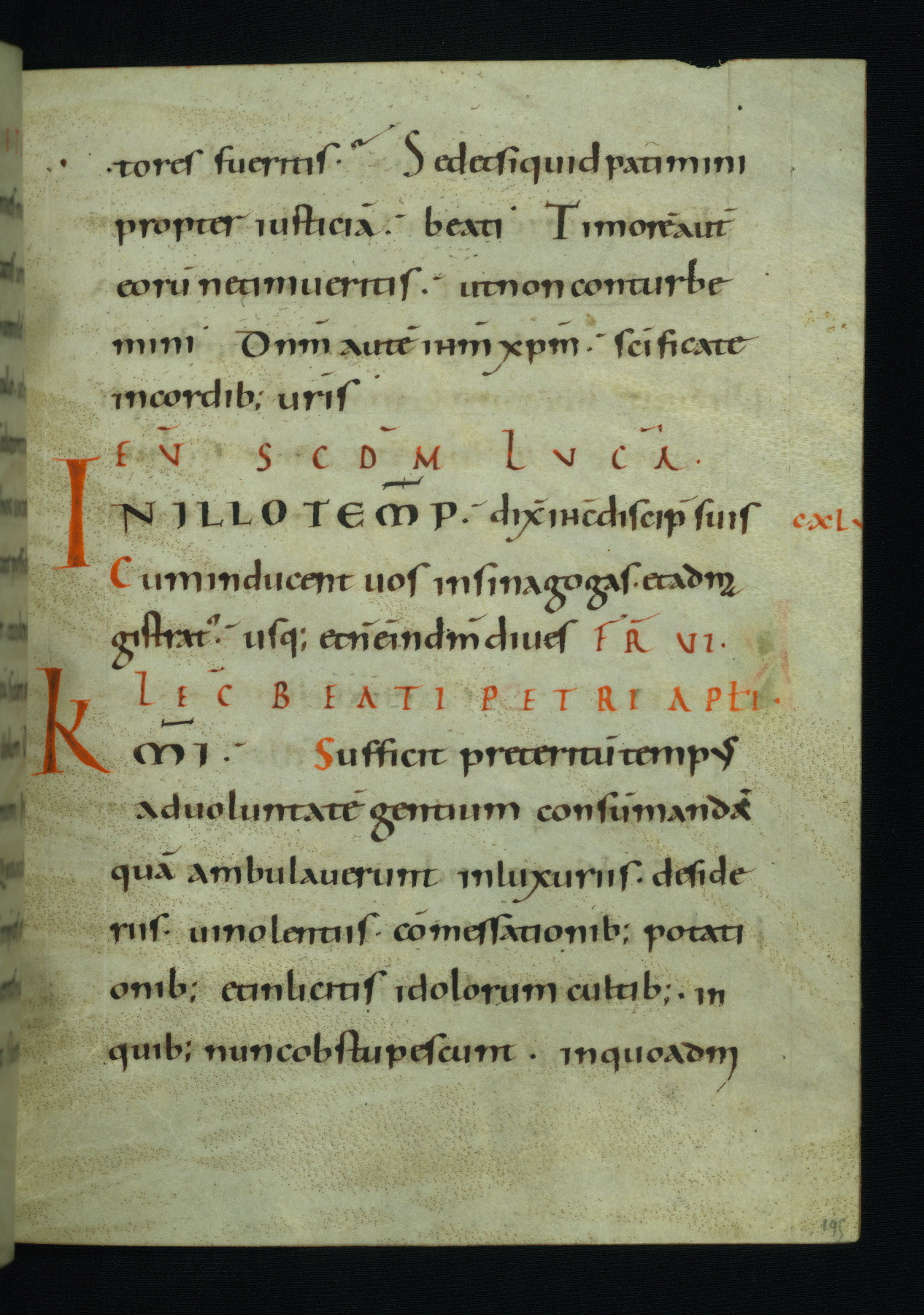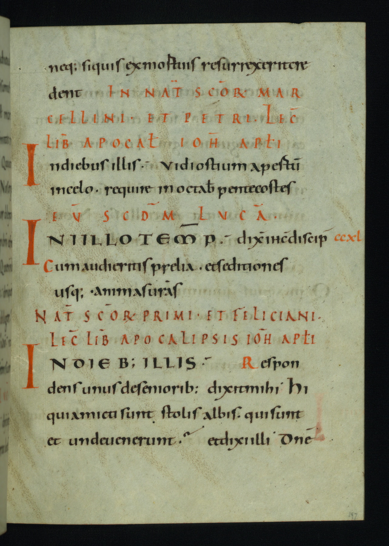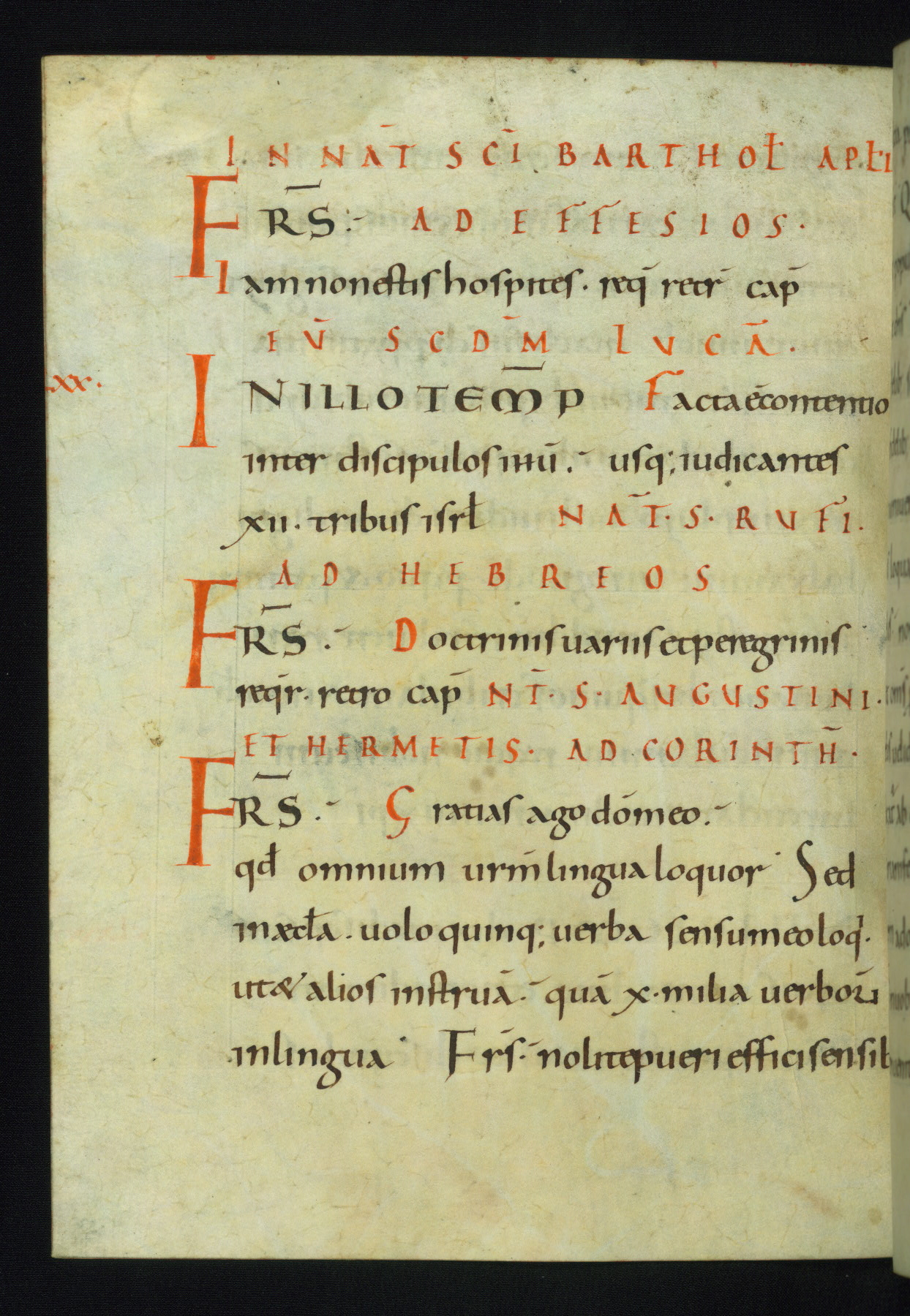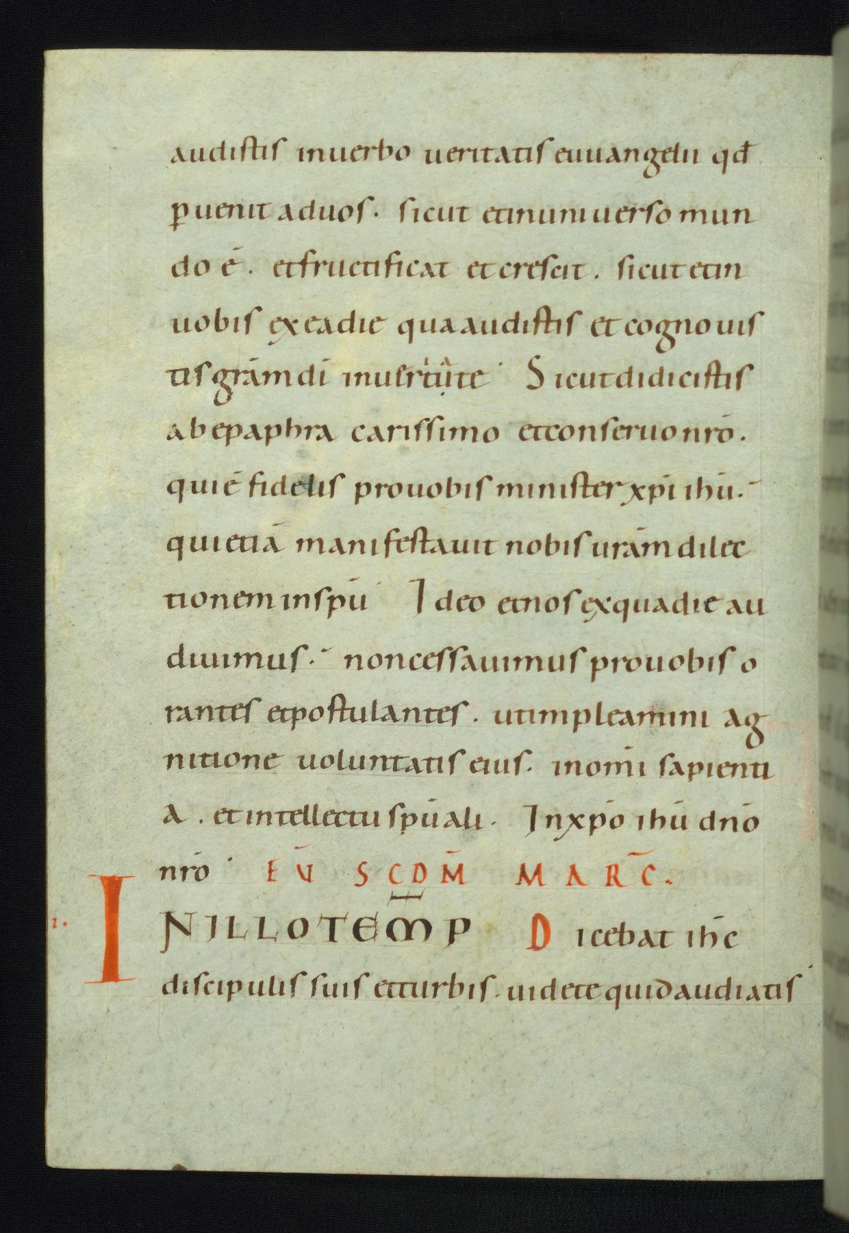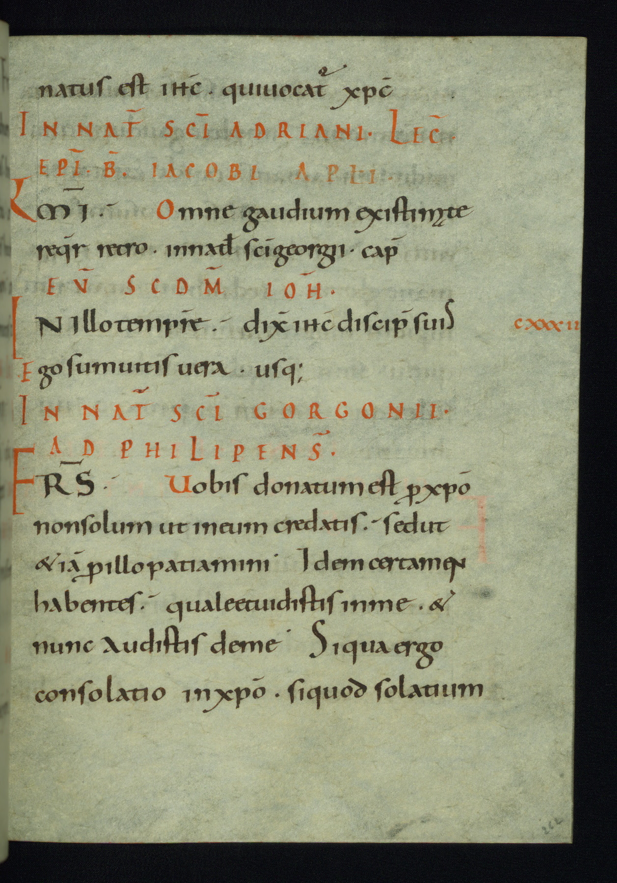 This Lectionary was created ca. 1000 in Trier. Written in a clear Caroline minuscule, it contains decorated initials at the openings of important readings. A set of illuminated letters marks the beginning of the Epistle and Gospel lessons for Easter; they display the hierarchy of scripts with capital letters decorated with gold leaf or drawn in red ink, followed by uncial and Caroline minuscule. Initials in orange, sometimes filled with gold, mark the divisions of the text. The book has been stylistically compared with Ottonian manuscripts, especially with a Psalter preserved in Trier (Stadtbibliothek, Ms. 7) illuminated by the so-called Master of the Registrum Gregorii.