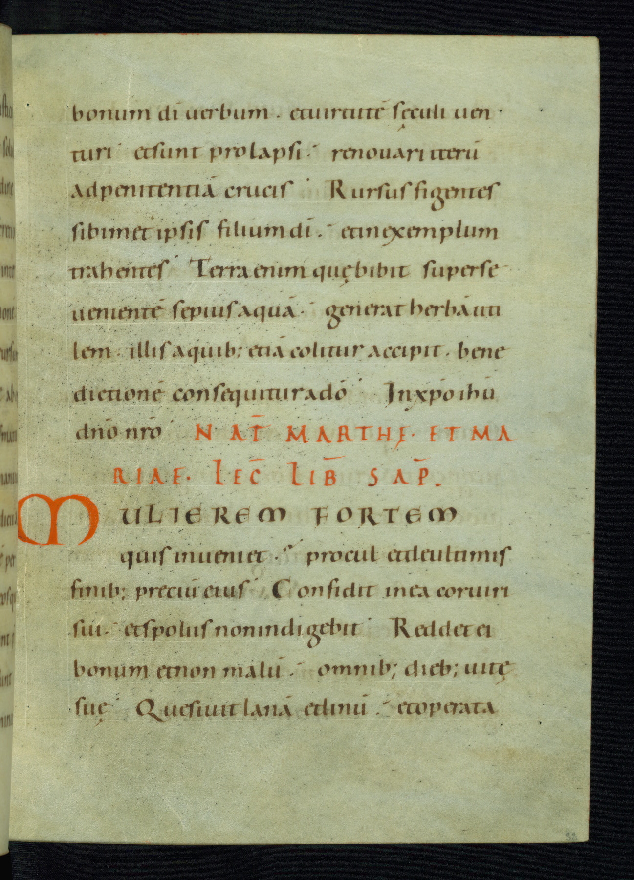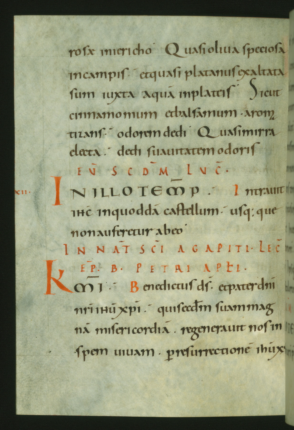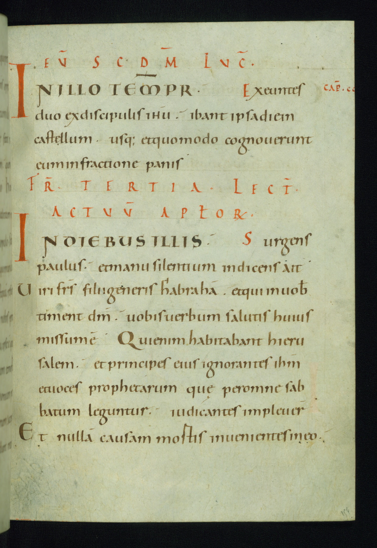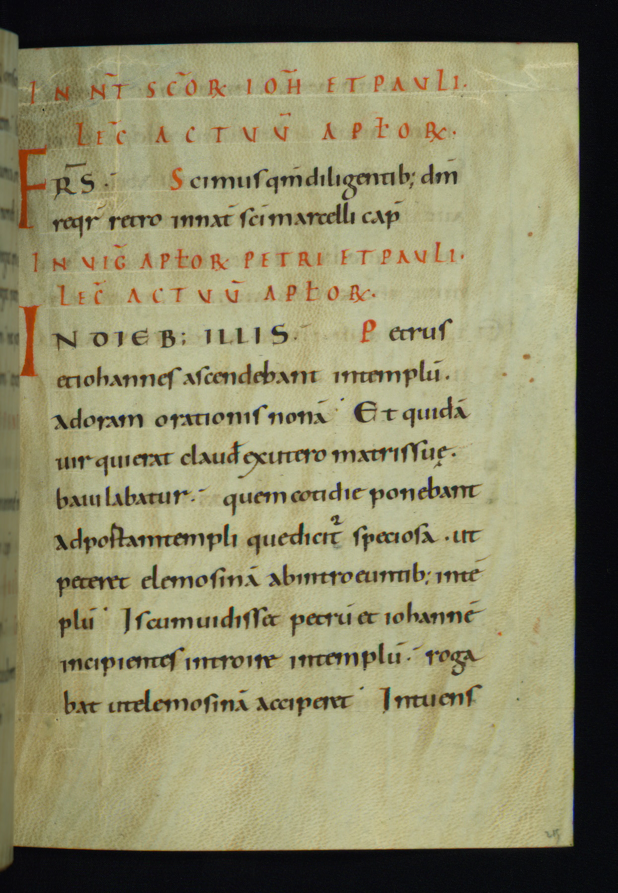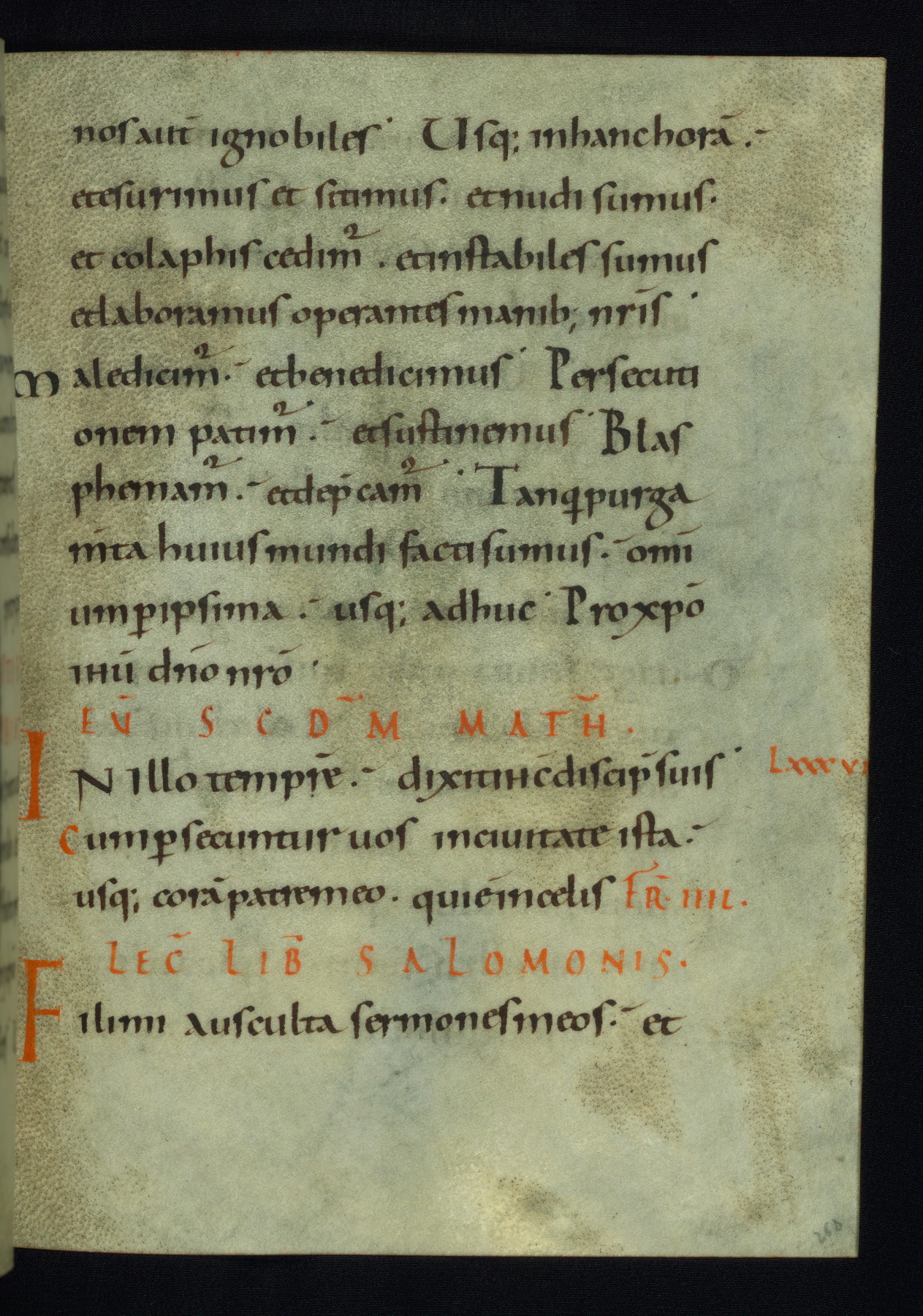 This Lectionary was created ca. 1000 in Trier. Written in a clear Caroline minuscule, it contains decorated initials at the openings of important readings. A set of illuminated letters marks the beginning of the Epistle and Gospel lessons for Easter; they display the hierarchy of scripts with capital letters decorated with gold leaf or drawn in red ink, followed by uncial and Caroline minuscule. Initials in orange, sometimes filled with gold, mark the divisions of the text. The book has been stylistically compared with Ottonian manuscripts, especially with a Psalter preserved in Trier (Stadtbibliothek, Ms. 7) illuminated by the so-called Master of the Registrum Gregorii.