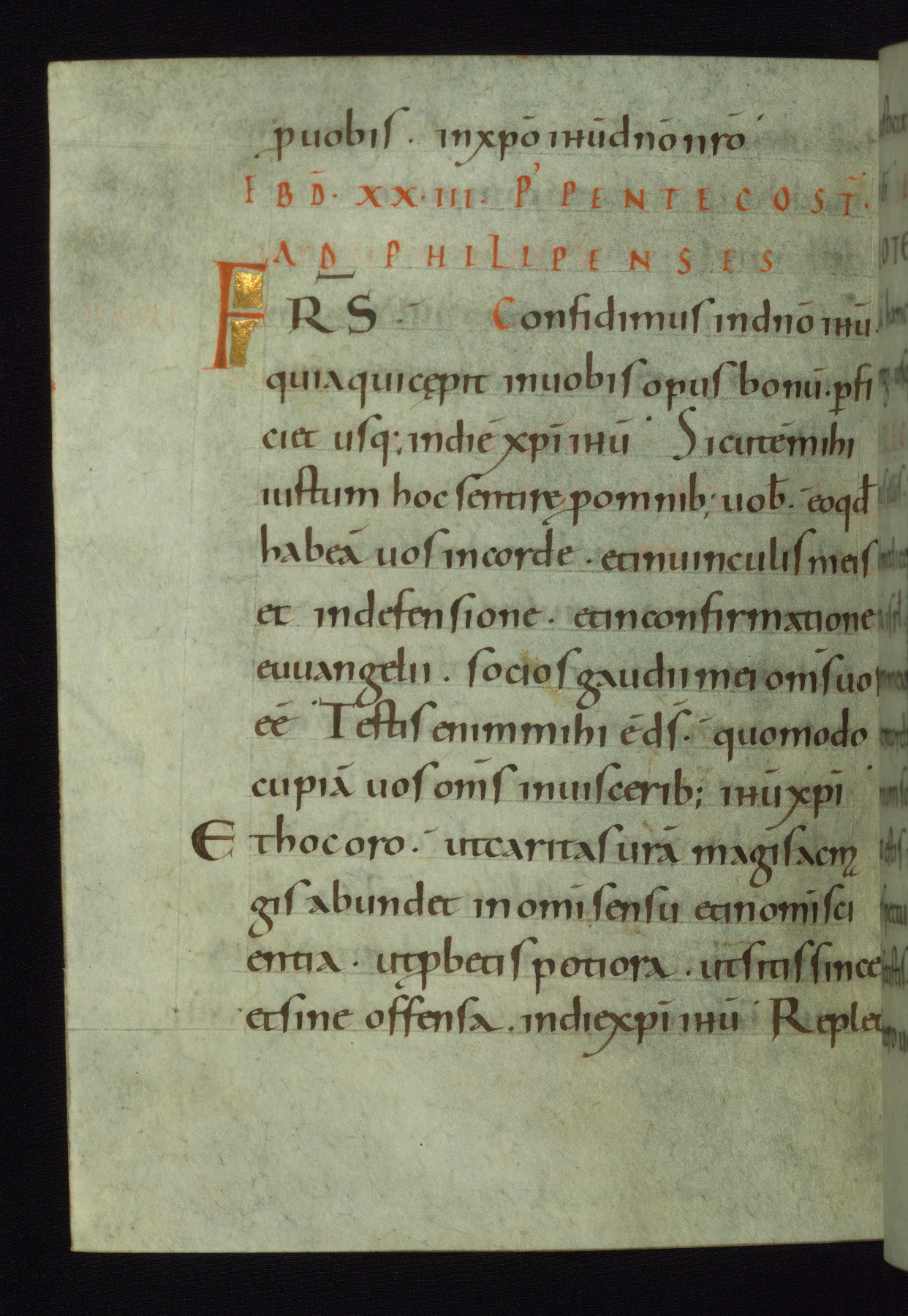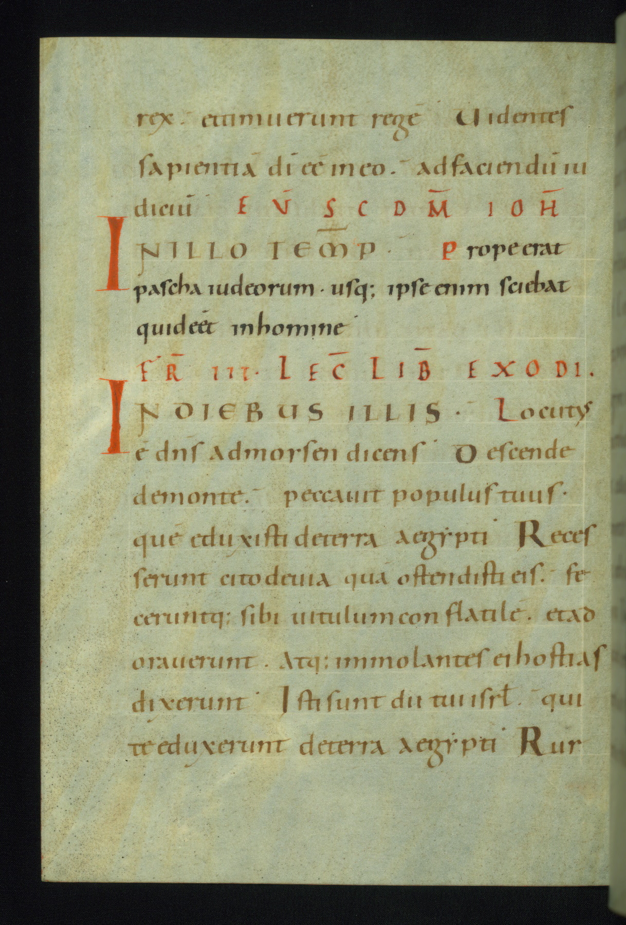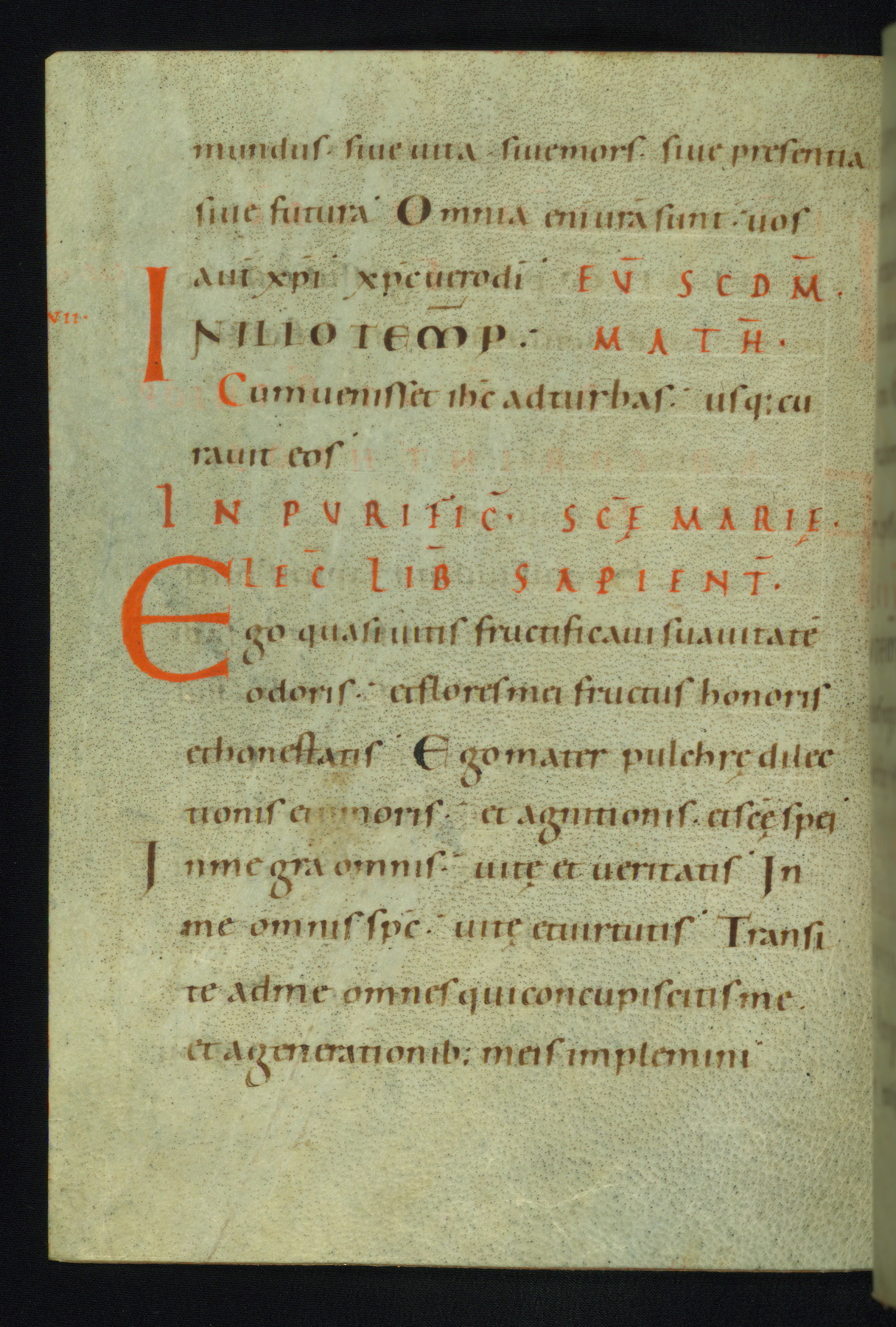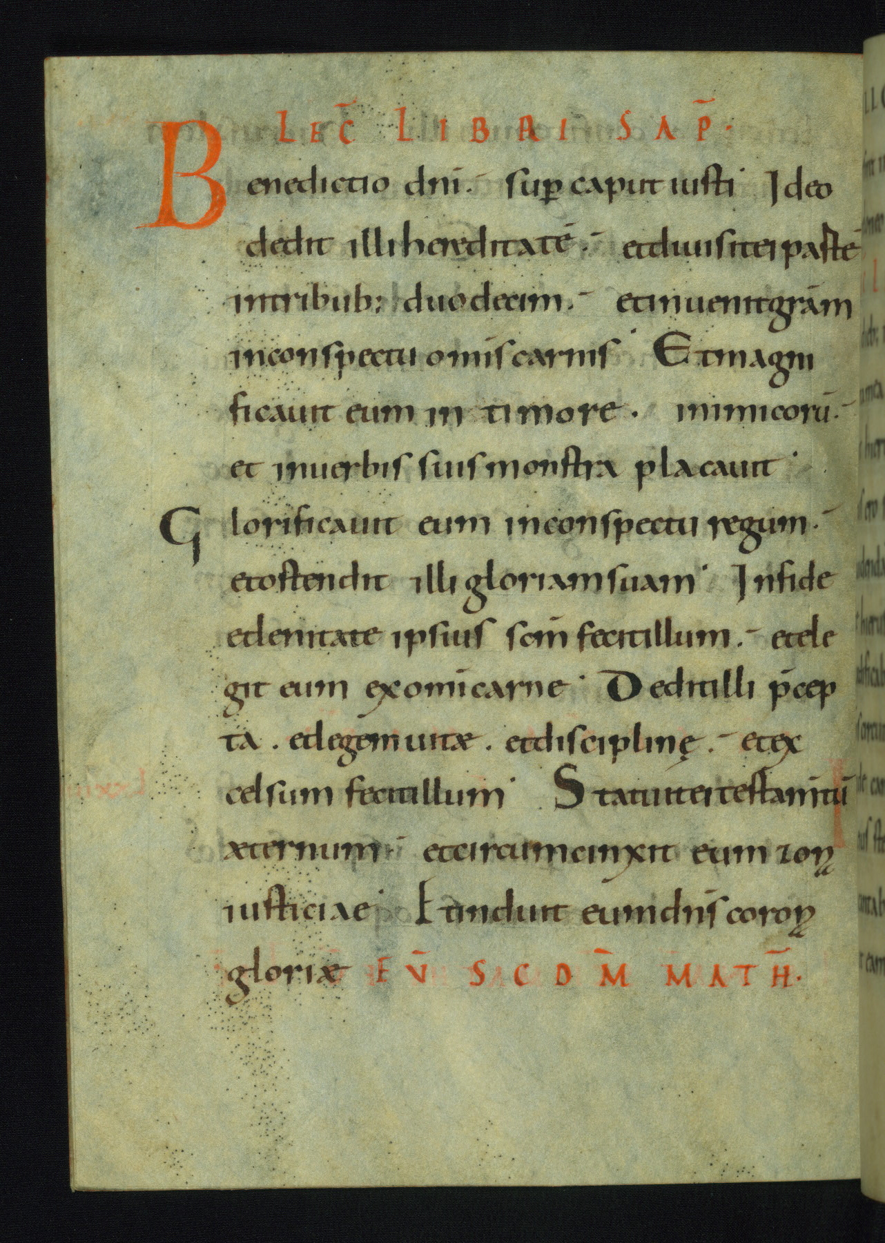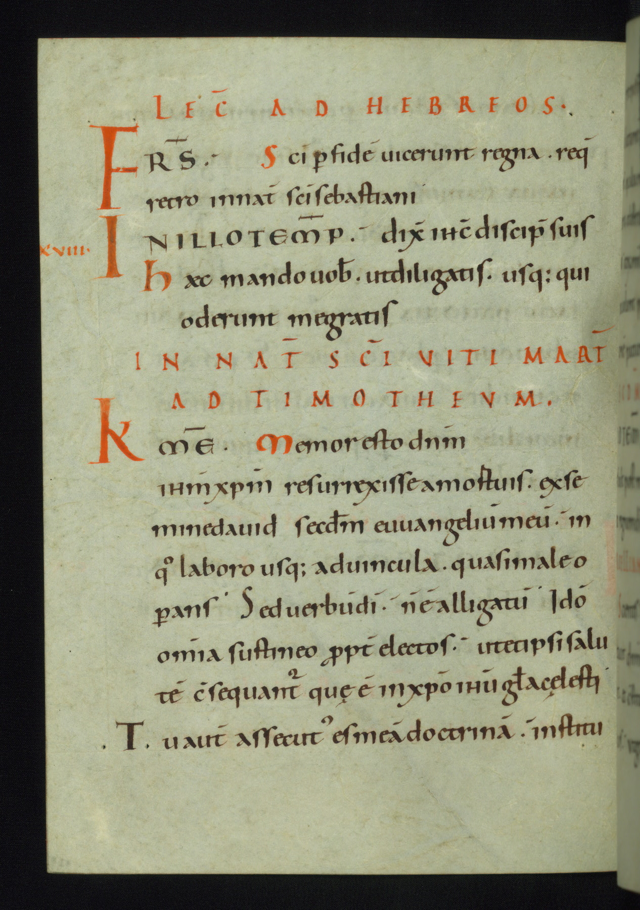 This Lectionary was created ca. 1000 in Trier. Written in a clear Caroline minuscule, it contains decorated initials at the openings of important readings. A set of illuminated letters marks the beginning of the Epistle and Gospel lessons for Easter; they display the hierarchy of scripts with capital letters decorated with gold leaf or drawn in red ink, followed by uncial and Caroline minuscule. Initials in orange, sometimes filled with gold, mark the divisions of the text. The book has been stylistically compared with Ottonian manuscripts, especially with a Psalter preserved in Trier (Stadtbibliothek, Ms. 7) illuminated by the so-called Master of the Registrum Gregorii.