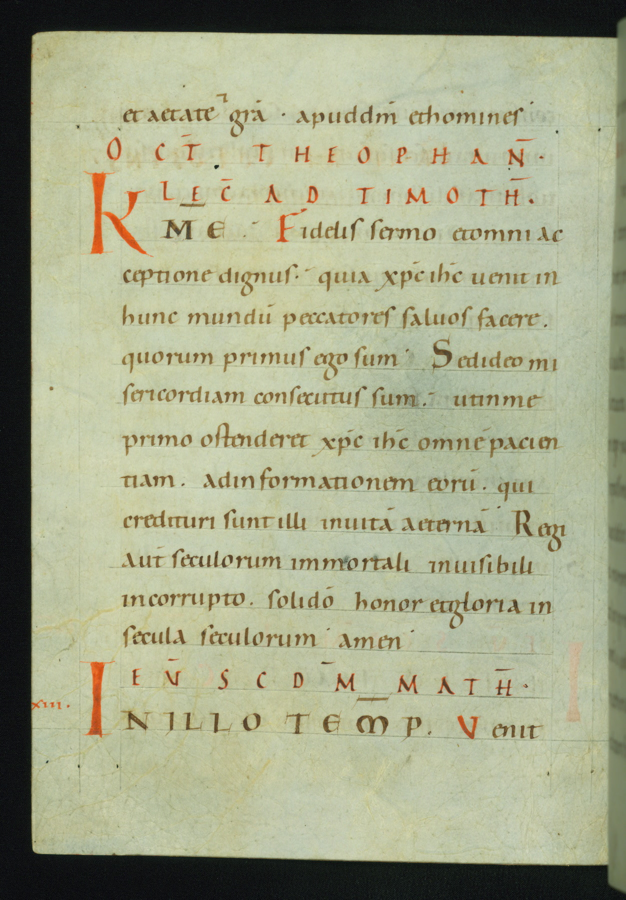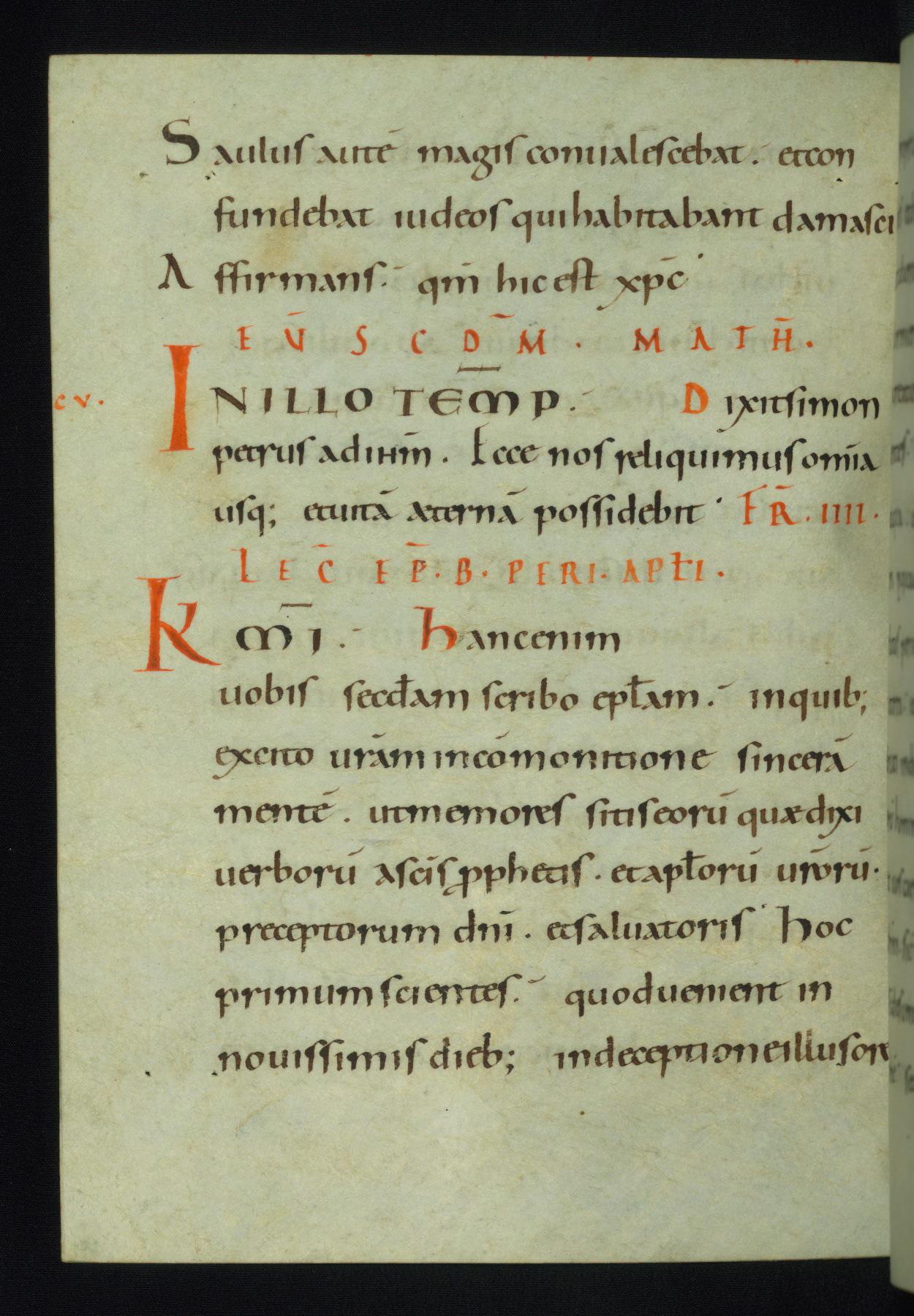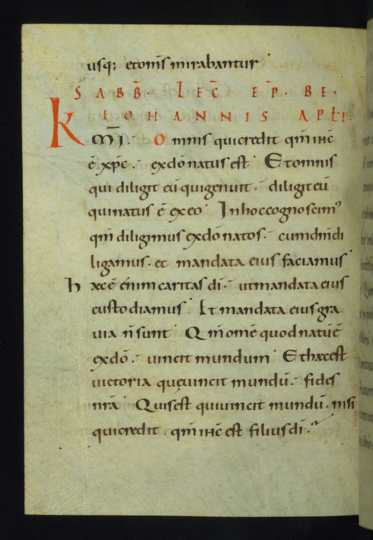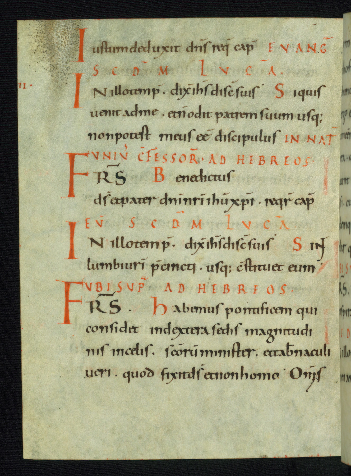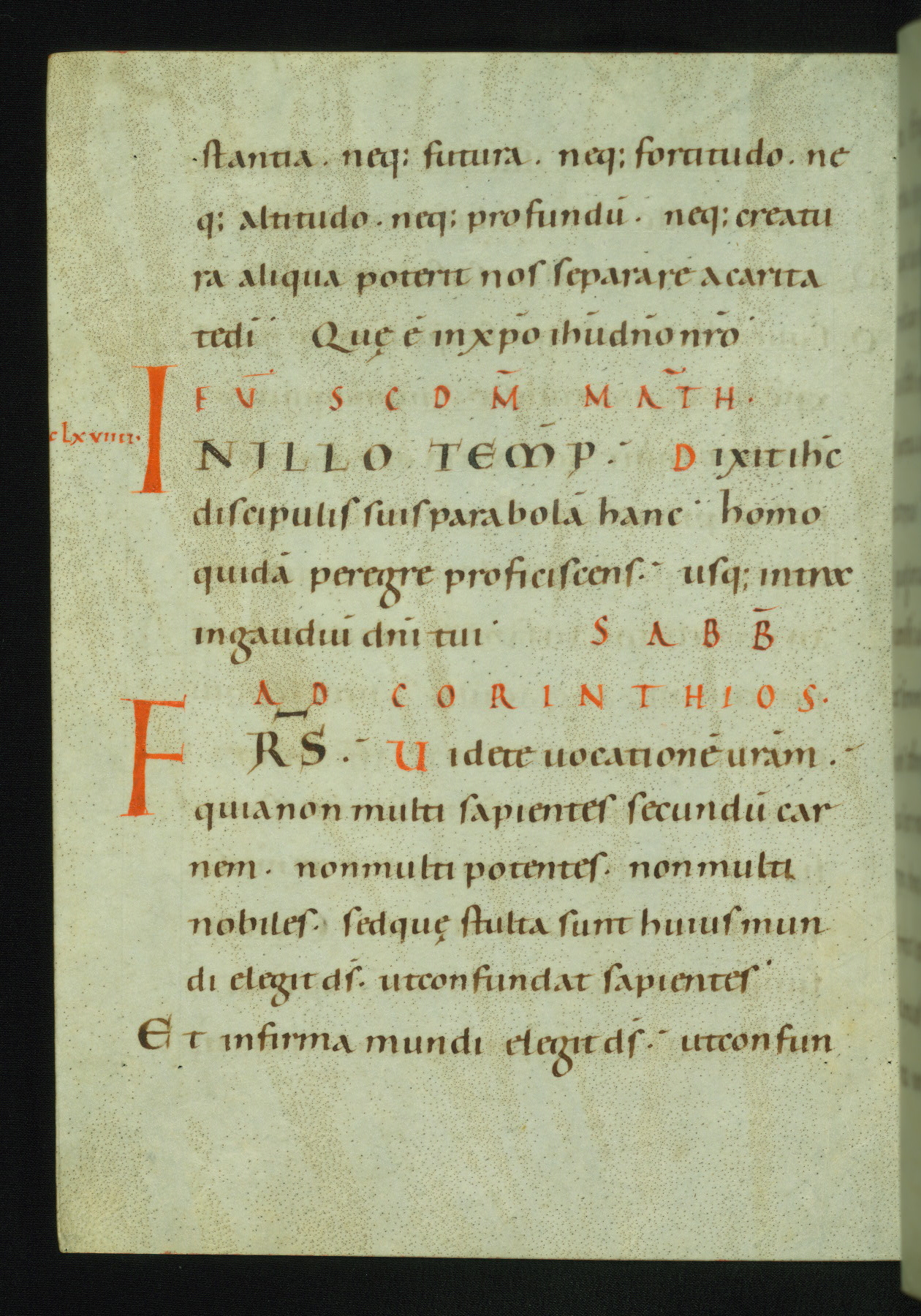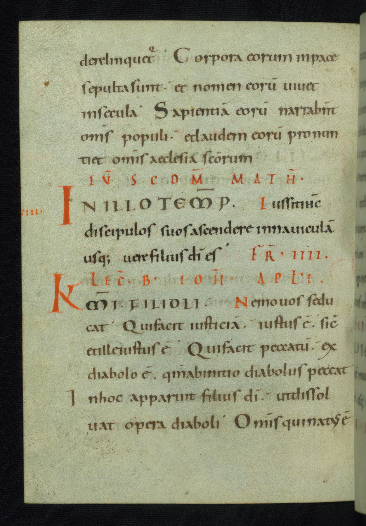 This Lectionary was created ca. 1000 in Trier. Written in a clear Caroline minuscule, it contains decorated initials at the openings of important readings. A set of illuminated letters marks the beginning of the Epistle and Gospel lessons for Easter; they display the hierarchy of scripts with capital letters decorated with gold leaf or drawn in red ink, followed by uncial and Caroline minuscule. Initials in orange, sometimes filled with gold, mark the divisions of the text. The book has been stylistically compared with Ottonian manuscripts, especially with a Psalter preserved in Trier (Stadtbibliothek, Ms. 7) illuminated by the so-called Master of the Registrum Gregorii.