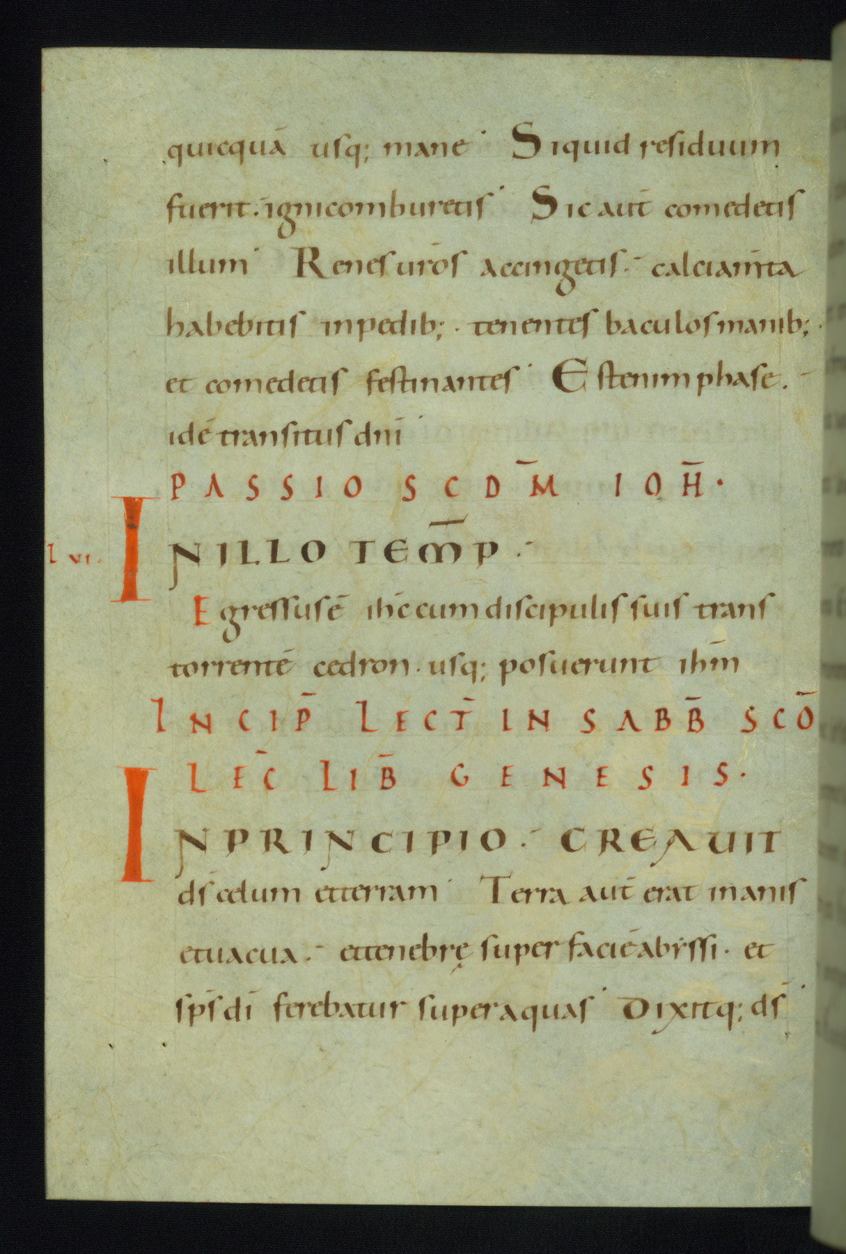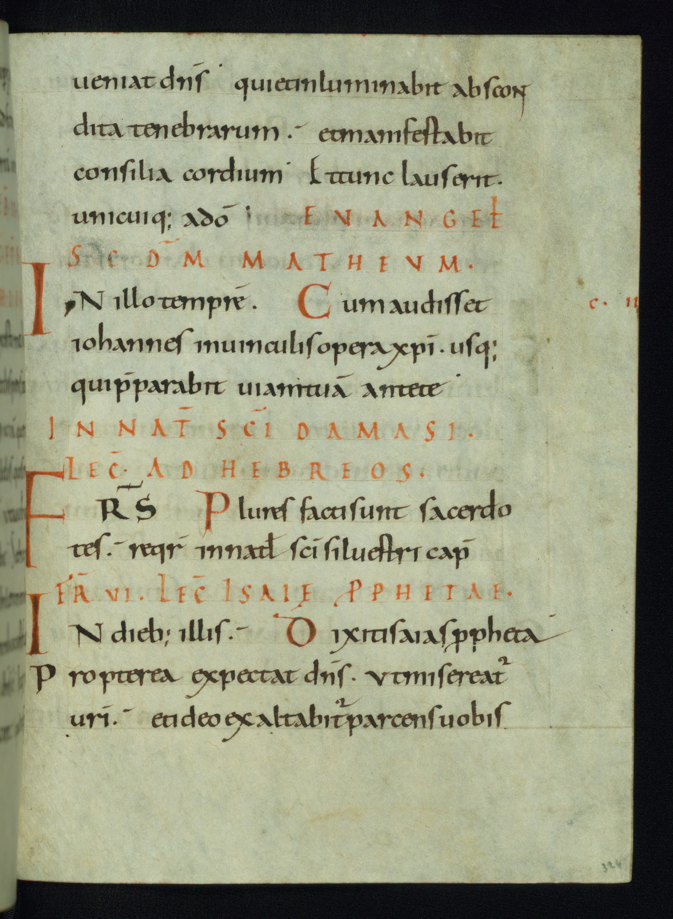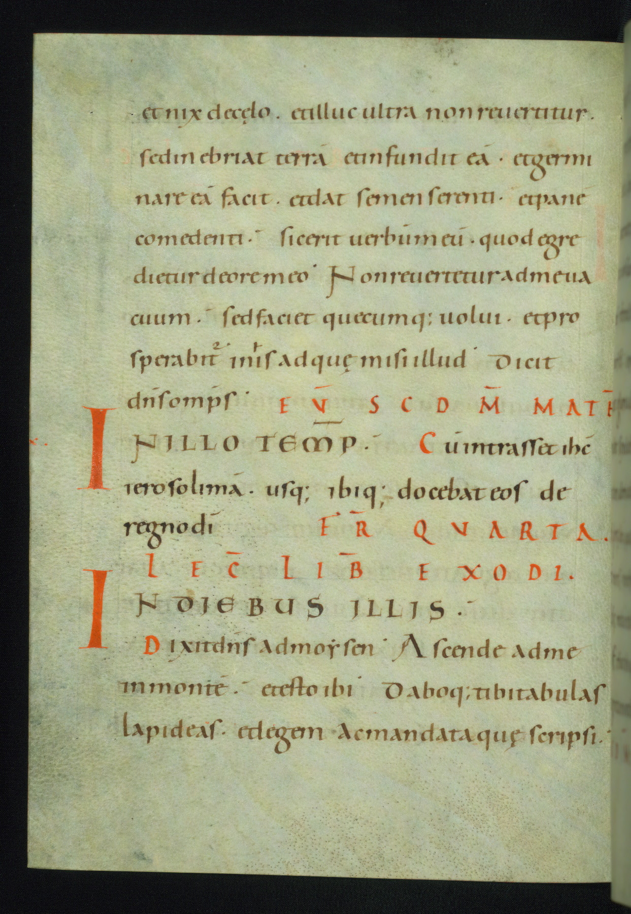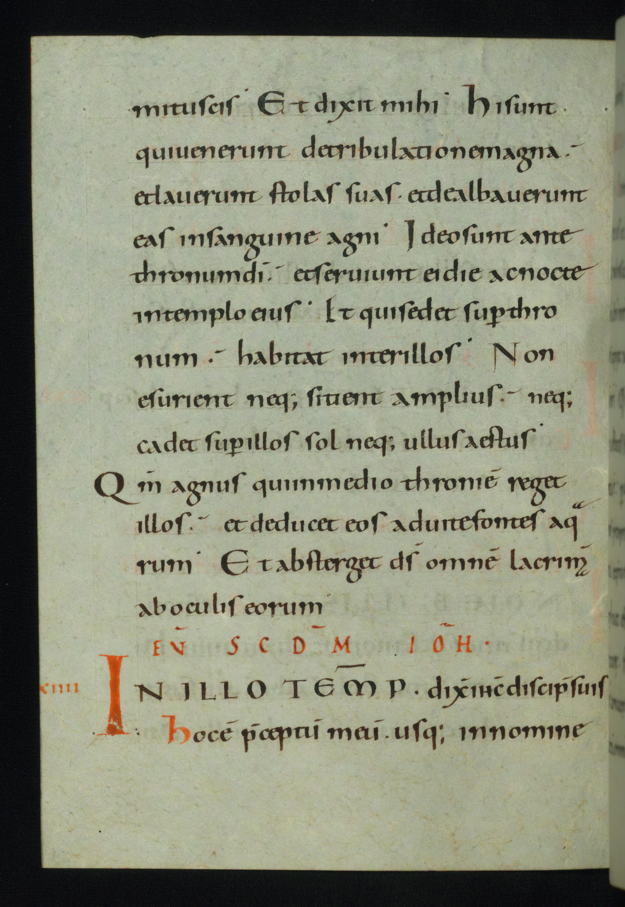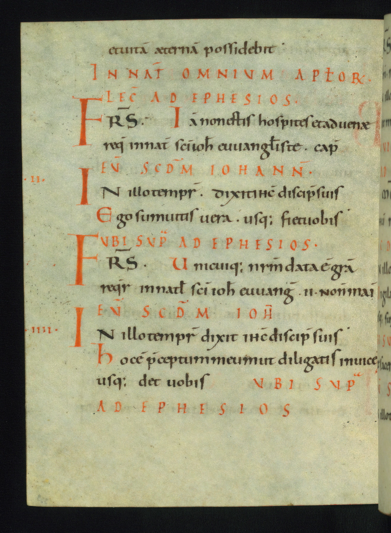 This Lectionary was created ca. 1000 in Trier. Written in a clear Caroline minuscule, it contains decorated initials at the openings of important readings. A set of illuminated letters marks the beginning of the Epistle and Gospel lessons for Easter; they display the hierarchy of scripts with capital letters decorated with gold leaf or drawn in red ink, followed by uncial and Caroline minuscule. Initials in orange, sometimes filled with gold, mark the divisions of the text. The book has been stylistically compared with Ottonian manuscripts, especially with a Psalter preserved in Trier (Stadtbibliothek, Ms. 7) illuminated by the so-called Master of the Registrum Gregorii.