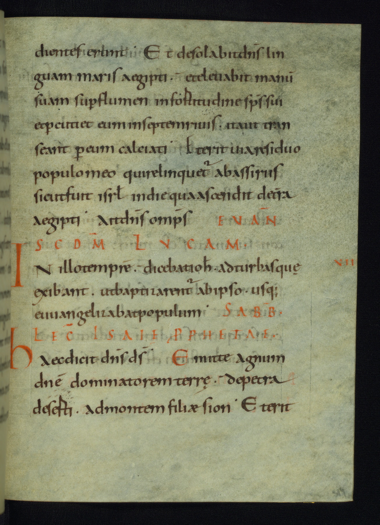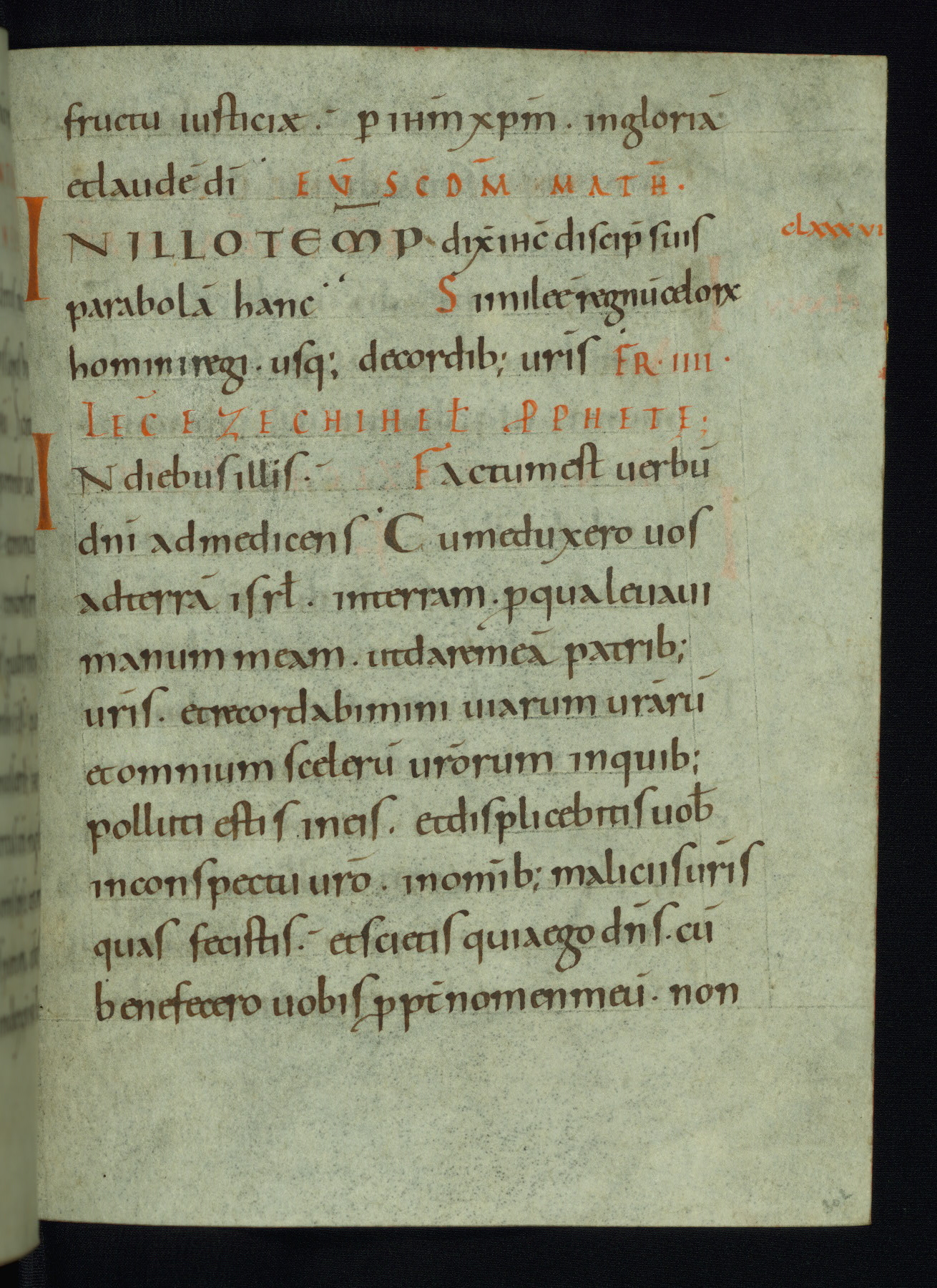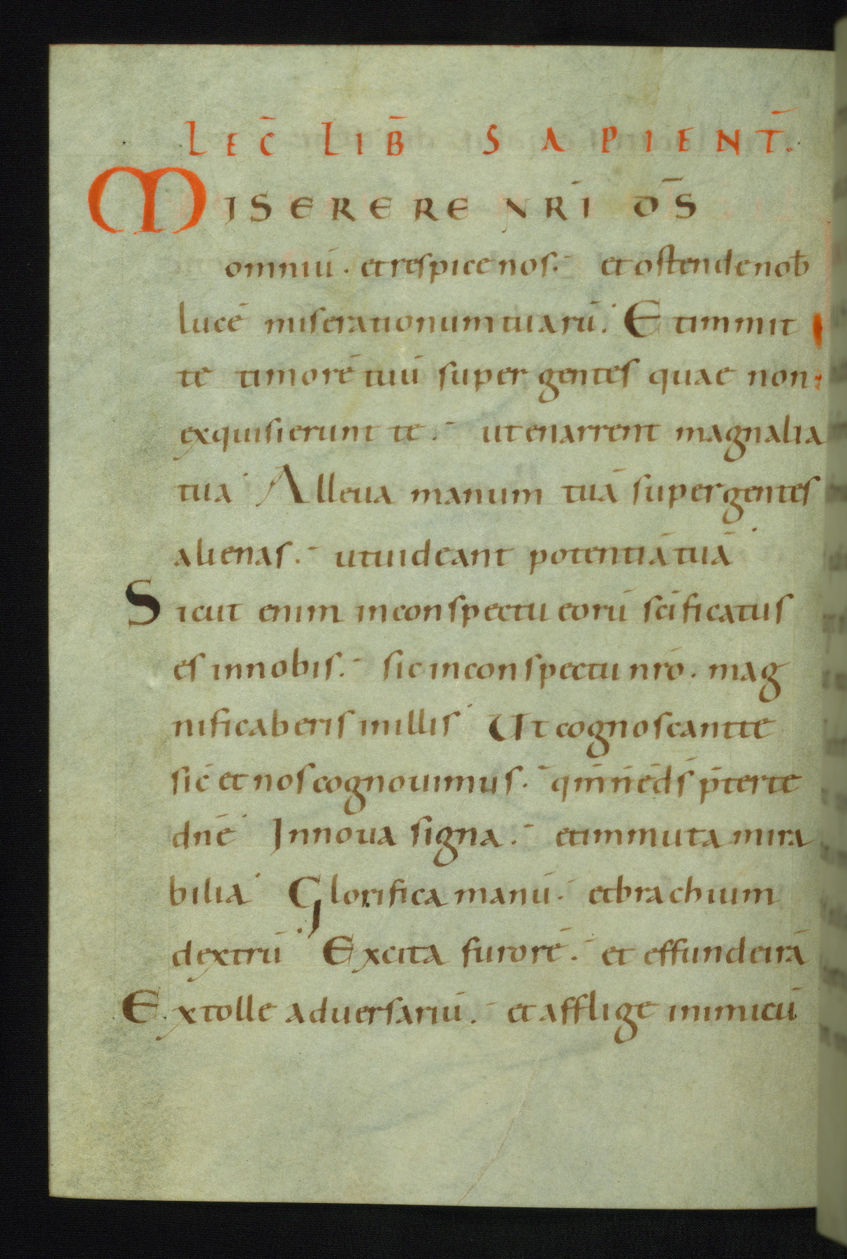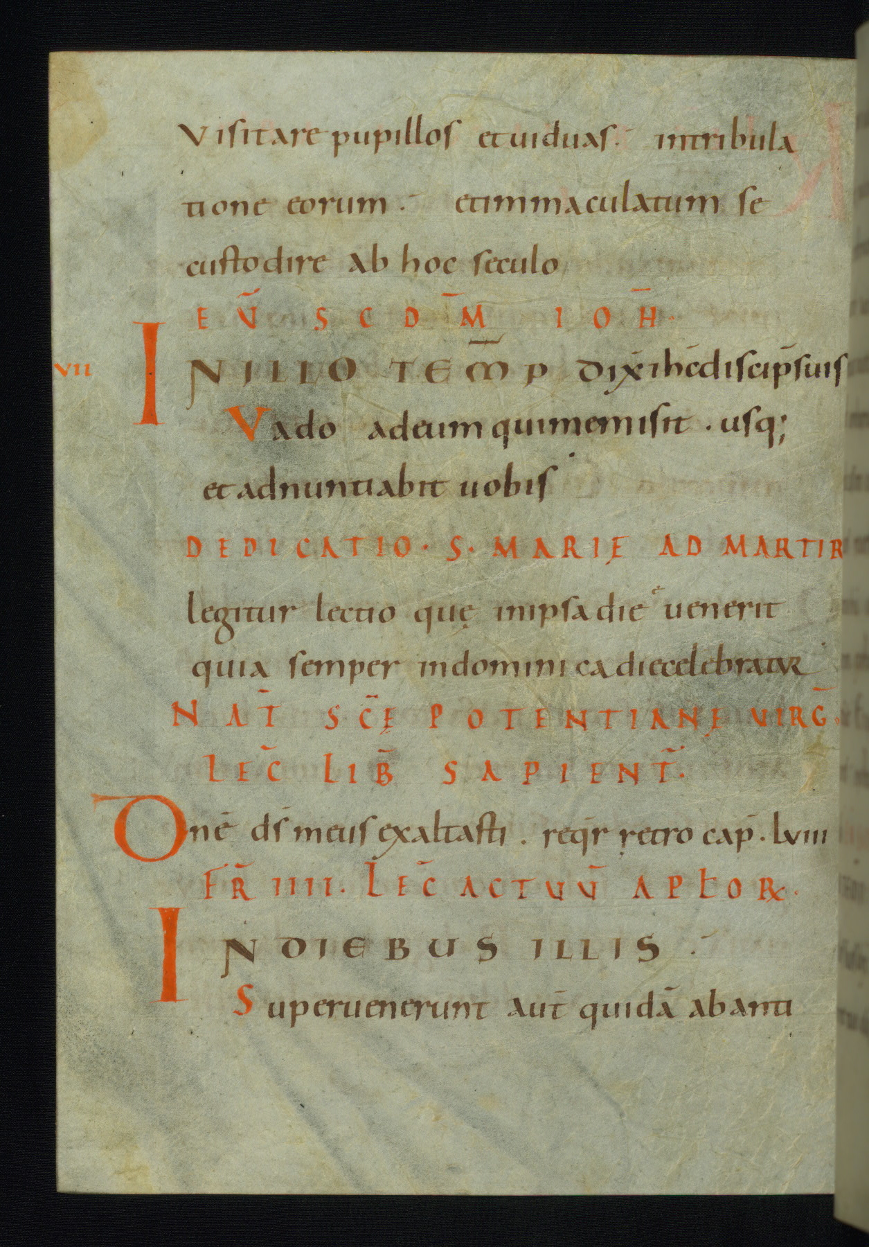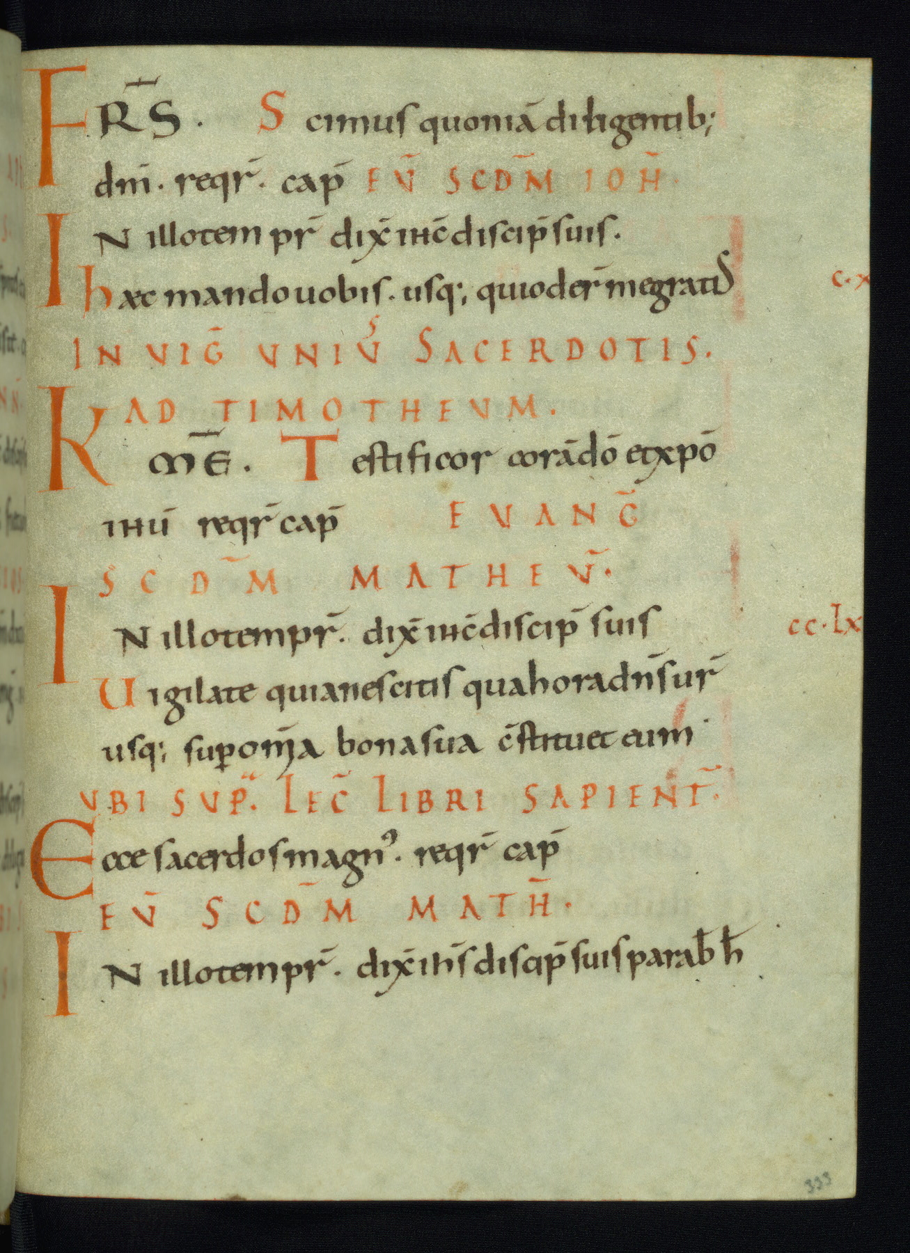 This Lectionary was created ca. 1000 in Trier. Written in a clear Caroline minuscule, it contains decorated initials at the openings of important readings. A set of illuminated letters marks the beginning of the Epistle and Gospel lessons for Easter; they display the hierarchy of scripts with capital letters decorated with gold leaf or drawn in red ink, followed by uncial and Caroline minuscule. Initials in orange, sometimes filled with gold, mark the divisions of the text. The book has been stylistically compared with Ottonian manuscripts, especially with a Psalter preserved in Trier (Stadtbibliothek, Ms. 7) illuminated by the so-called Master of the Registrum Gregorii.