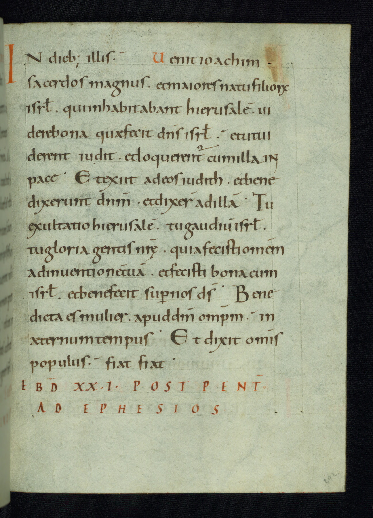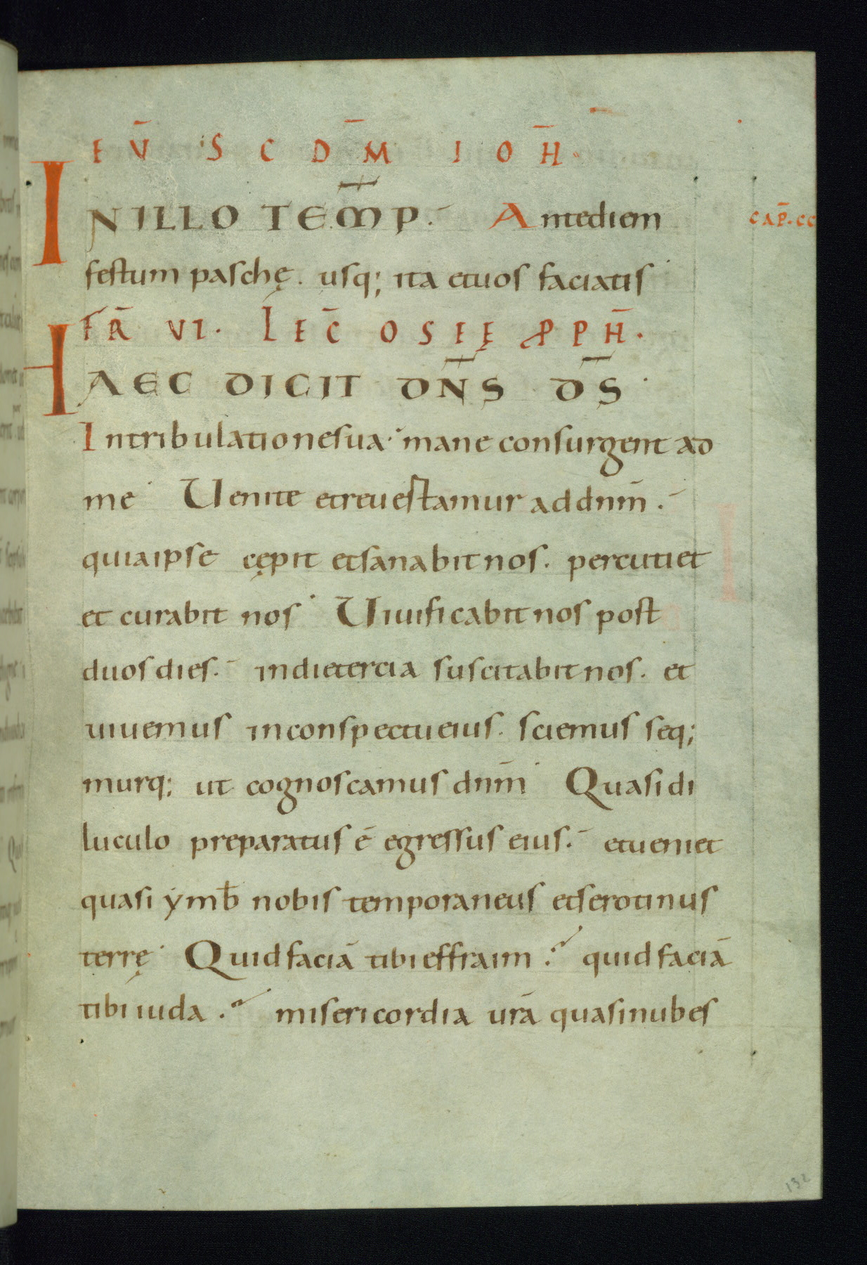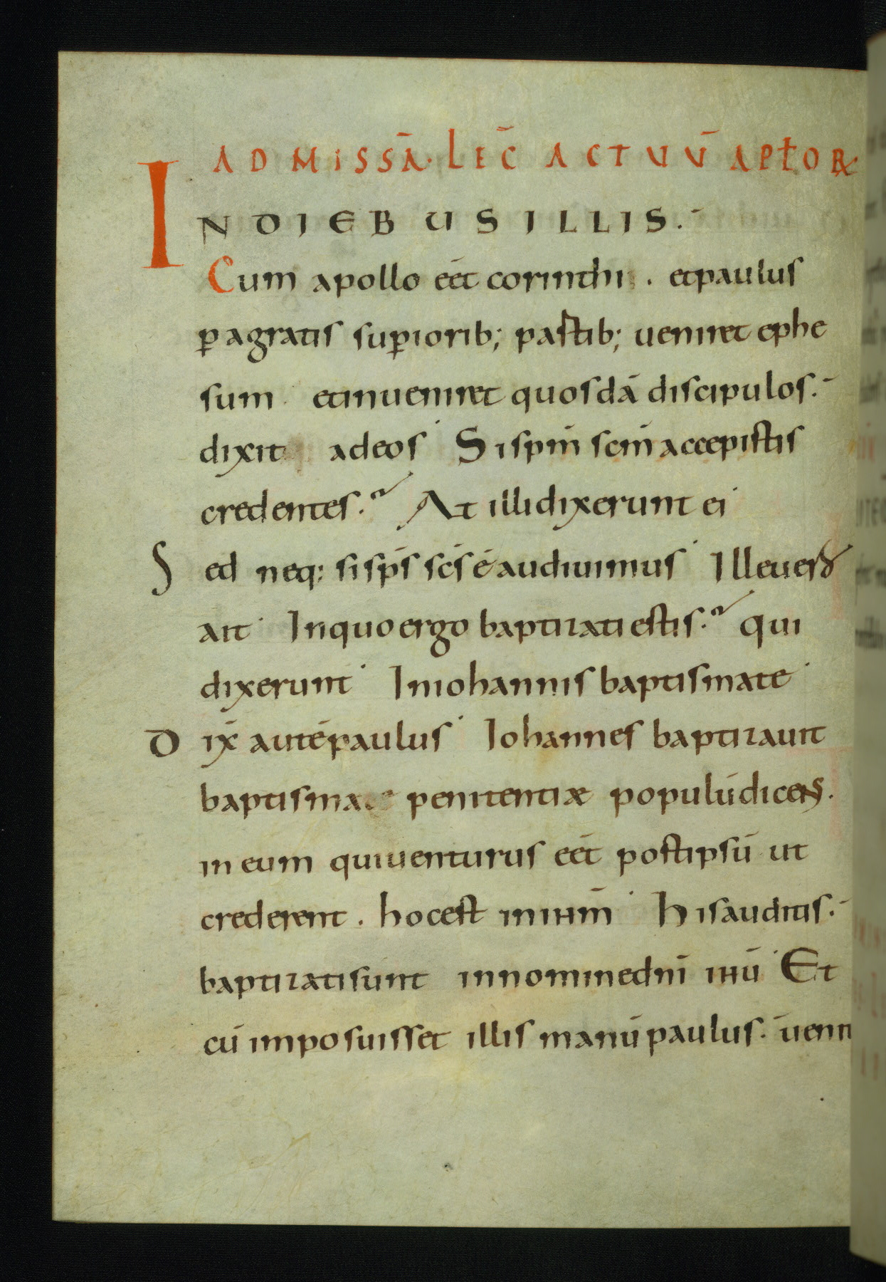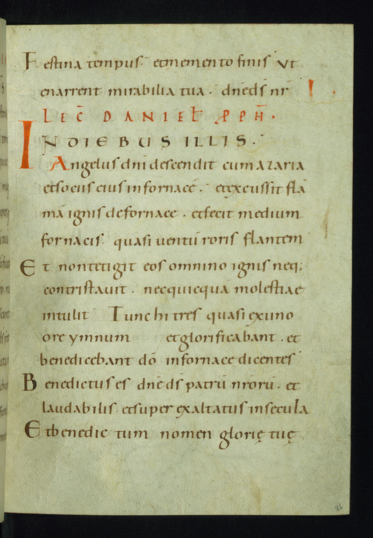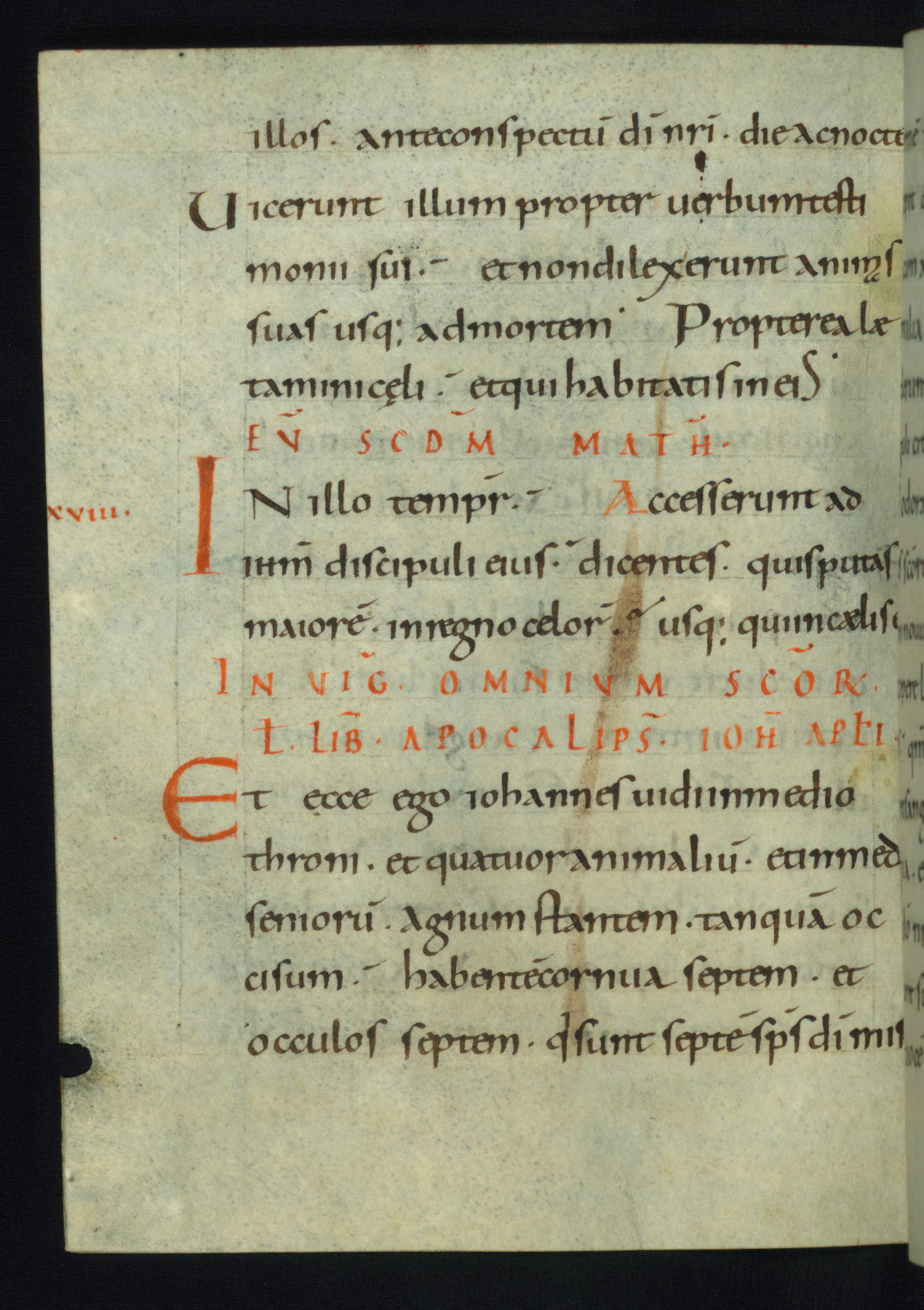 This Lectionary was created ca. 1000 in Trier. Written in a clear Caroline minuscule, it contains decorated initials at the openings of important readings. A set of illuminated letters marks the beginning of the Epistle and Gospel lessons for Easter; they display the hierarchy of scripts with capital letters decorated with gold leaf or drawn in red ink, followed by uncial and Caroline minuscule. Initials in orange, sometimes filled with gold, mark the divisions of the text. The book has been stylistically compared with Ottonian manuscripts, especially with a Psalter preserved in Trier (Stadtbibliothek, Ms. 7) illuminated by the so-called Master of the Registrum Gregorii.