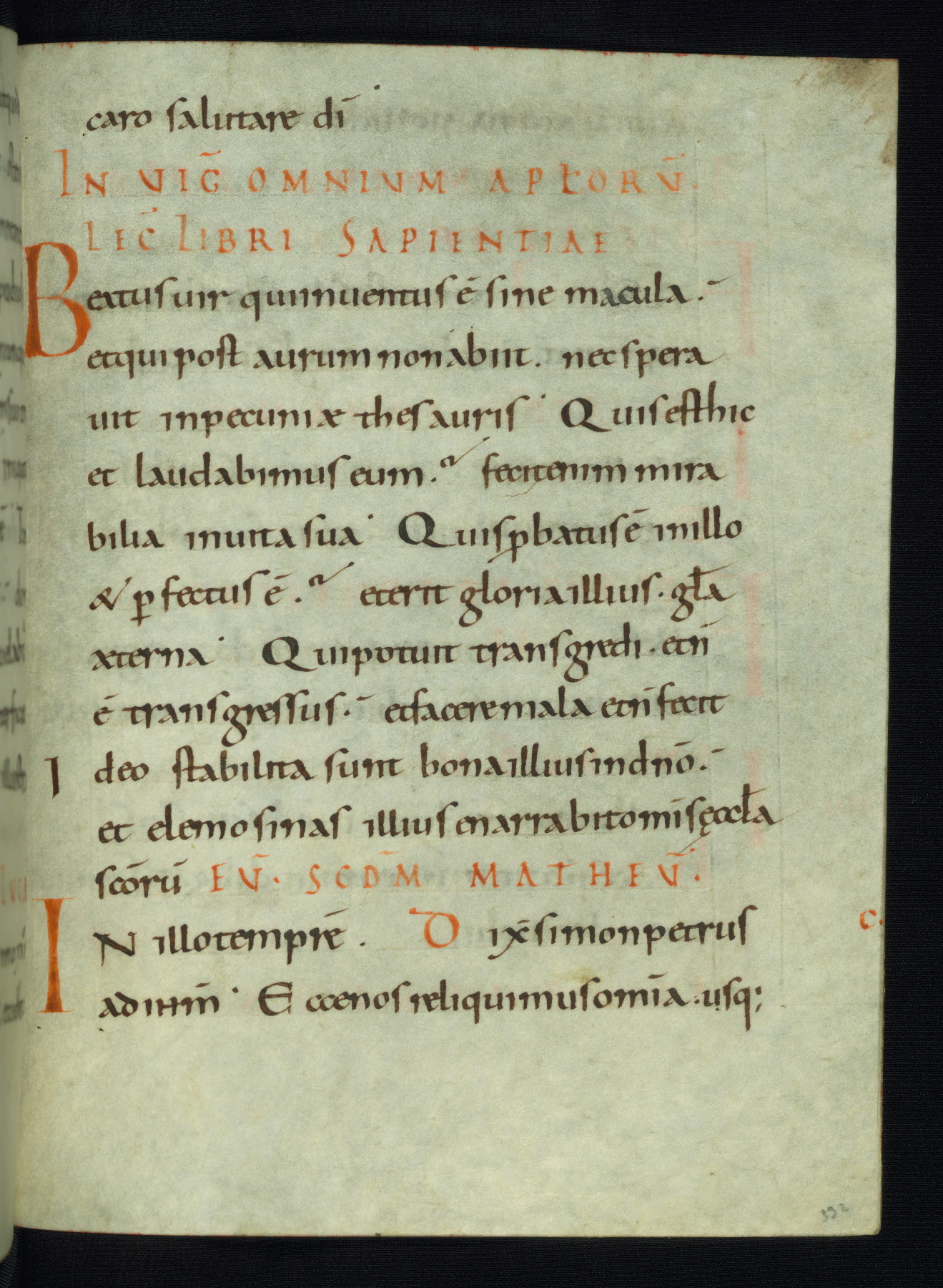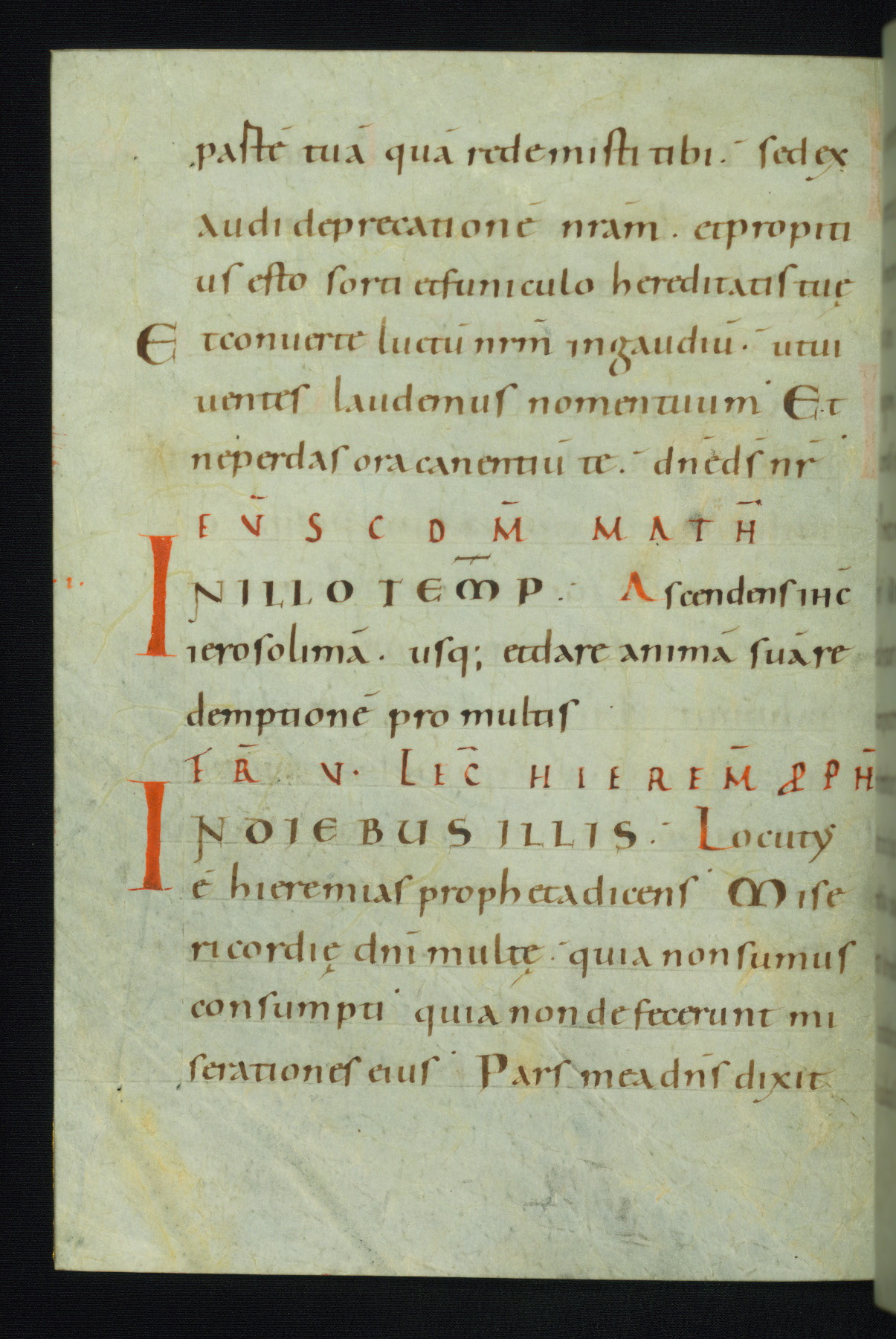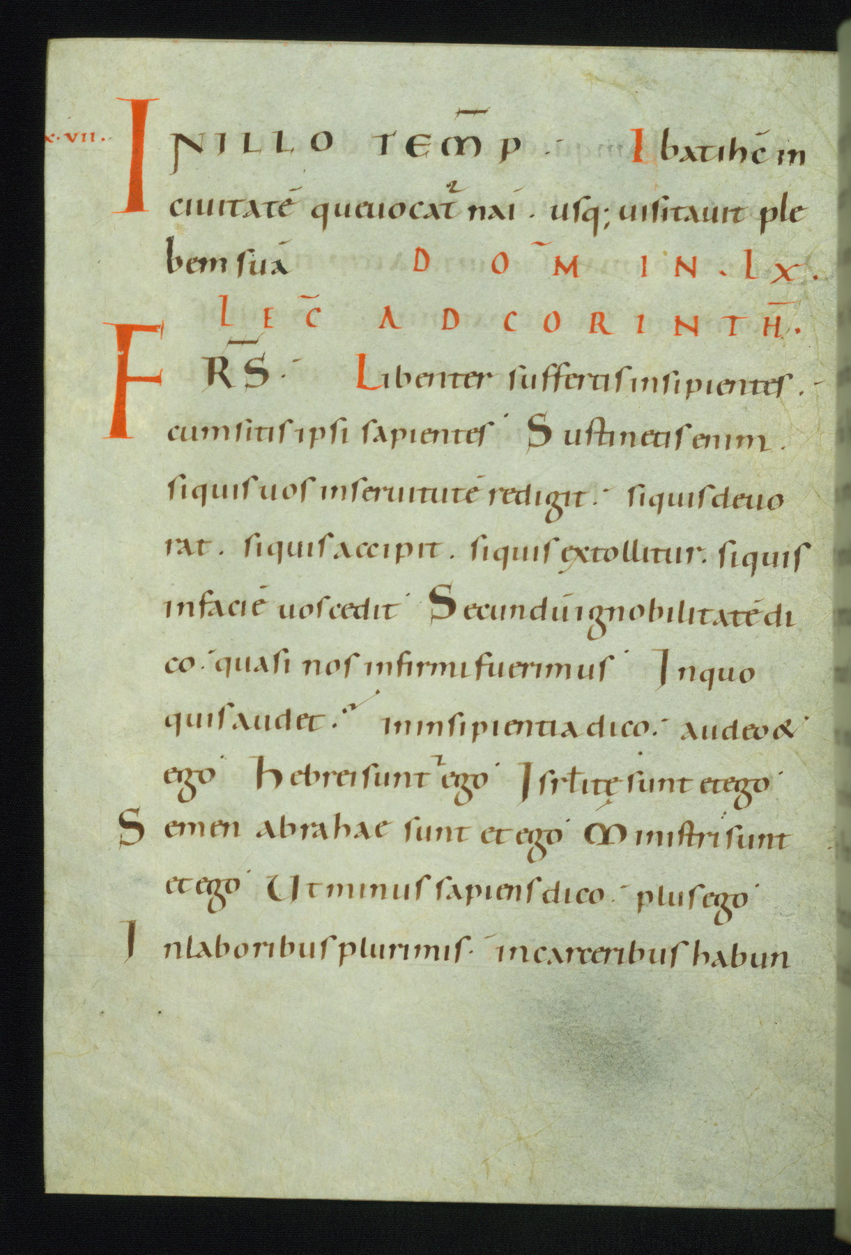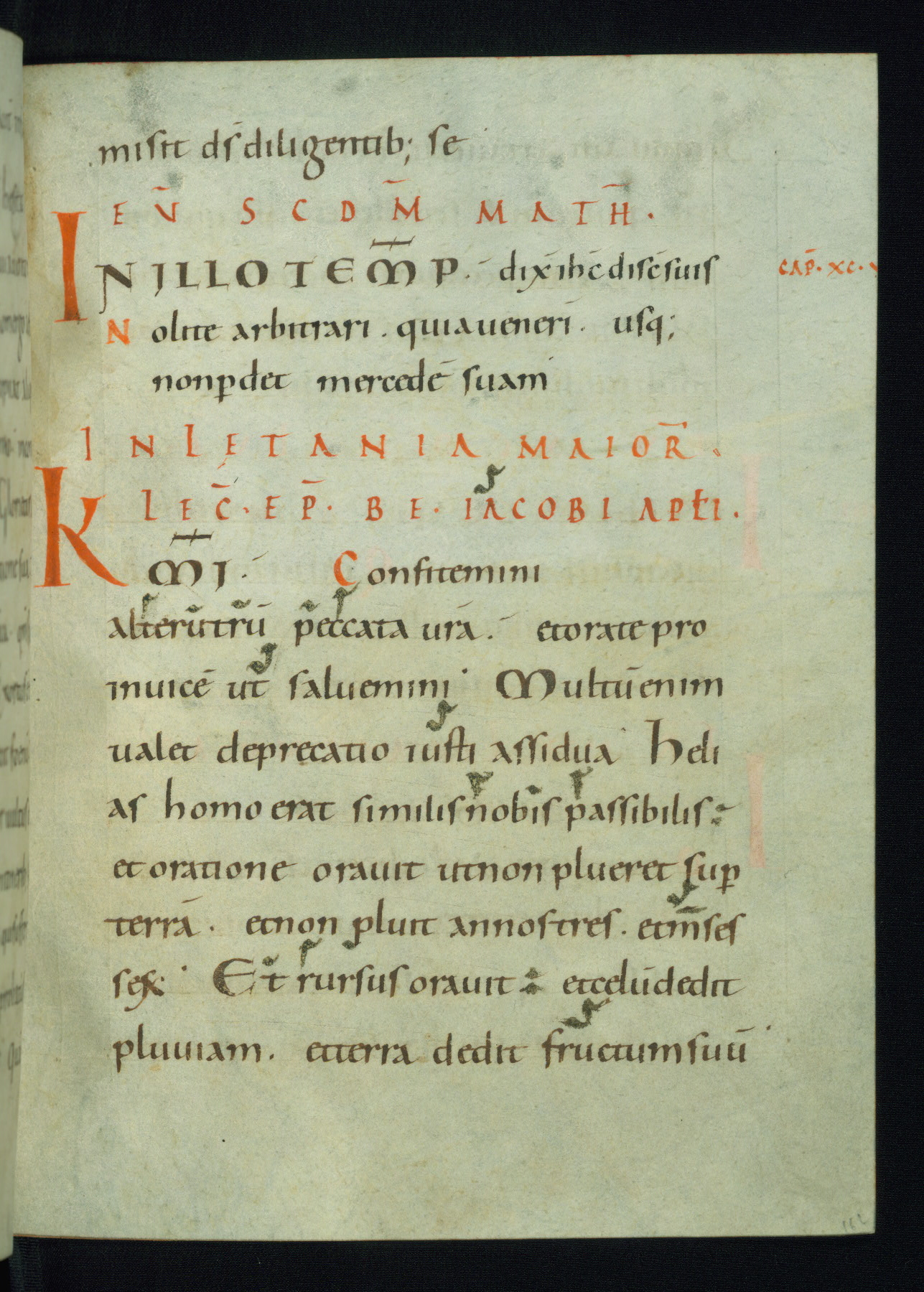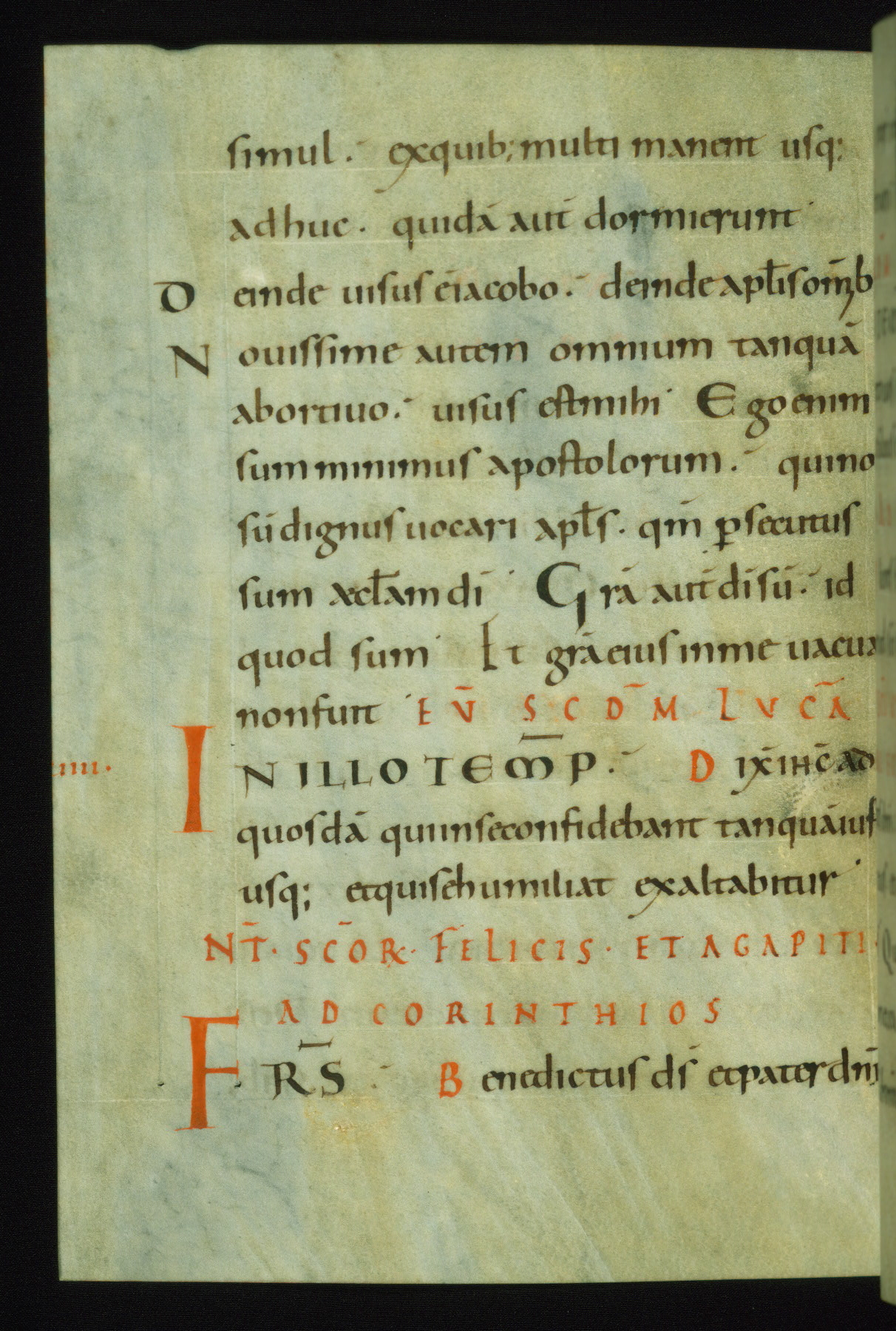 This Lectionary was created ca. 1000 in Trier. Written in a clear Caroline minuscule, it contains decorated initials at the openings of important readings. A set of illuminated letters marks the beginning of the Epistle and Gospel lessons for Easter; they display the hierarchy of scripts with capital letters decorated with gold leaf or drawn in red ink, followed by uncial and Caroline minuscule. Initials in orange, sometimes filled with gold, mark the divisions of the text. The book has been stylistically compared with Ottonian manuscripts, especially with a Psalter preserved in Trier (Stadtbibliothek, Ms. 7) illuminated by the so-called Master of the Registrum Gregorii.