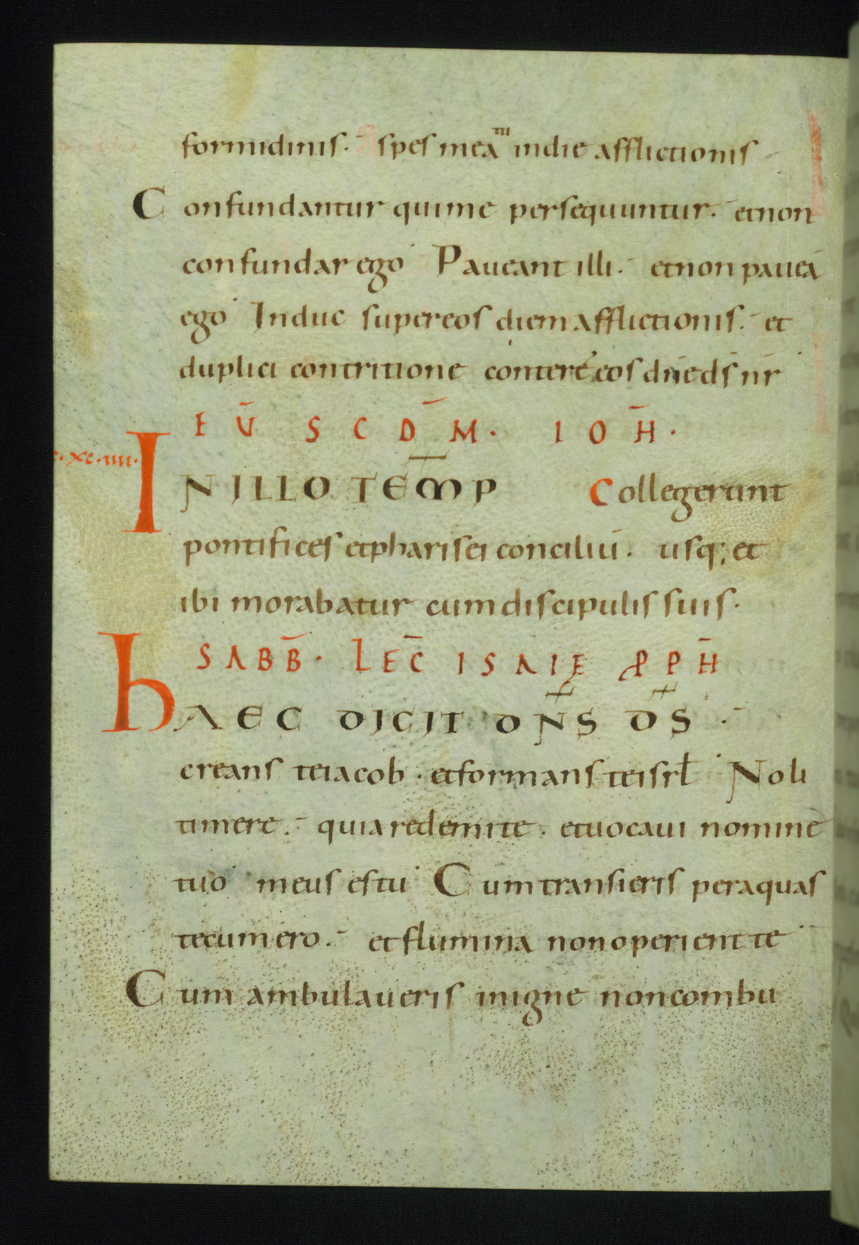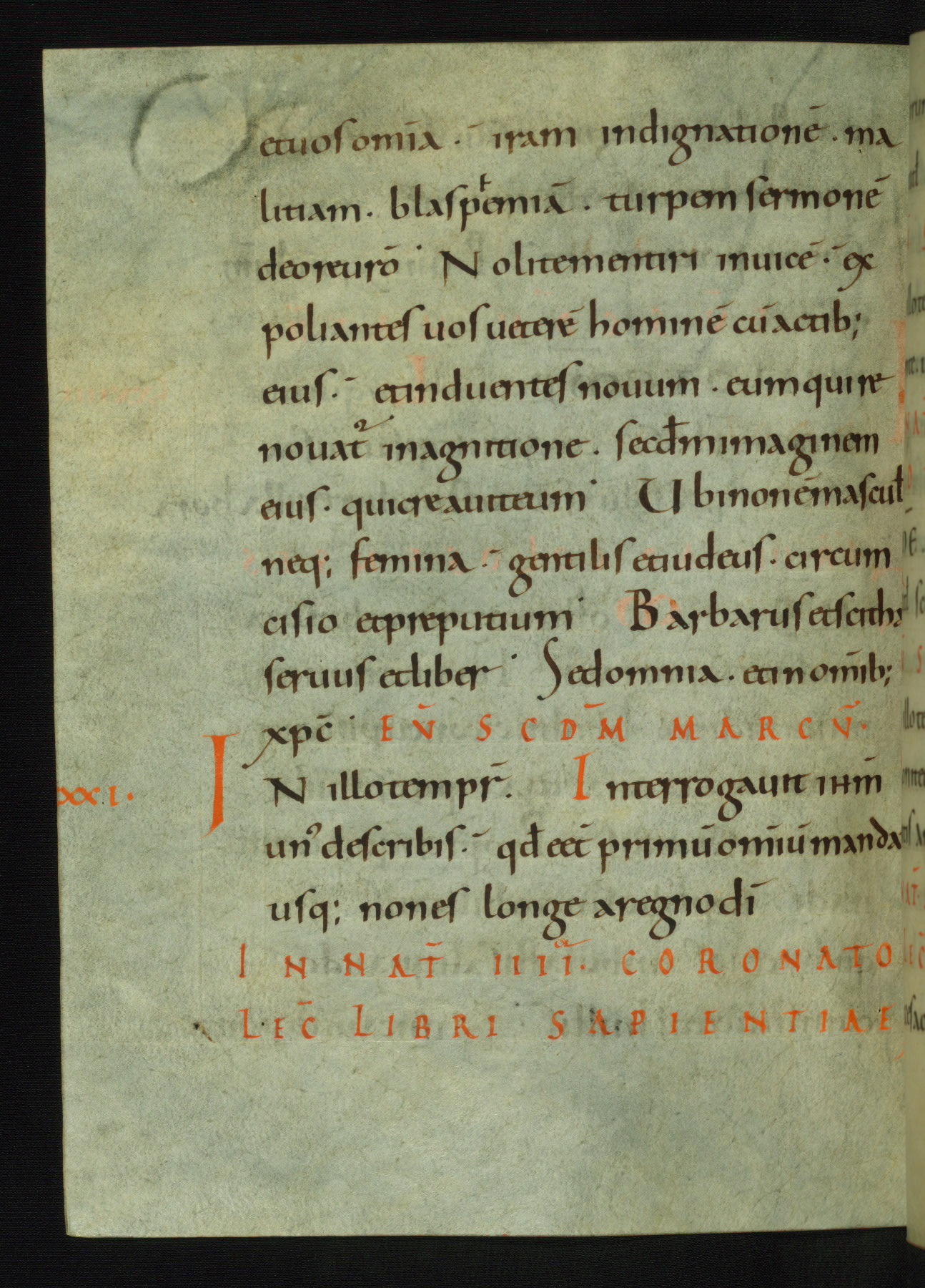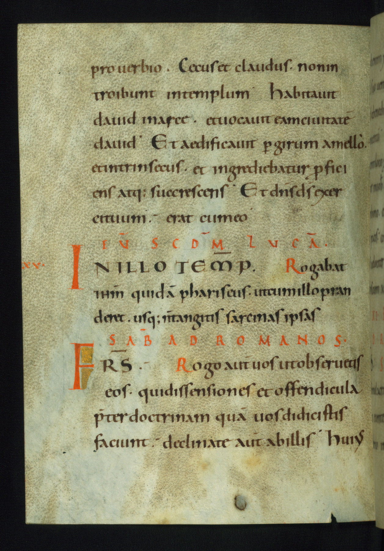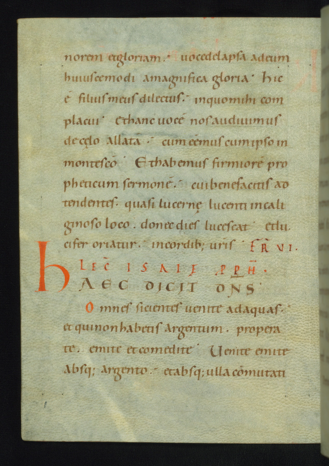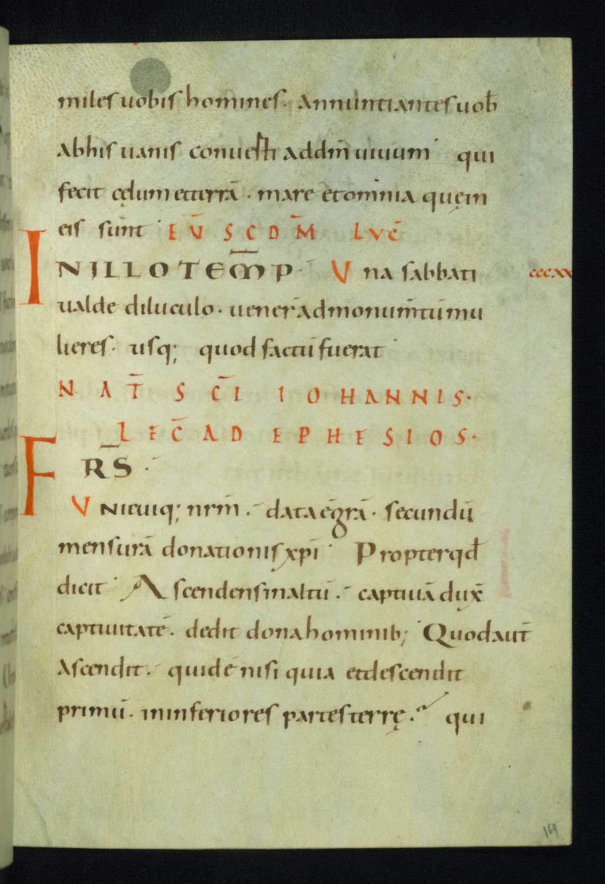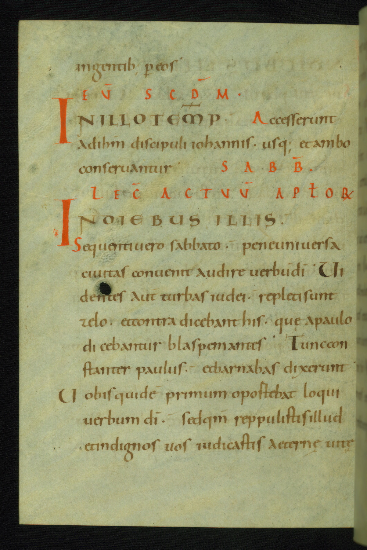 This Lectionary was created ca. 1000 in Trier. Written in a clear Caroline minuscule, it contains decorated initials at the openings of important readings. A set of illuminated letters marks the beginning of the Epistle and Gospel lessons for Easter; they display the hierarchy of scripts with capital letters decorated with gold leaf or drawn in red ink, followed by uncial and Caroline minuscule. Initials in orange, sometimes filled with gold, mark the divisions of the text. The book has been stylistically compared with Ottonian manuscripts, especially with a Psalter preserved in Trier (Stadtbibliothek, Ms. 7) illuminated by the so-called Master of the Registrum Gregorii.
