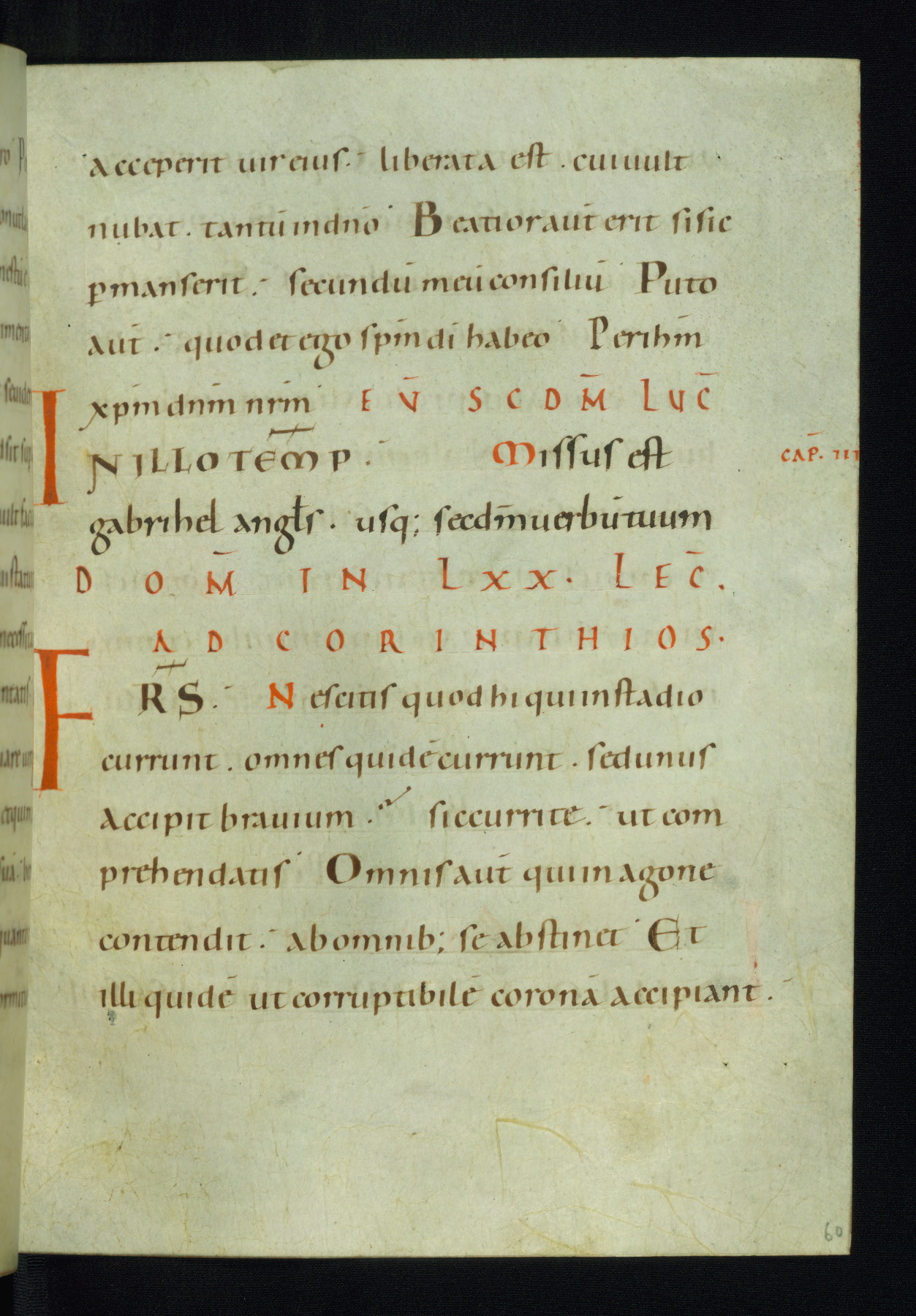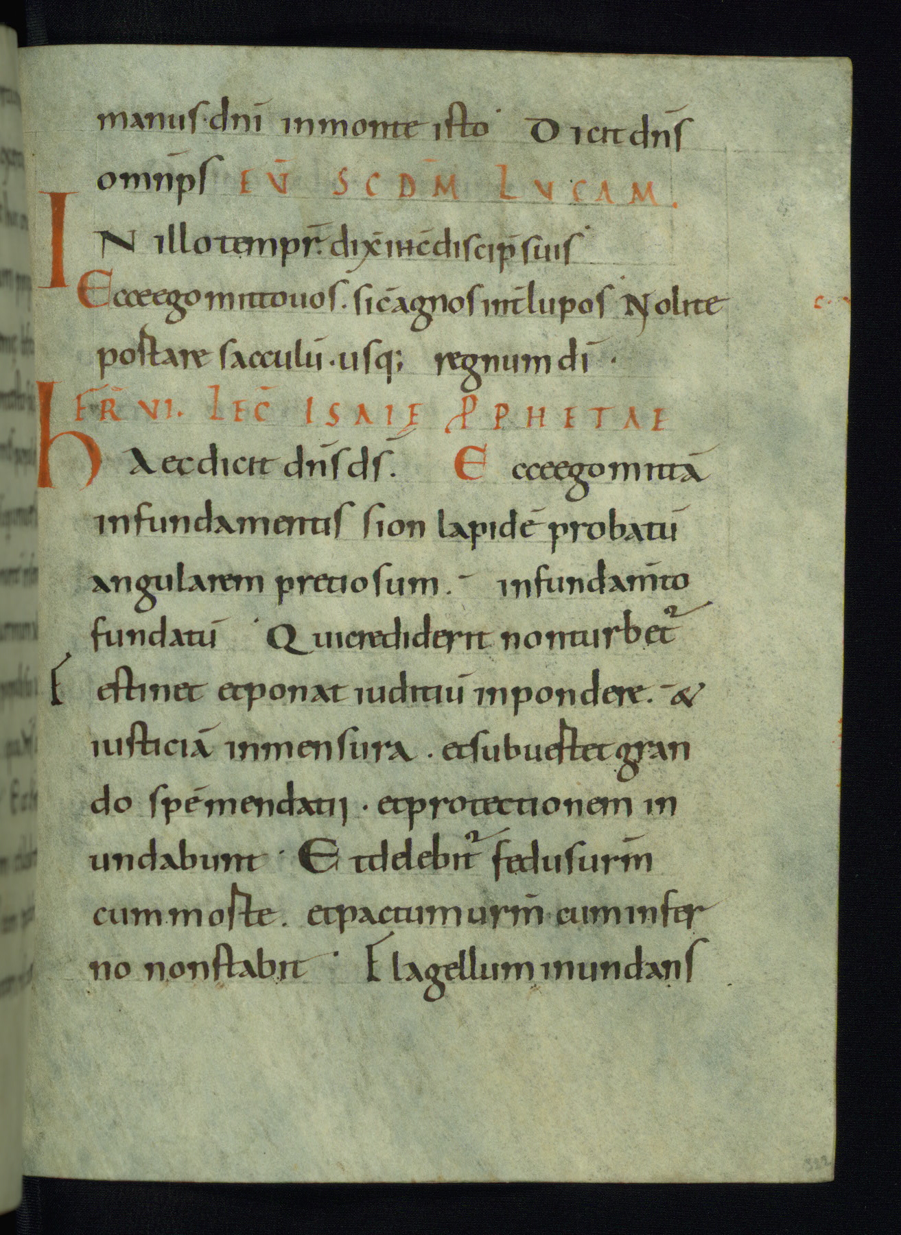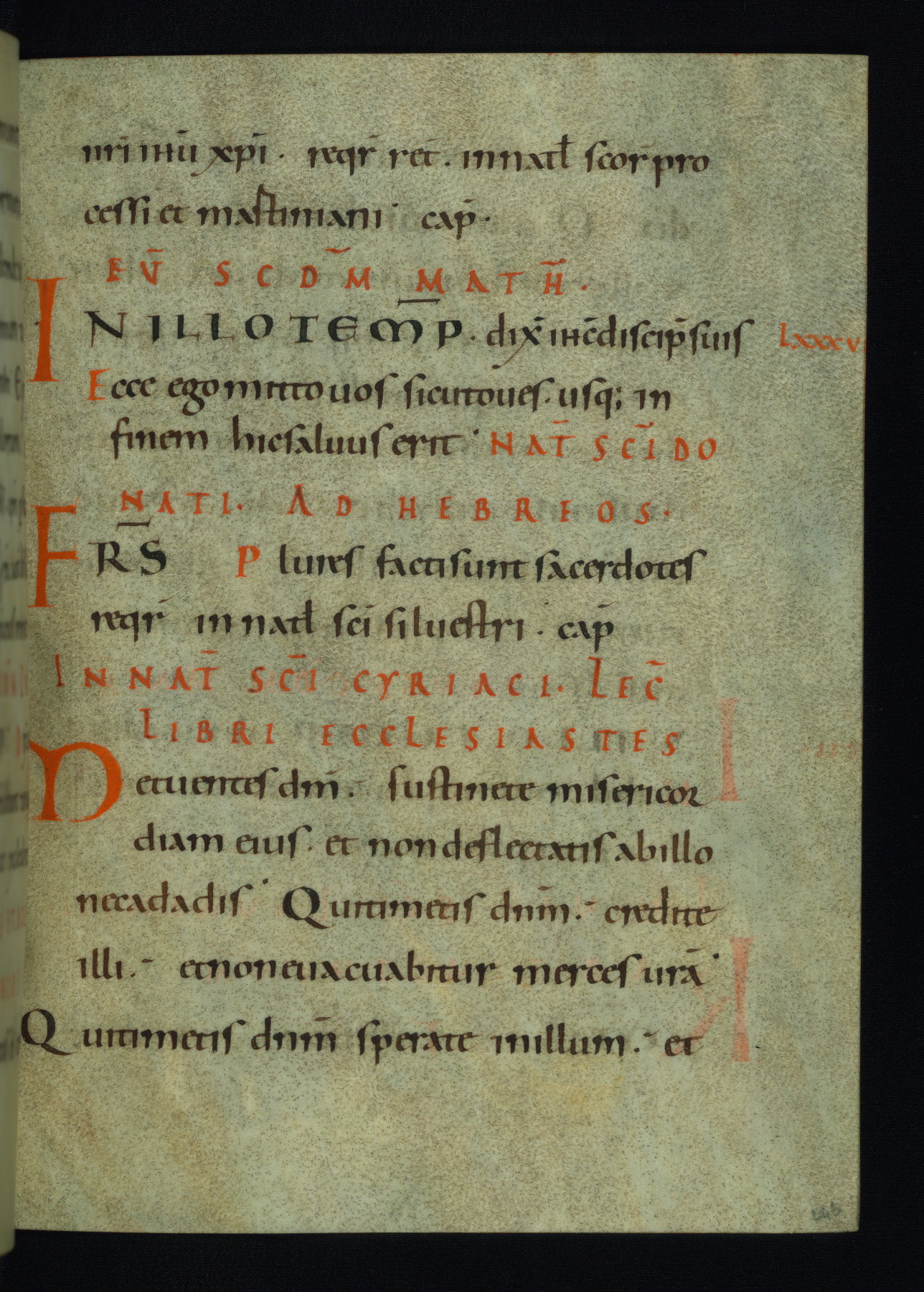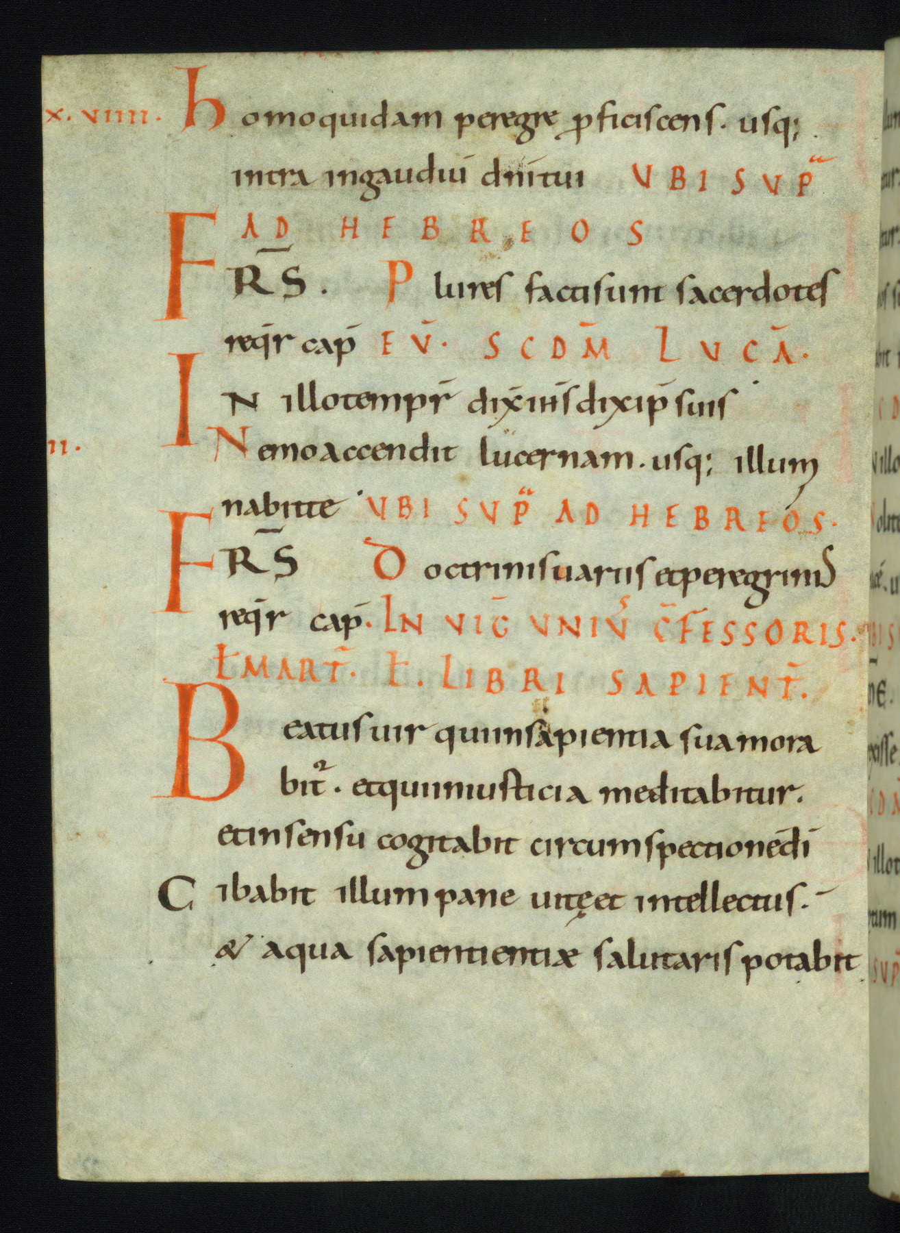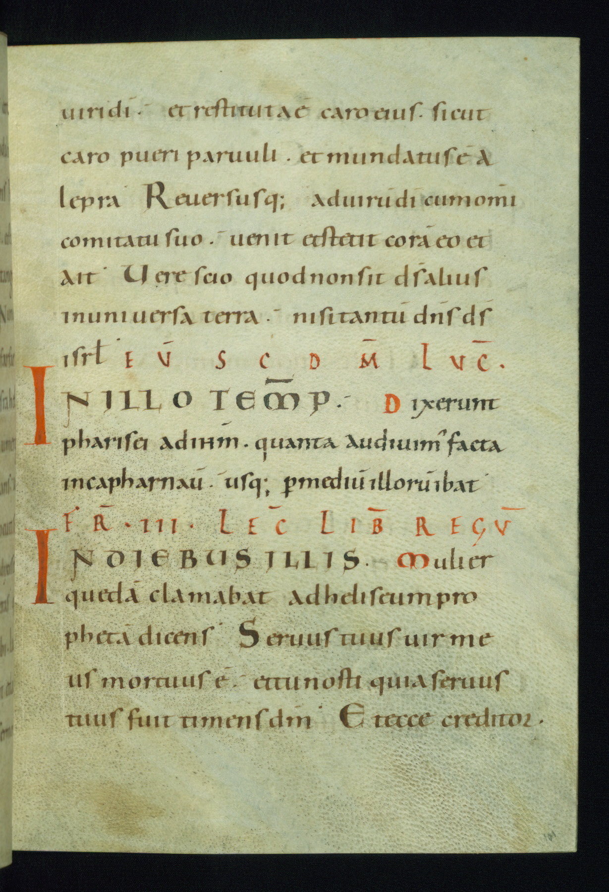 This Lectionary was created ca. 1000 in Trier. Written in a clear Caroline minuscule, it contains decorated initials at the openings of important readings. A set of illuminated letters marks the beginning of the Epistle and Gospel lessons for Easter; they display the hierarchy of scripts with capital letters decorated with gold leaf or drawn in red ink, followed by uncial and Caroline minuscule. Initials in orange, sometimes filled with gold, mark the divisions of the text. The book has been stylistically compared with Ottonian manuscripts, especially with a Psalter preserved in Trier (Stadtbibliothek, Ms. 7) illuminated by the so-called Master of the Registrum Gregorii.