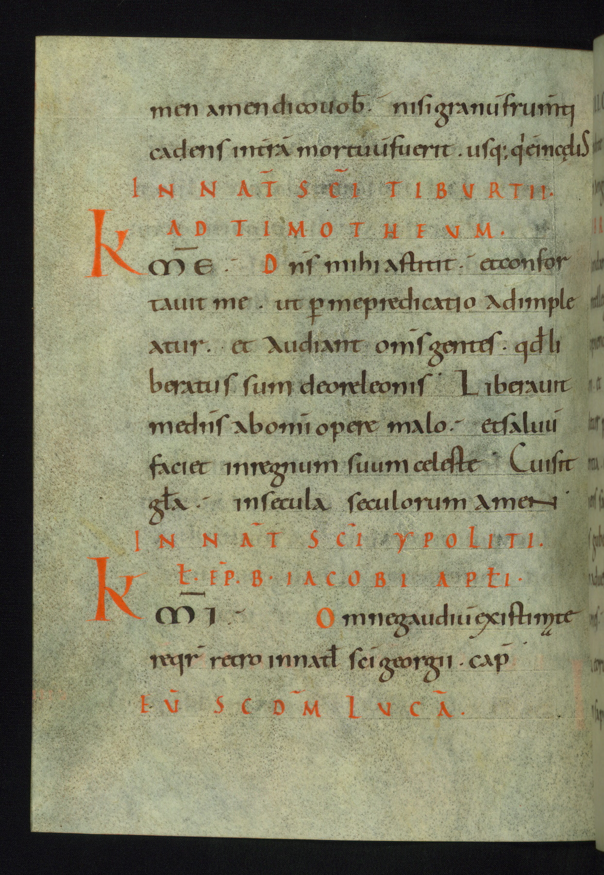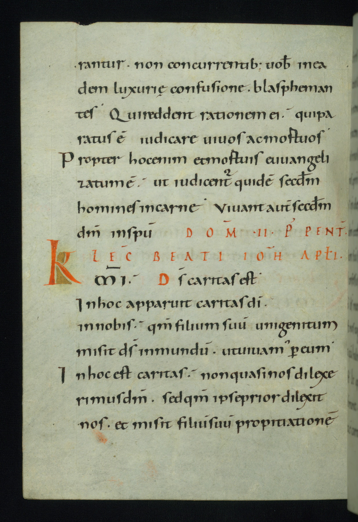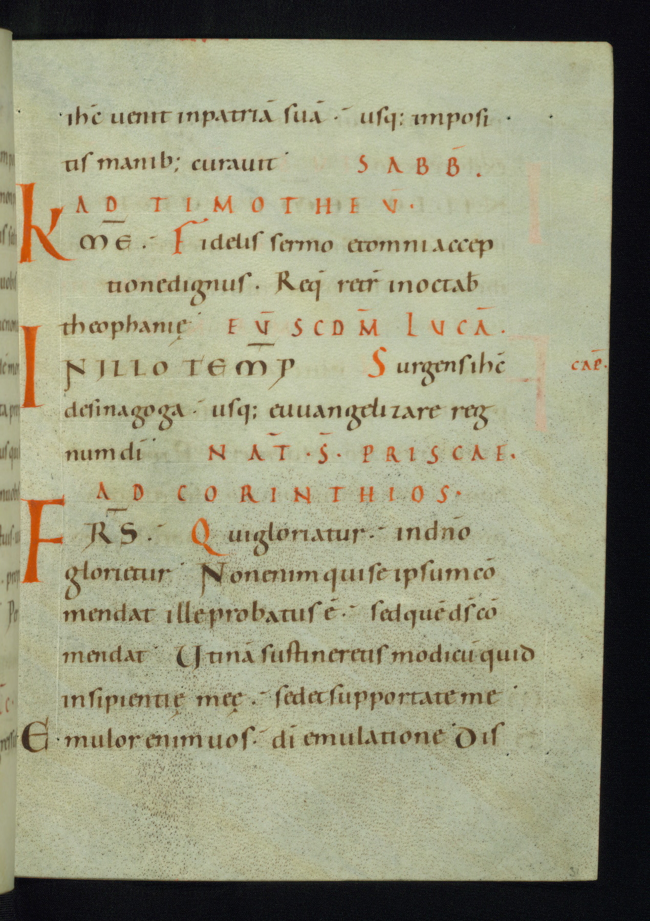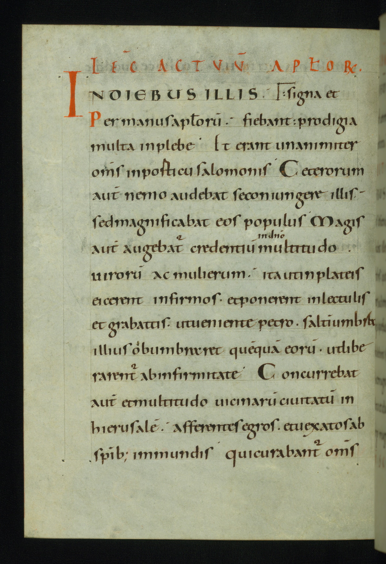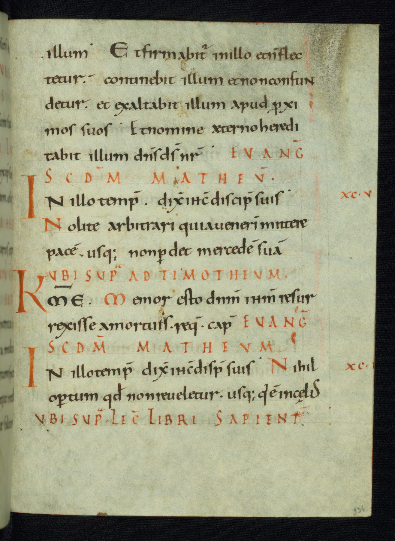 This Lectionary was created ca. 1000 in Trier. Written in a clear Caroline minuscule, it contains decorated initials at the openings of important readings. A set of illuminated letters marks the beginning of the Epistle and Gospel lessons for Easter; they display the hierarchy of scripts with capital letters decorated with gold leaf or drawn in red ink, followed by uncial and Caroline minuscule. Initials in orange, sometimes filled with gold, mark the divisions of the text. The book has been stylistically compared with Ottonian manuscripts, especially with a Psalter preserved in Trier (Stadtbibliothek, Ms. 7) illuminated by the so-called Master of the Registrum Gregorii.