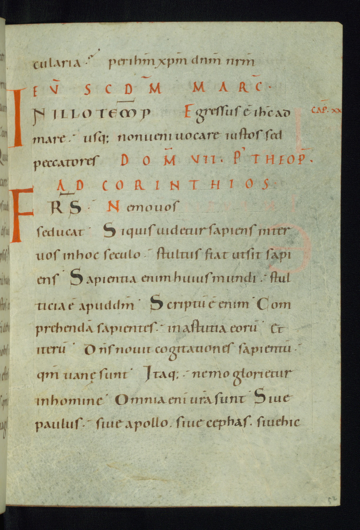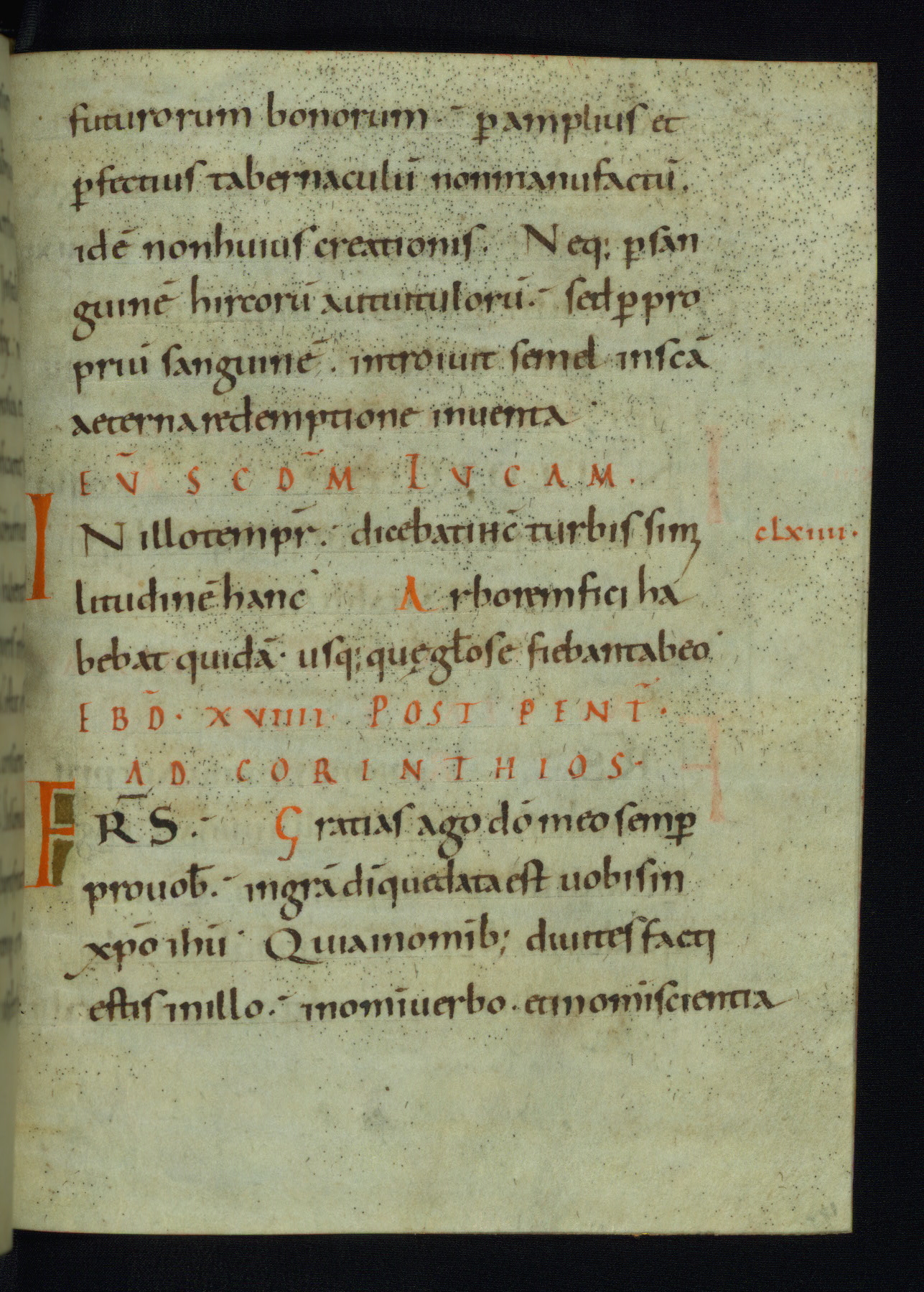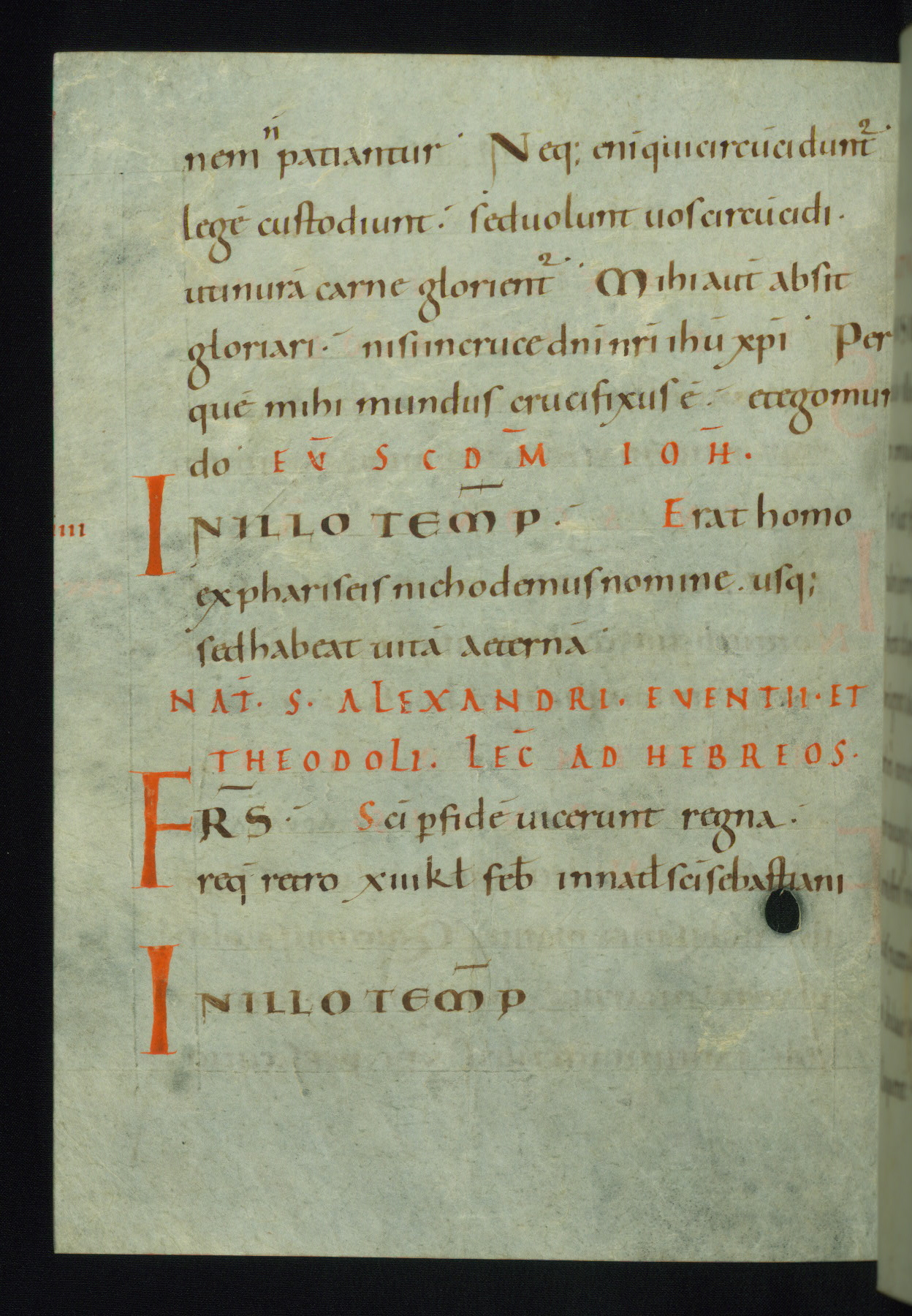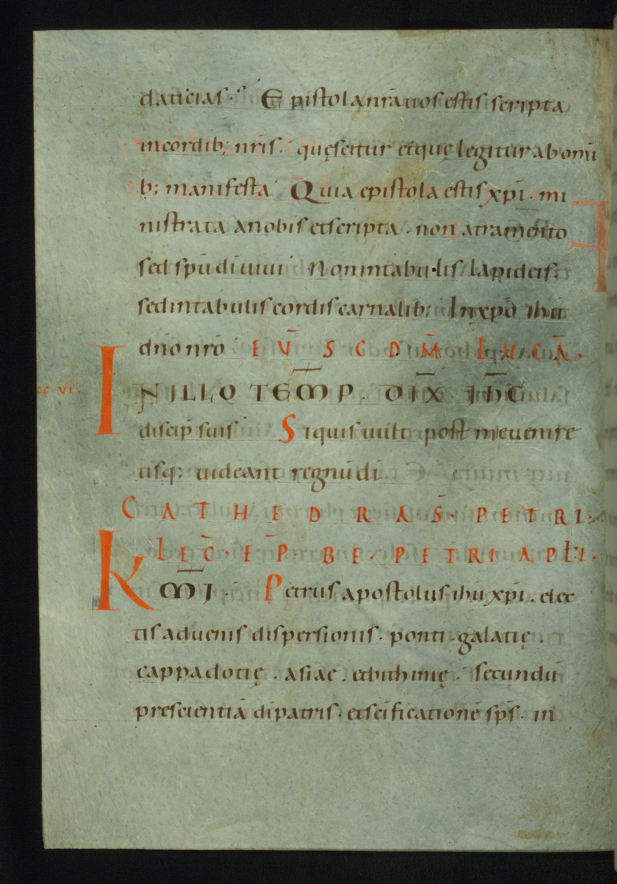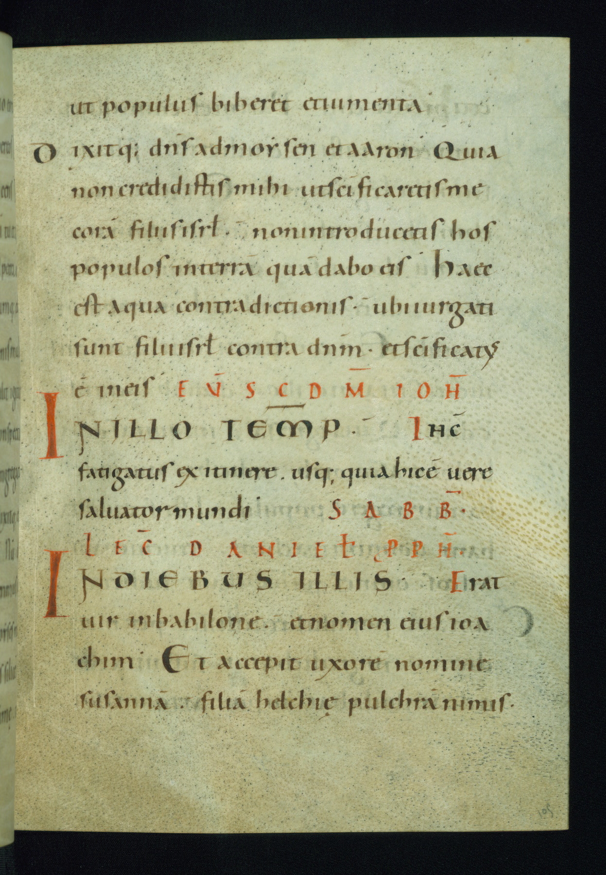 This Lectionary was created ca. 1000 in Trier. Written in a clear Caroline minuscule, it contains decorated initials at the openings of important readings. A set of illuminated letters marks the beginning of the Epistle and Gospel lessons for Easter; they display the hierarchy of scripts with capital letters decorated with gold leaf or drawn in red ink, followed by uncial and Caroline minuscule. Initials in orange, sometimes filled with gold, mark the divisions of the text. The book has been stylistically compared with Ottonian manuscripts, especially with a Psalter preserved in Trier (Stadtbibliothek, Ms. 7) illuminated by the so-called Master of the Registrum Gregorii.