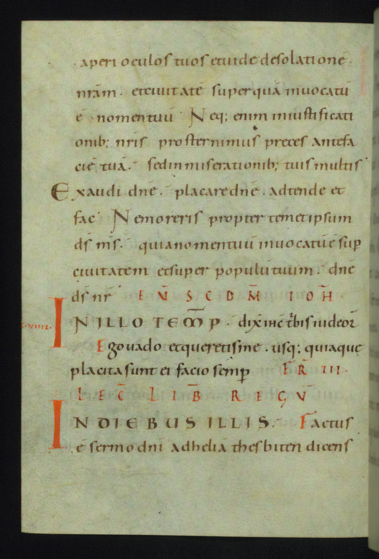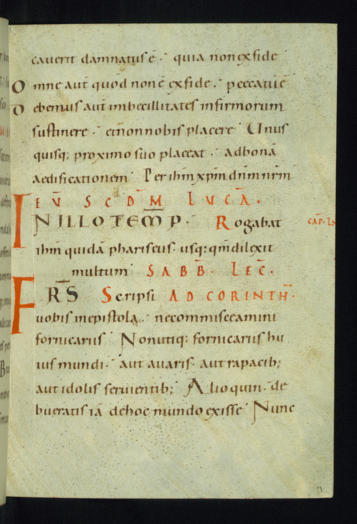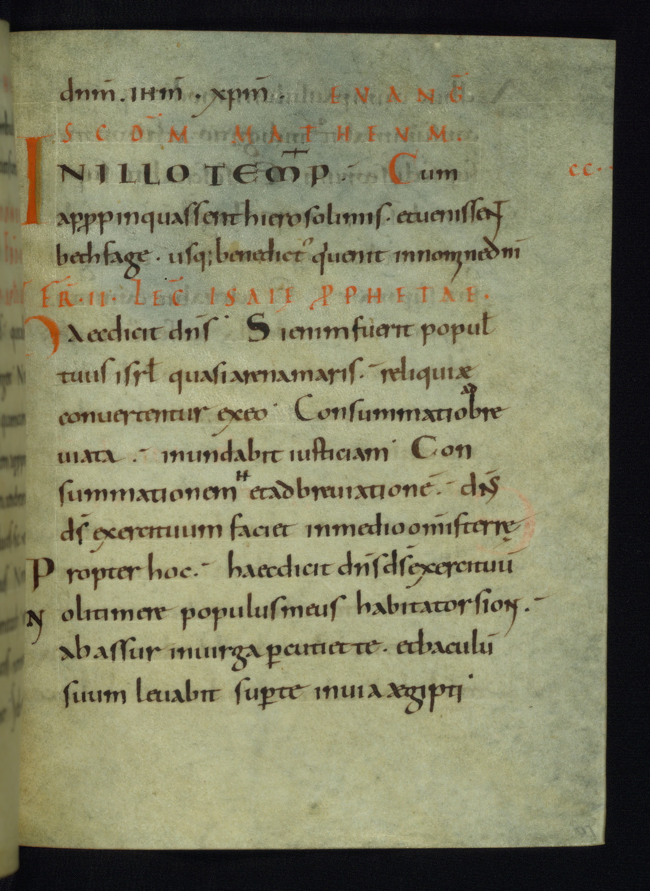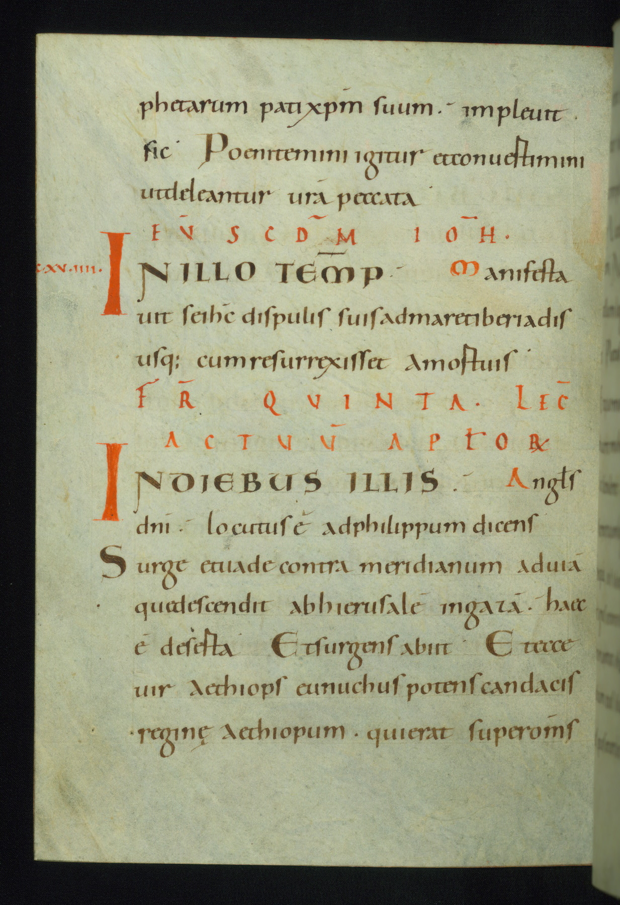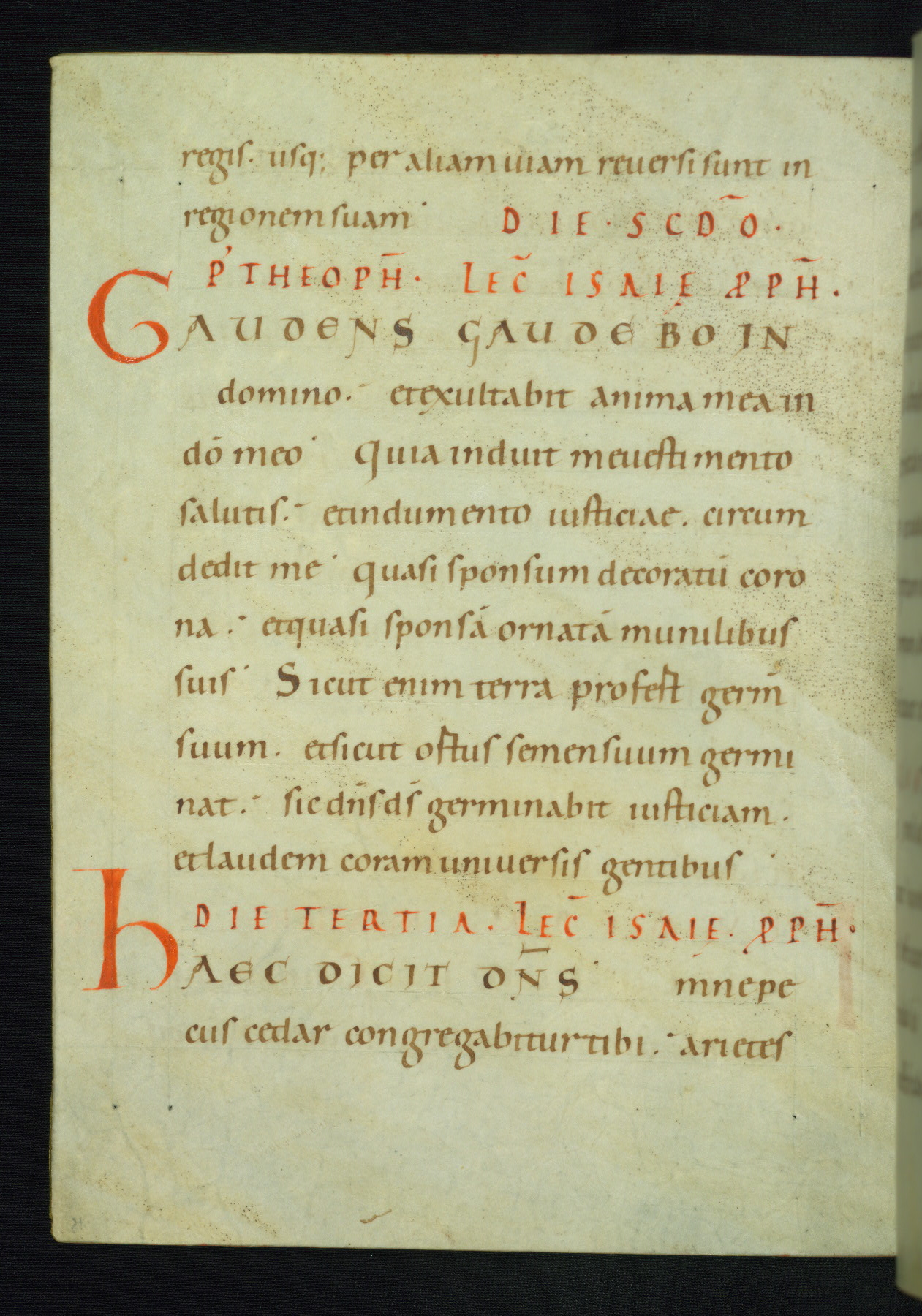 This Lectionary was created ca. 1000 in Trier. Written in a clear Caroline minuscule, it contains decorated initials at the openings of important readings. A set of illuminated letters marks the beginning of the Epistle and Gospel lessons for Easter; they display the hierarchy of scripts with capital letters decorated with gold leaf or drawn in red ink, followed by uncial and Caroline minuscule. Initials in orange, sometimes filled with gold, mark the divisions of the text. The book has been stylistically compared with Ottonian manuscripts, especially with a Psalter preserved in Trier (Stadtbibliothek, Ms. 7) illuminated by the so-called Master of the Registrum Gregorii.
