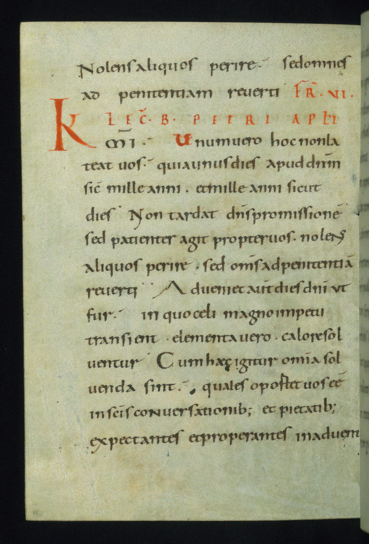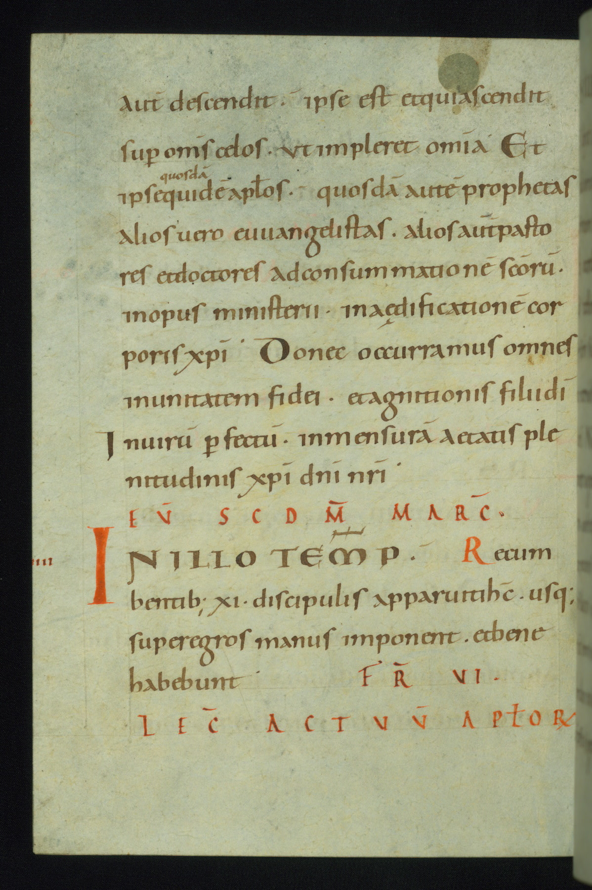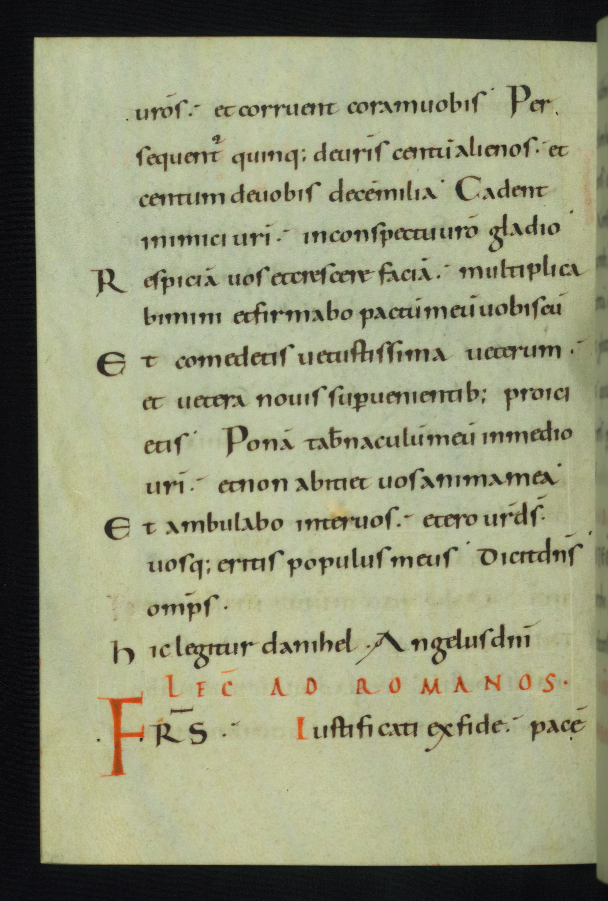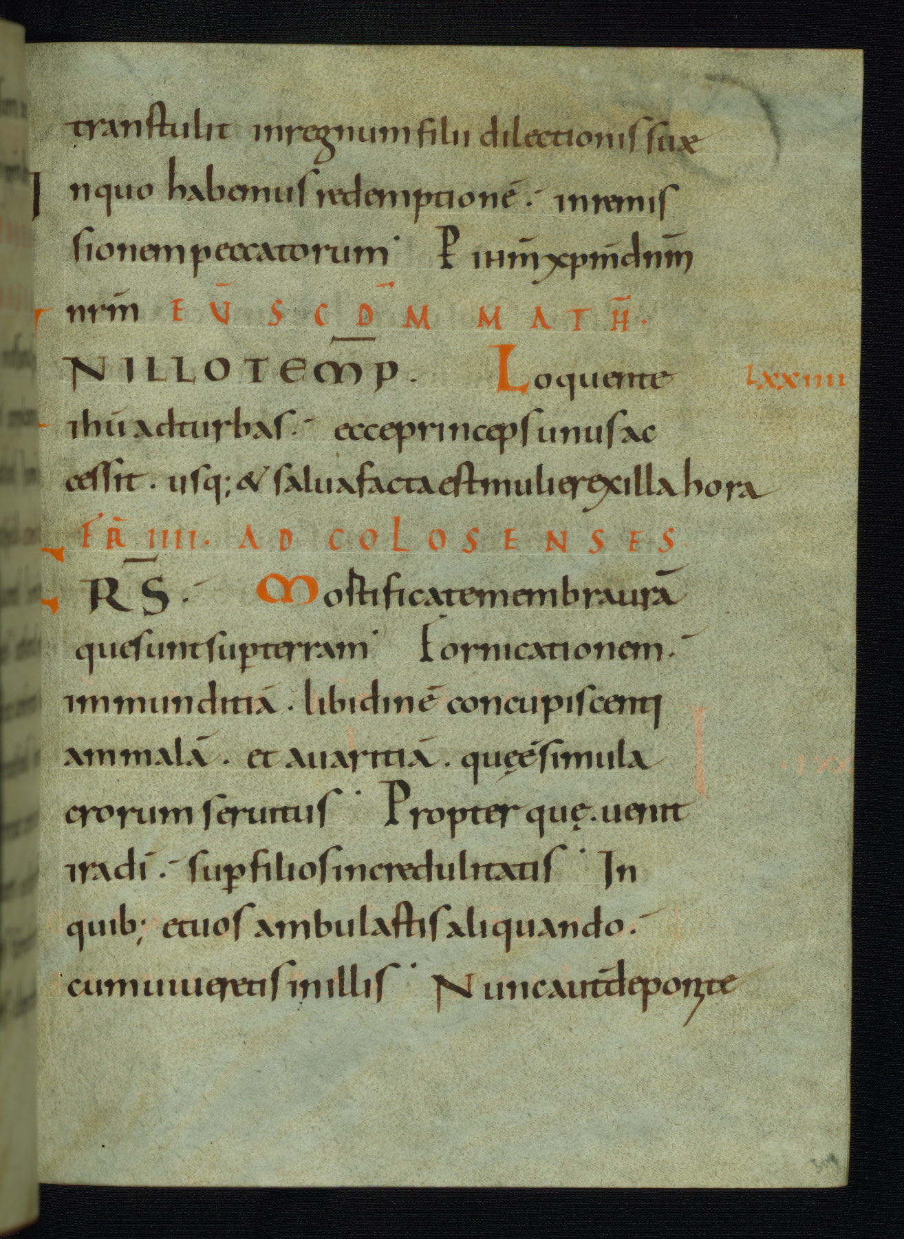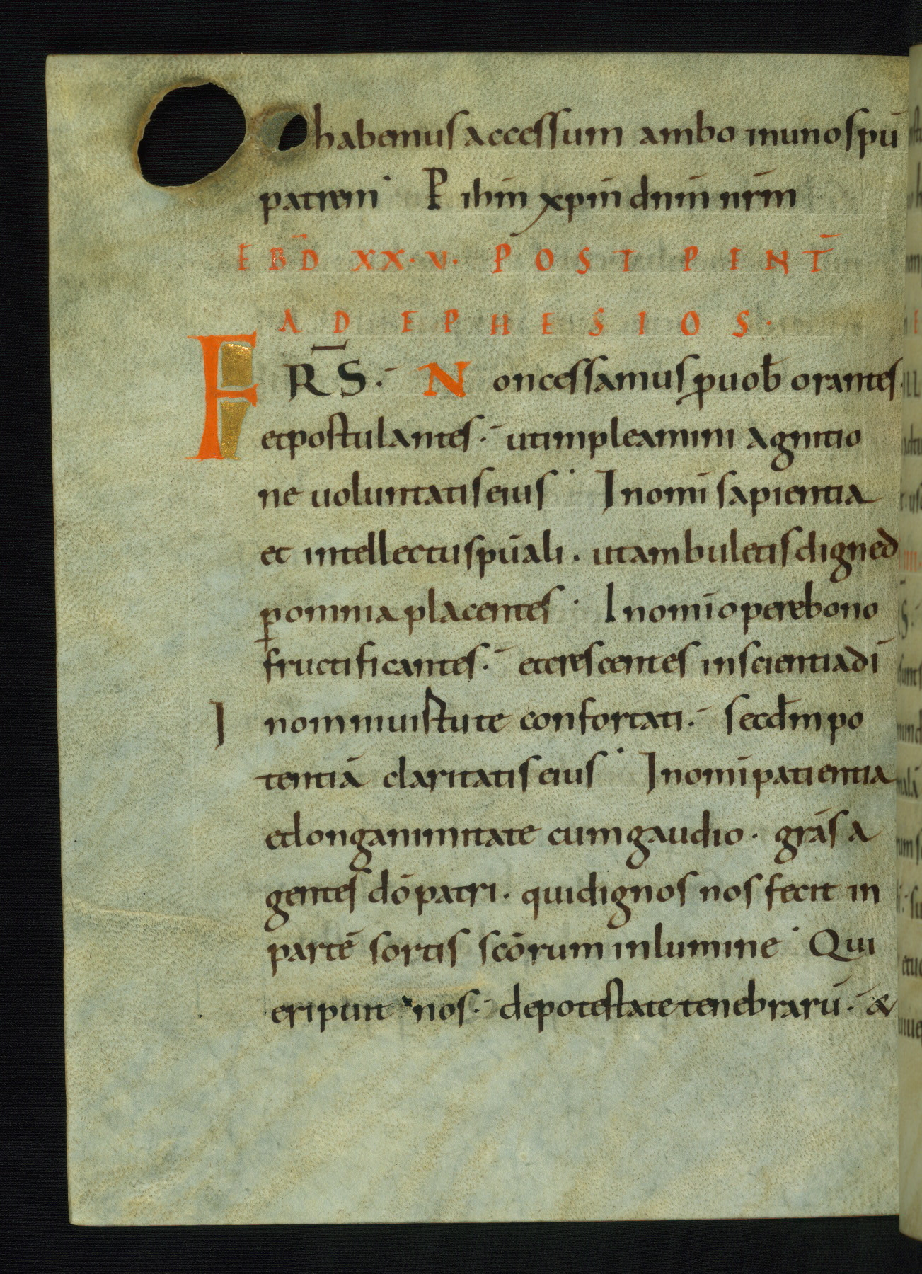 This Lectionary was created ca. 1000 in Trier. Written in a clear Caroline minuscule, it contains decorated initials at the openings of important readings. A set of illuminated letters marks the beginning of the Epistle and Gospel lessons for Easter; they display the hierarchy of scripts with capital letters decorated with gold leaf or drawn in red ink, followed by uncial and Caroline minuscule. Initials in orange, sometimes filled with gold, mark the divisions of the text. The book has been stylistically compared with Ottonian manuscripts, especially with a Psalter preserved in Trier (Stadtbibliothek, Ms. 7) illuminated by the so-called Master of the Registrum Gregorii.