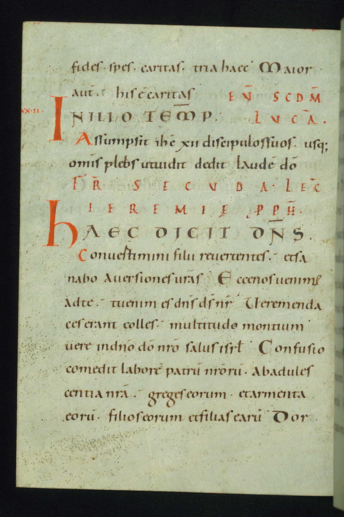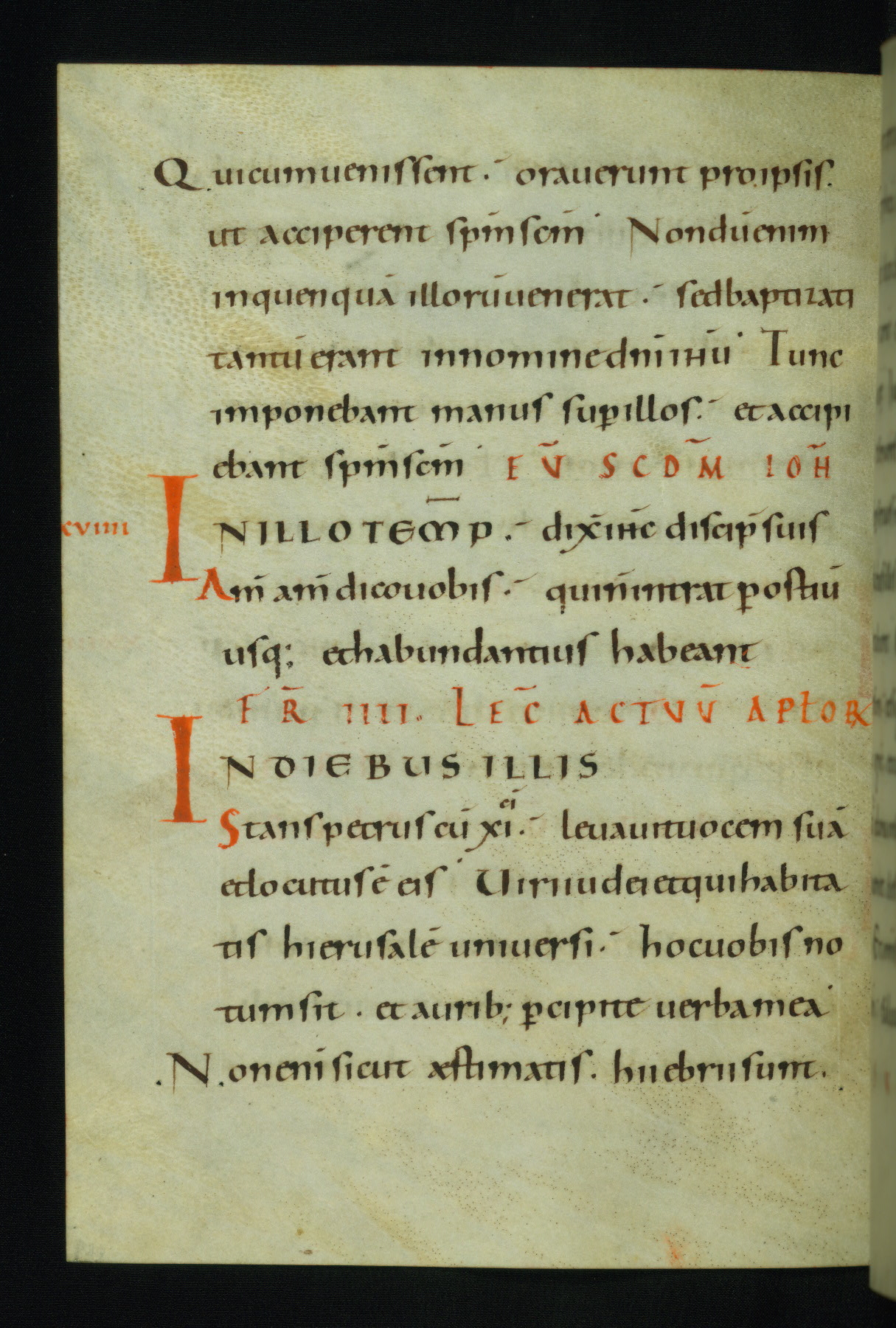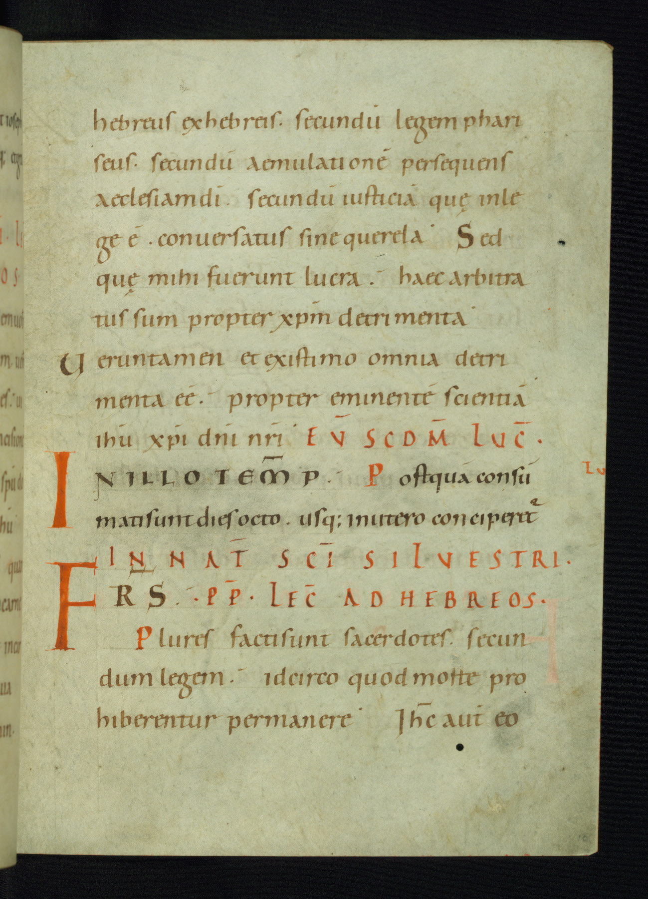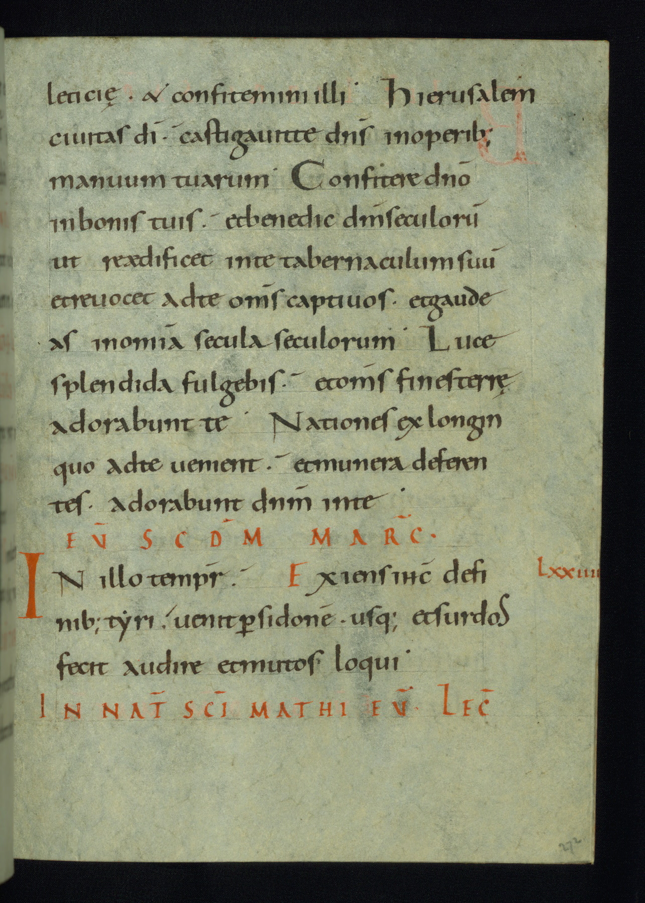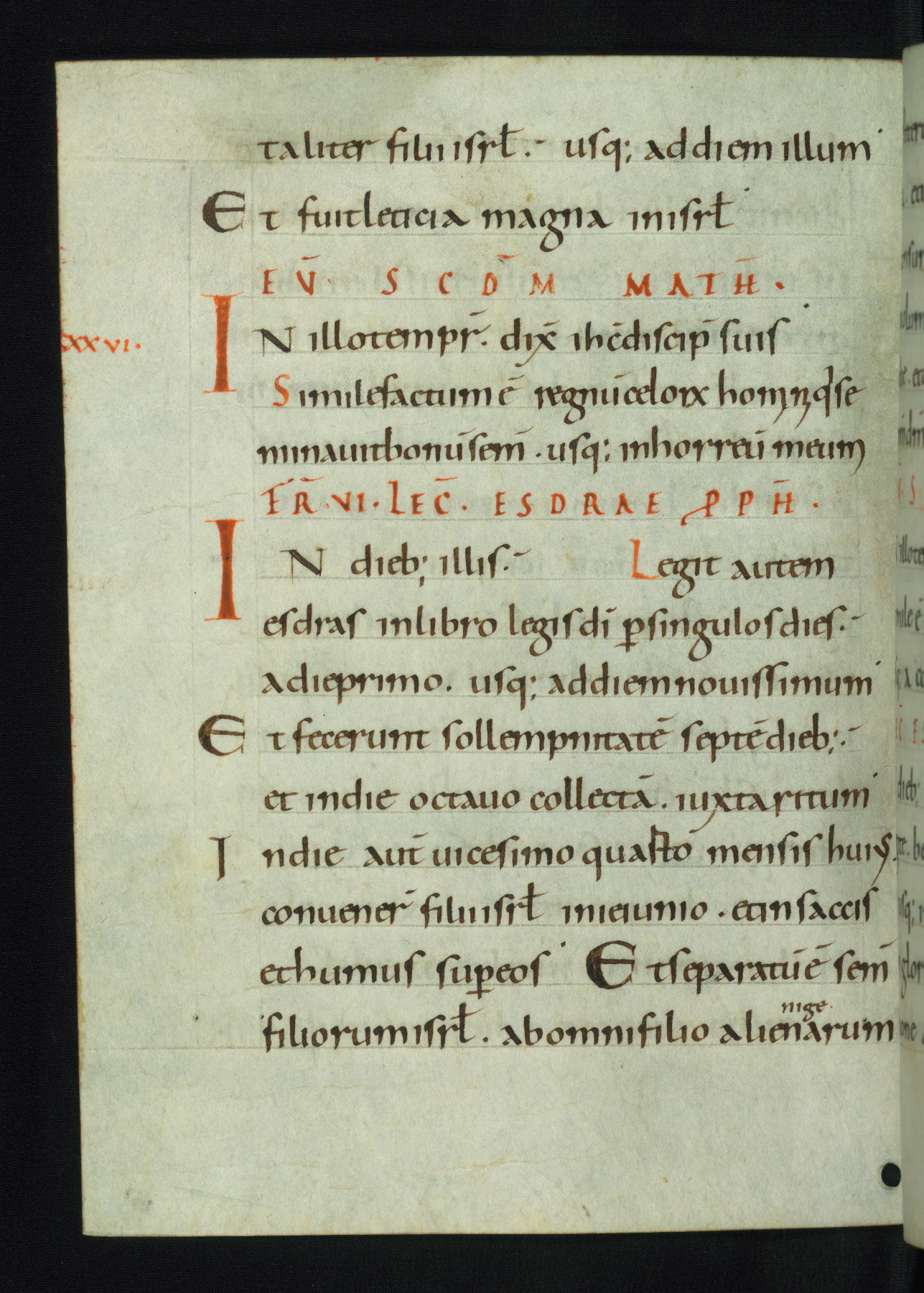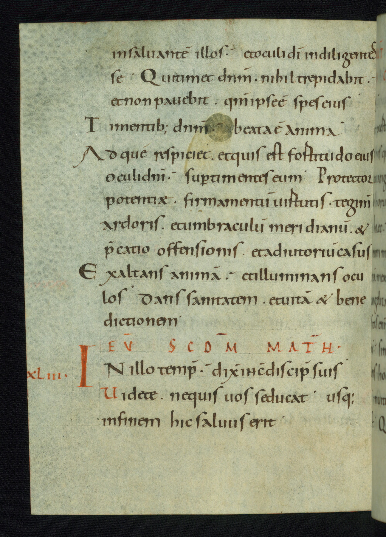 This Lectionary was created ca. 1000 in Trier. Written in a clear Caroline minuscule, it contains decorated initials at the openings of important readings. A set of illuminated letters marks the beginning of the Epistle and Gospel lessons for Easter; they display the hierarchy of scripts with capital letters decorated with gold leaf or drawn in red ink, followed by uncial and Caroline minuscule. Initials in orange, sometimes filled with gold, mark the divisions of the text. The book has been stylistically compared with Ottonian manuscripts, especially with a Psalter preserved in Trier (Stadtbibliothek, Ms. 7) illuminated by the so-called Master of the Registrum Gregorii.