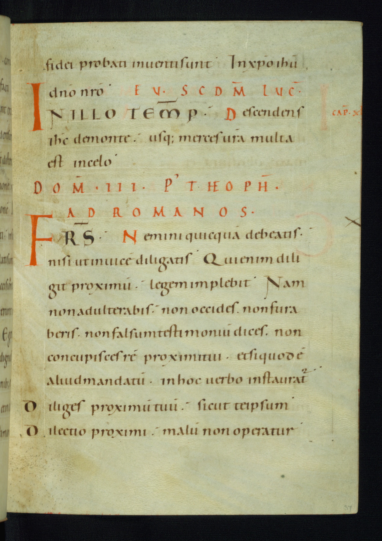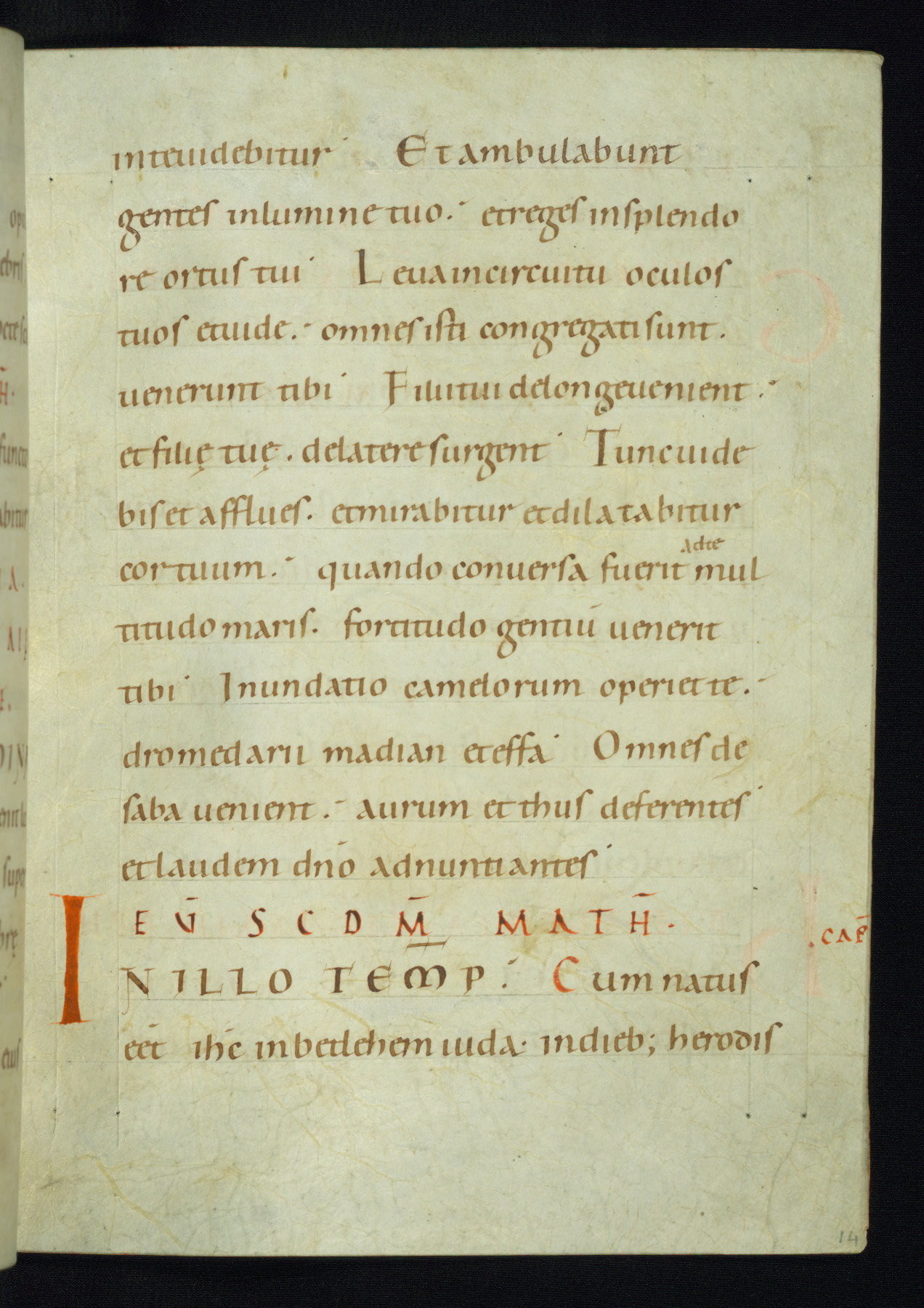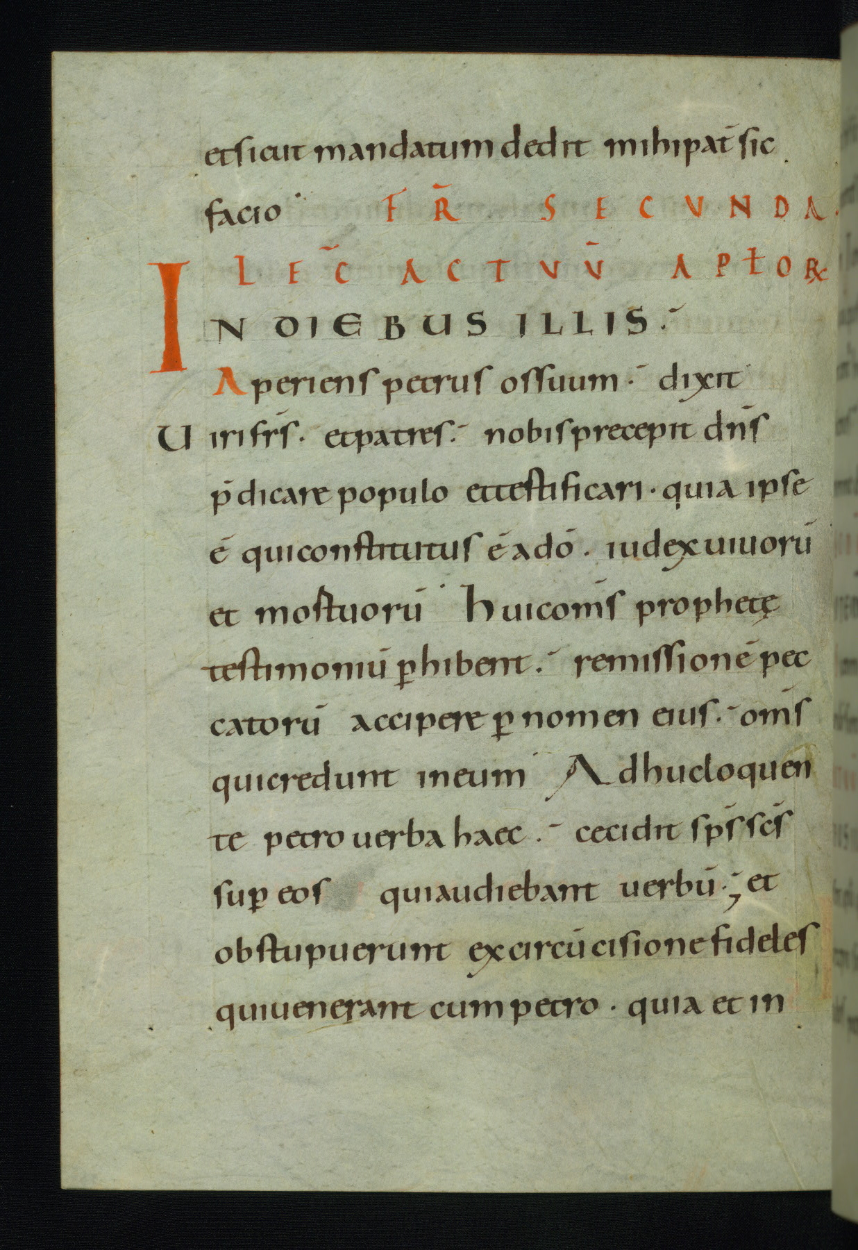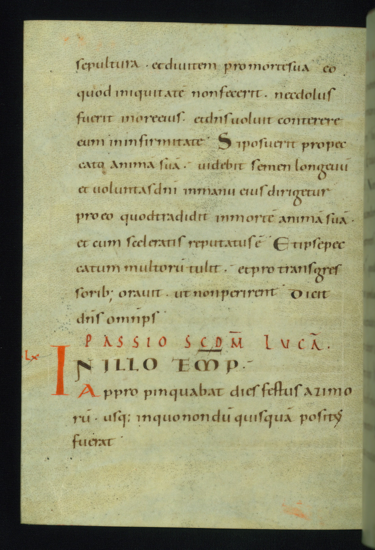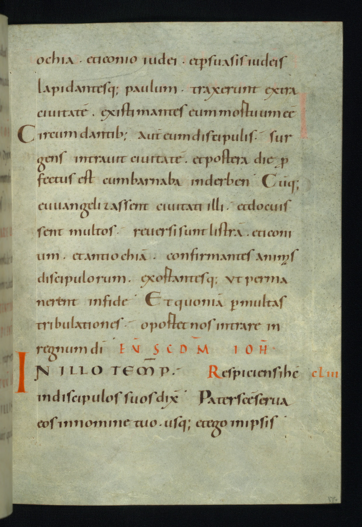 This Lectionary was created ca. 1000 in Trier. Written in a clear Caroline minuscule, it contains decorated initials at the openings of important readings. A set of illuminated letters marks the beginning of the Epistle and Gospel lessons for Easter; they display the hierarchy of scripts with capital letters decorated with gold leaf or drawn in red ink, followed by uncial and Caroline minuscule. Initials in orange, sometimes filled with gold, mark the divisions of the text. The book has been stylistically compared with Ottonian manuscripts, especially with a Psalter preserved in Trier (Stadtbibliothek, Ms. 7) illuminated by the so-called Master of the Registrum Gregorii.