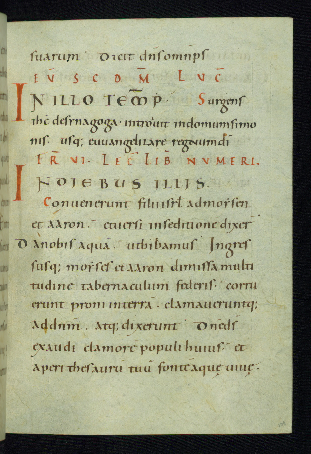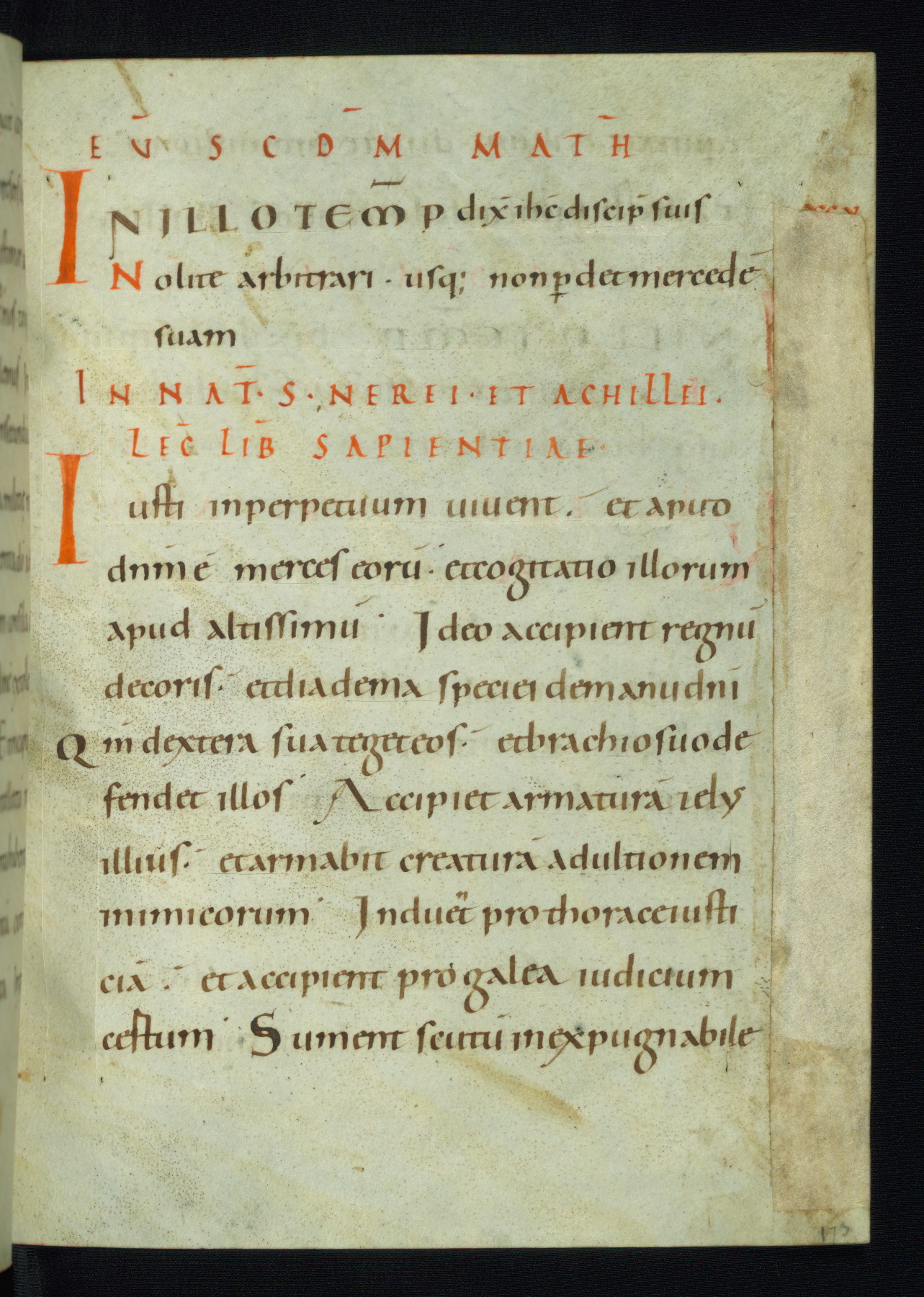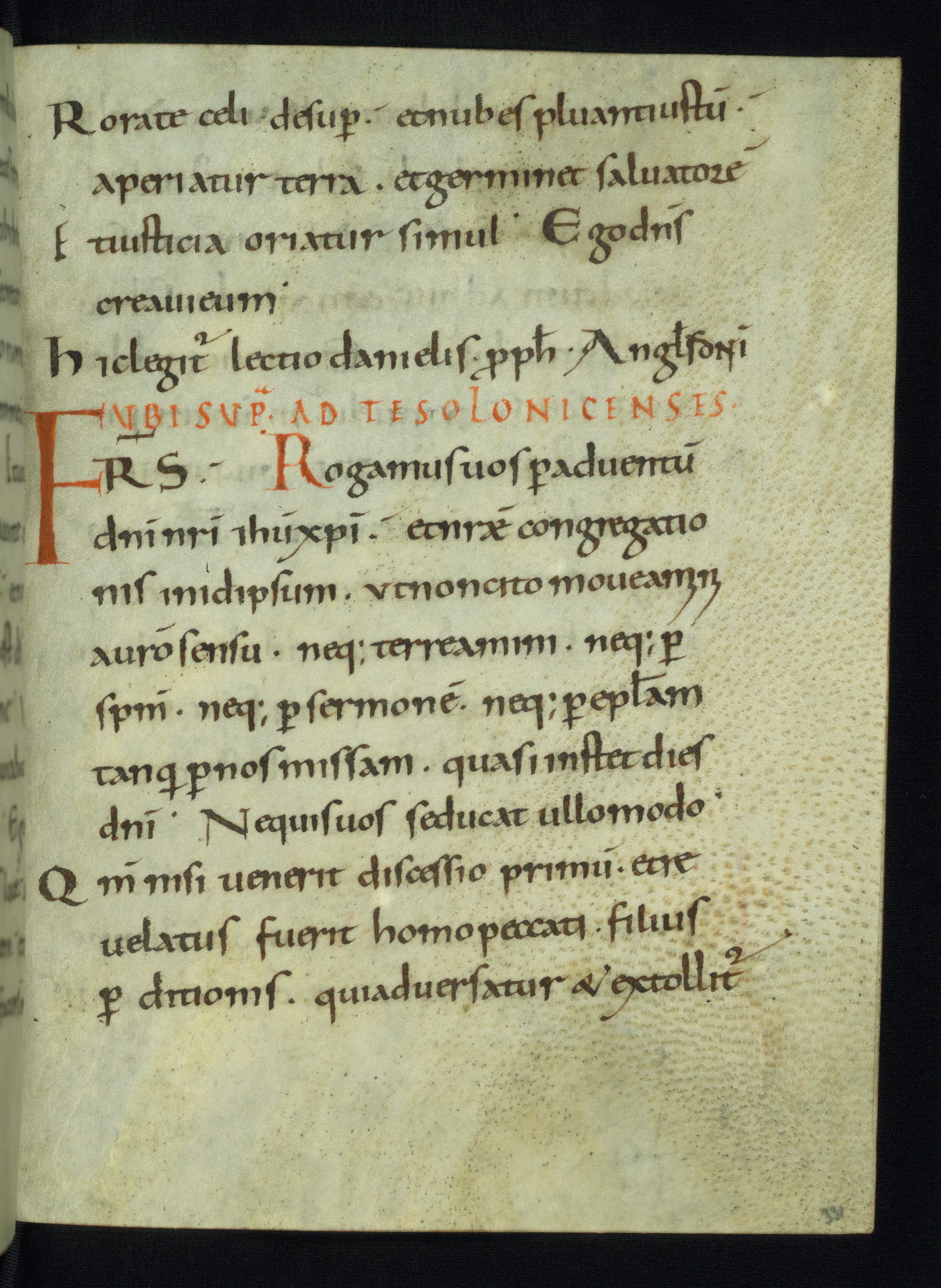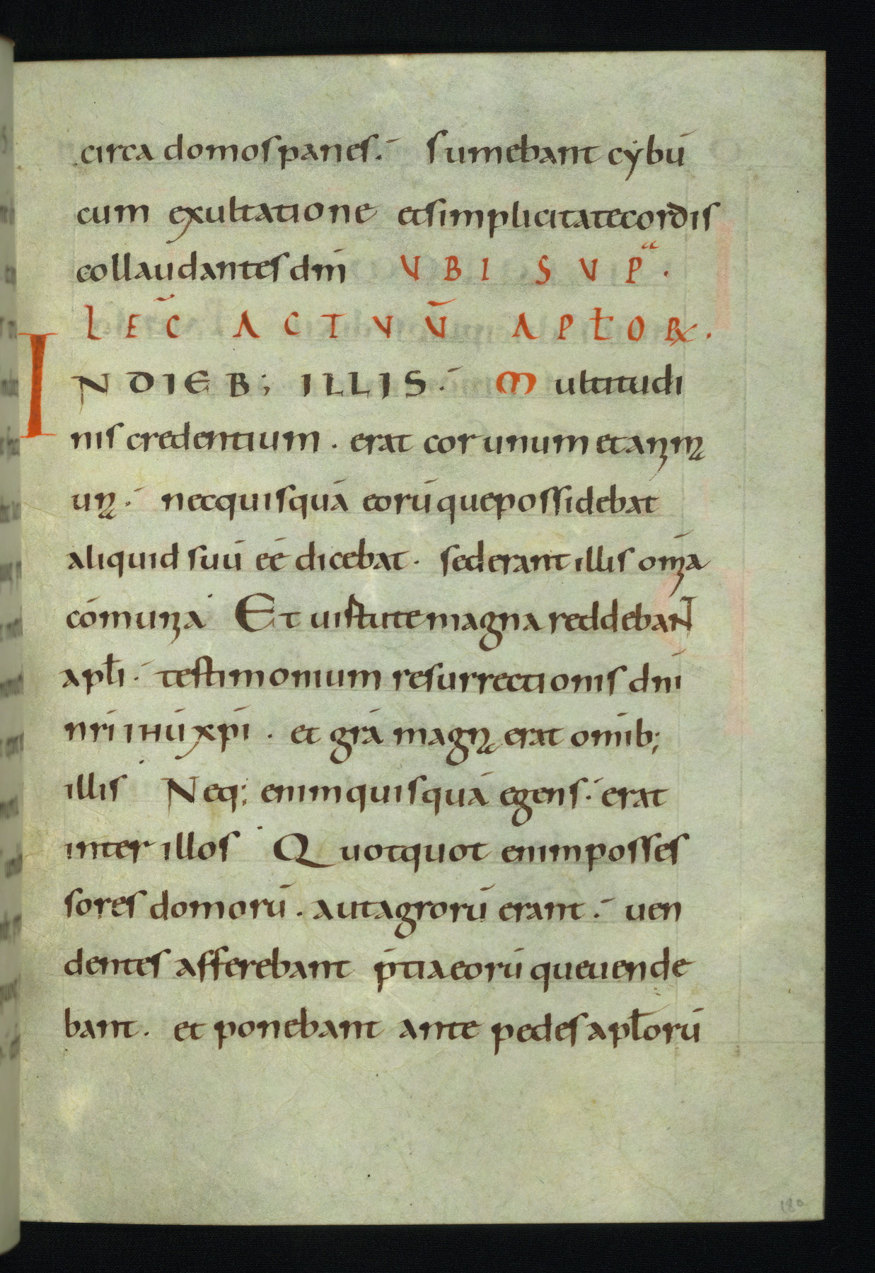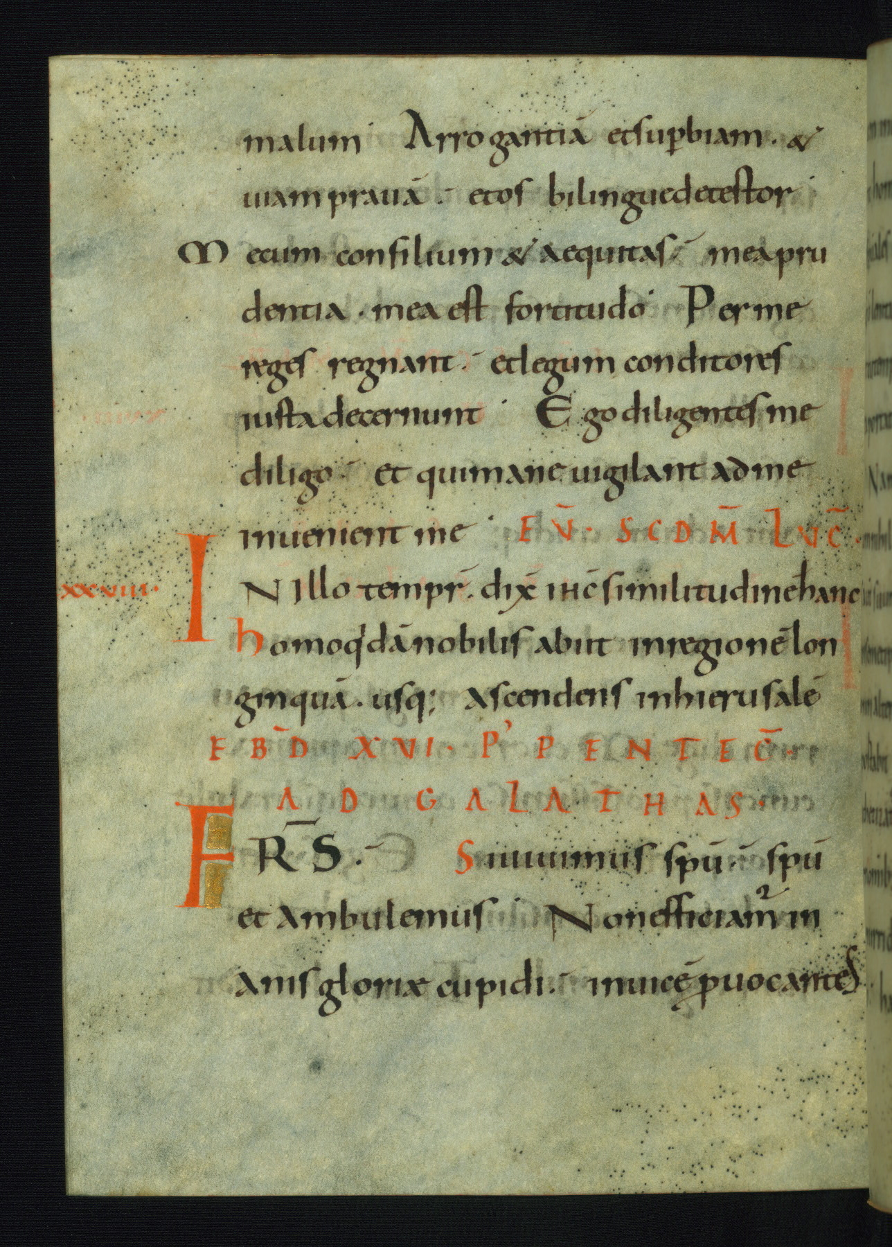 This Lectionary was created ca. 1000 in Trier. Written in a clear Caroline minuscule, it contains decorated initials at the openings of important readings. A set of illuminated letters marks the beginning of the Epistle and Gospel lessons for Easter; they display the hierarchy of scripts with capital letters decorated with gold leaf or drawn in red ink, followed by uncial and Caroline minuscule. Initials in orange, sometimes filled with gold, mark the divisions of the text. The book has been stylistically compared with Ottonian manuscripts, especially with a Psalter preserved in Trier (Stadtbibliothek, Ms. 7) illuminated by the so-called Master of the Registrum Gregorii.