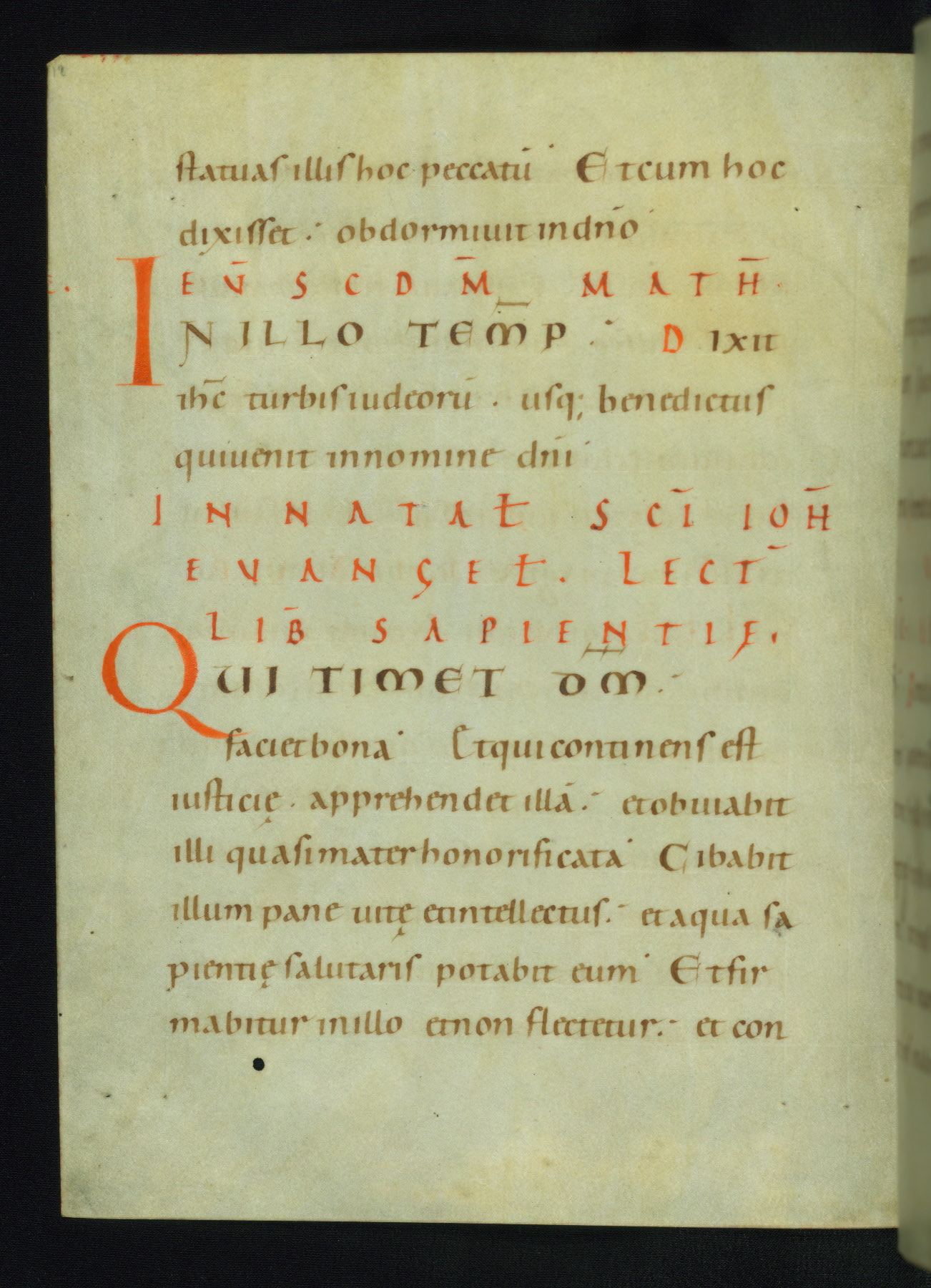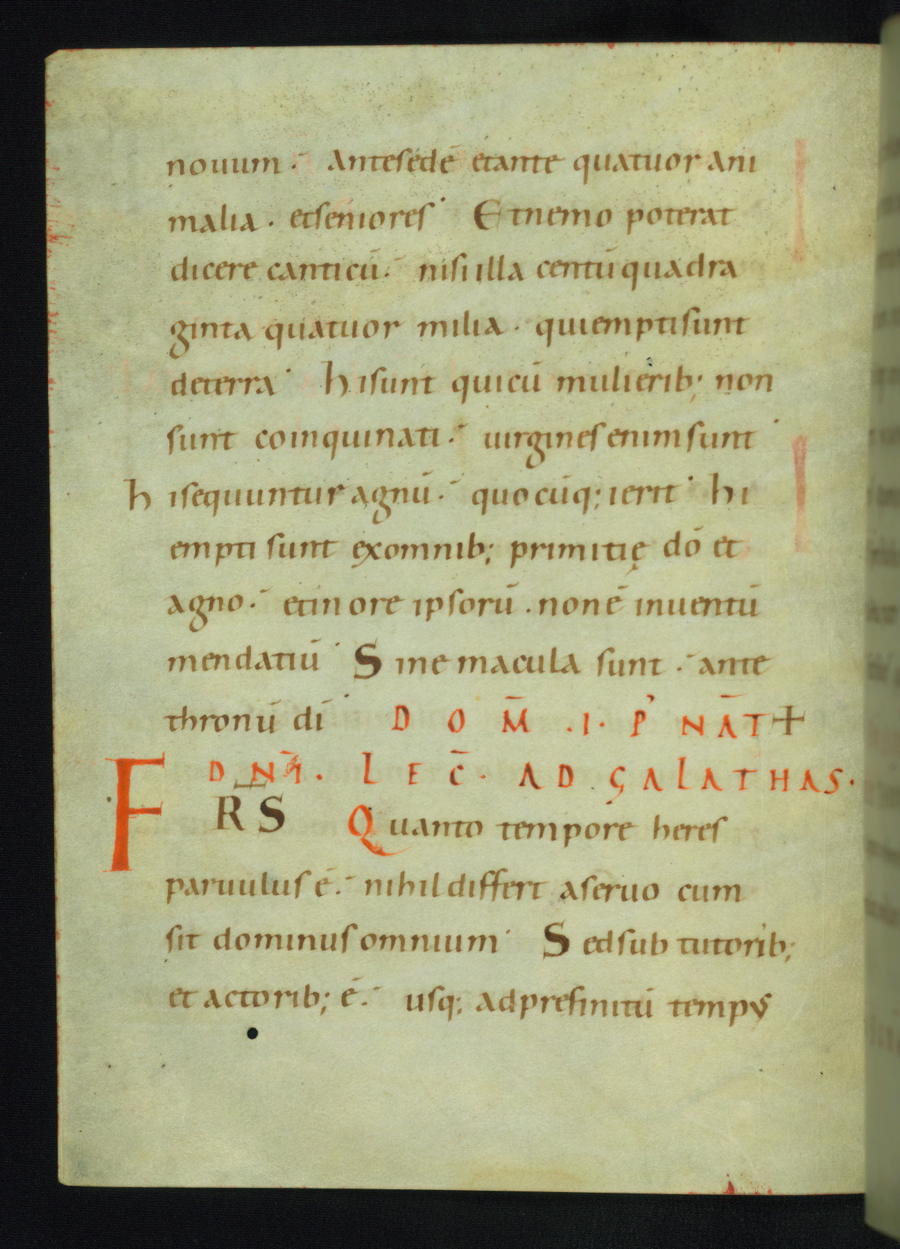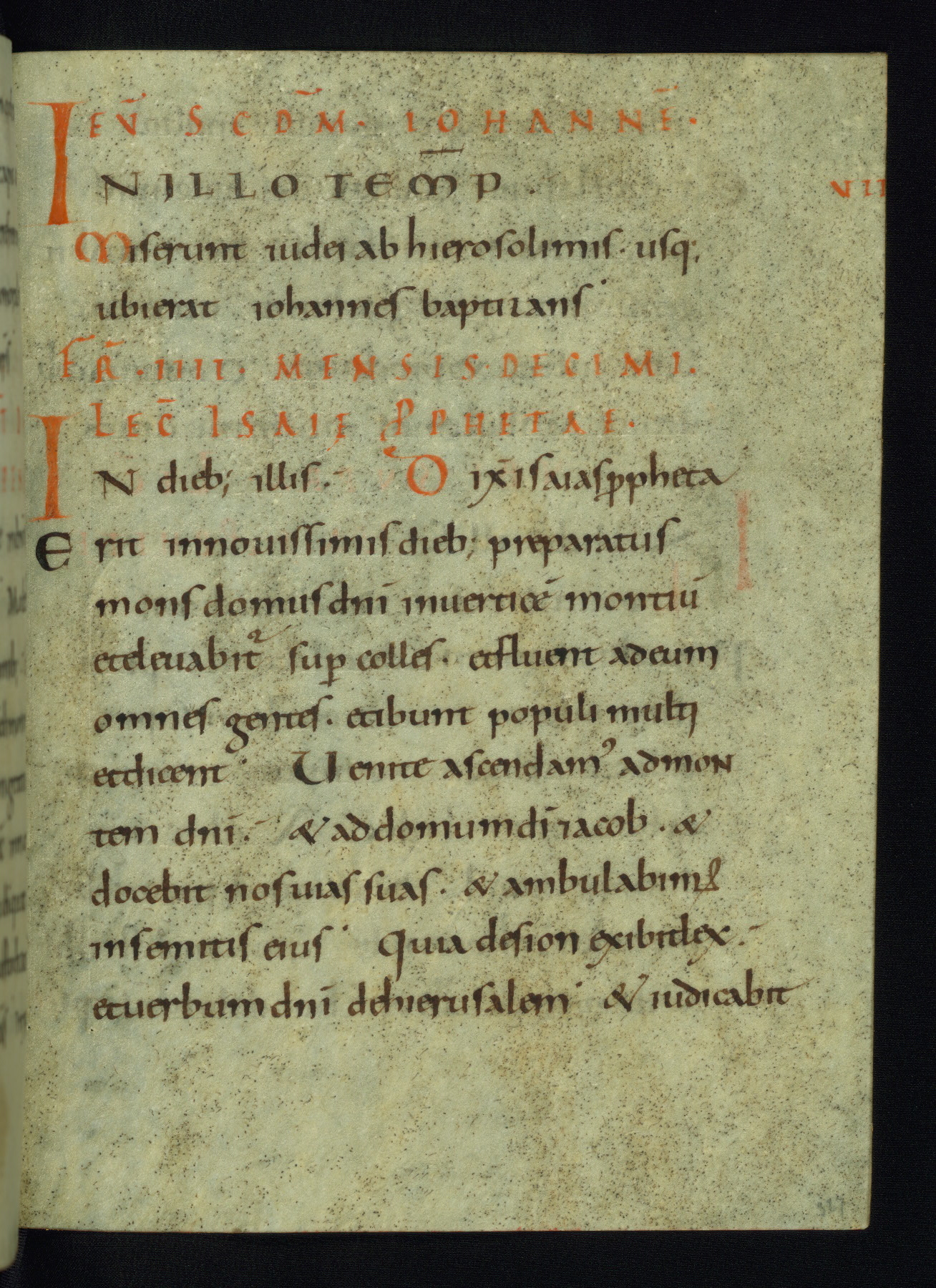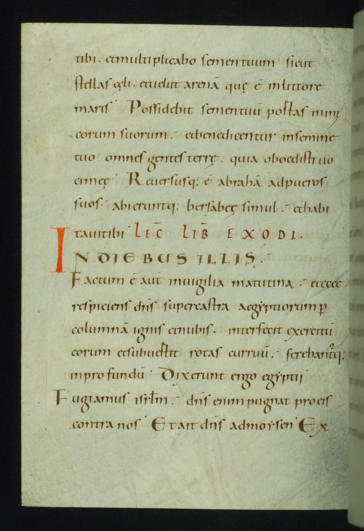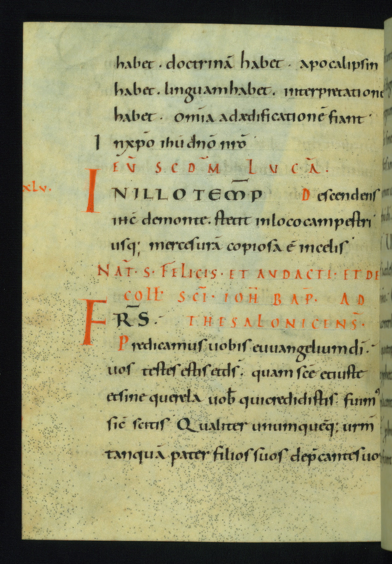This Lectionary was created ca. 1000 in Trier. Written in a clear Caroline minuscule, it contains decorated initials at the openings of important readings. A set of illuminated letters marks the beginning of the Epistle and Gospel lessons for Easter; they display the hierarchy of scripts with capital letters decorated with gold leaf or drawn in red ink, followed by uncial and Caroline minuscule. Initials in orange, sometimes filled with gold, mark the divisions of the text. The book has been stylistically compared with Ottonian manuscripts, especially with a Psalter preserved in Trier (Stadtbibliothek, Ms. 7) illuminated by the so-called Master of the Registrum Gregorii.