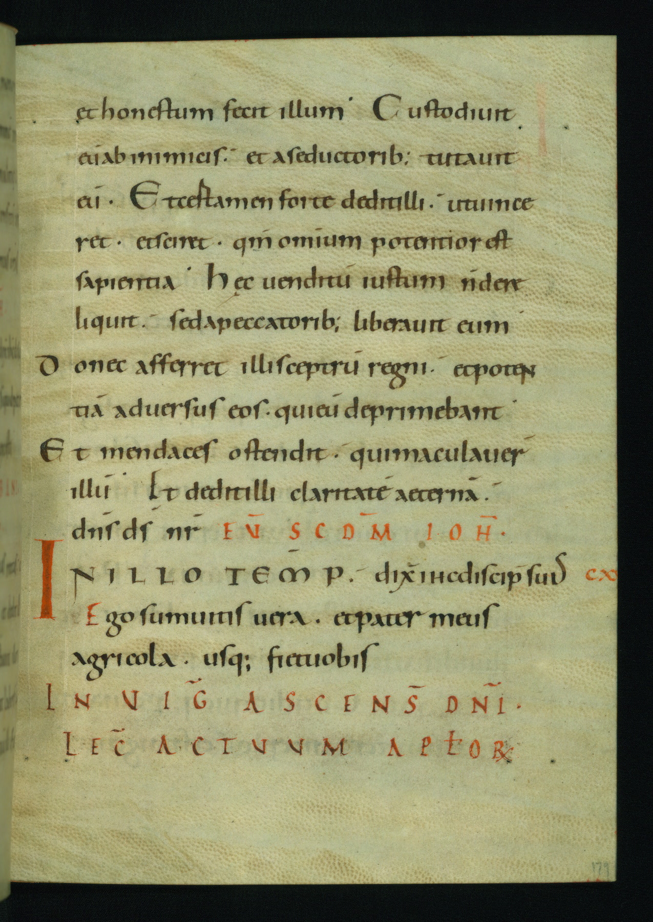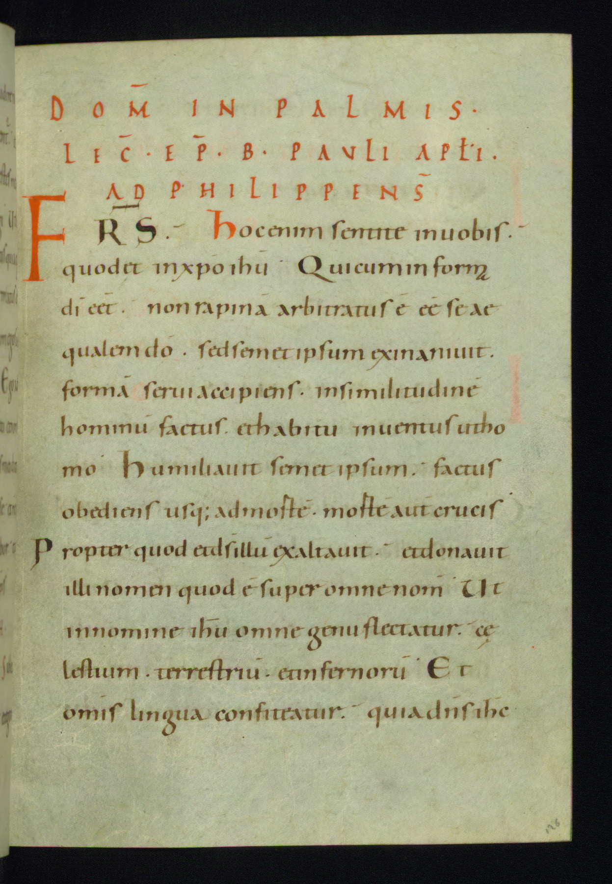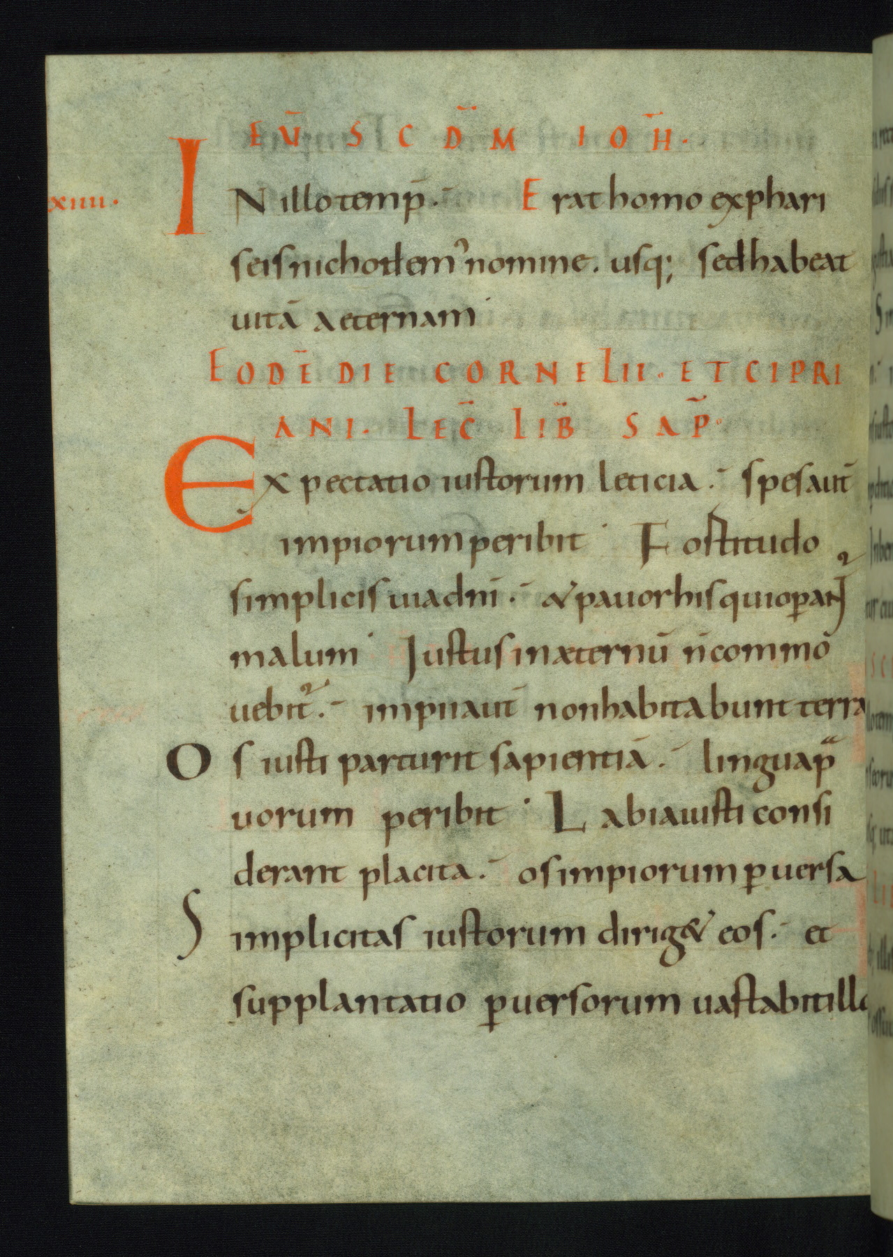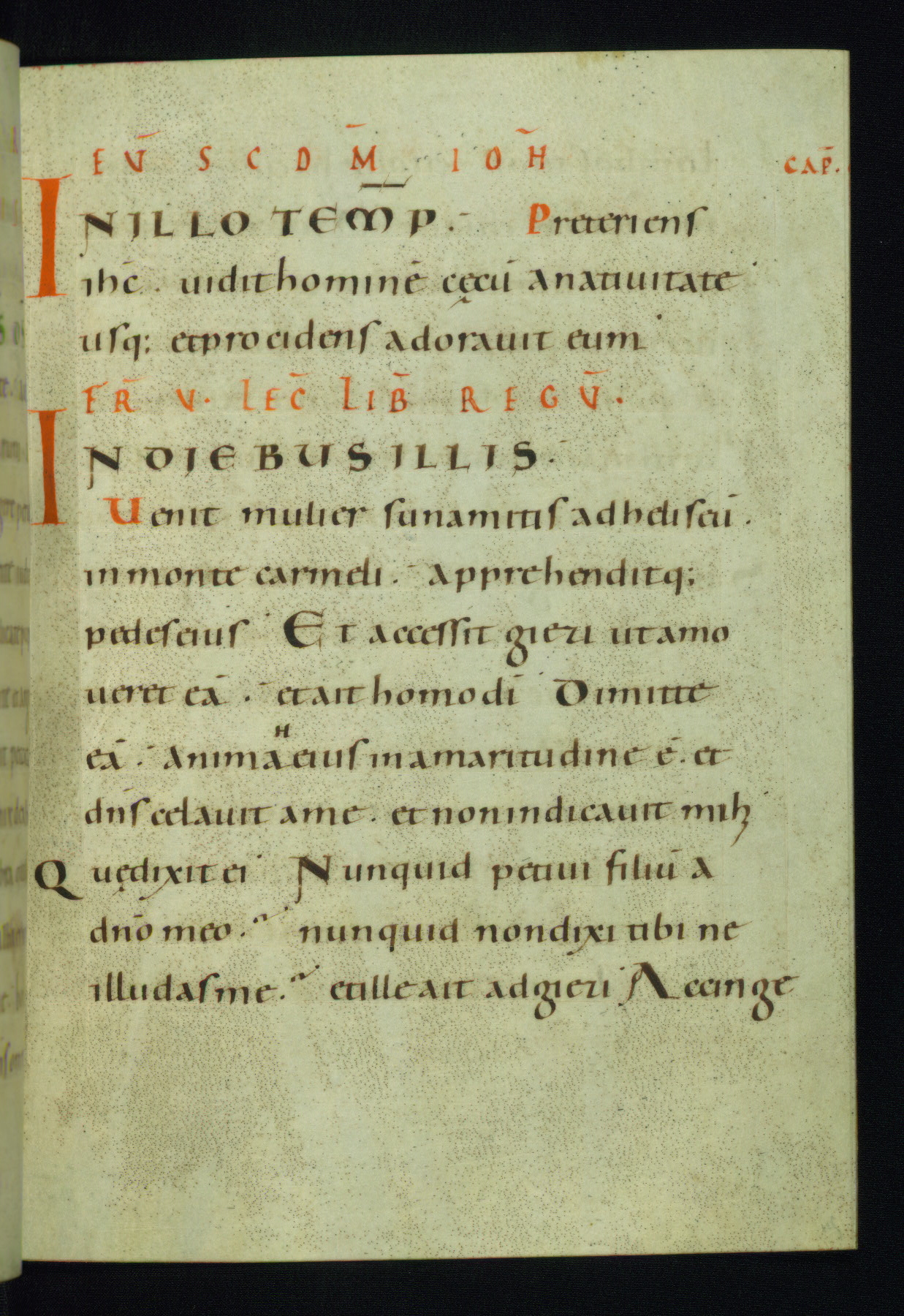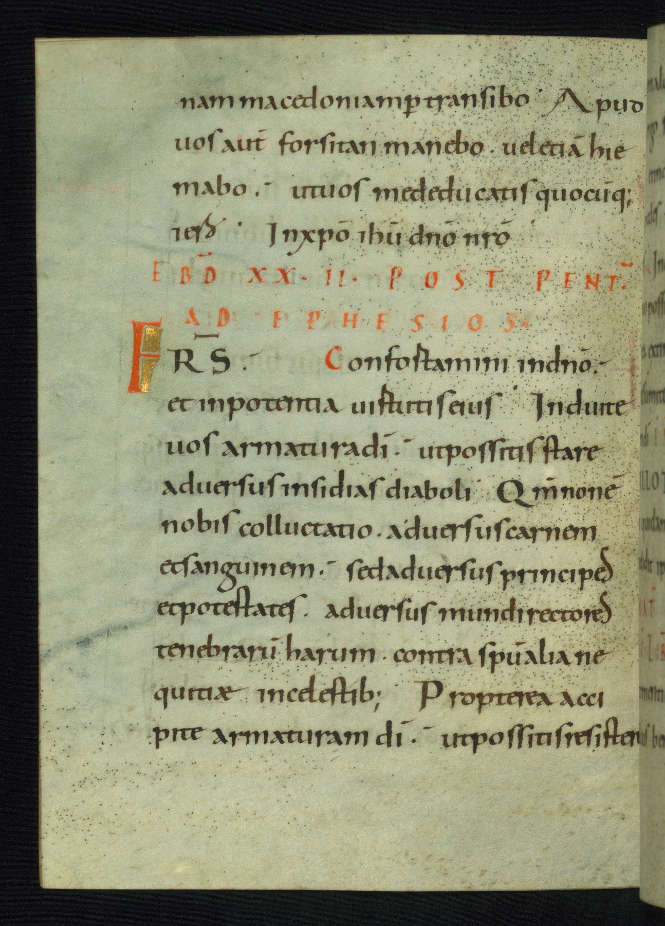 This Lectionary was created ca. 1000 in Trier. Written in a clear Caroline minuscule, it contains decorated initials at the openings of important readings. A set of illuminated letters marks the beginning of the Epistle and Gospel lessons for Easter; they display the hierarchy of scripts with capital letters decorated with gold leaf or drawn in red ink, followed by uncial and Caroline minuscule. Initials in orange, sometimes filled with gold, mark the divisions of the text. The book has been stylistically compared with Ottonian manuscripts, especially with a Psalter preserved in Trier (Stadtbibliothek, Ms. 7) illuminated by the so-called Master of the Registrum Gregorii.