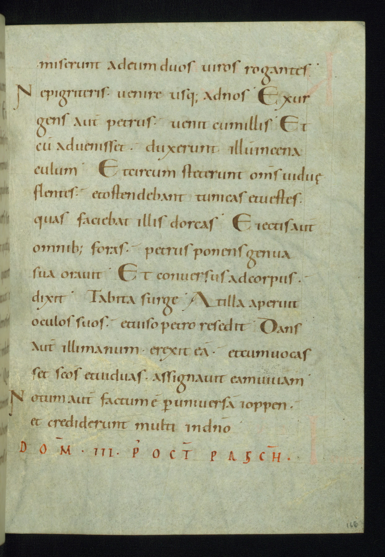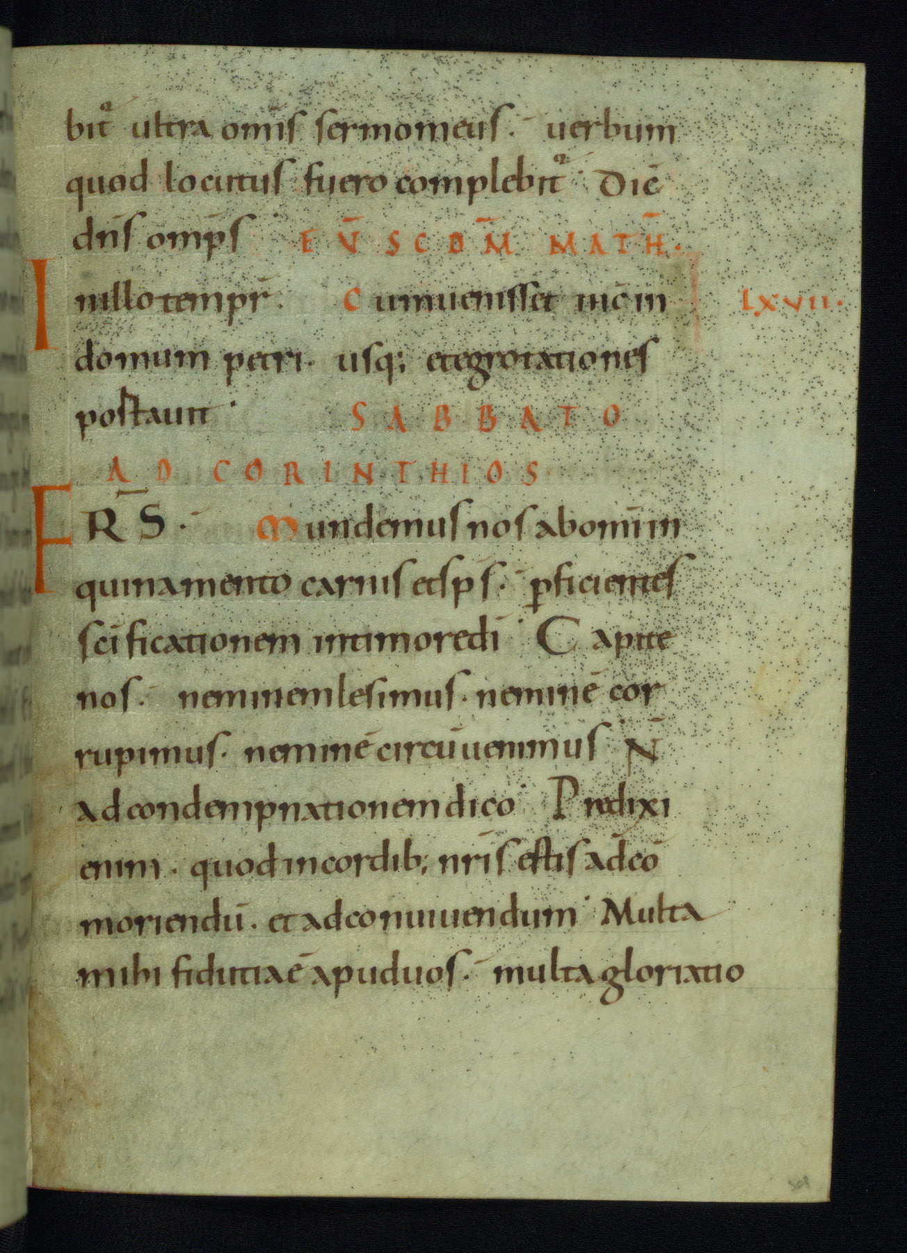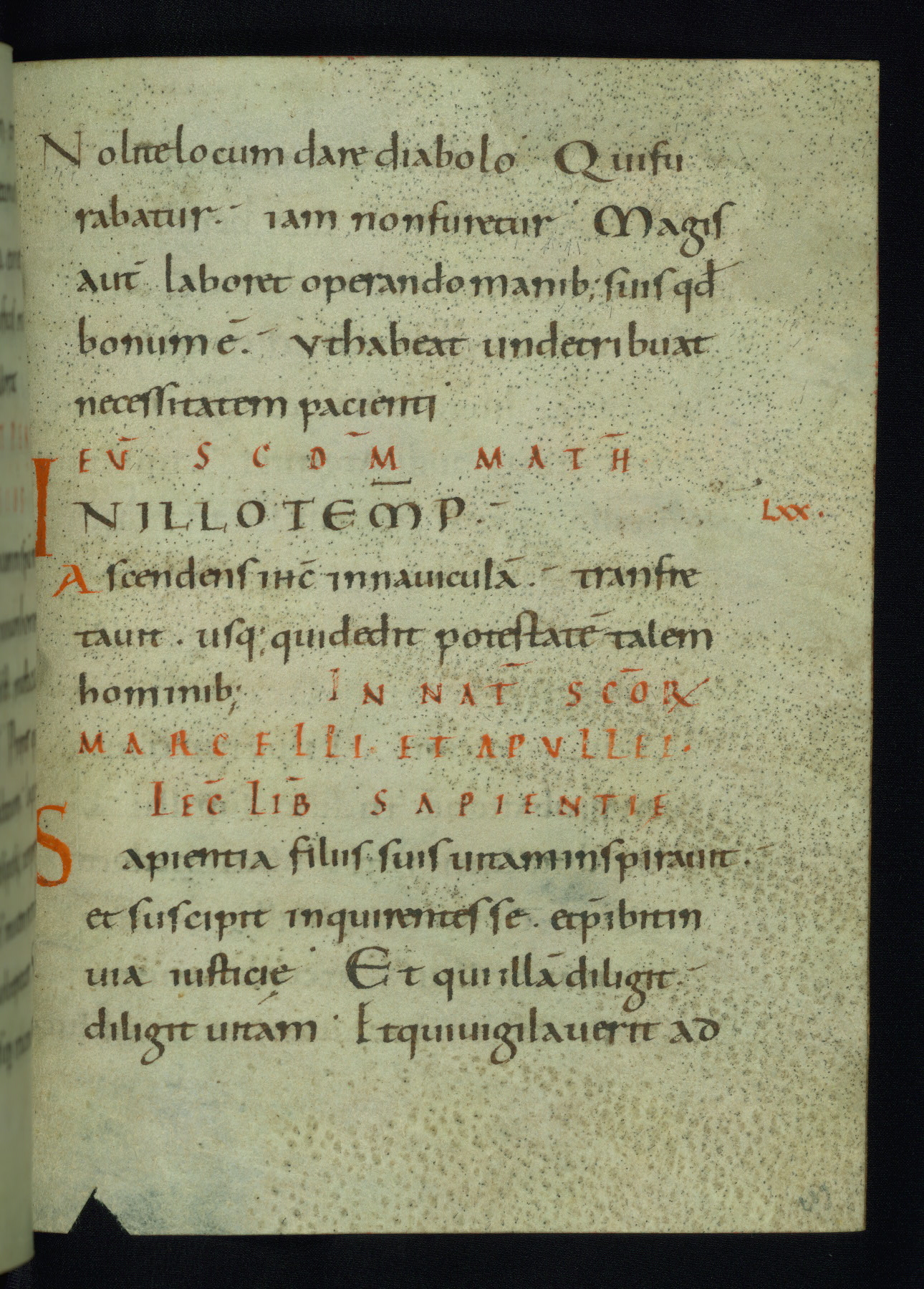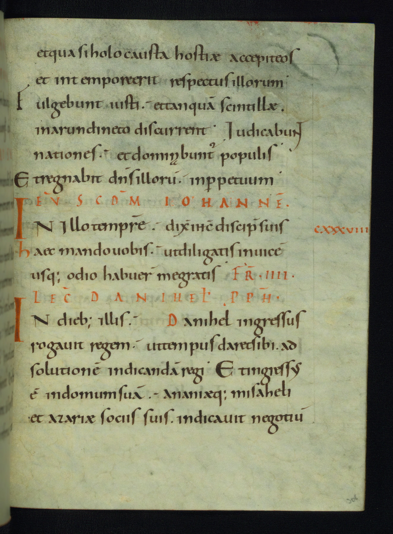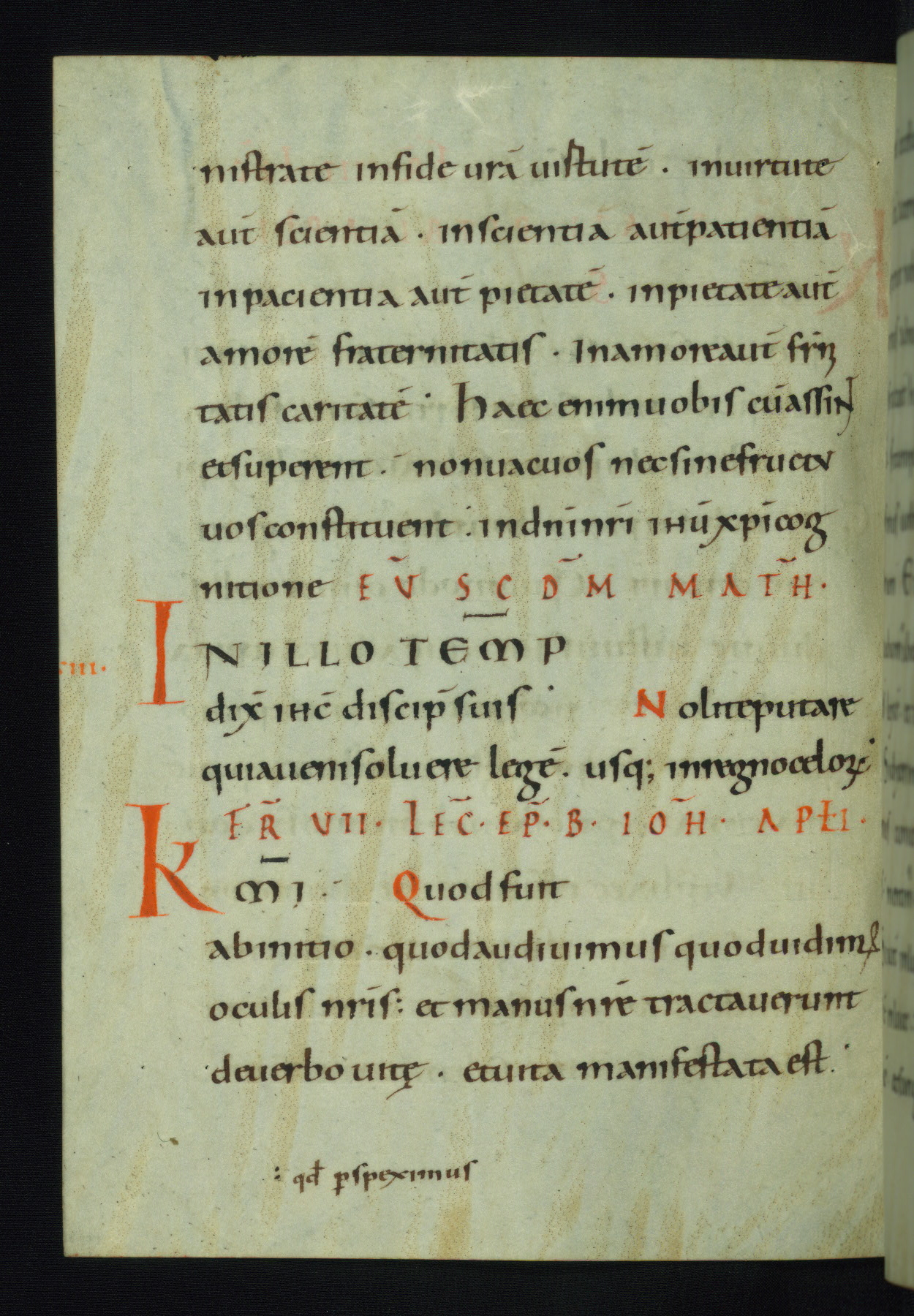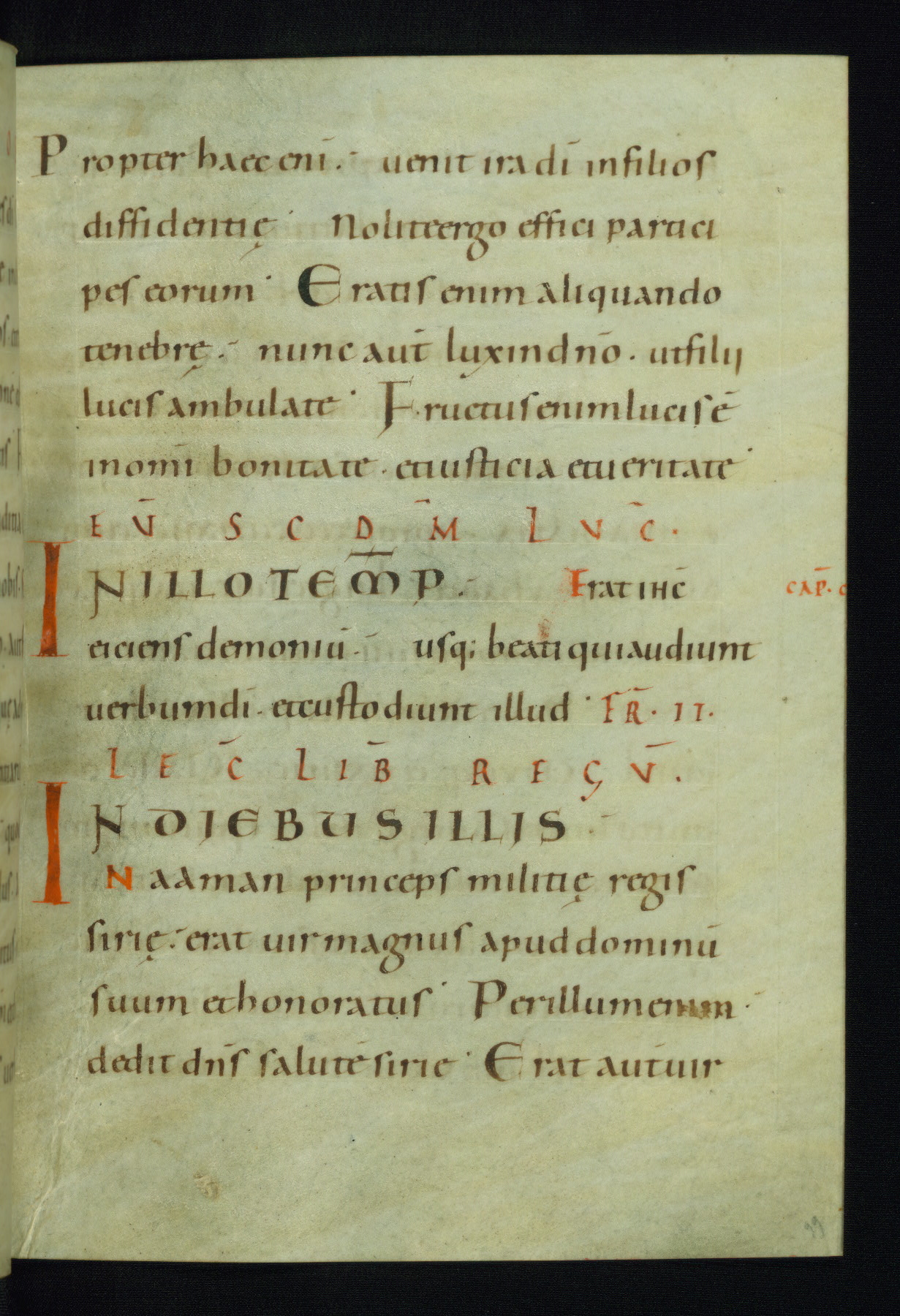 This Lectionary was created ca. 1000 in Trier. Written in a clear Caroline minuscule, it contains decorated initials at the openings of important readings. A set of illuminated letters marks the beginning of the Epistle and Gospel lessons for Easter; they display the hierarchy of scripts with capital letters decorated with gold leaf or drawn in red ink, followed by uncial and Caroline minuscule. Initials in orange, sometimes filled with gold, mark the divisions of the text. The book has been stylistically compared with Ottonian manuscripts, especially with a Psalter preserved in Trier (Stadtbibliothek, Ms. 7) illuminated by the so-called Master of the Registrum Gregorii.
