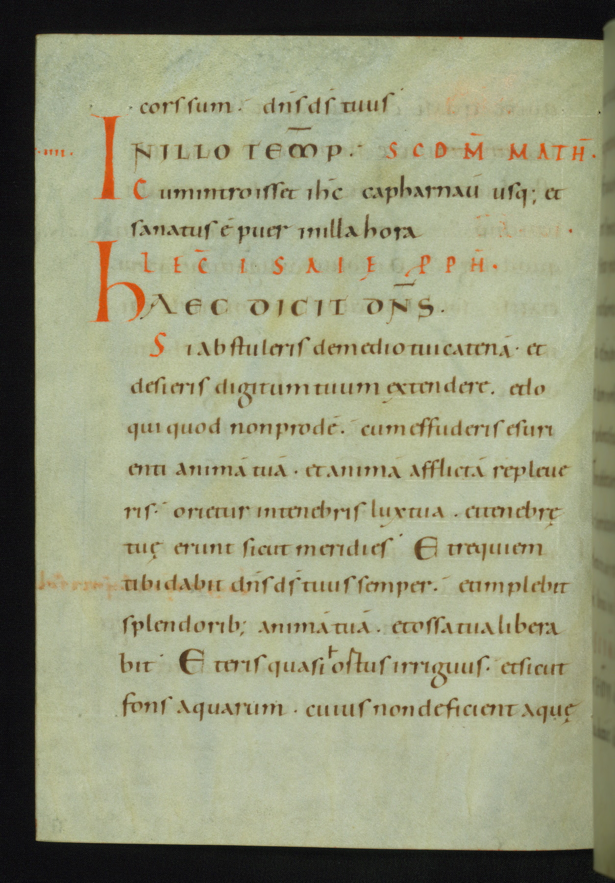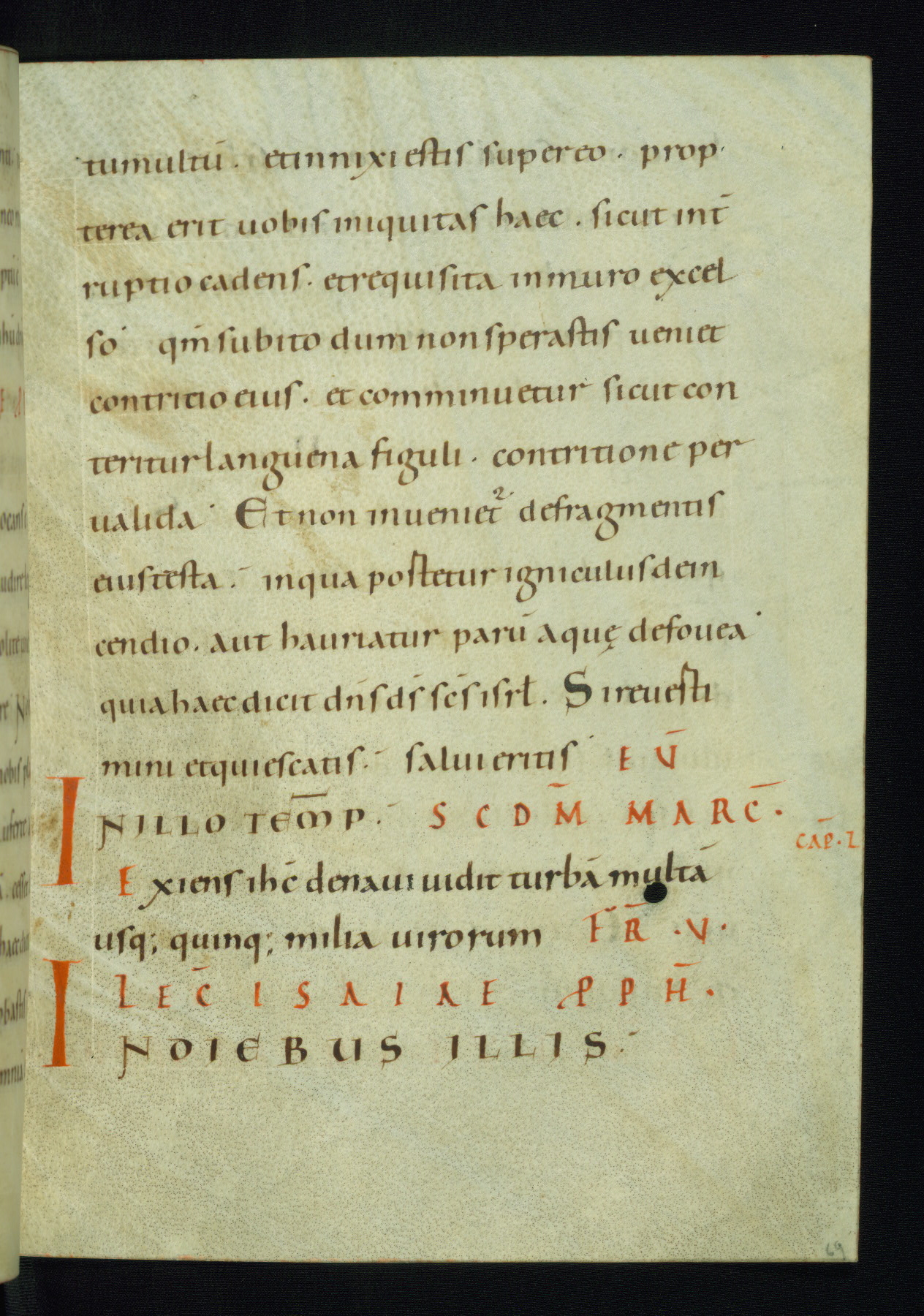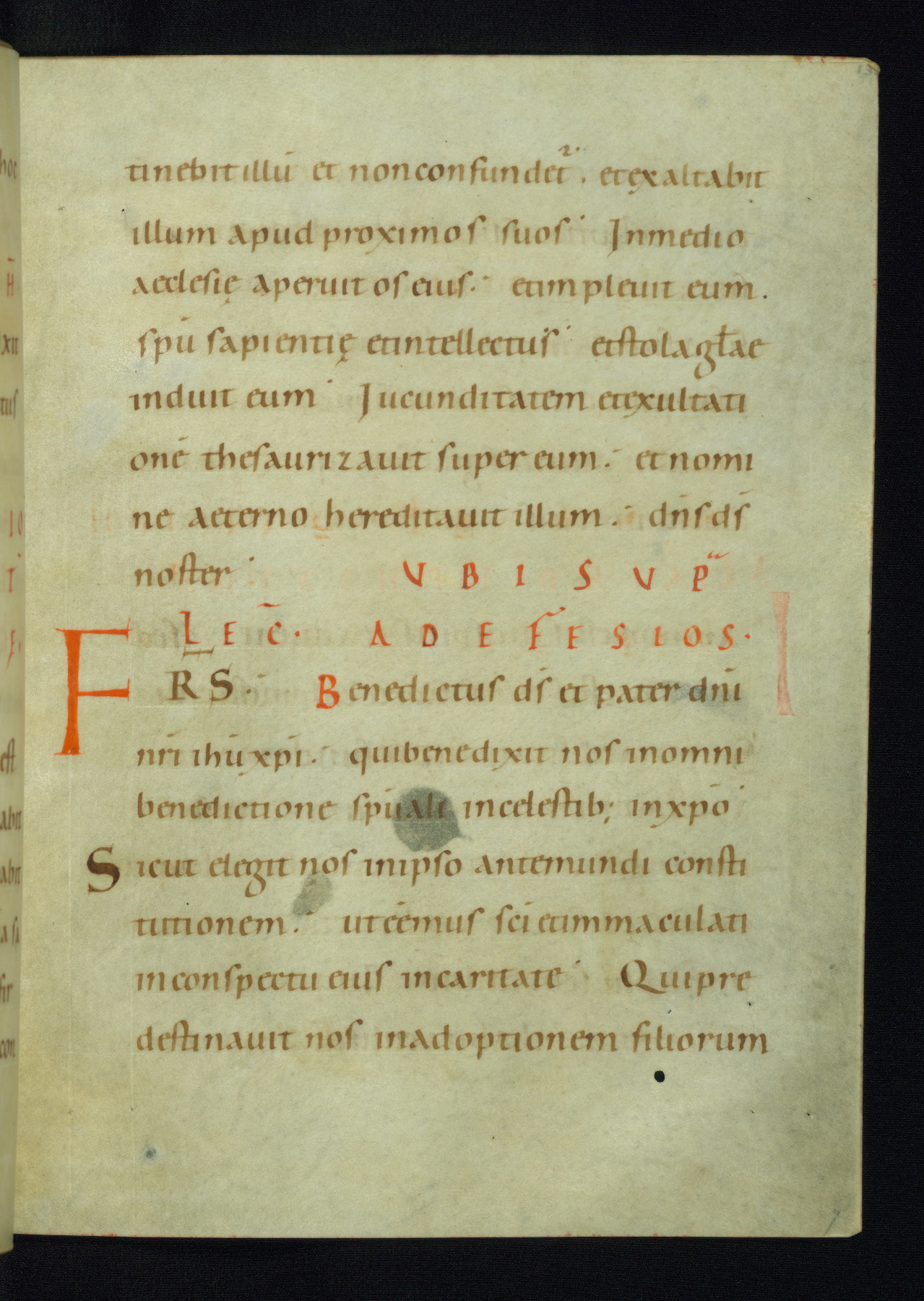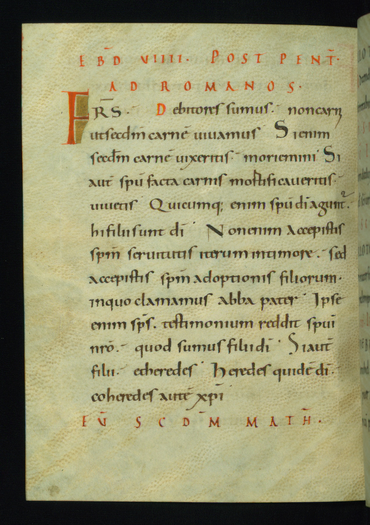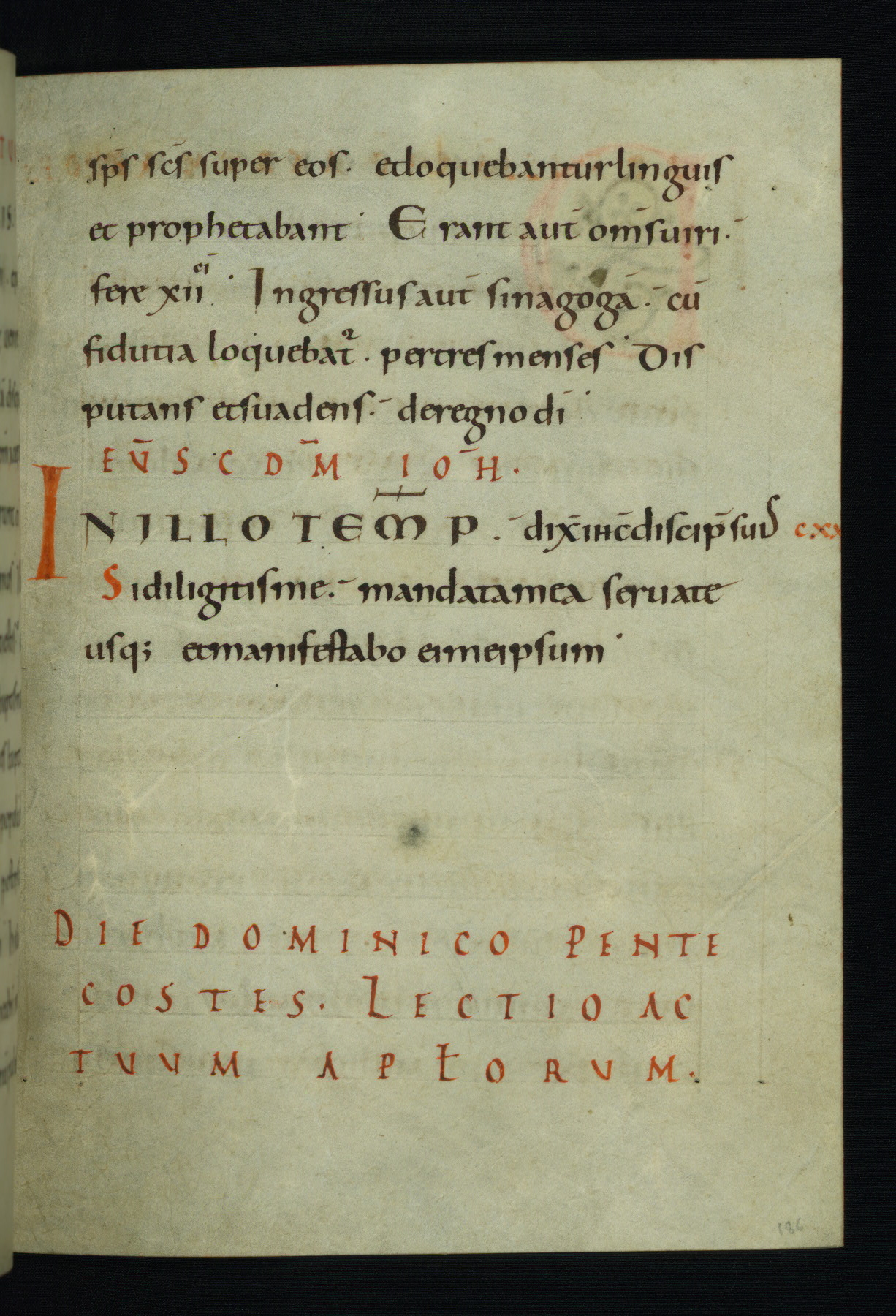 This Lectionary was created ca. 1000 in Trier. Written in a clear Caroline minuscule, it contains decorated initials at the openings of important readings. A set of illuminated letters marks the beginning of the Epistle and Gospel lessons for Easter; they display the hierarchy of scripts with capital letters decorated with gold leaf or drawn in red ink, followed by uncial and Caroline minuscule. Initials in orange, sometimes filled with gold, mark the divisions of the text. The book has been stylistically compared with Ottonian manuscripts, especially with a Psalter preserved in Trier (Stadtbibliothek, Ms. 7) illuminated by the so-called Master of the Registrum Gregorii.
