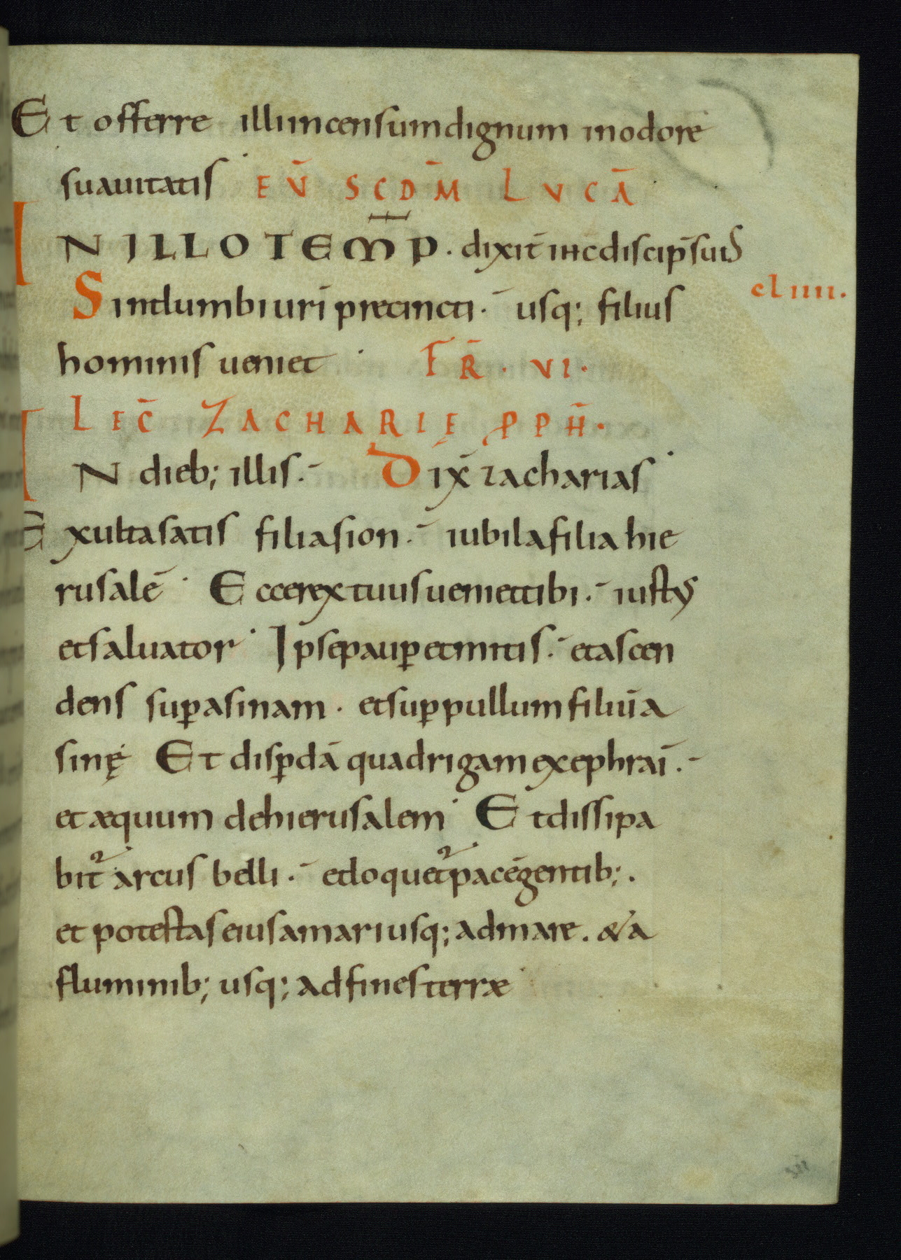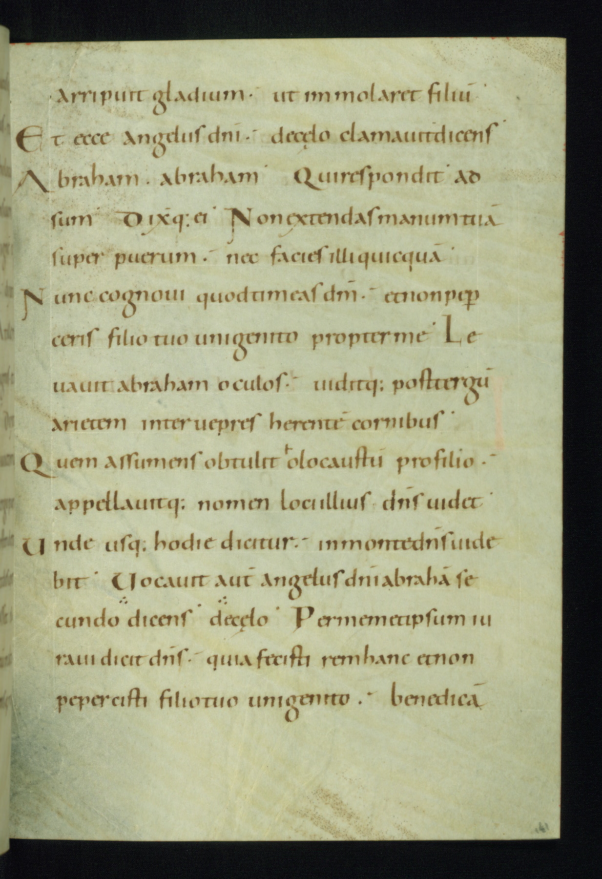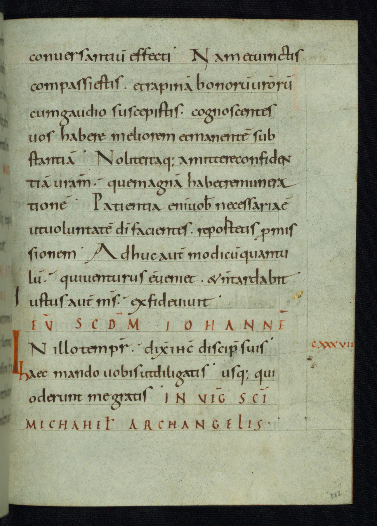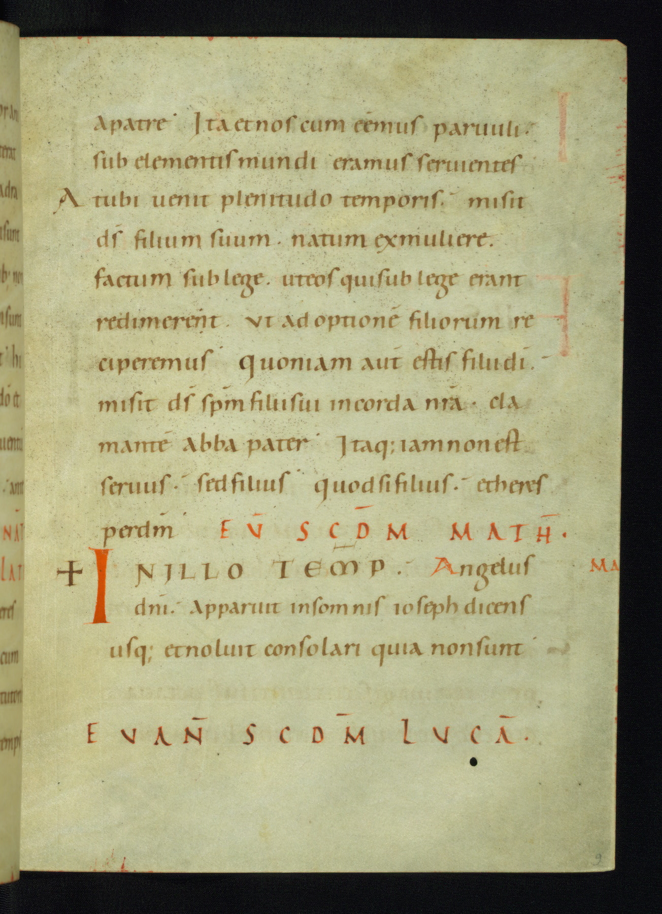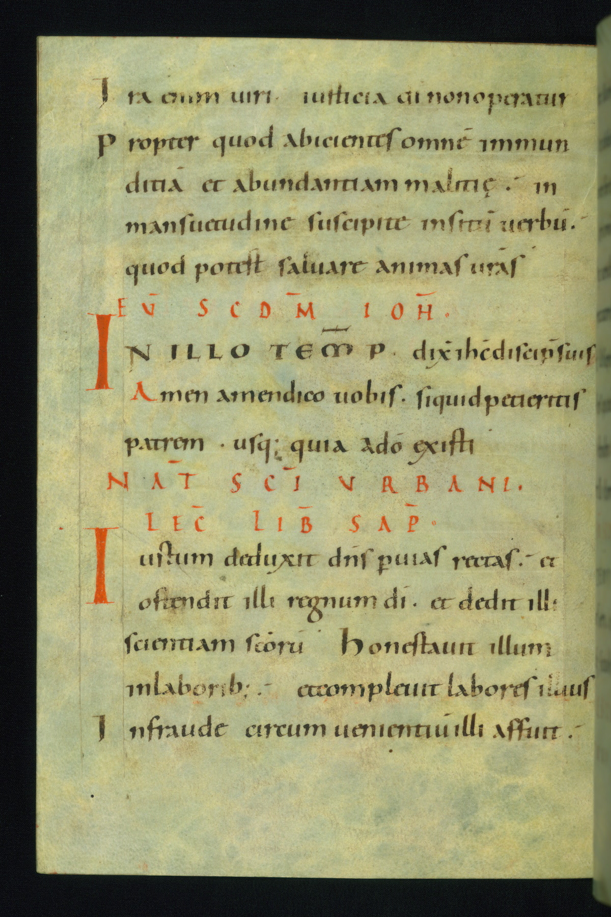 This Lectionary was created ca. 1000 in Trier. Written in a clear Caroline minuscule, it contains decorated initials at the openings of important readings. A set of illuminated letters marks the beginning of the Epistle and Gospel lessons for Easter; they display the hierarchy of scripts with capital letters decorated with gold leaf or drawn in red ink, followed by uncial and Caroline minuscule. Initials in orange, sometimes filled with gold, mark the divisions of the text. The book has been stylistically compared with Ottonian manuscripts, especially with a Psalter preserved in Trier (Stadtbibliothek, Ms. 7) illuminated by the so-called Master of the Registrum Gregorii.