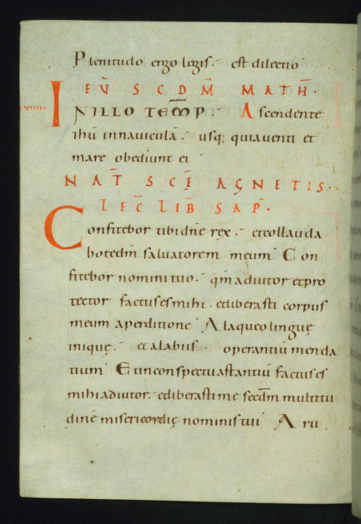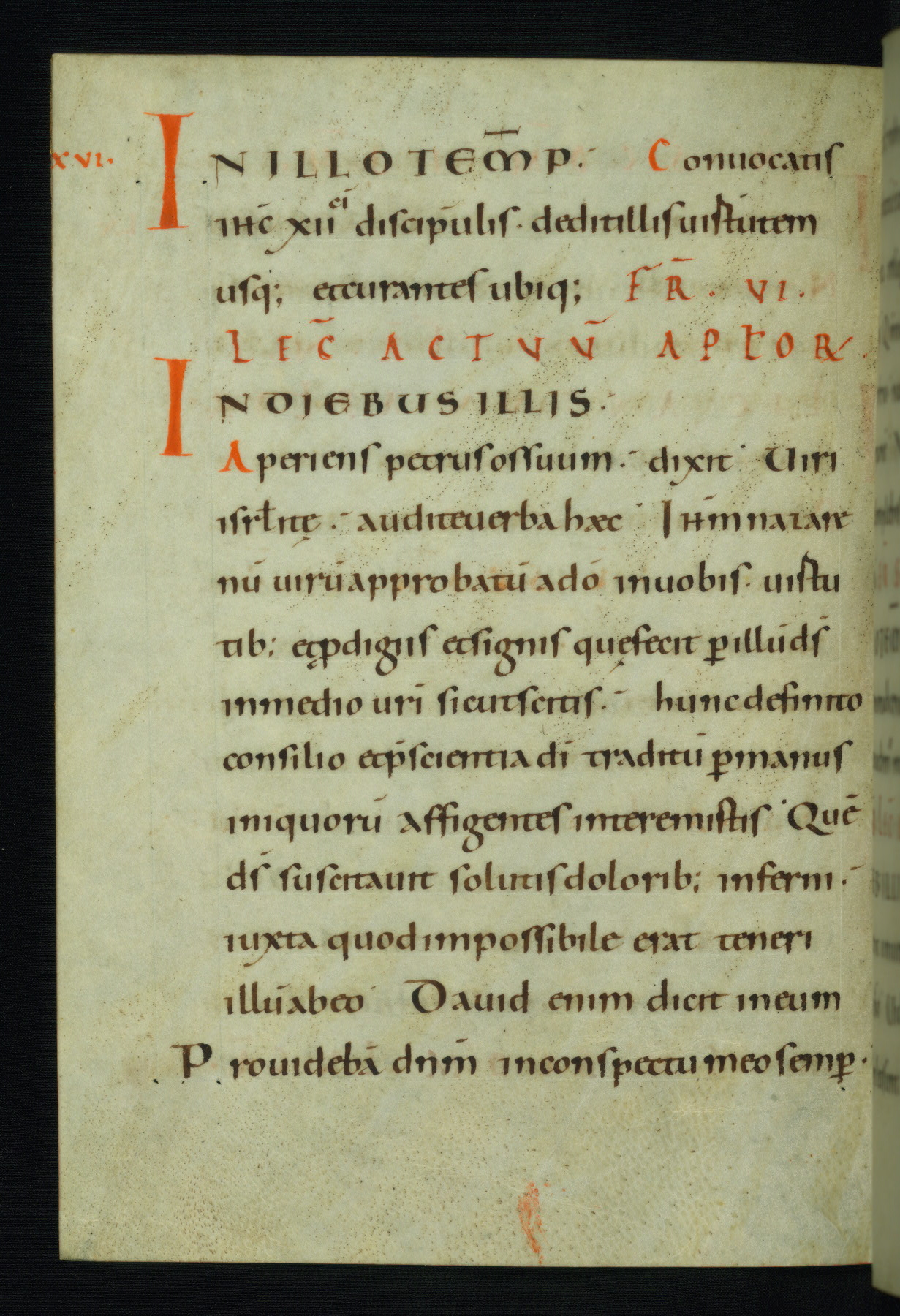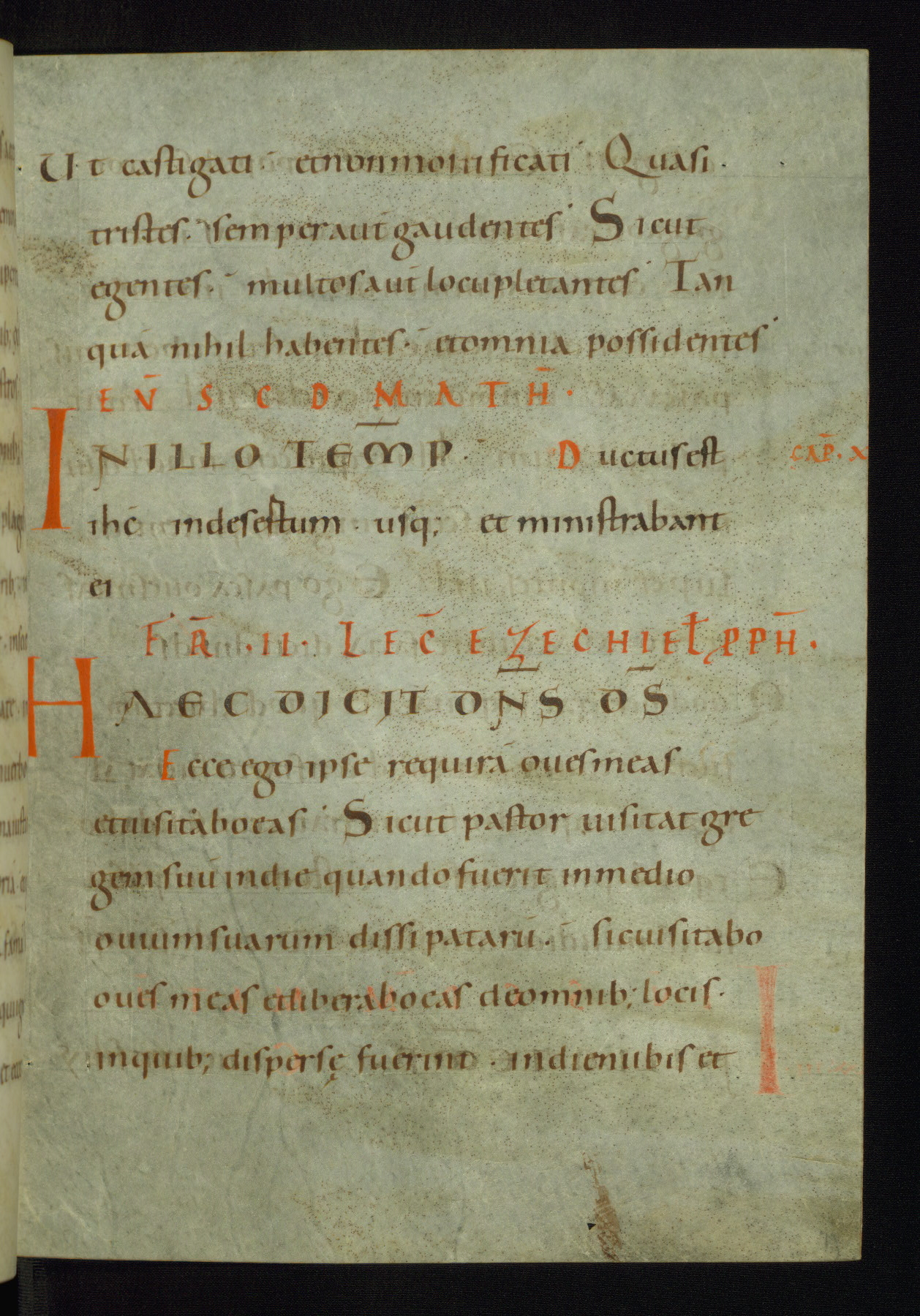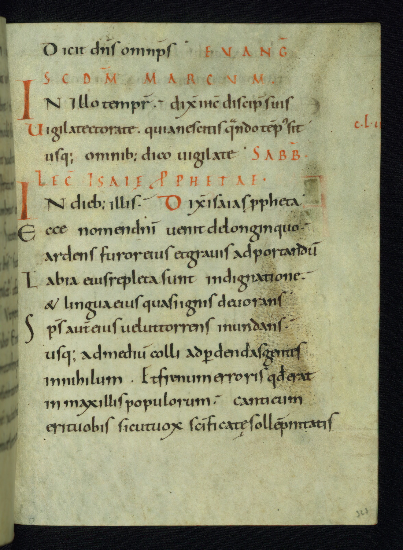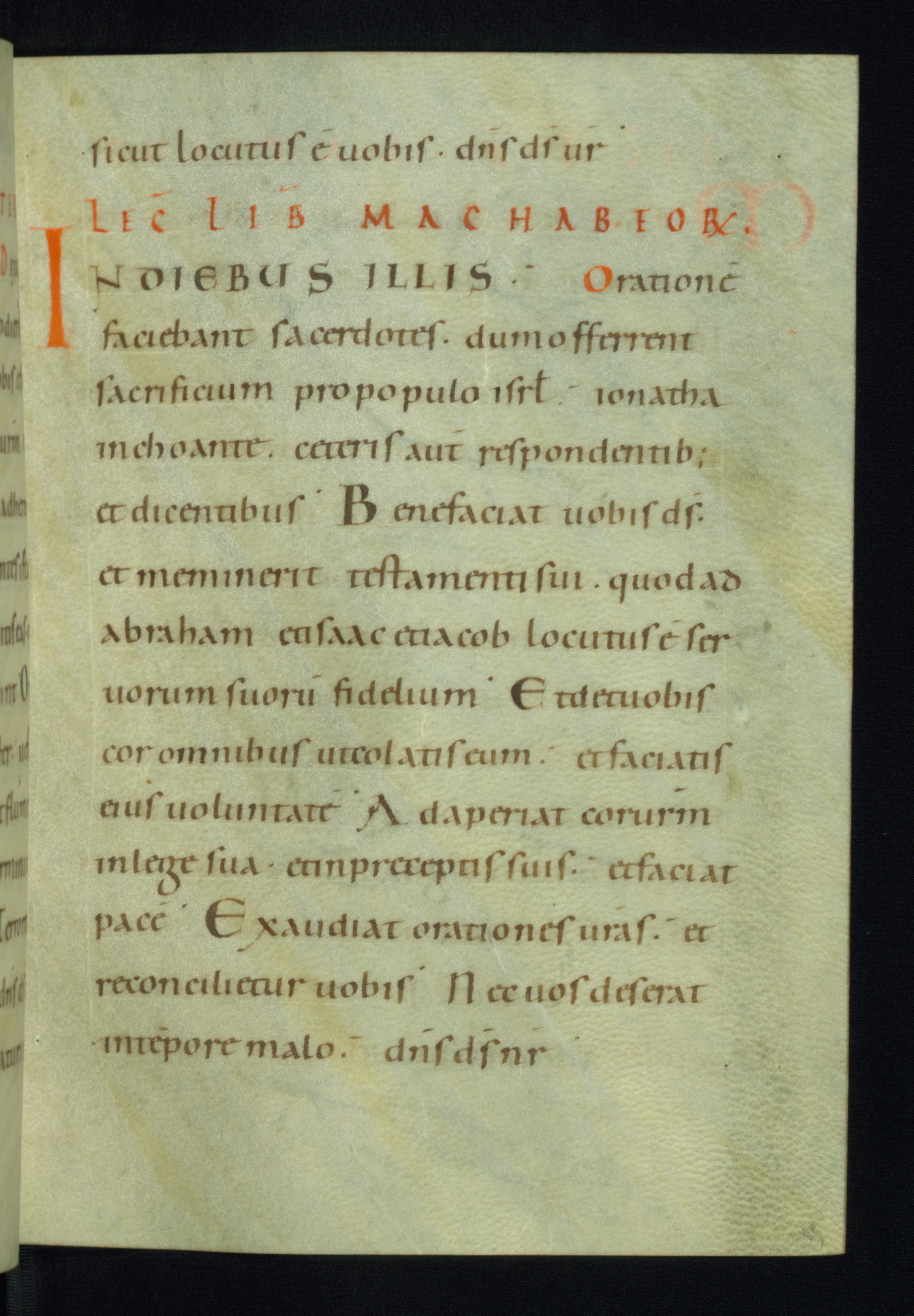 This Lectionary was created ca. 1000 in Trier. Written in a clear Caroline minuscule, it contains decorated initials at the openings of important readings. A set of illuminated letters marks the beginning of the Epistle and Gospel lessons for Easter; they display the hierarchy of scripts with capital letters decorated with gold leaf or drawn in red ink, followed by uncial and Caroline minuscule. Initials in orange, sometimes filled with gold, mark the divisions of the text. The book has been stylistically compared with Ottonian manuscripts, especially with a Psalter preserved in Trier (Stadtbibliothek, Ms. 7) illuminated by the so-called Master of the Registrum Gregorii.
