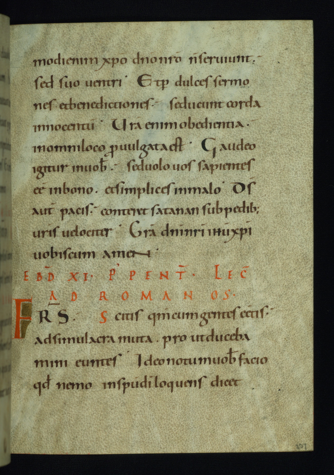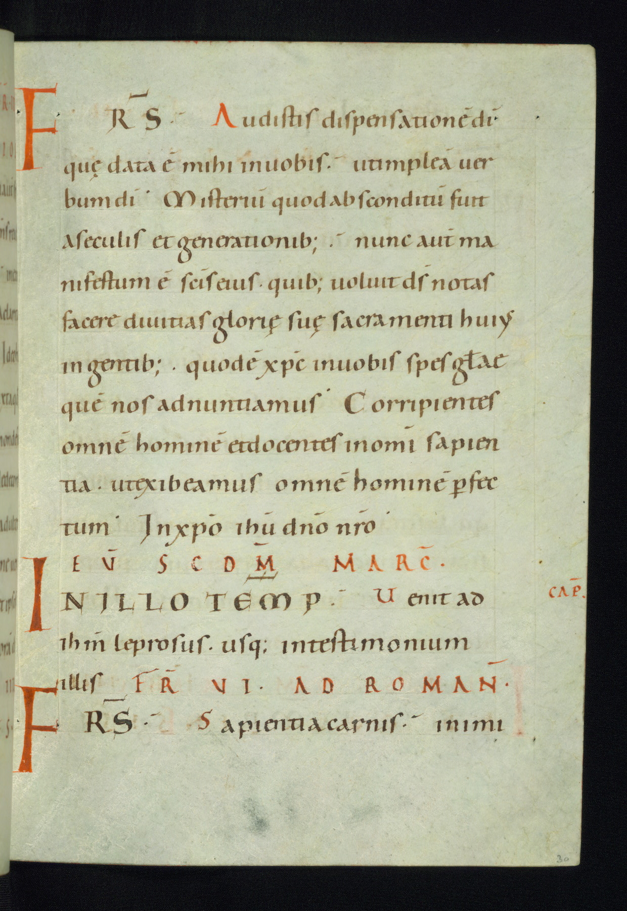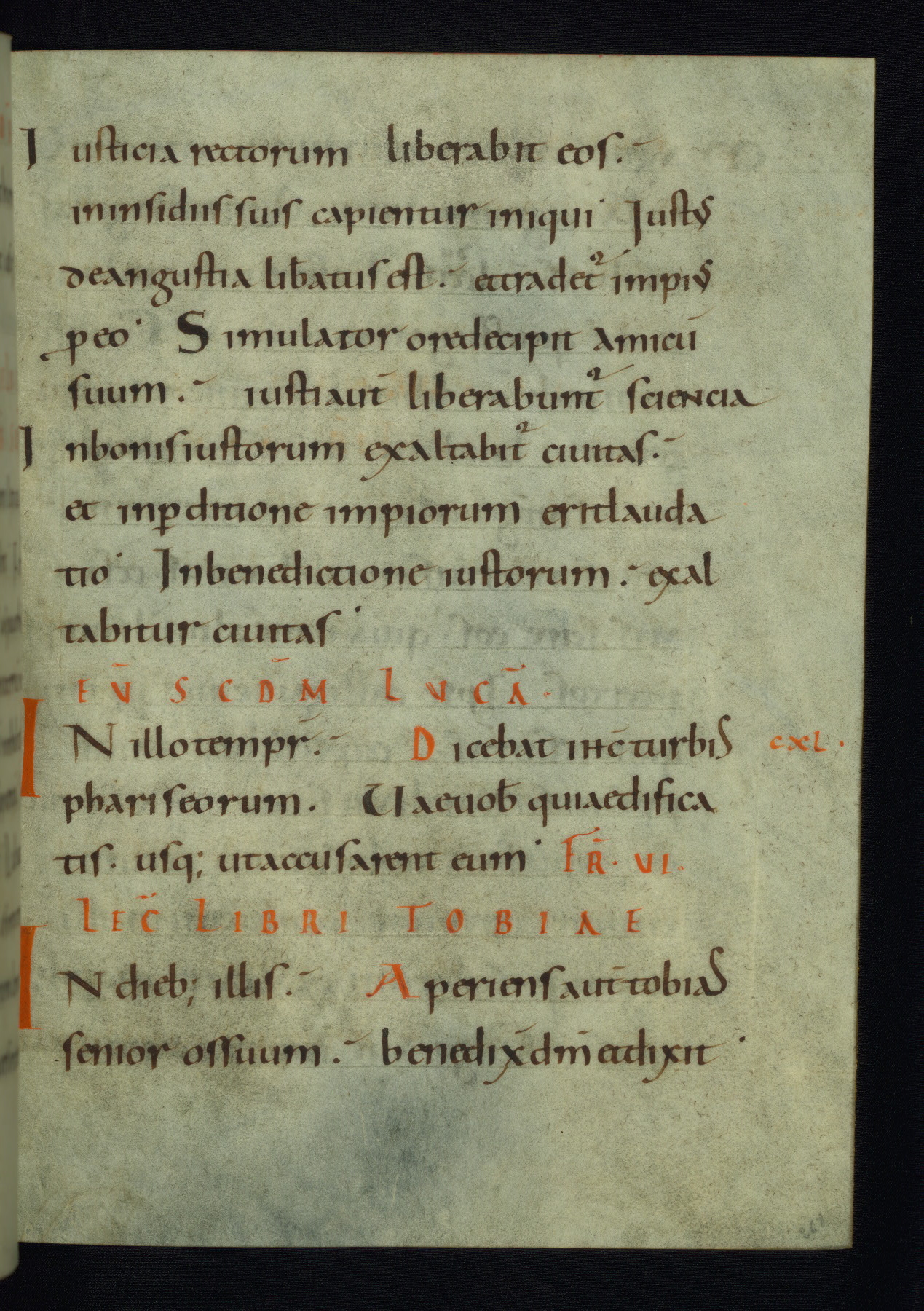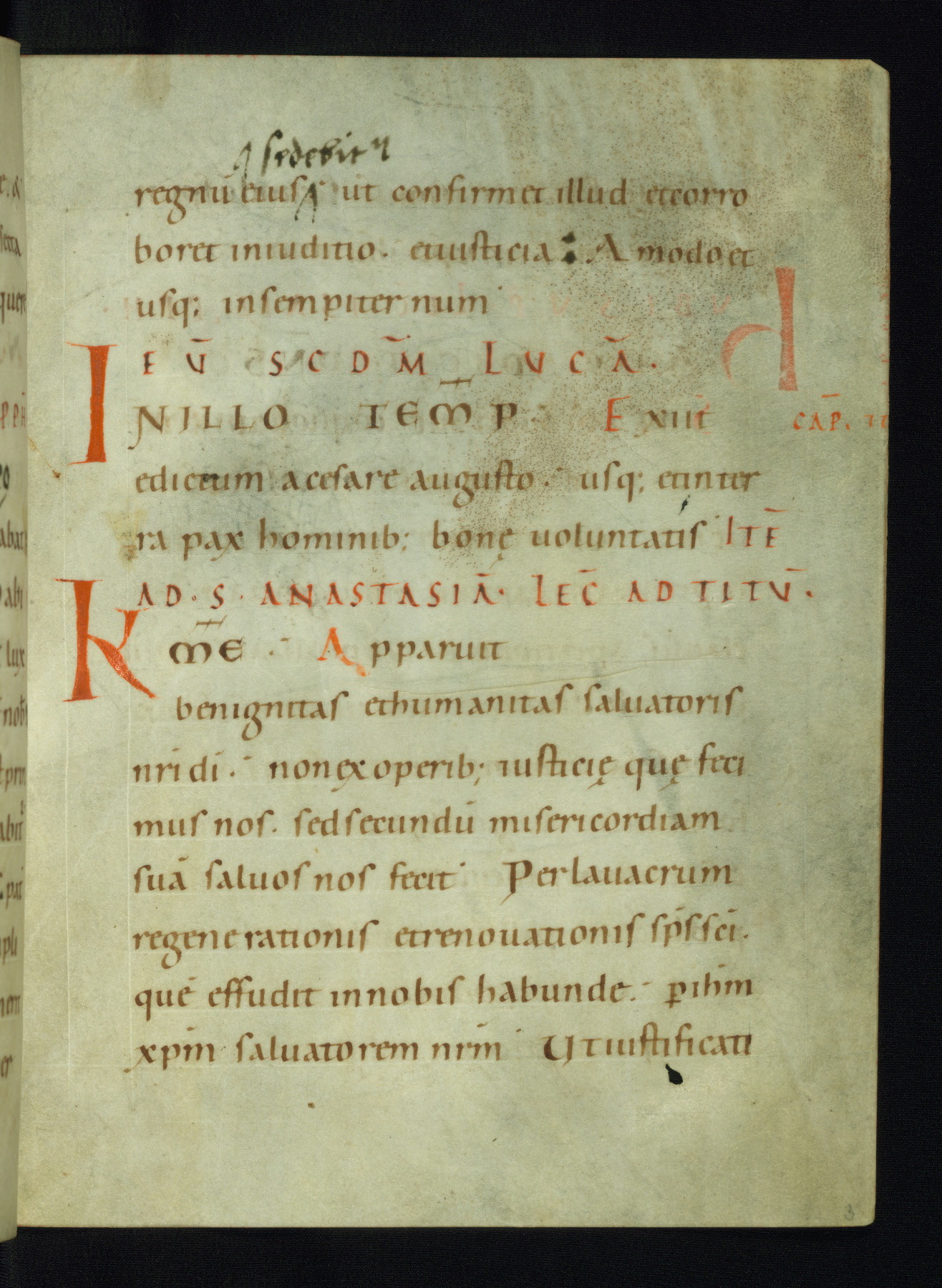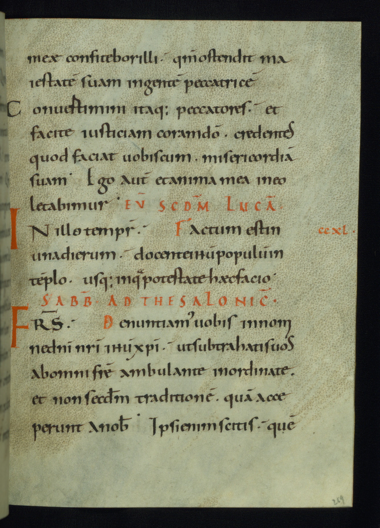 This Lectionary was created ca. 1000 in Trier. Written in a clear Caroline minuscule, it contains decorated initials at the openings of important readings. A set of illuminated letters marks the beginning of the Epistle and Gospel lessons for Easter; they display the hierarchy of scripts with capital letters decorated with gold leaf or drawn in red ink, followed by uncial and Caroline minuscule. Initials in orange, sometimes filled with gold, mark the divisions of the text. The book has been stylistically compared with Ottonian manuscripts, especially with a Psalter preserved in Trier (Stadtbibliothek, Ms. 7) illuminated by the so-called Master of the Registrum Gregorii.