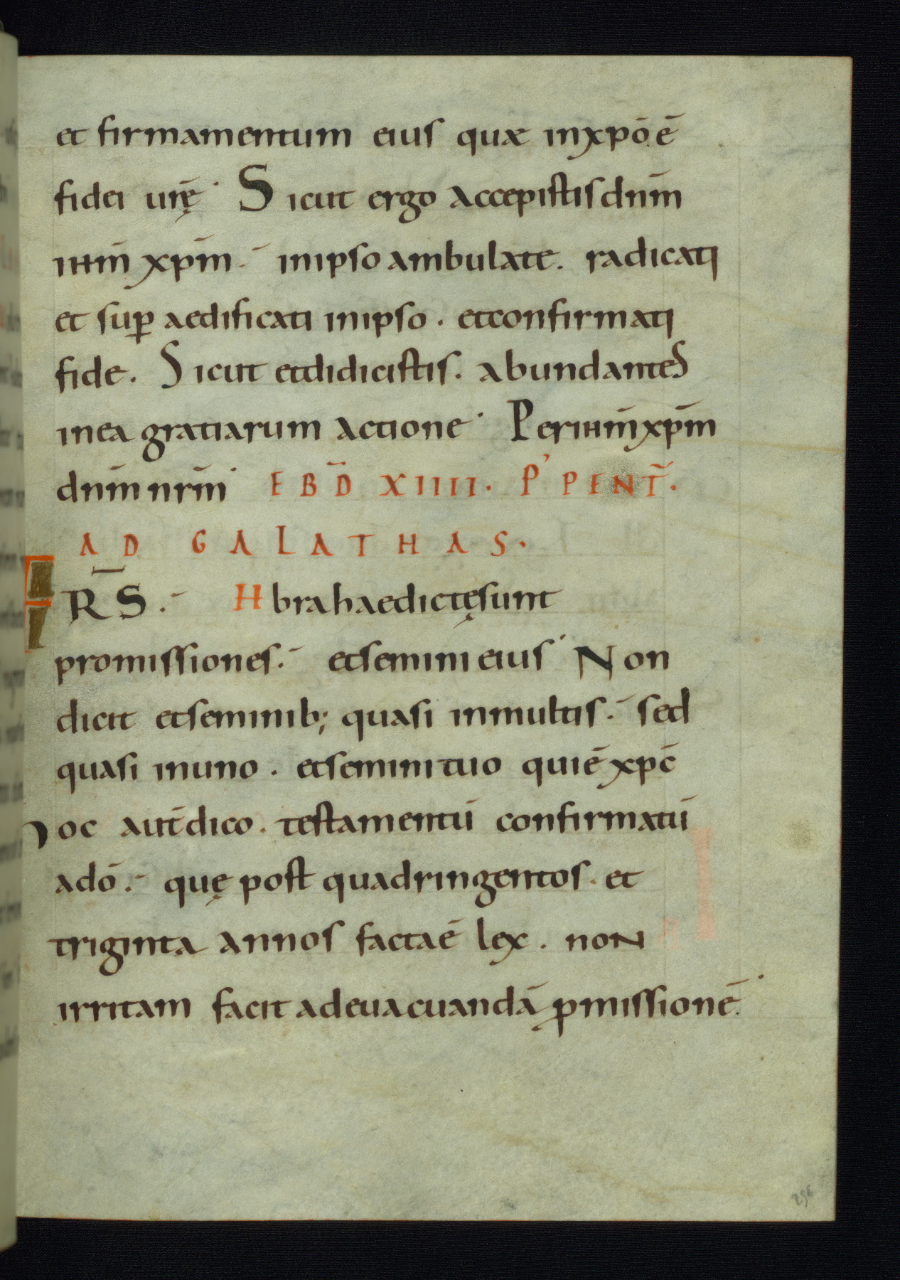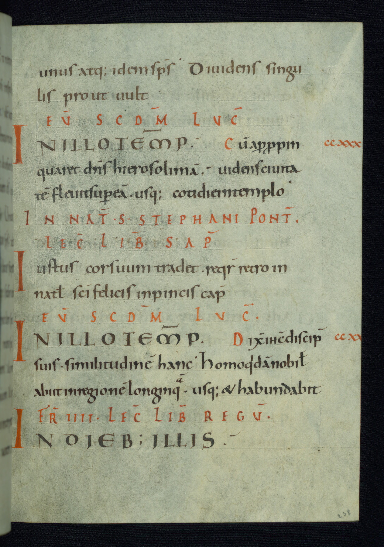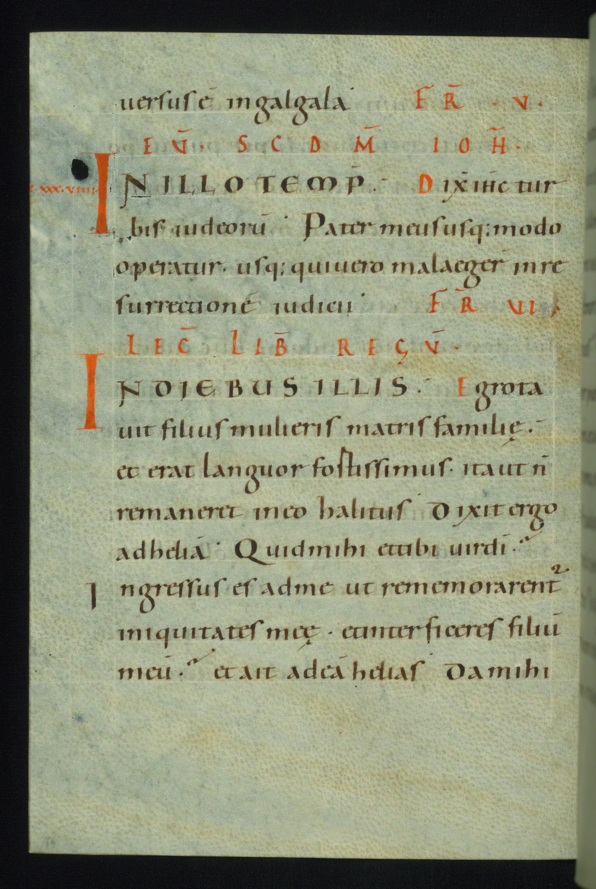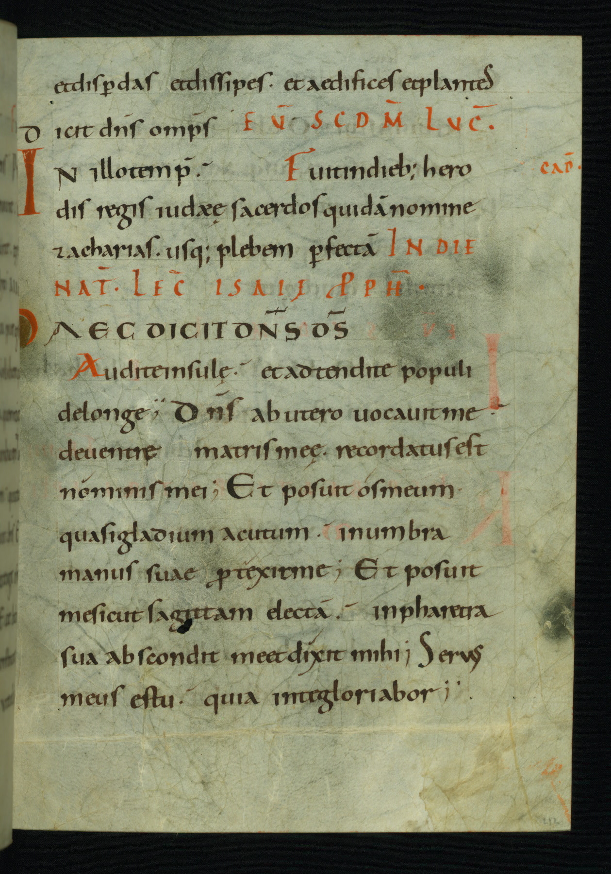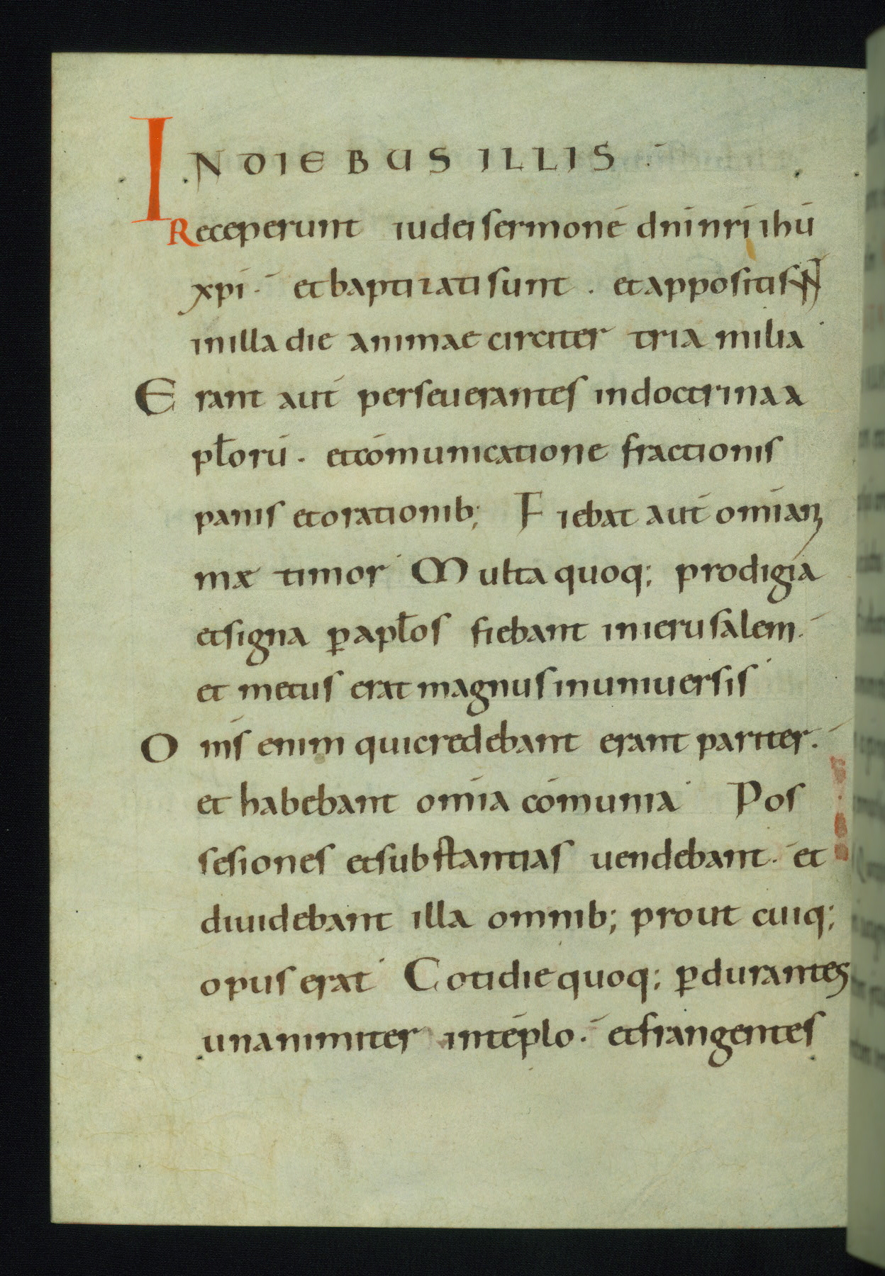 This Lectionary was created ca. 1000 in Trier. Written in a clear Caroline minuscule, it contains decorated initials at the openings of important readings. A set of illuminated letters marks the beginning of the Epistle and Gospel lessons for Easter; they display the hierarchy of scripts with capital letters decorated with gold leaf or drawn in red ink, followed by uncial and Caroline minuscule. Initials in orange, sometimes filled with gold, mark the divisions of the text. The book has been stylistically compared with Ottonian manuscripts, especially with a Psalter preserved in Trier (Stadtbibliothek, Ms. 7) illuminated by the so-called Master of the Registrum Gregorii.