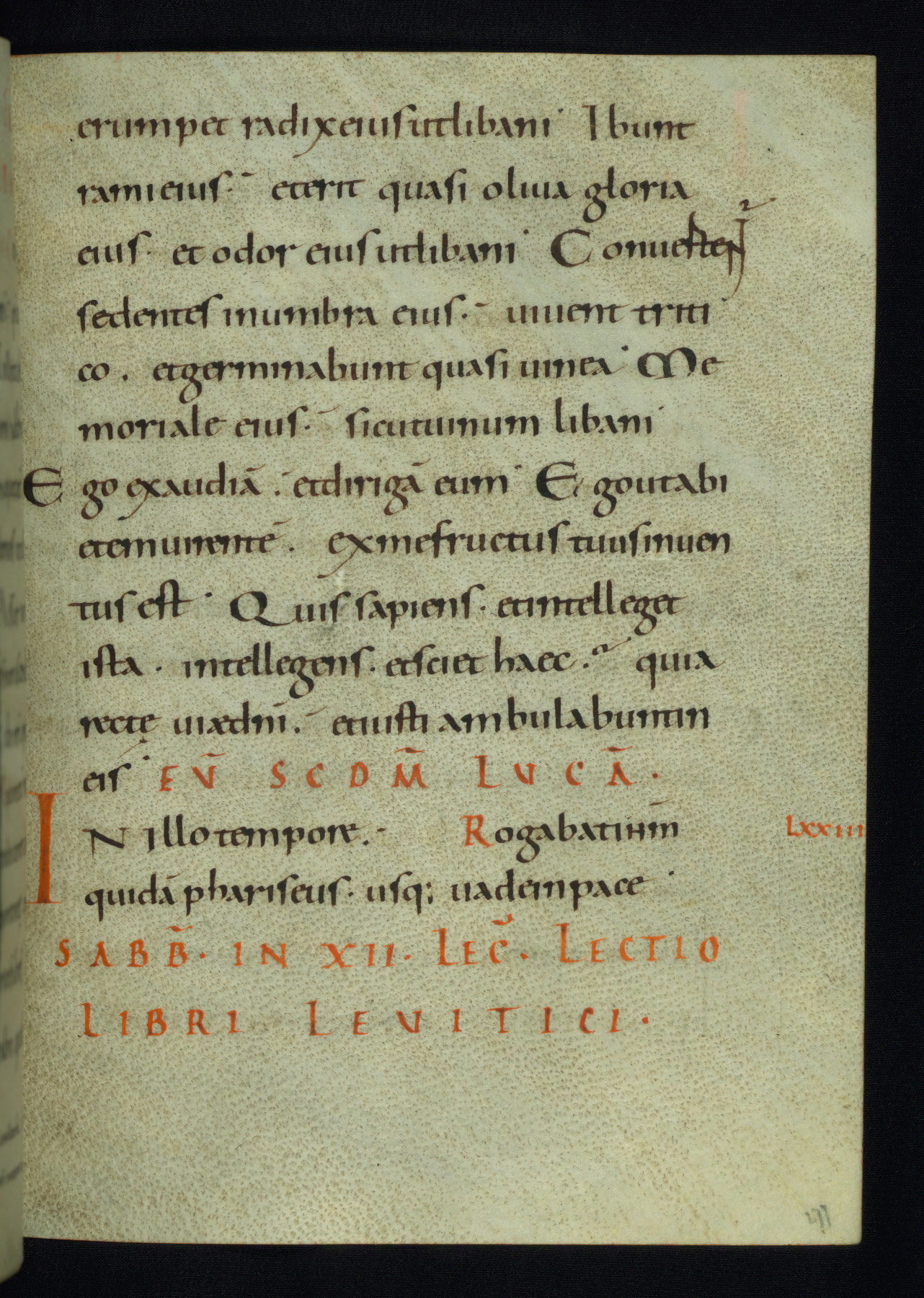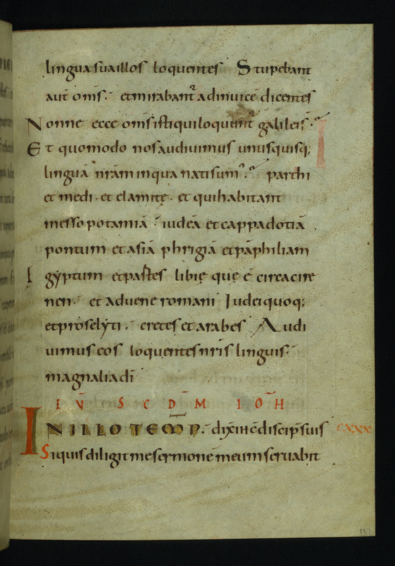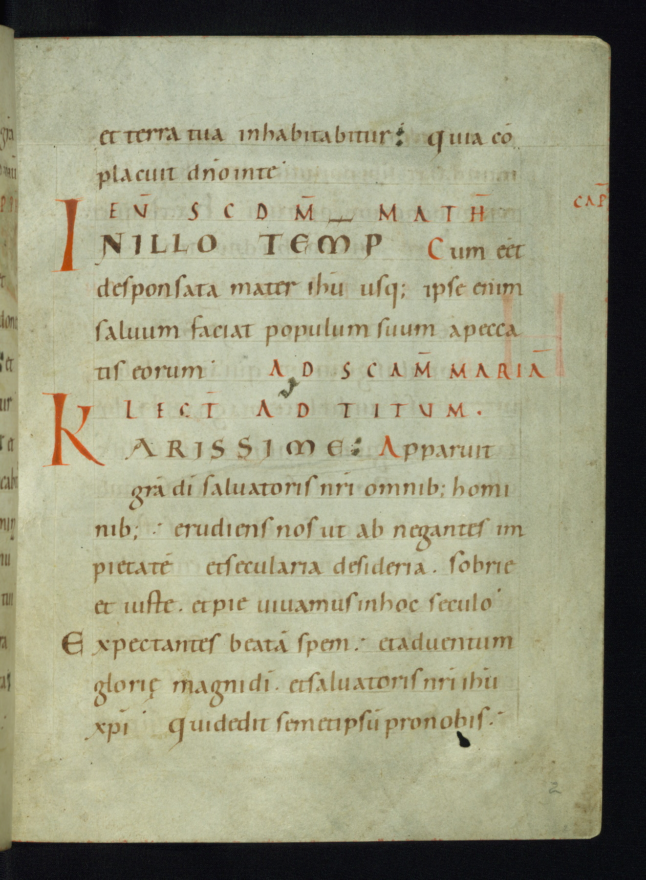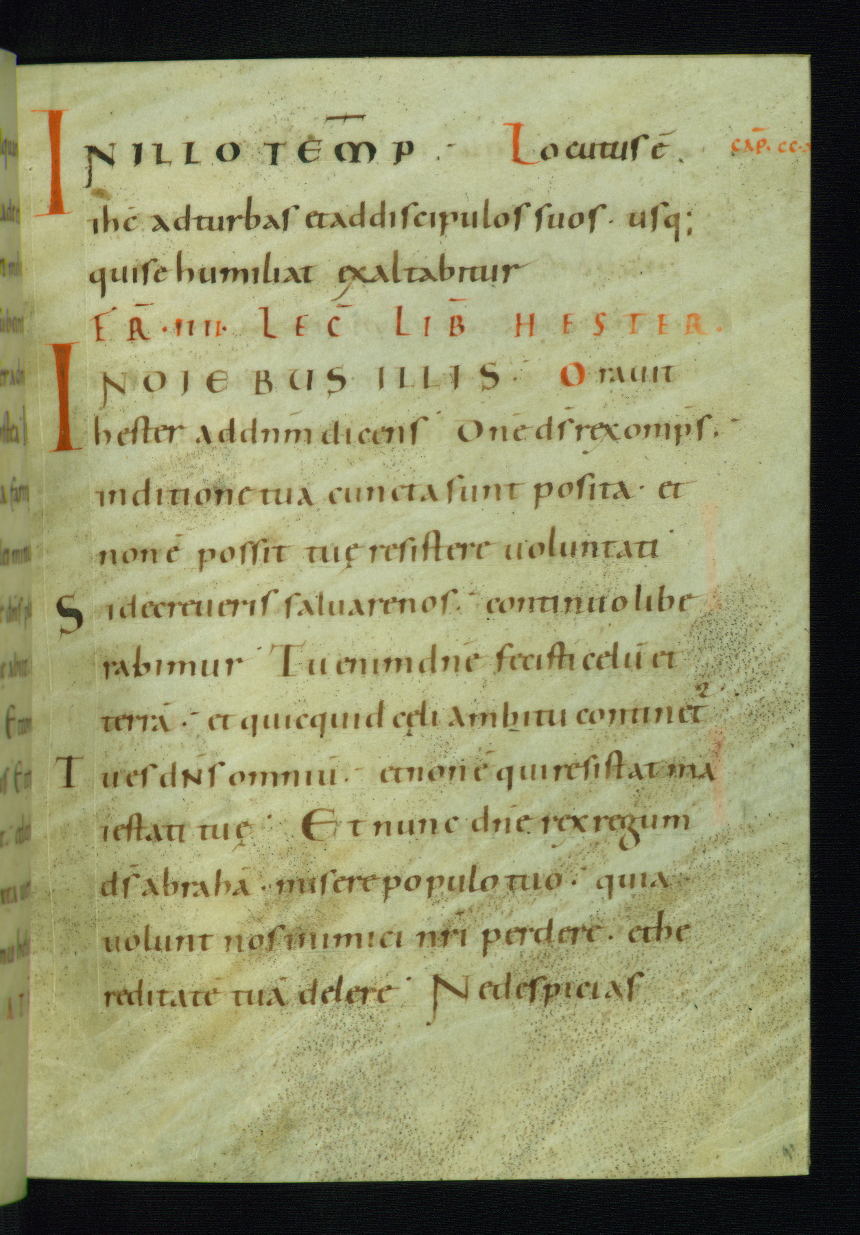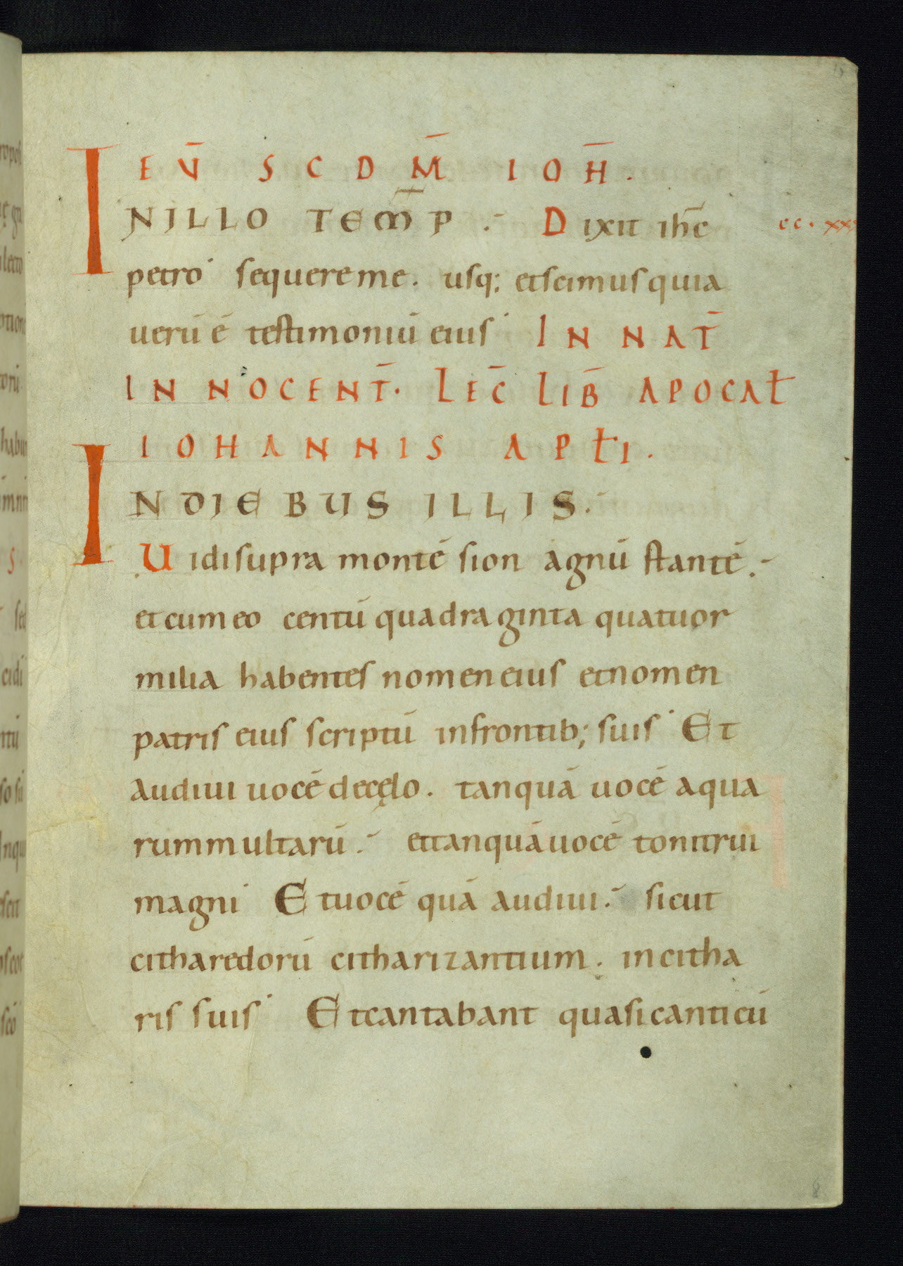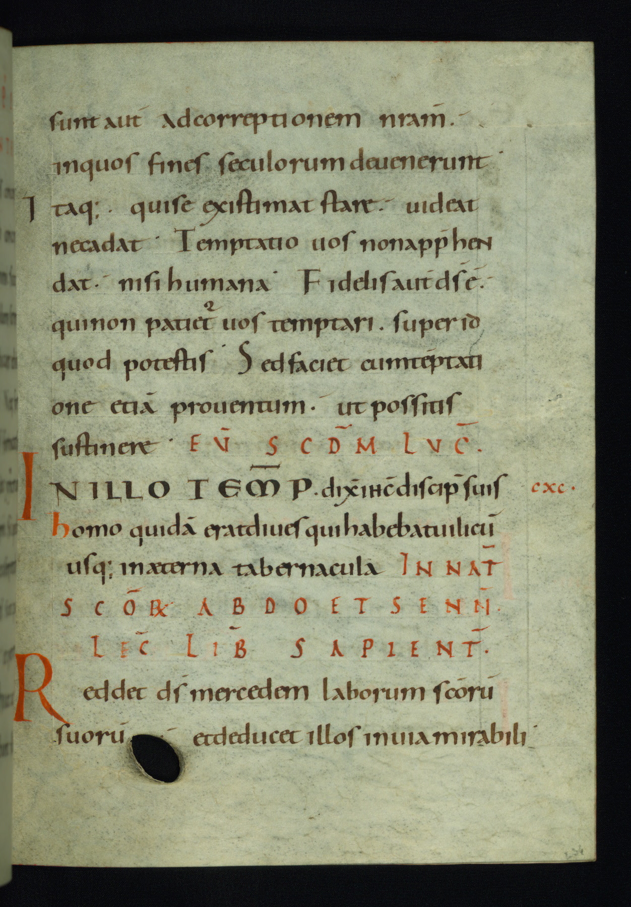 This Lectionary was created ca. 1000 in Trier. Written in a clear Caroline minuscule, it contains decorated initials at the openings of important readings. A set of illuminated letters marks the beginning of the Epistle and Gospel lessons for Easter; they display the hierarchy of scripts with capital letters decorated with gold leaf or drawn in red ink, followed by uncial and Caroline minuscule. Initials in orange, sometimes filled with gold, mark the divisions of the text. The book has been stylistically compared with Ottonian manuscripts, especially with a Psalter preserved in Trier (Stadtbibliothek, Ms. 7) illuminated by the so-called Master of the Registrum Gregorii.