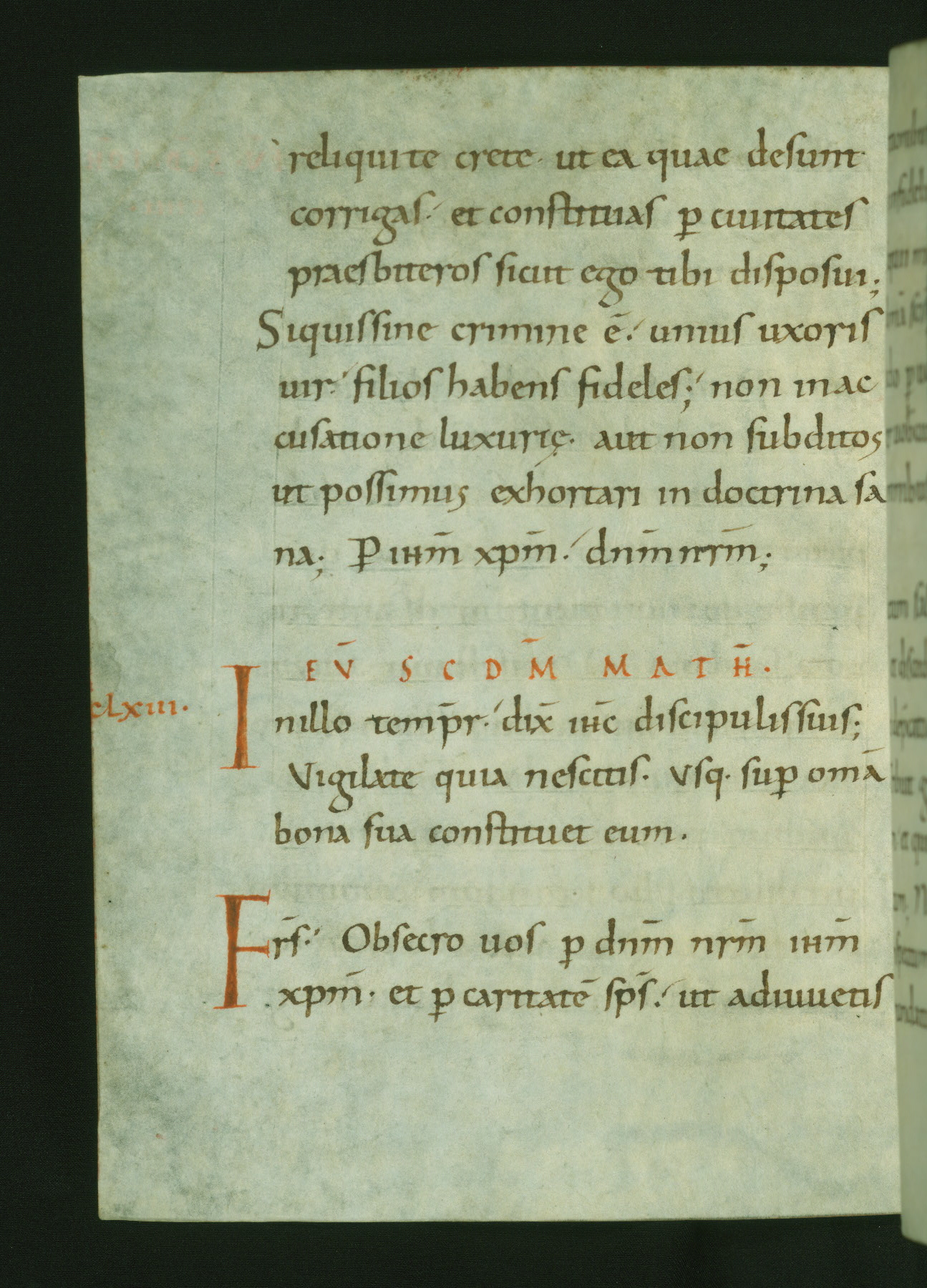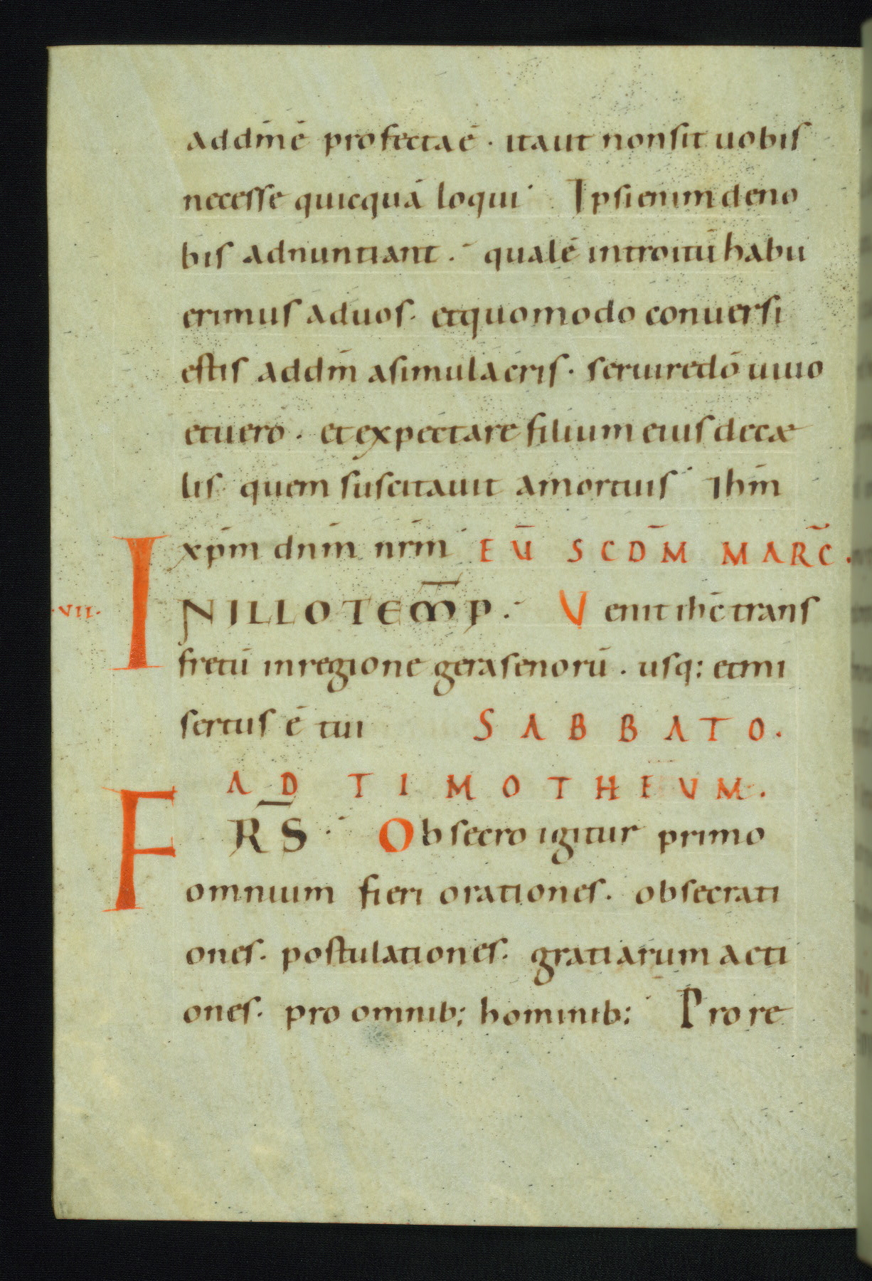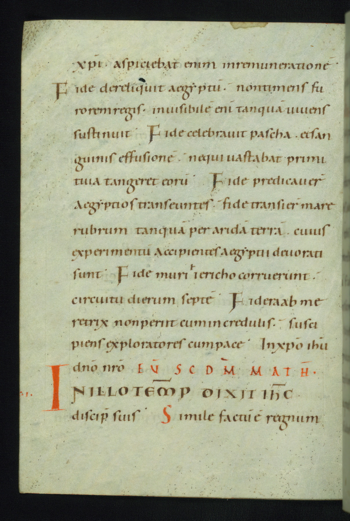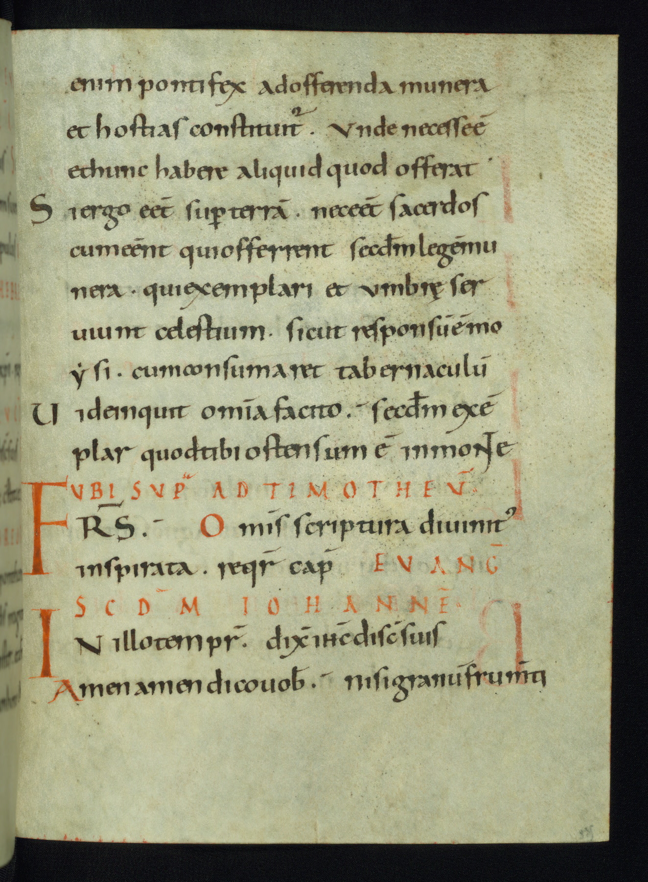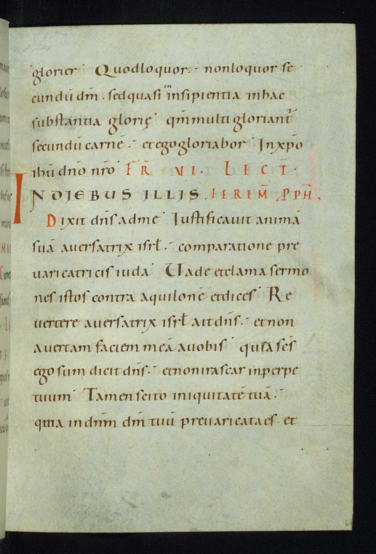 This Lectionary was created ca. 1000 in Trier. Written in a clear Caroline minuscule, it contains decorated initials at the openings of important readings. A set of illuminated letters marks the beginning of the Epistle and Gospel lessons for Easter; they display the hierarchy of scripts with capital letters decorated with gold leaf or drawn in red ink, followed by uncial and Caroline minuscule. Initials in orange, sometimes filled with gold, mark the divisions of the text. The book has been stylistically compared with Ottonian manuscripts, especially with a Psalter preserved in Trier (Stadtbibliothek, Ms. 7) illuminated by the so-called Master of the Registrum Gregorii.