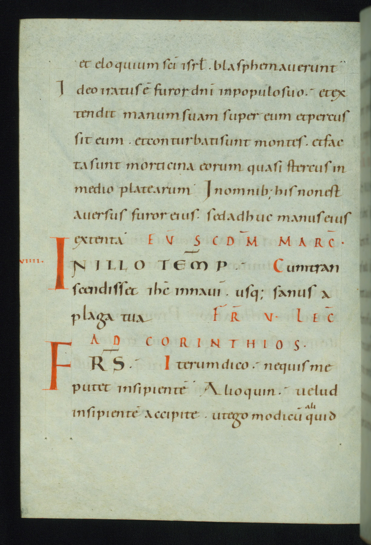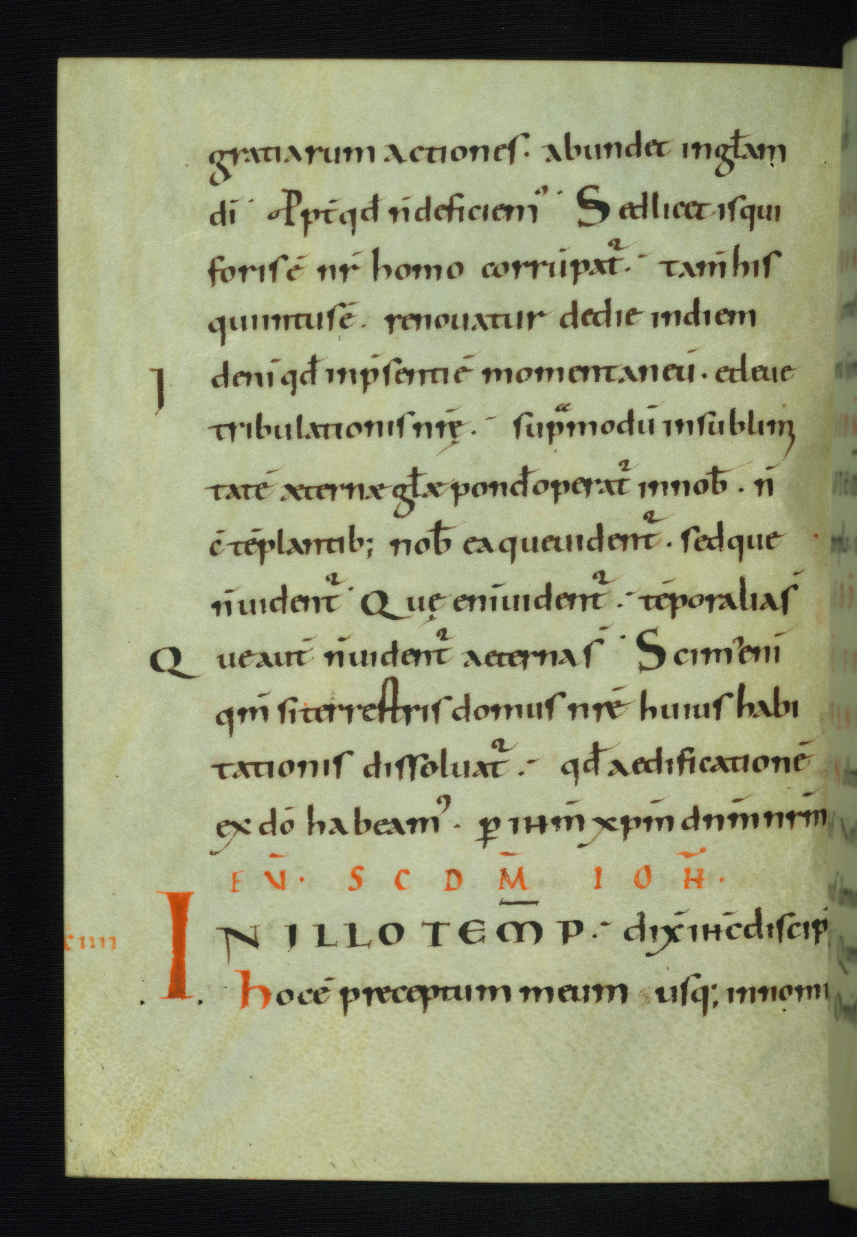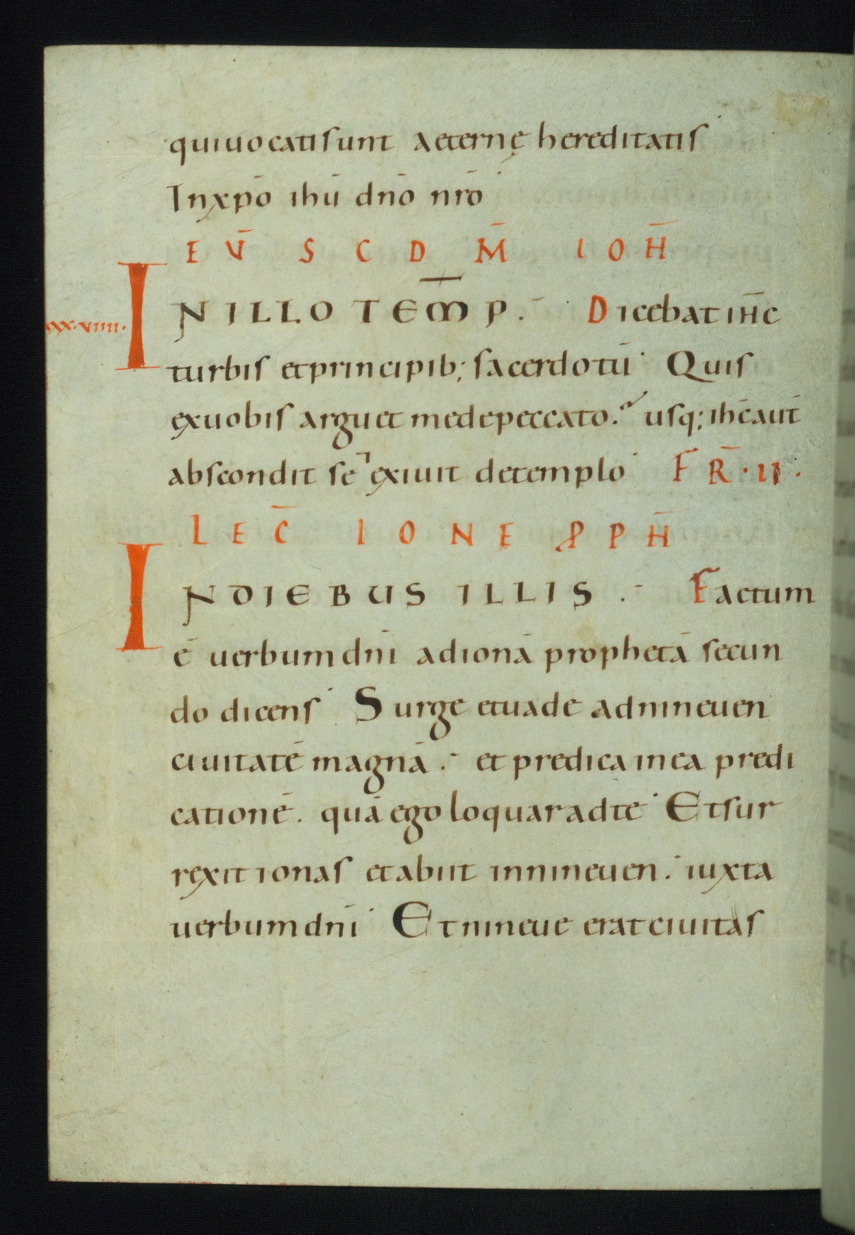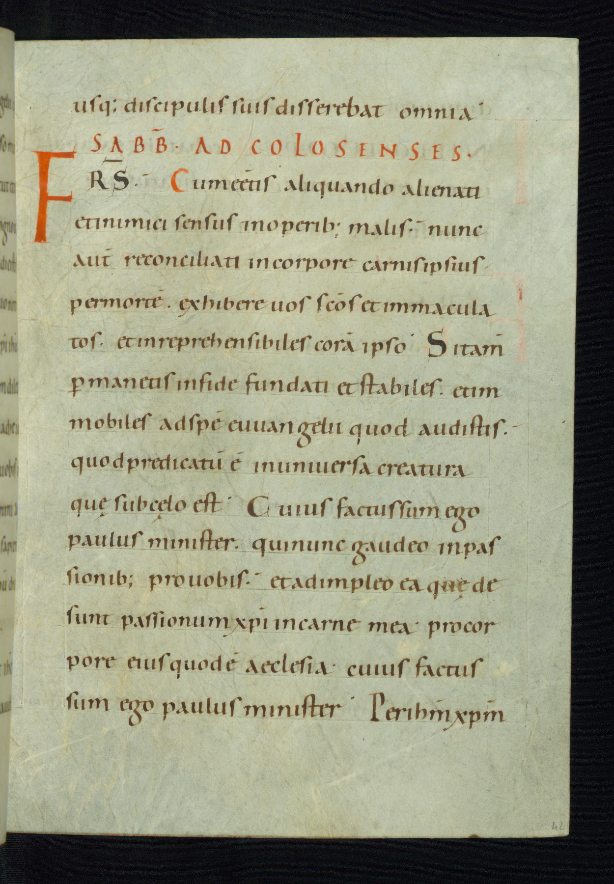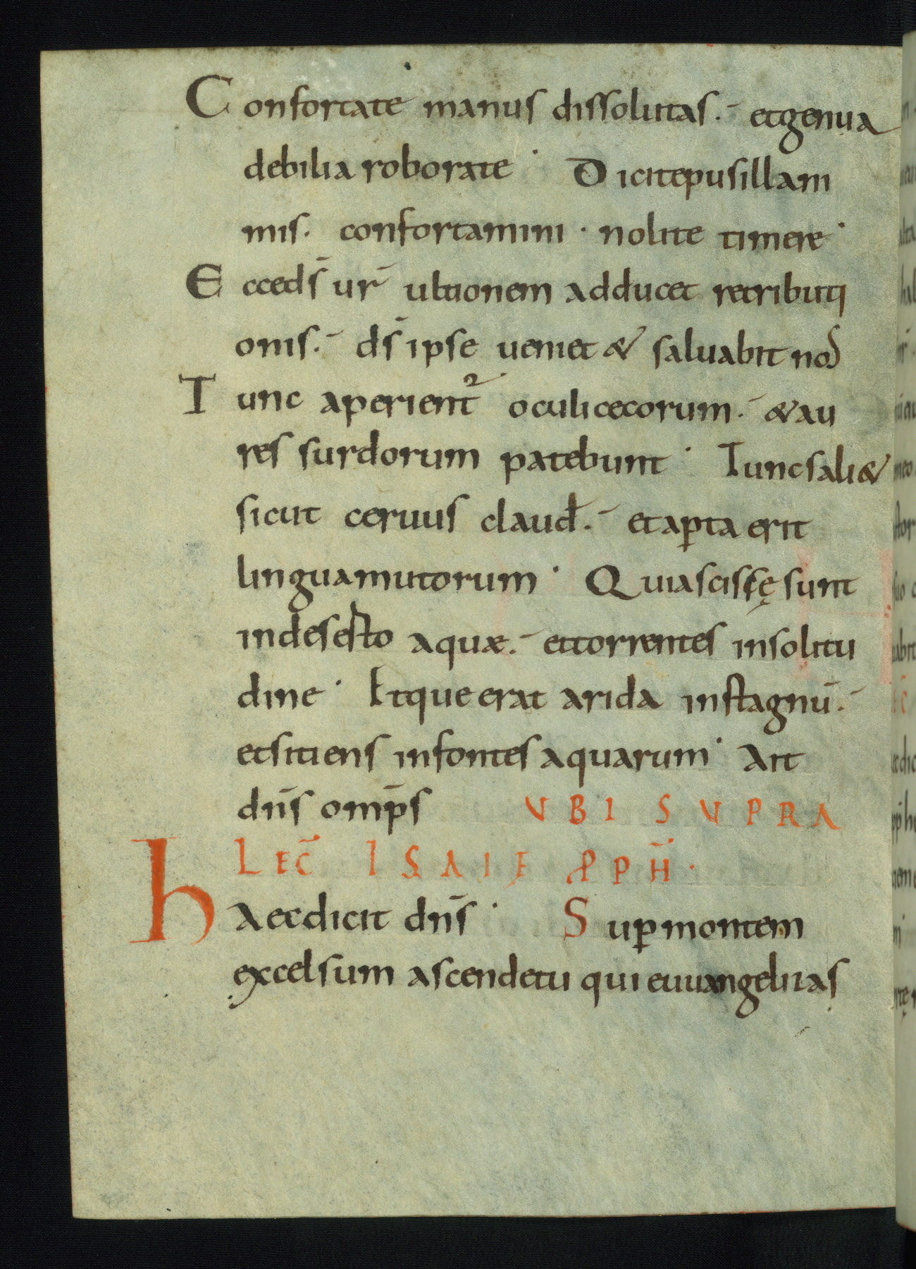 This Lectionary was created ca. 1000 in Trier. Written in a clear Caroline minuscule, it contains decorated initials at the openings of important readings. A set of illuminated letters marks the beginning of the Epistle and Gospel lessons for Easter; they display the hierarchy of scripts with capital letters decorated with gold leaf or drawn in red ink, followed by uncial and Caroline minuscule. Initials in orange, sometimes filled with gold, mark the divisions of the text. The book has been stylistically compared with Ottonian manuscripts, especially with a Psalter preserved in Trier (Stadtbibliothek, Ms. 7) illuminated by the so-called Master of the Registrum Gregorii.