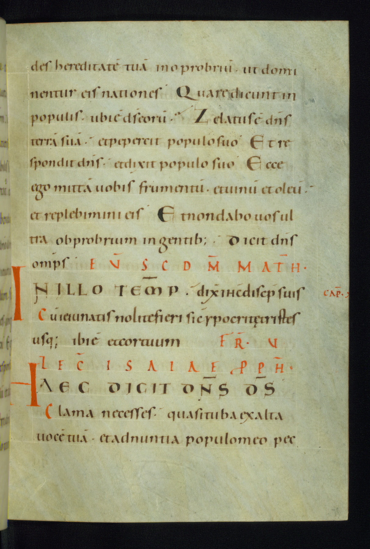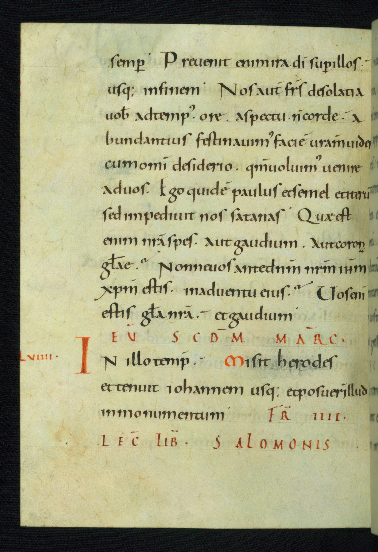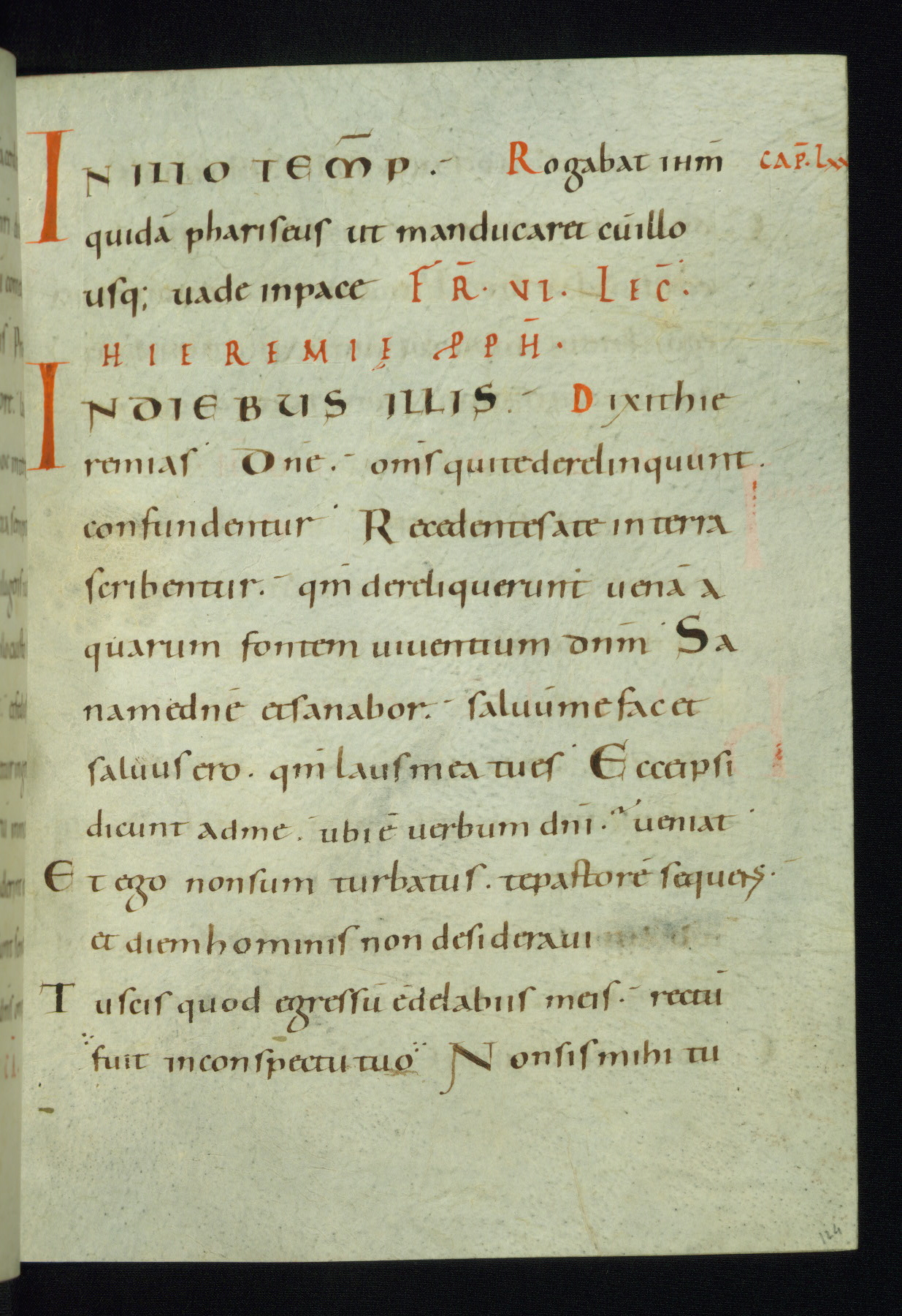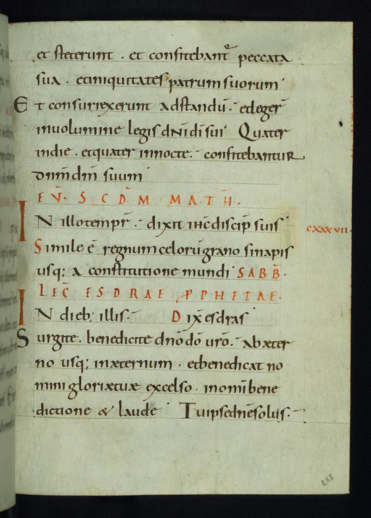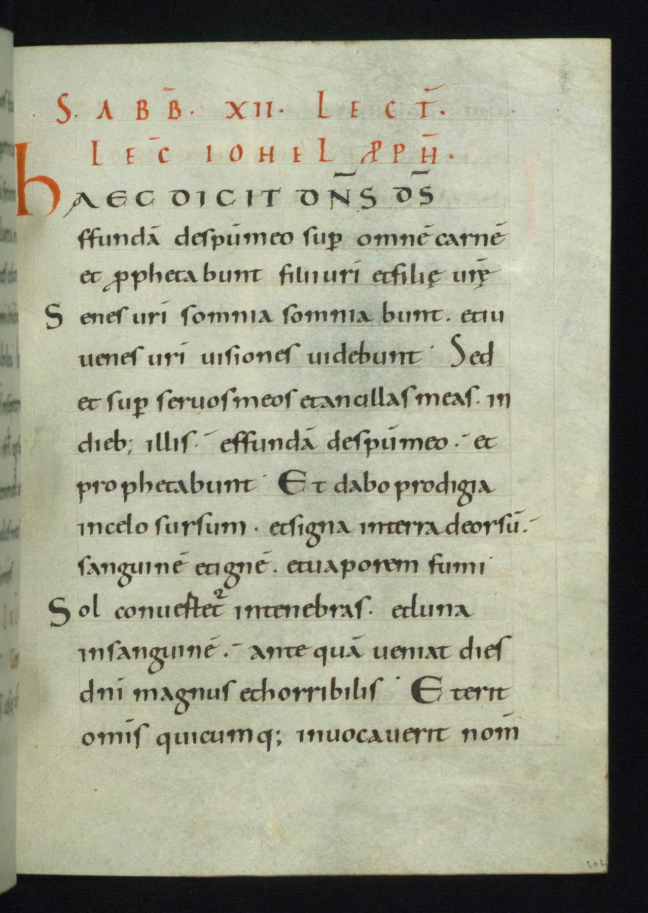 This Lectionary was created ca. 1000 in Trier. Written in a clear Caroline minuscule, it contains decorated initials at the openings of important readings. A set of illuminated letters marks the beginning of the Epistle and Gospel lessons for Easter; they display the hierarchy of scripts with capital letters decorated with gold leaf or drawn in red ink, followed by uncial and Caroline minuscule. Initials in orange, sometimes filled with gold, mark the divisions of the text. The book has been stylistically compared with Ottonian manuscripts, especially with a Psalter preserved in Trier (Stadtbibliothek, Ms. 7) illuminated by the so-called Master of the Registrum Gregorii.
