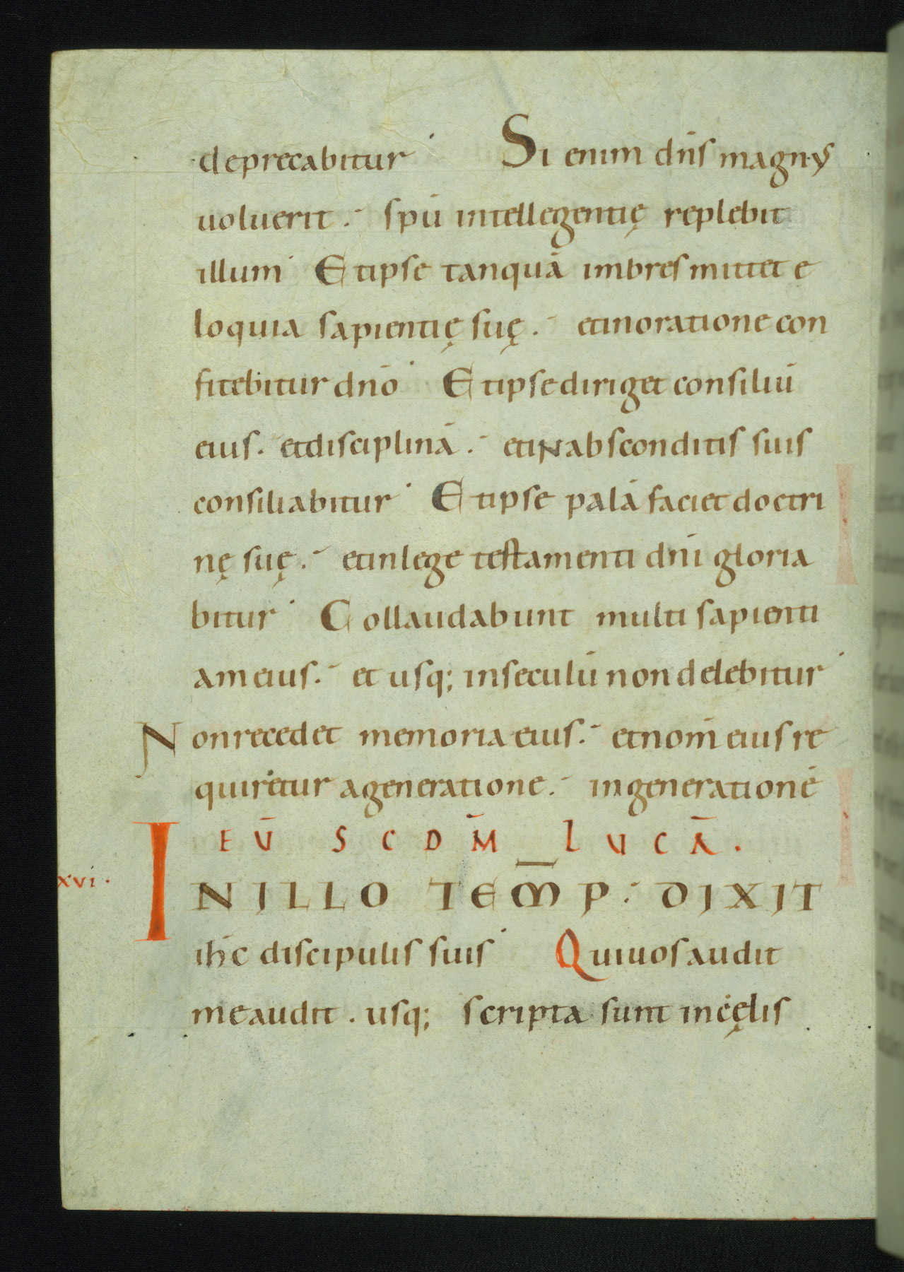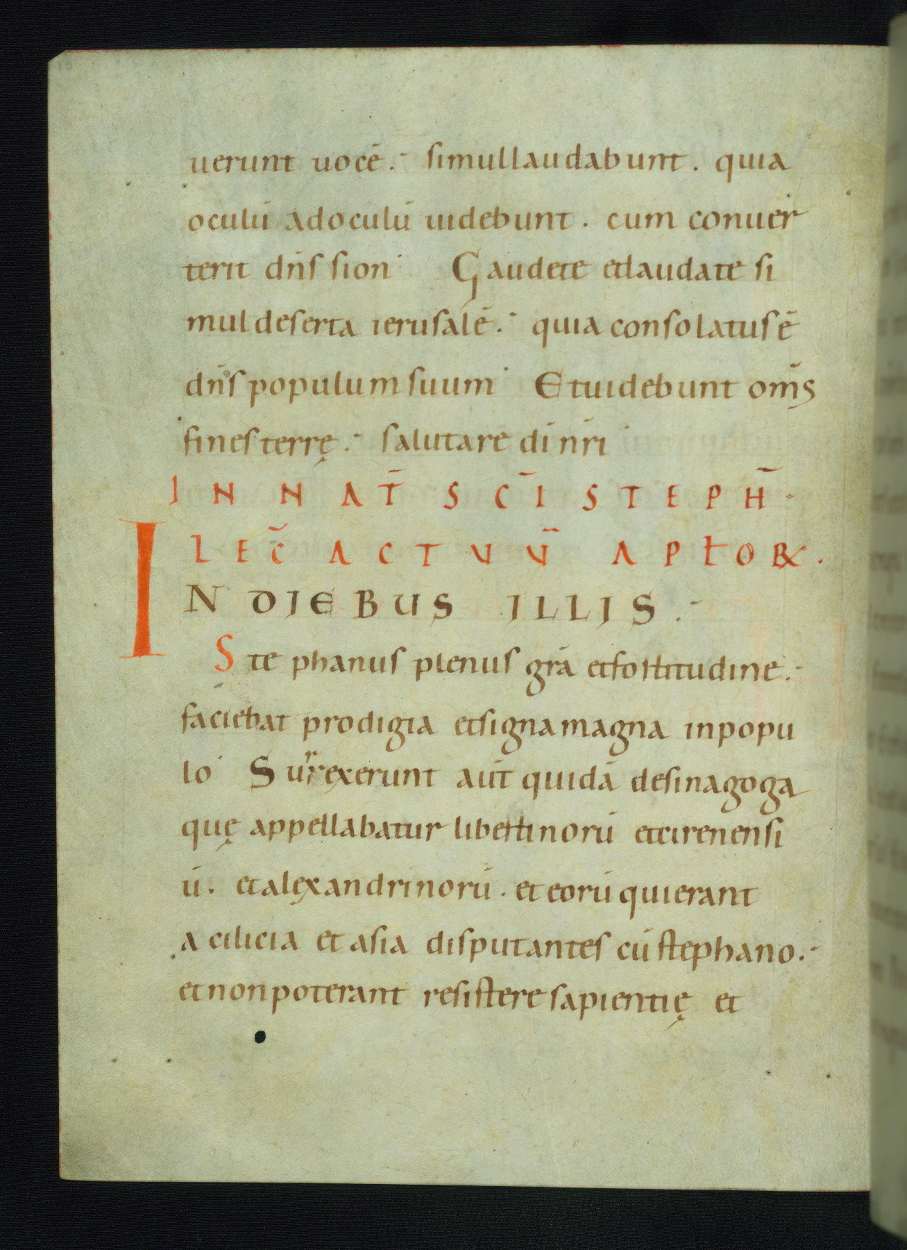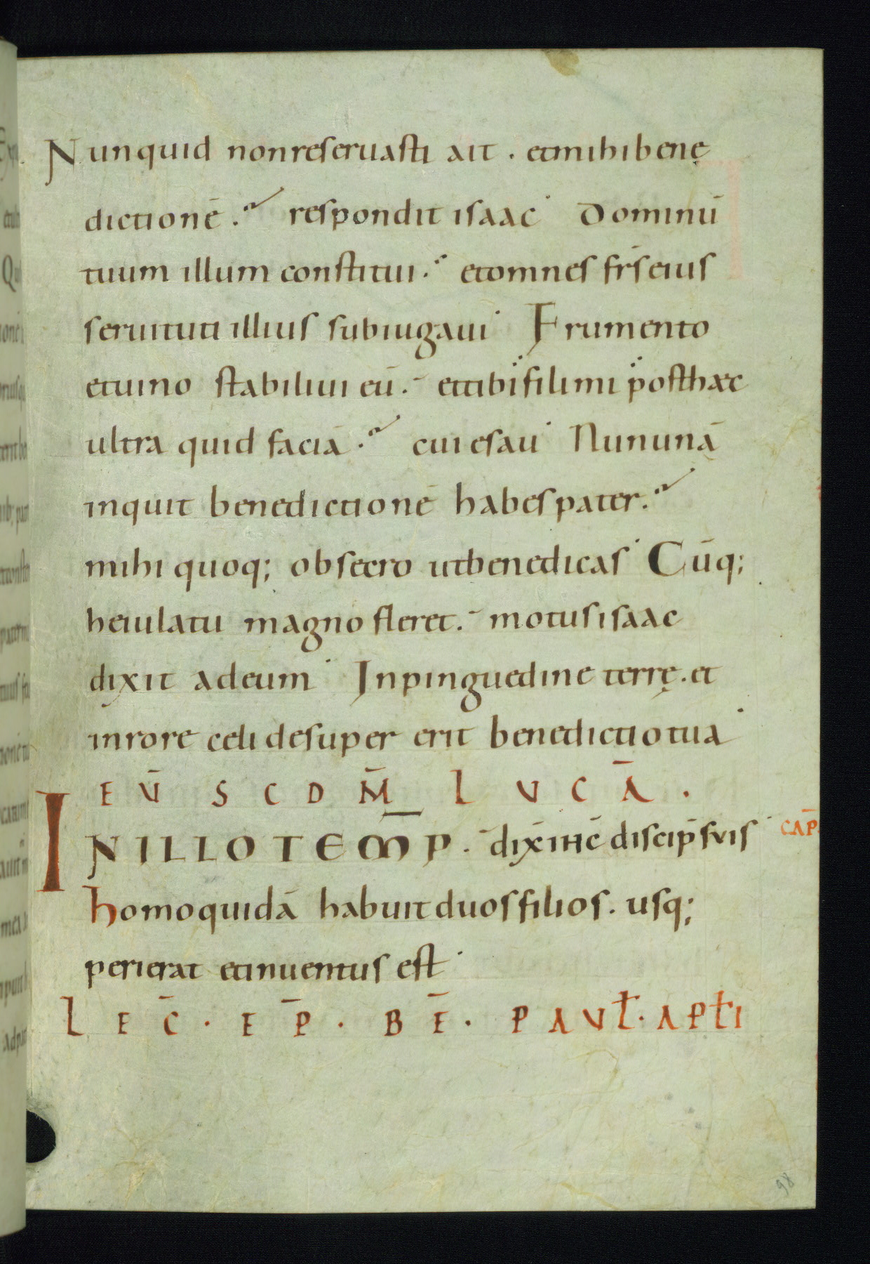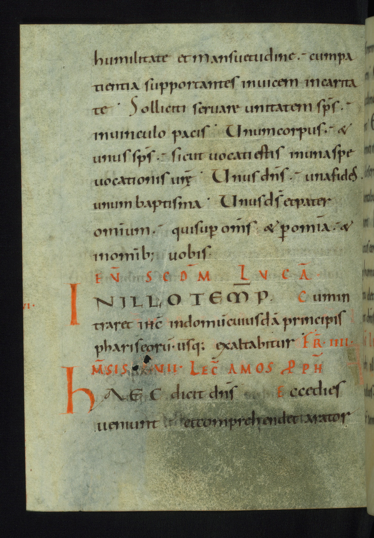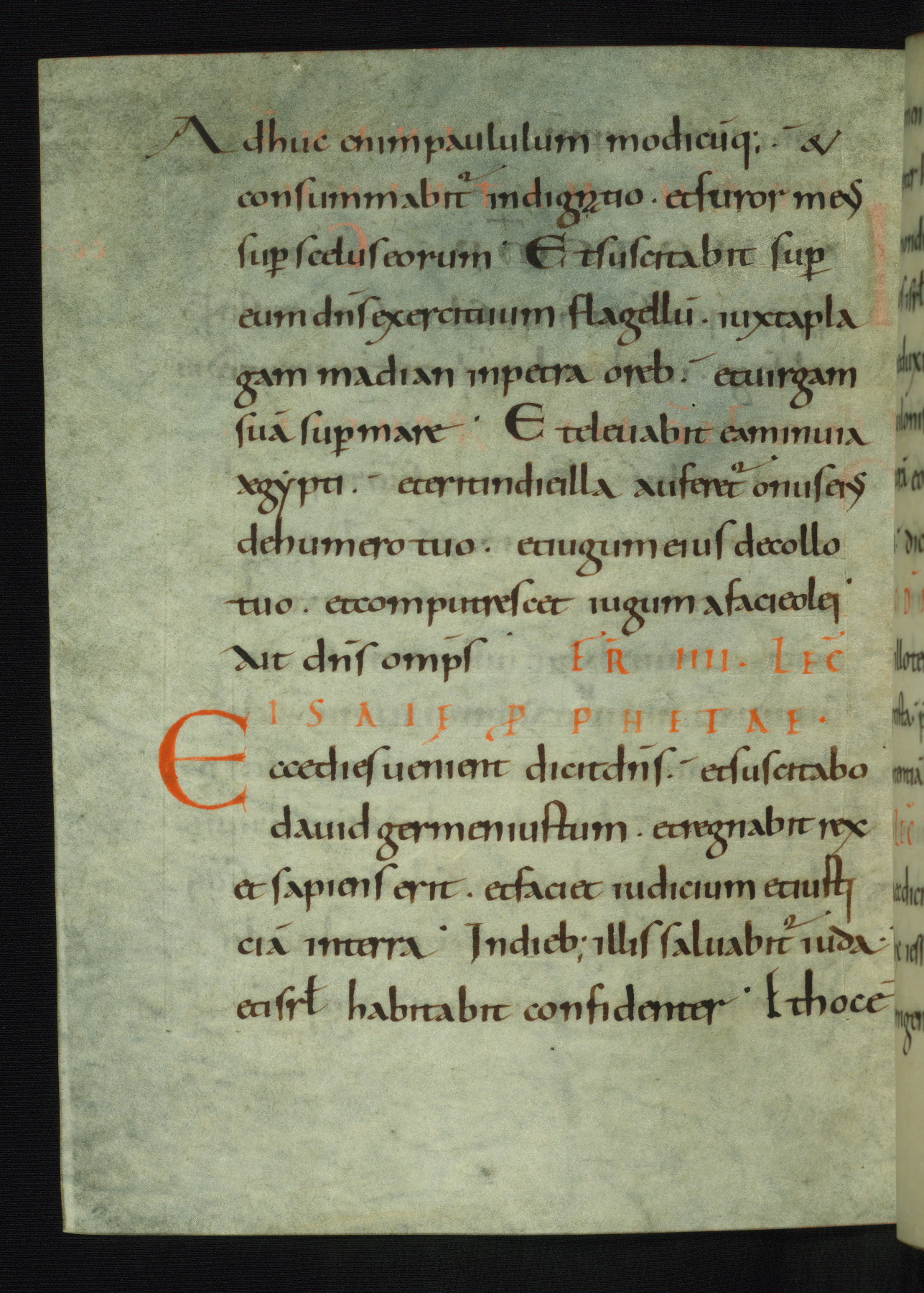 This Lectionary was created ca. 1000 in Trier. Written in a clear Caroline minuscule, it contains decorated initials at the openings of important readings. A set of illuminated letters marks the beginning of the Epistle and Gospel lessons for Easter; they display the hierarchy of scripts with capital letters decorated with gold leaf or drawn in red ink, followed by uncial and Caroline minuscule. Initials in orange, sometimes filled with gold, mark the divisions of the text. The book has been stylistically compared with Ottonian manuscripts, especially with a Psalter preserved in Trier (Stadtbibliothek, Ms. 7) illuminated by the so-called Master of the Registrum Gregorii.