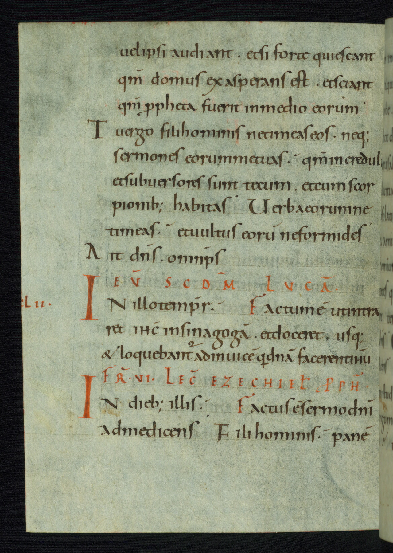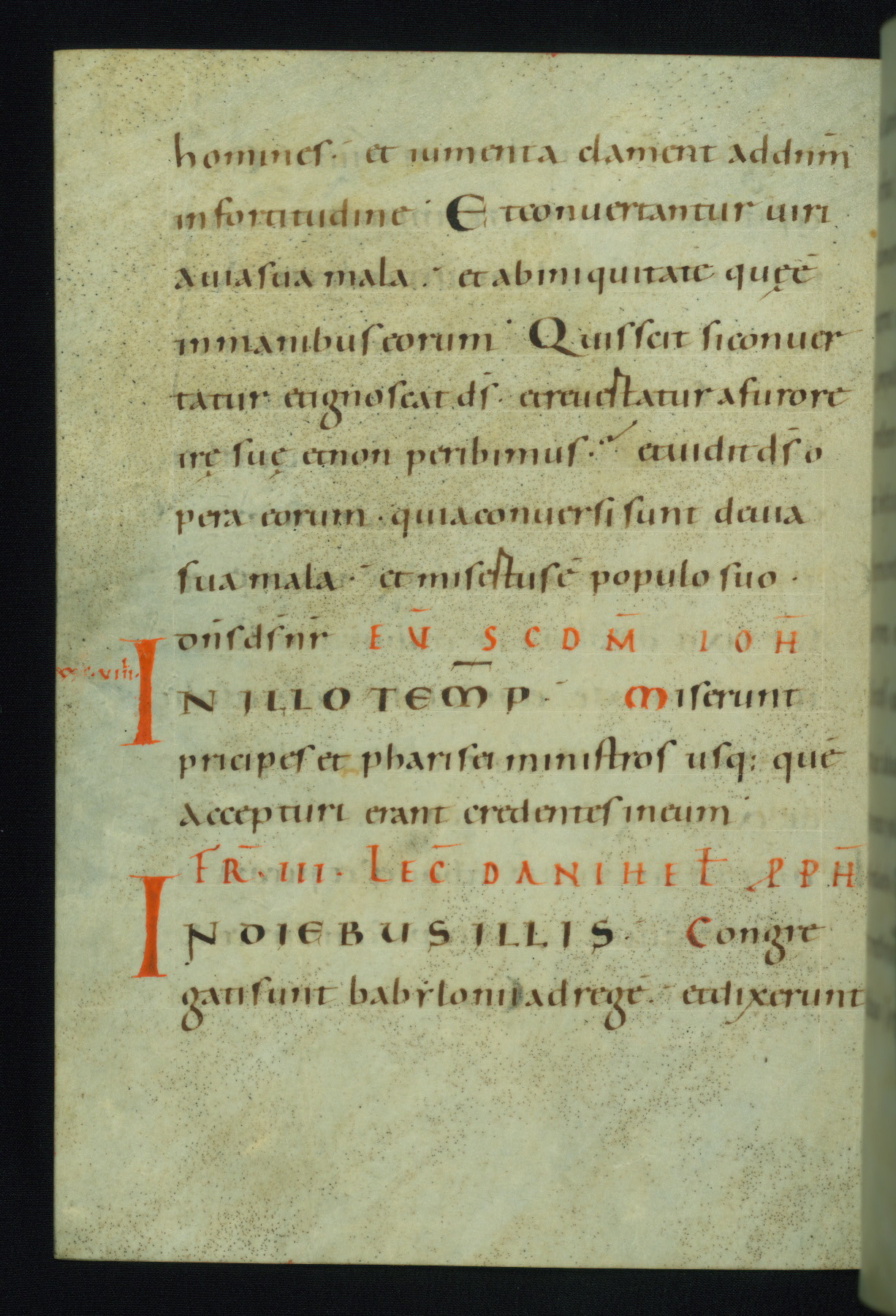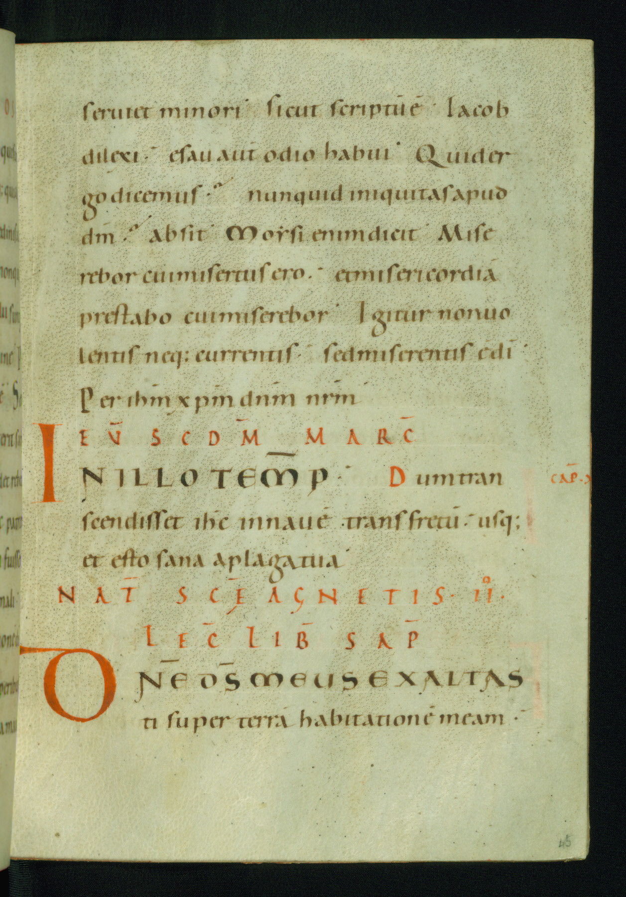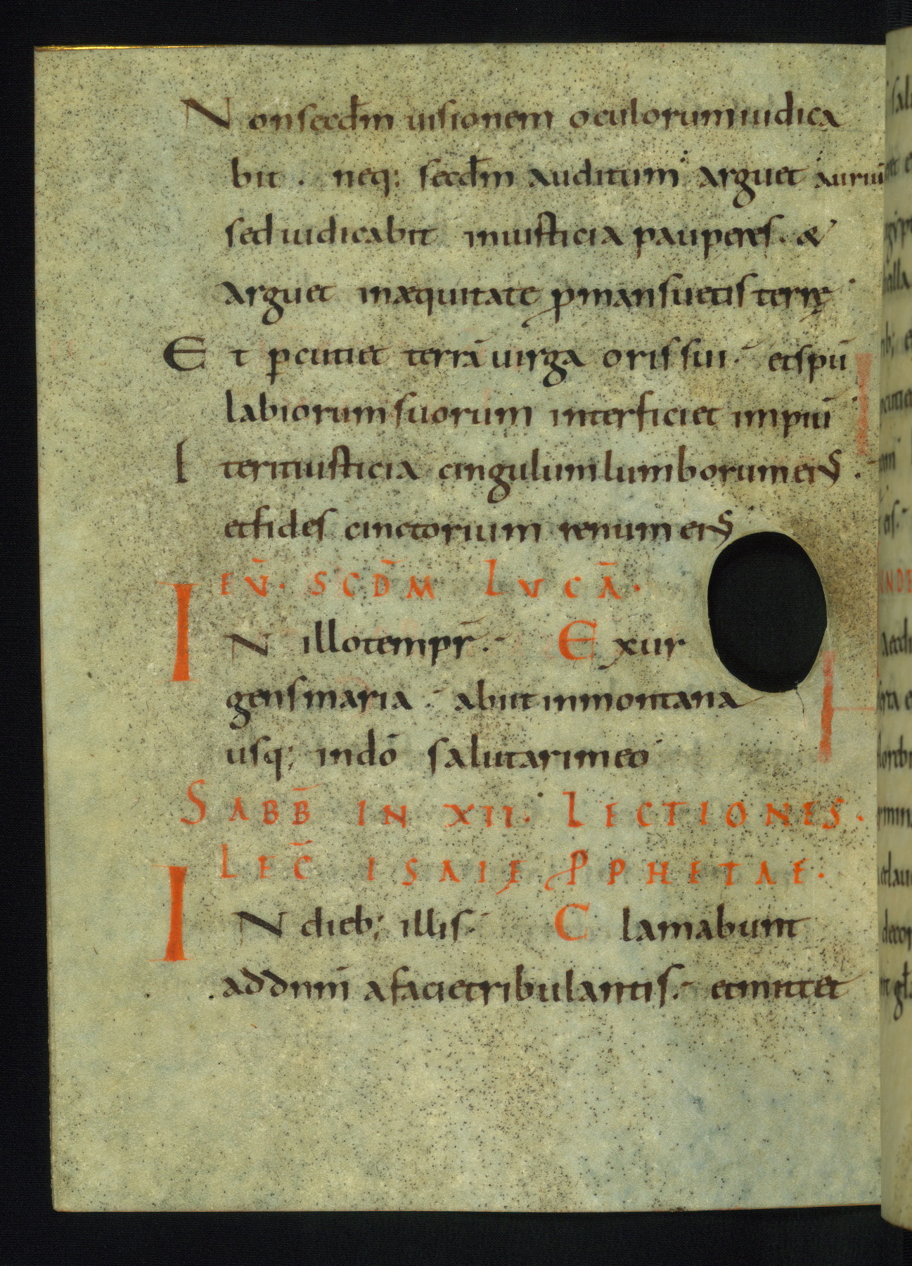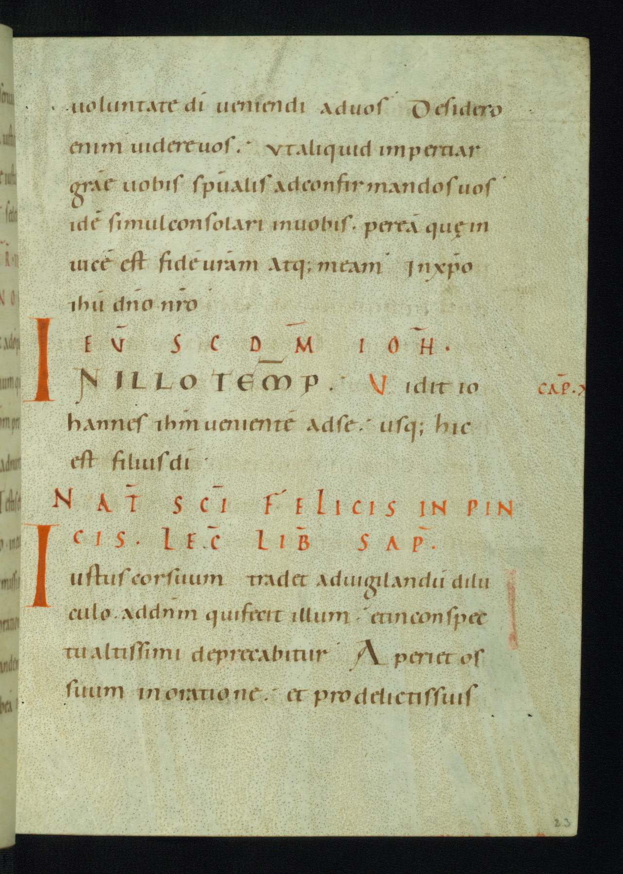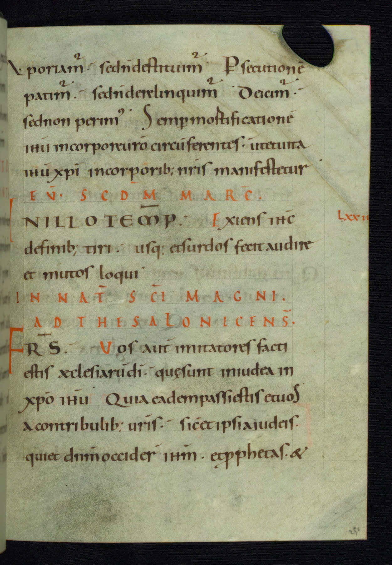 This Lectionary was created ca. 1000 in Trier. Written in a clear Caroline minuscule, it contains decorated initials at the openings of important readings. A set of illuminated letters marks the beginning of the Epistle and Gospel lessons for Easter; they display the hierarchy of scripts with capital letters decorated with gold leaf or drawn in red ink, followed by uncial and Caroline minuscule. Initials in orange, sometimes filled with gold, mark the divisions of the text. The book has been stylistically compared with Ottonian manuscripts, especially with a Psalter preserved in Trier (Stadtbibliothek, Ms. 7) illuminated by the so-called Master of the Registrum Gregorii.