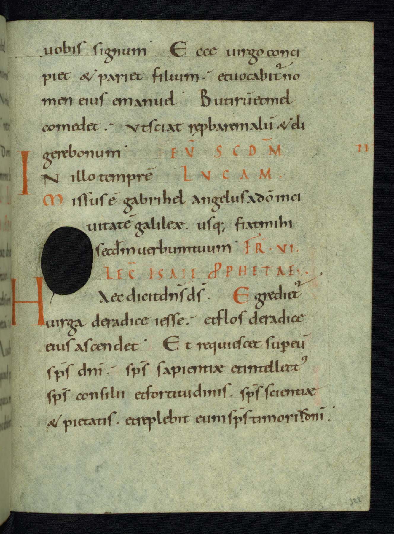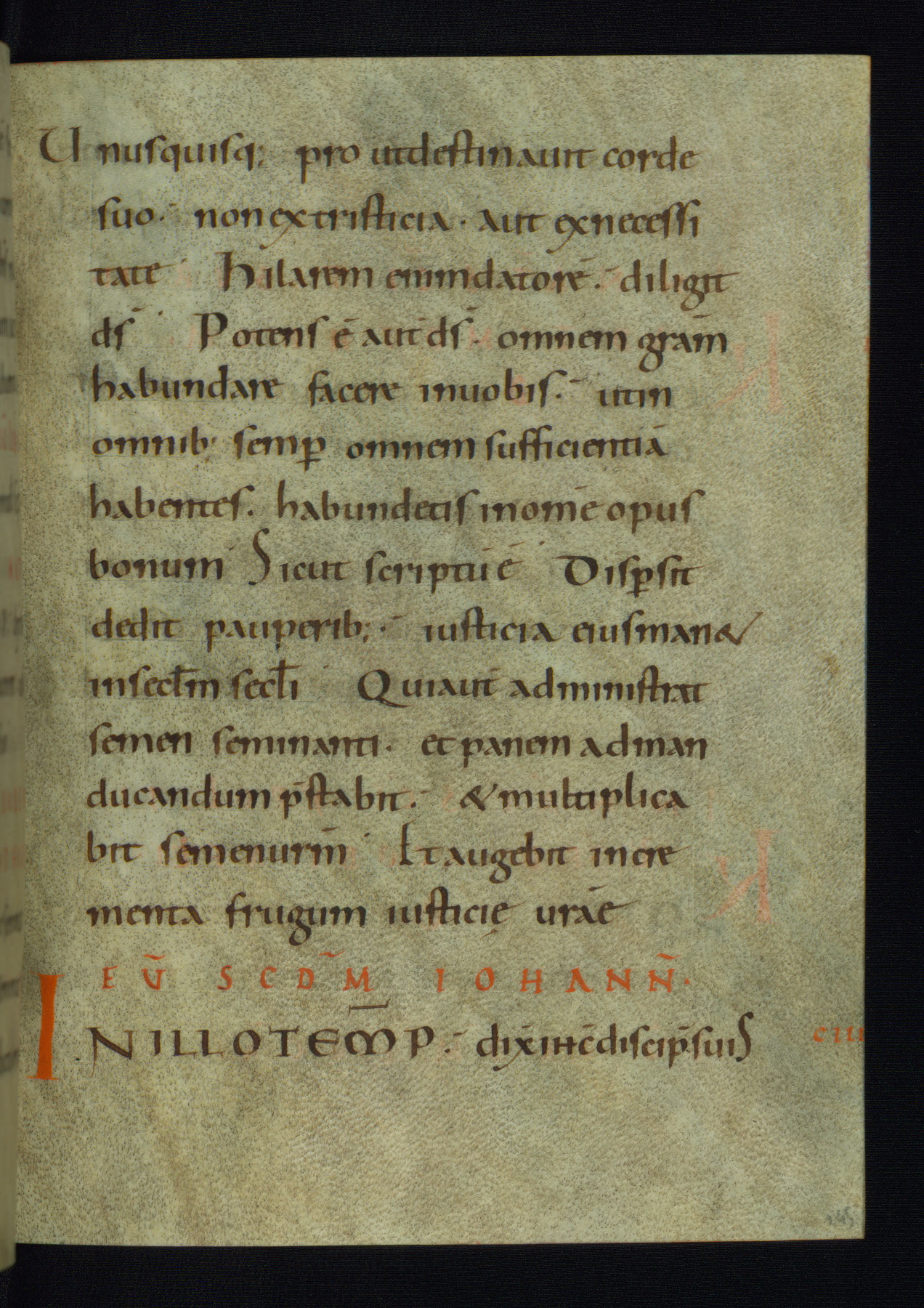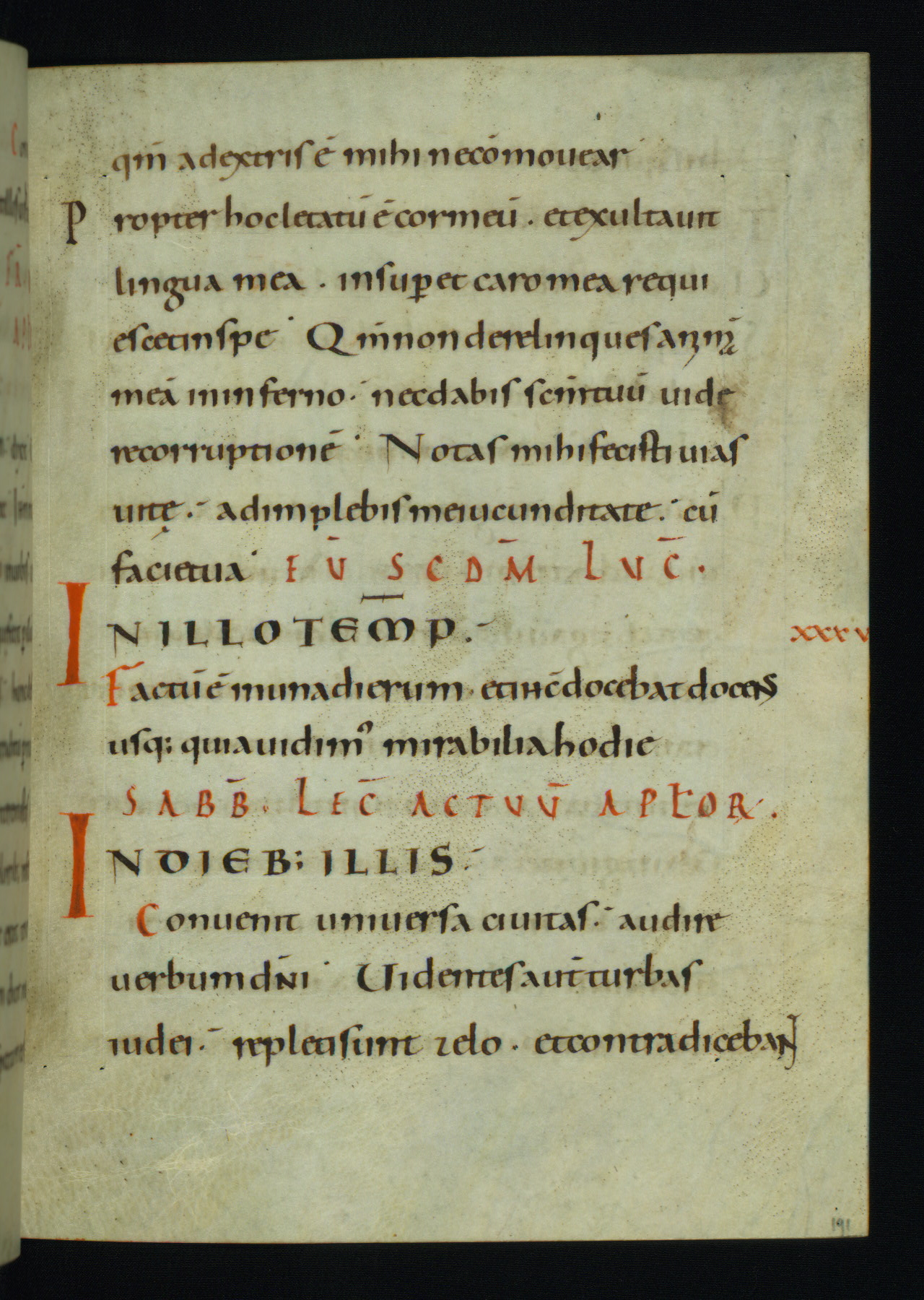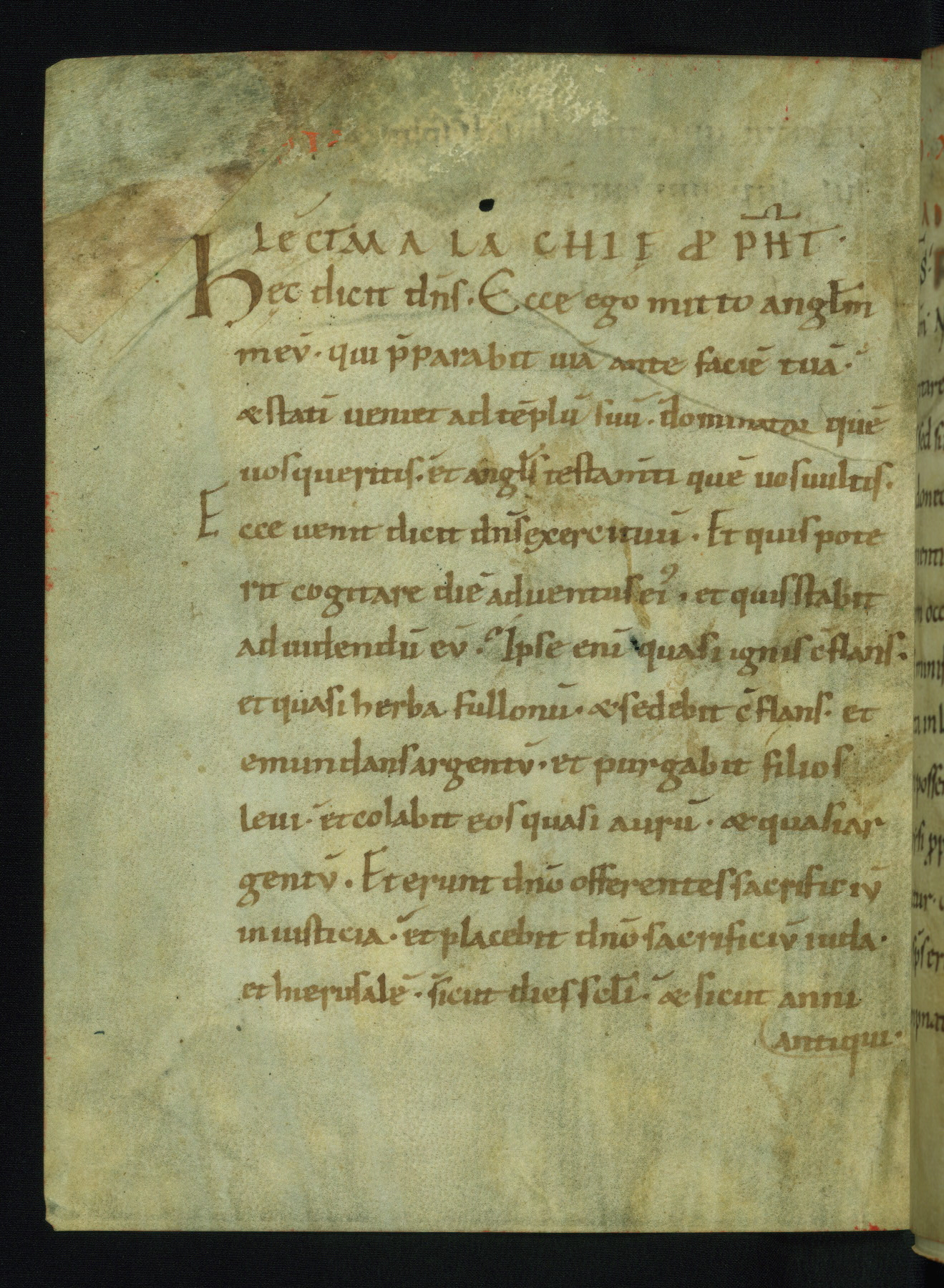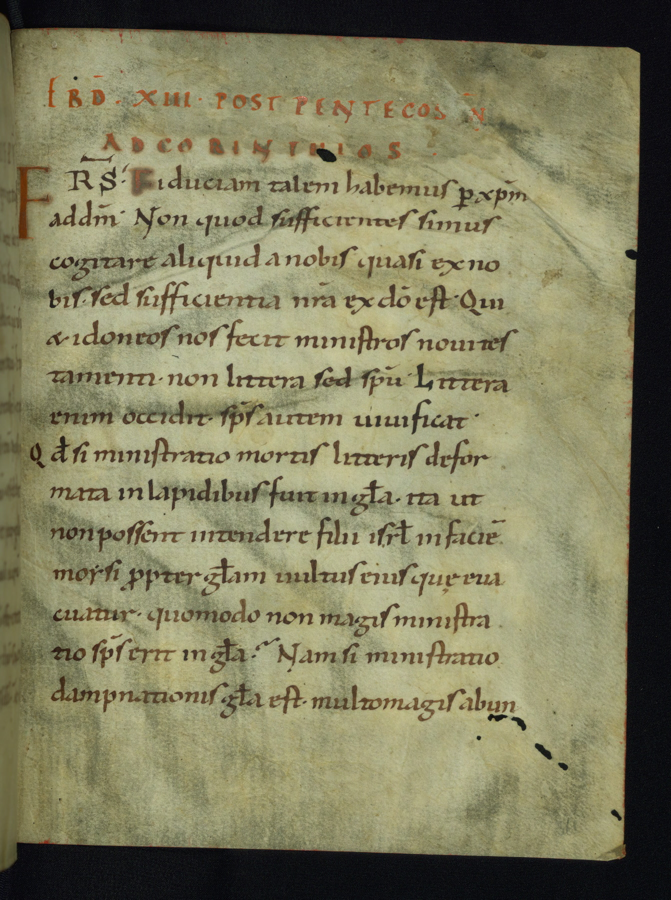 This Lectionary was created ca. 1000 in Trier. Written in a clear Caroline minuscule, it contains decorated initials at the openings of important readings. A set of illuminated letters marks the beginning of the Epistle and Gospel lessons for Easter; they display the hierarchy of scripts with capital letters decorated with gold leaf or drawn in red ink, followed by uncial and Caroline minuscule. Initials in orange, sometimes filled with gold, mark the divisions of the text. The book has been stylistically compared with Ottonian manuscripts, especially with a Psalter preserved in Trier (Stadtbibliothek, Ms. 7) illuminated by the so-called Master of the Registrum Gregorii.