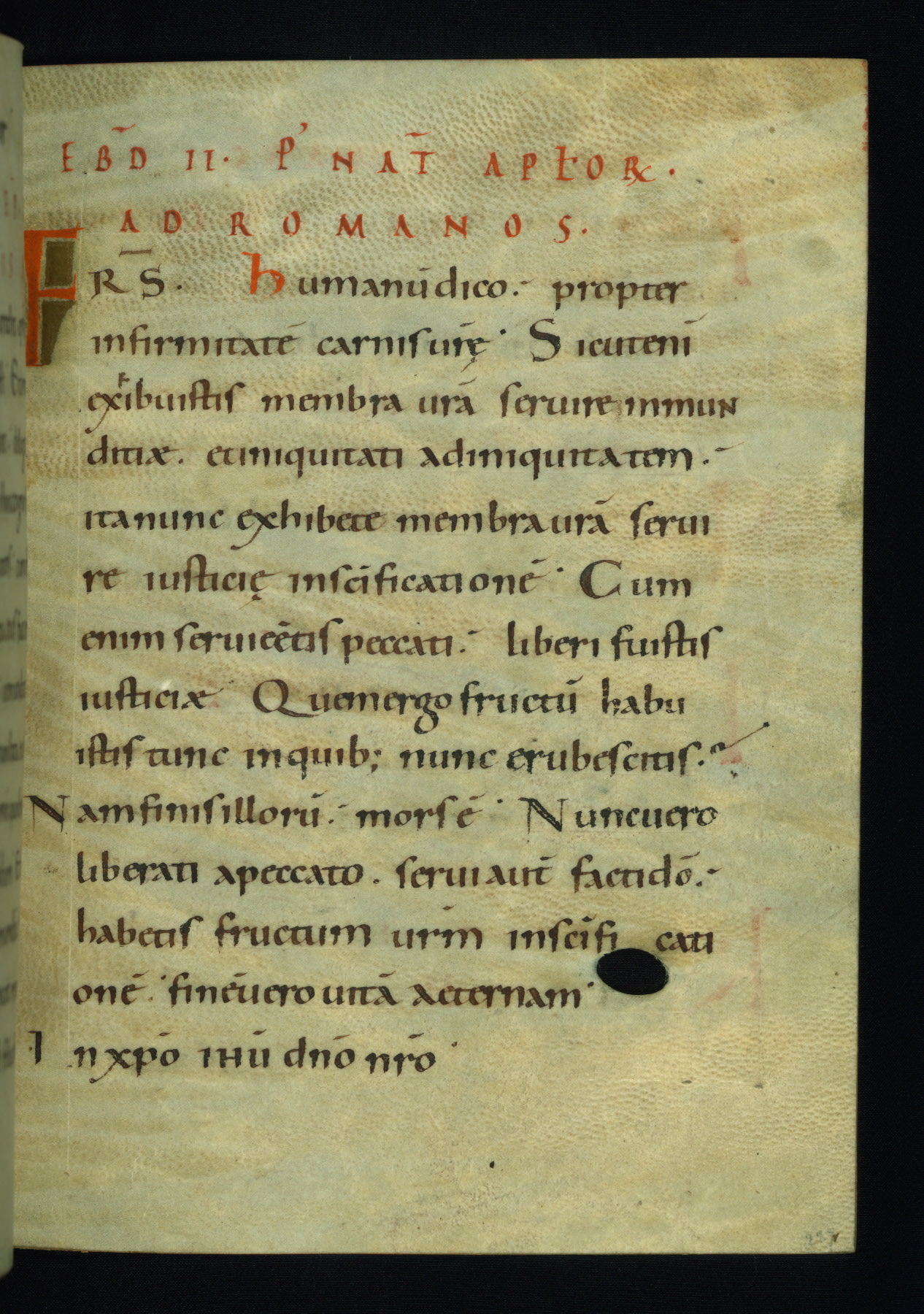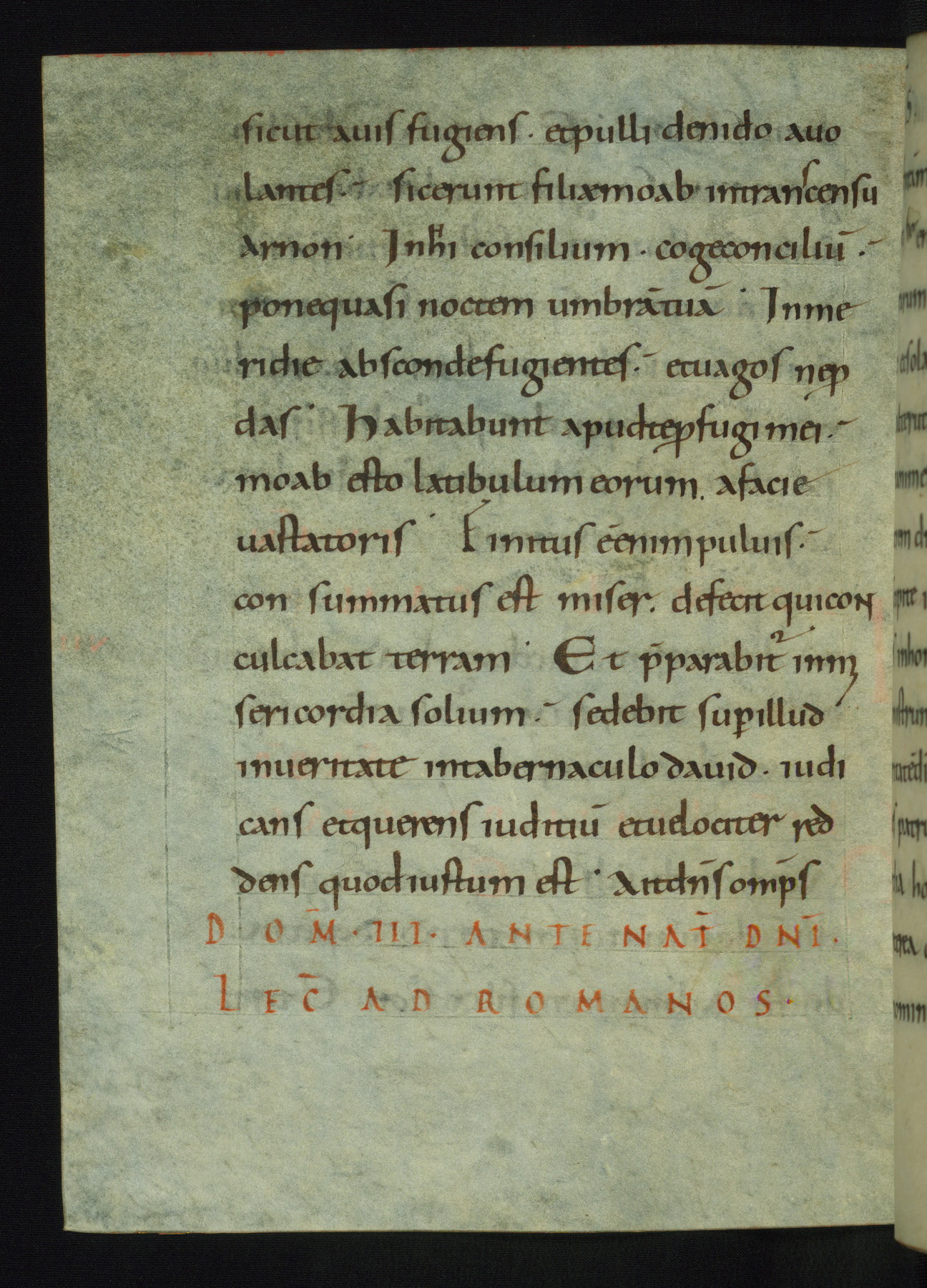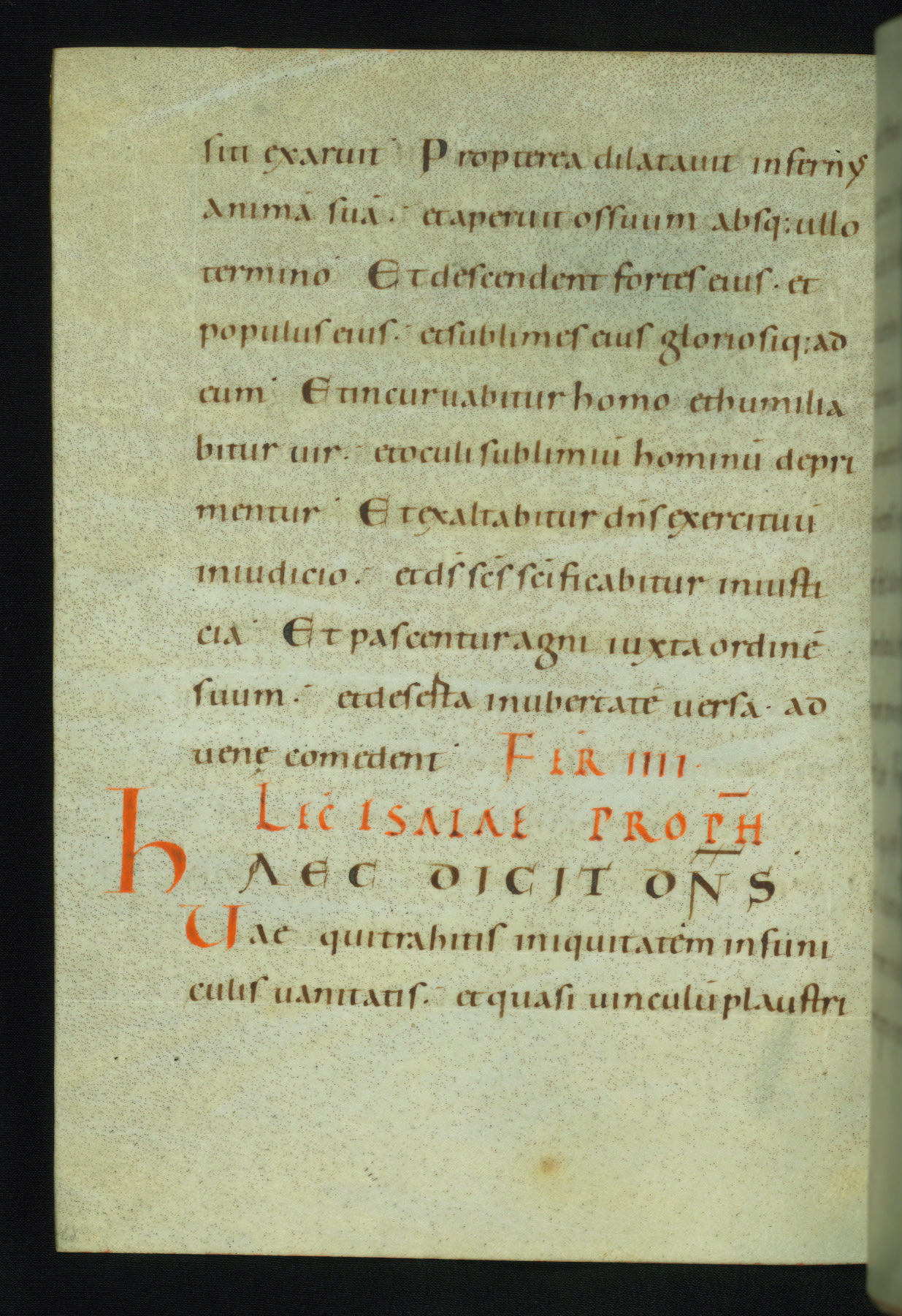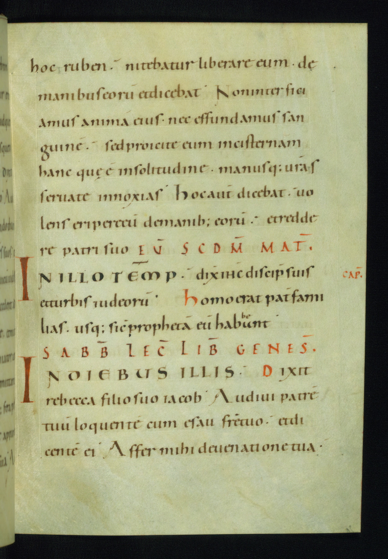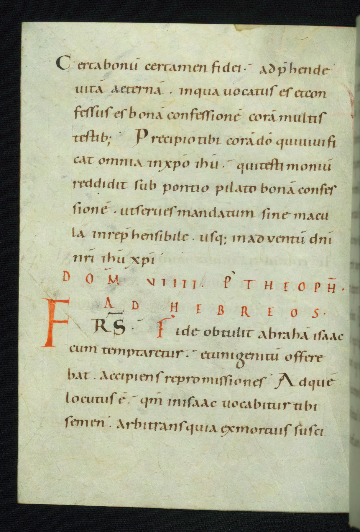 This Lectionary was created ca. 1000 in Trier. Written in a clear Caroline minuscule, it contains decorated initials at the openings of important readings. A set of illuminated letters marks the beginning of the Epistle and Gospel lessons for Easter; they display the hierarchy of scripts with capital letters decorated with gold leaf or drawn in red ink, followed by uncial and Caroline minuscule. Initials in orange, sometimes filled with gold, mark the divisions of the text. The book has been stylistically compared with Ottonian manuscripts, especially with a Psalter preserved in Trier (Stadtbibliothek, Ms. 7) illuminated by the so-called Master of the Registrum Gregorii.