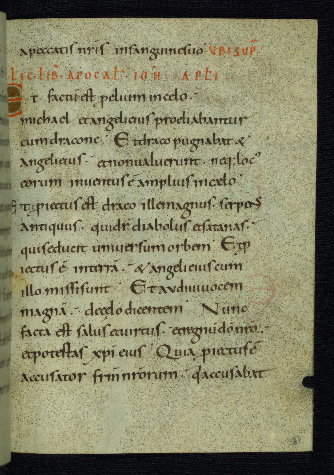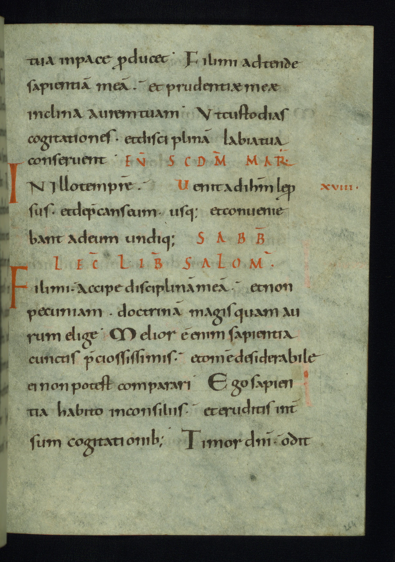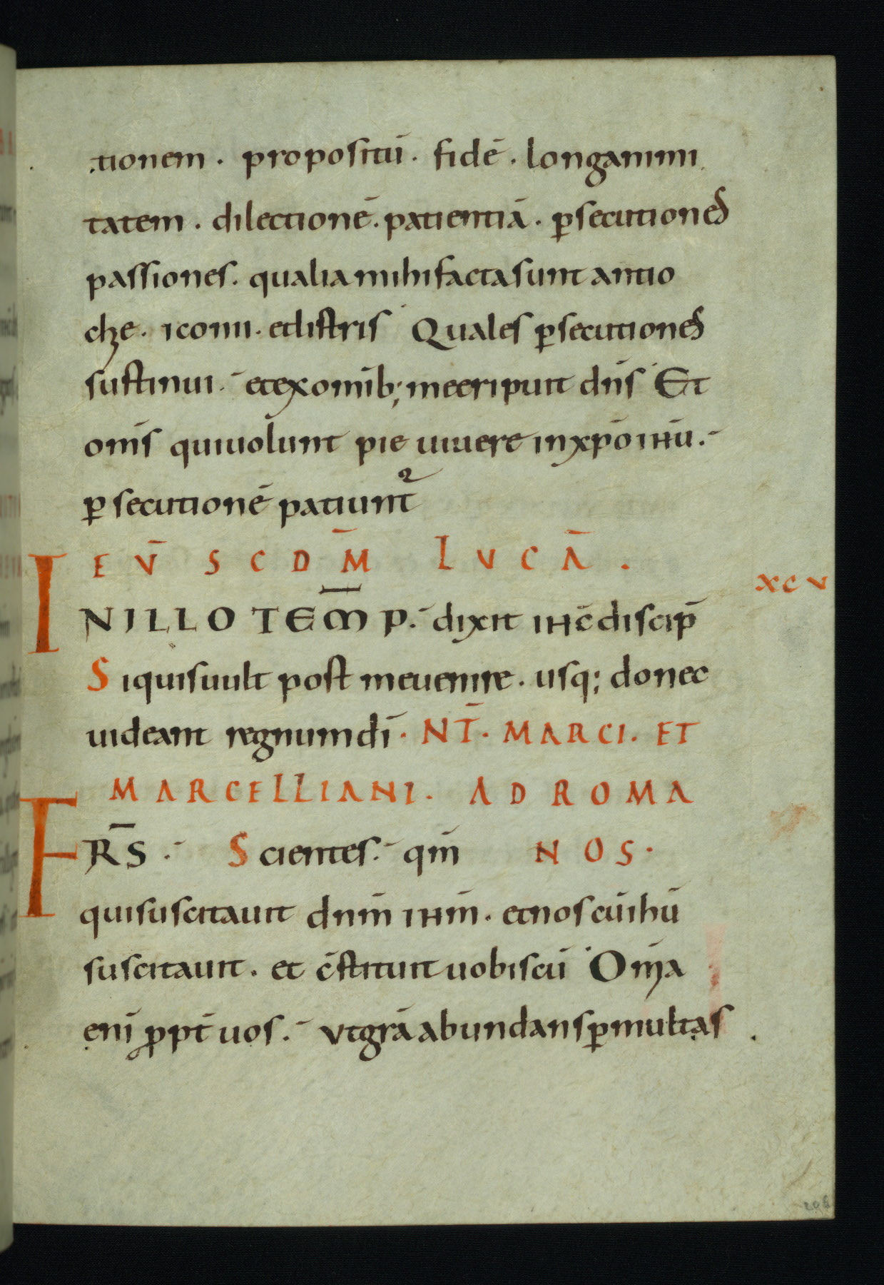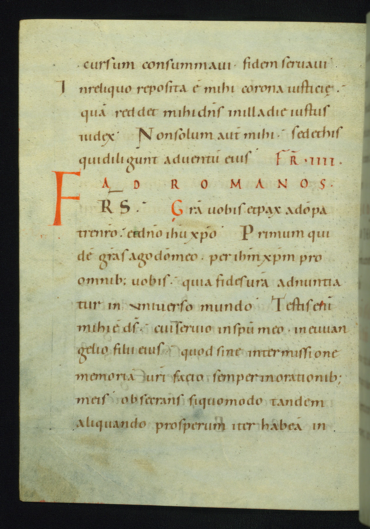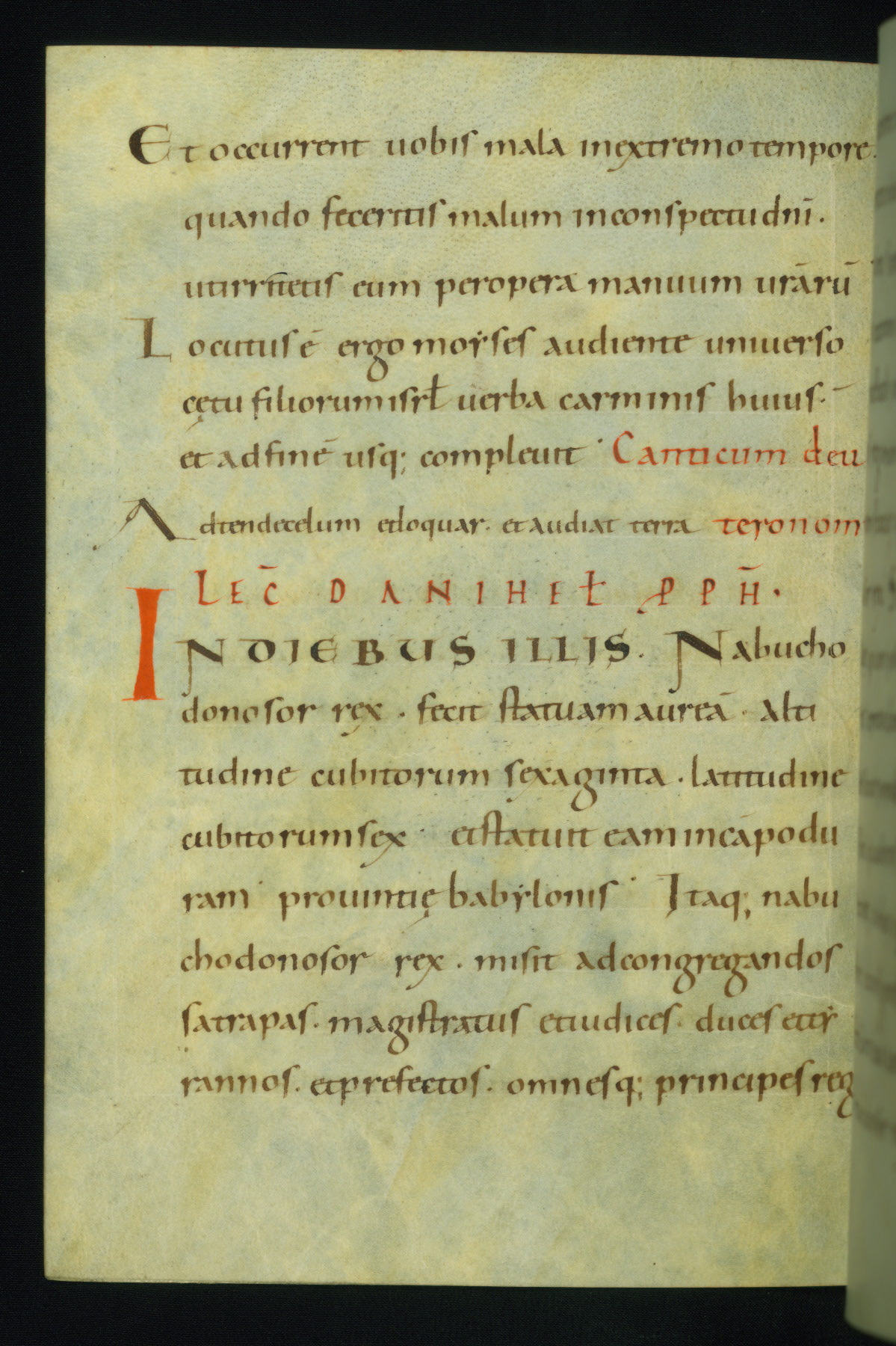 This Lectionary was created ca. 1000 in Trier. Written in a clear Caroline minuscule, it contains decorated initials at the openings of important readings. A set of illuminated letters marks the beginning of the Epistle and Gospel lessons for Easter; they display the hierarchy of scripts with capital letters decorated with gold leaf or drawn in red ink, followed by uncial and Caroline minuscule. Initials in orange, sometimes filled with gold, mark the divisions of the text. The book has been stylistically compared with Ottonian manuscripts, especially with a Psalter preserved in Trier (Stadtbibliothek, Ms. 7) illuminated by the so-called Master of the Registrum Gregorii.