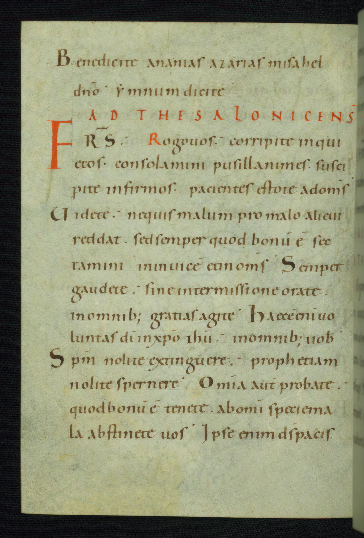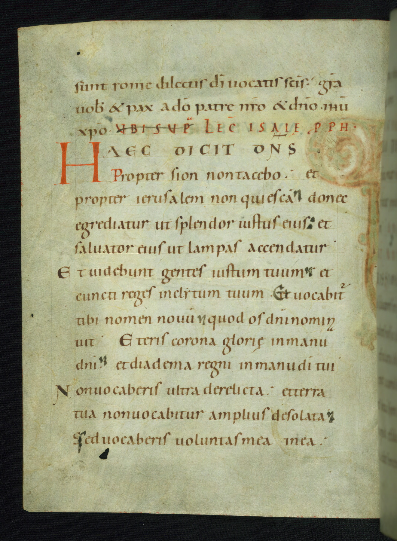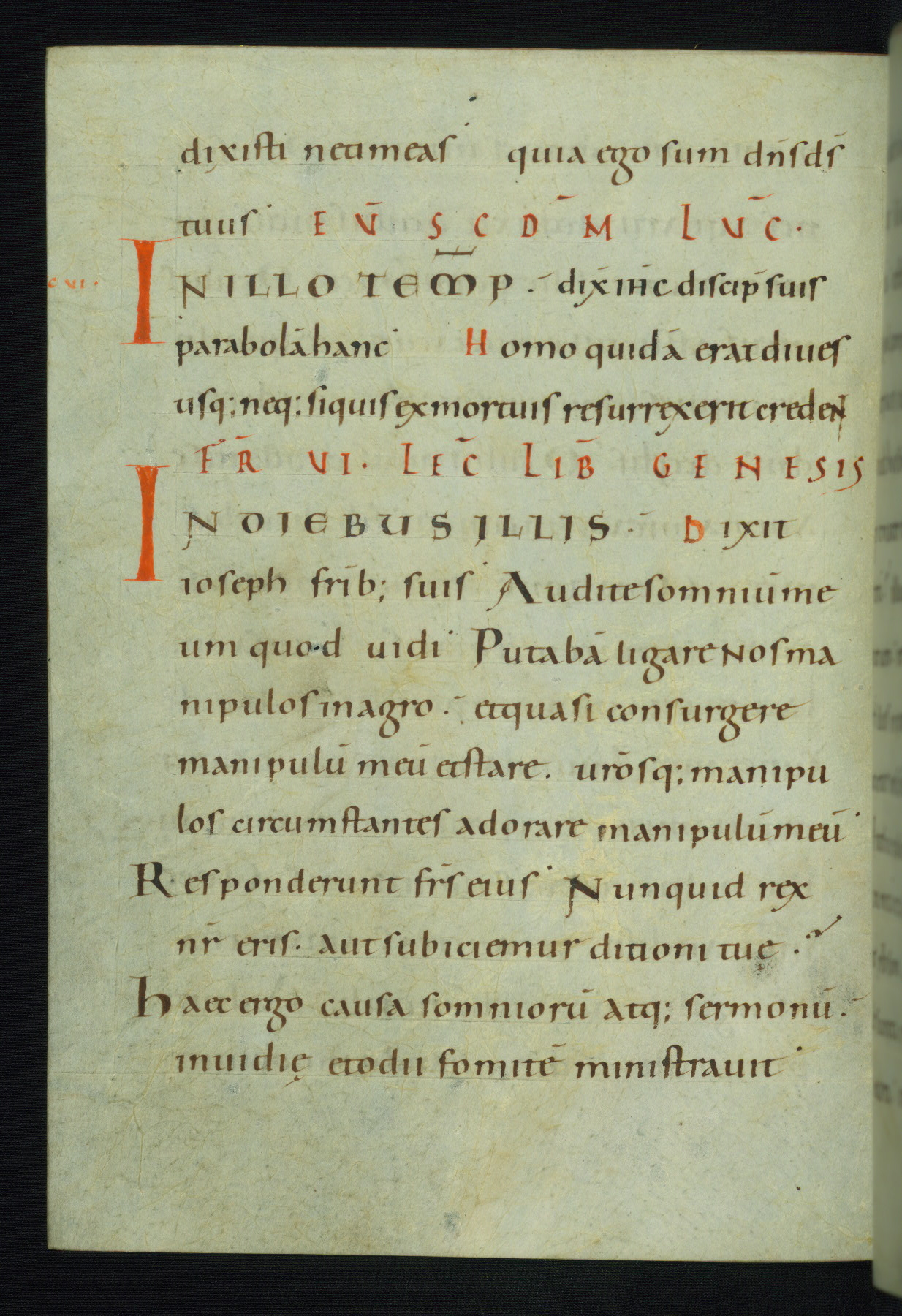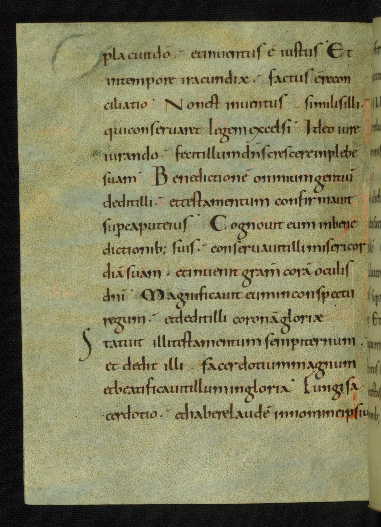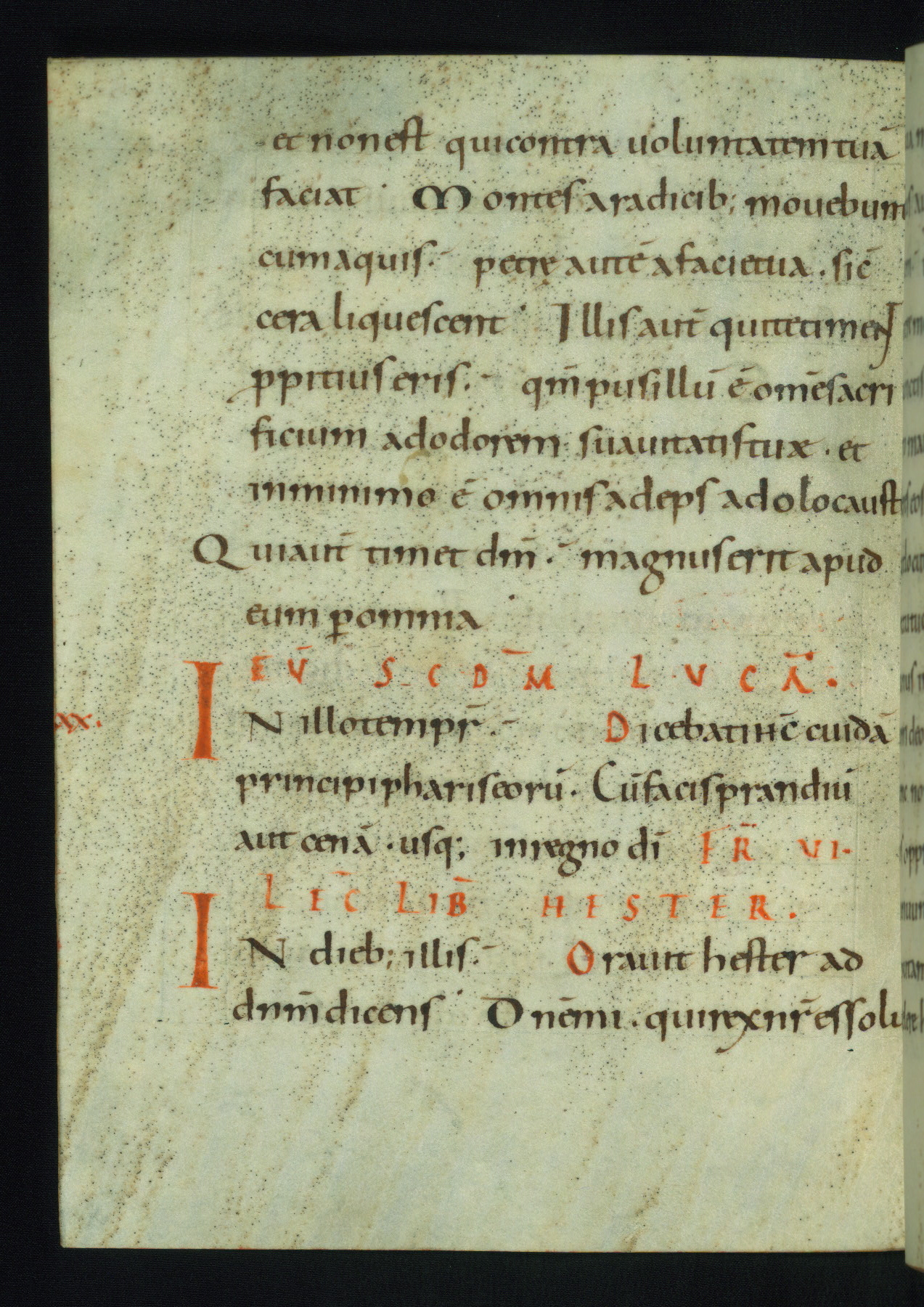 This Lectionary was created ca. 1000 in Trier. Written in a clear Caroline minuscule, it contains decorated initials at the openings of important readings. A set of illuminated letters marks the beginning of the Epistle and Gospel lessons for Easter; they display the hierarchy of scripts with capital letters decorated with gold leaf or drawn in red ink, followed by uncial and Caroline minuscule. Initials in orange, sometimes filled with gold, mark the divisions of the text. The book has been stylistically compared with Ottonian manuscripts, especially with a Psalter preserved in Trier (Stadtbibliothek, Ms. 7) illuminated by the so-called Master of the Registrum Gregorii.