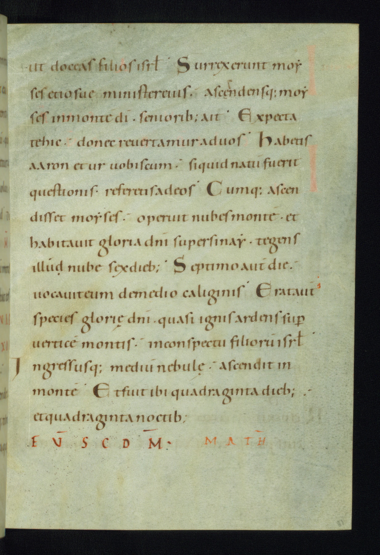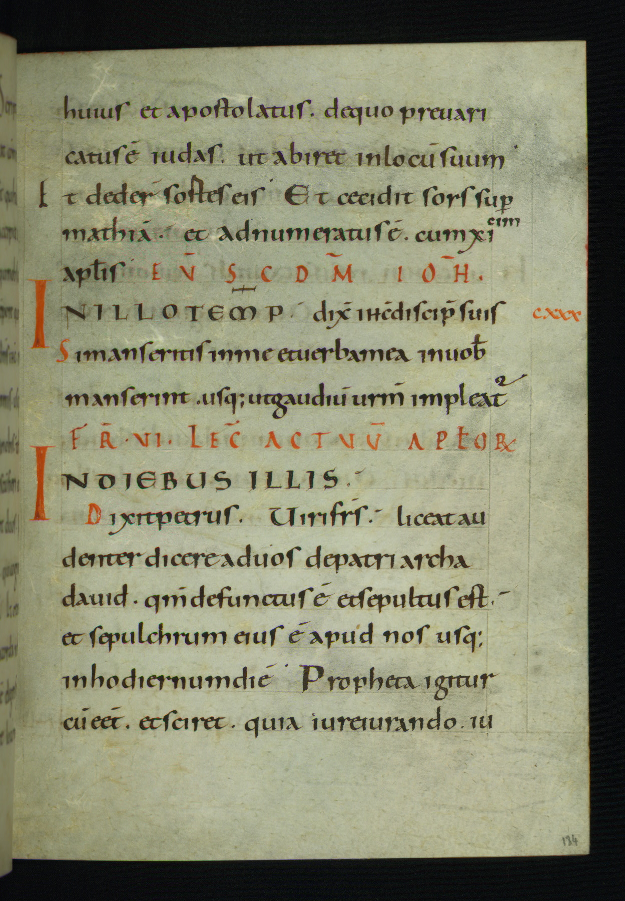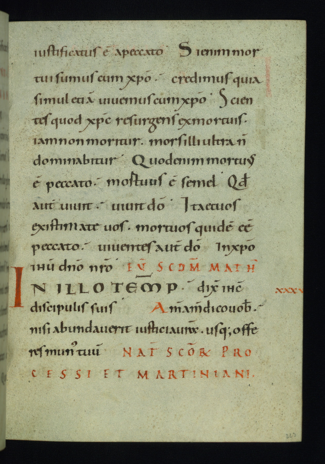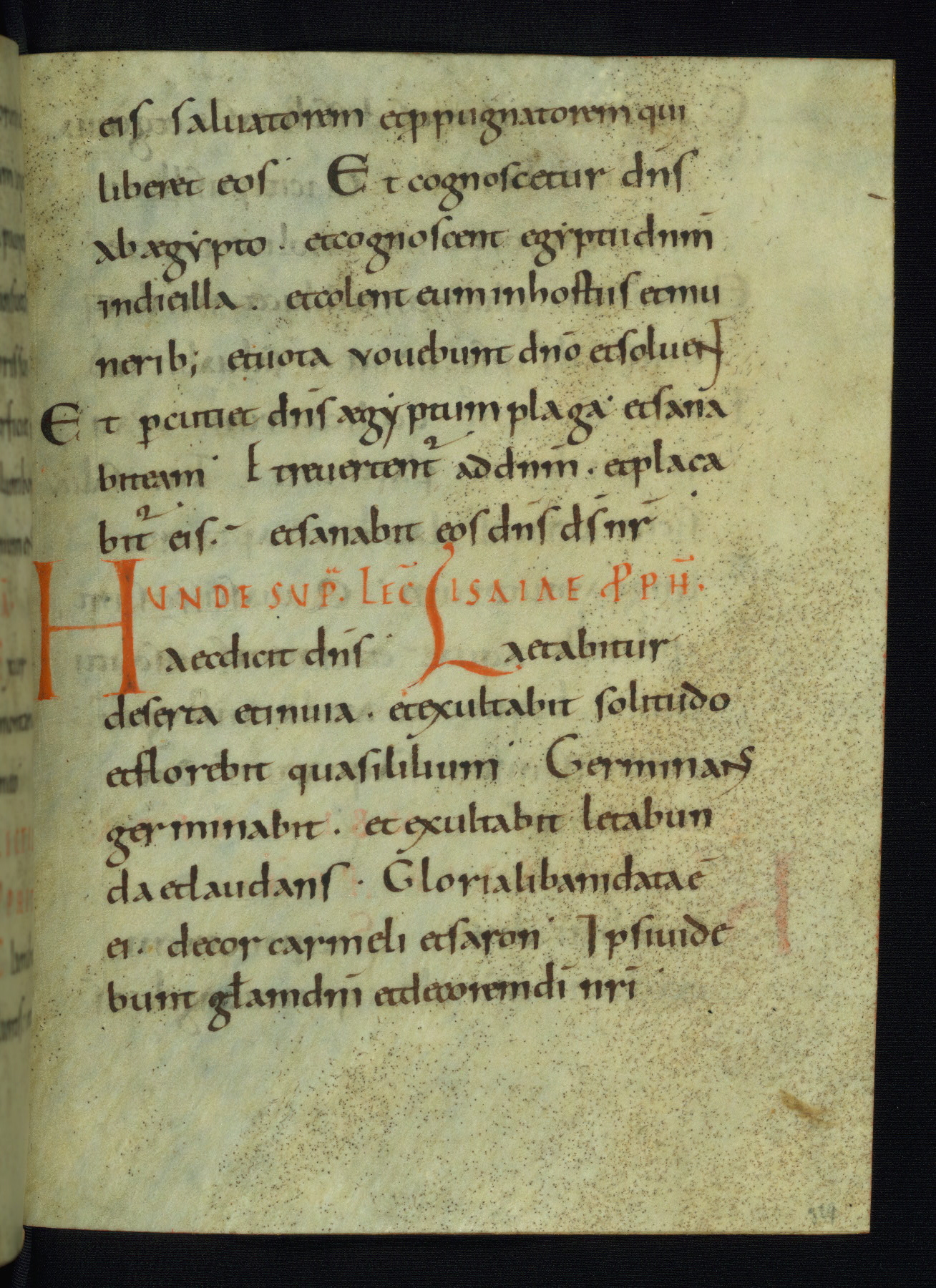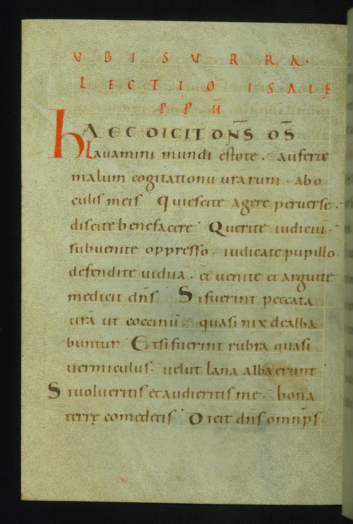 This Lectionary was created ca. 1000 in Trier. Written in a clear Caroline minuscule, it contains decorated initials at the openings of important readings. A set of illuminated letters marks the beginning of the Epistle and Gospel lessons for Easter; they display the hierarchy of scripts with capital letters decorated with gold leaf or drawn in red ink, followed by uncial and Caroline minuscule. Initials in orange, sometimes filled with gold, mark the divisions of the text. The book has been stylistically compared with Ottonian manuscripts, especially with a Psalter preserved in Trier (Stadtbibliothek, Ms. 7) illuminated by the so-called Master of the Registrum Gregorii.